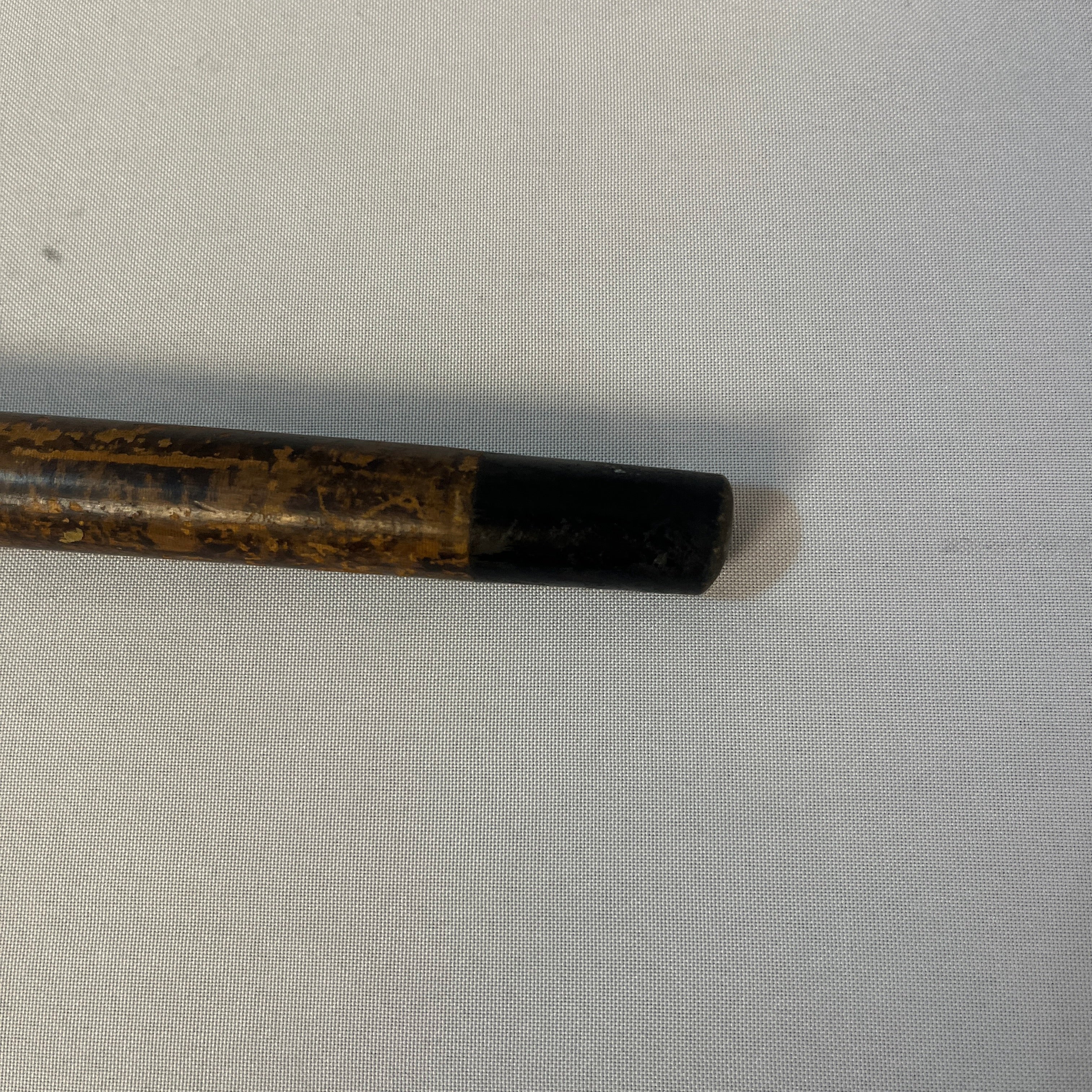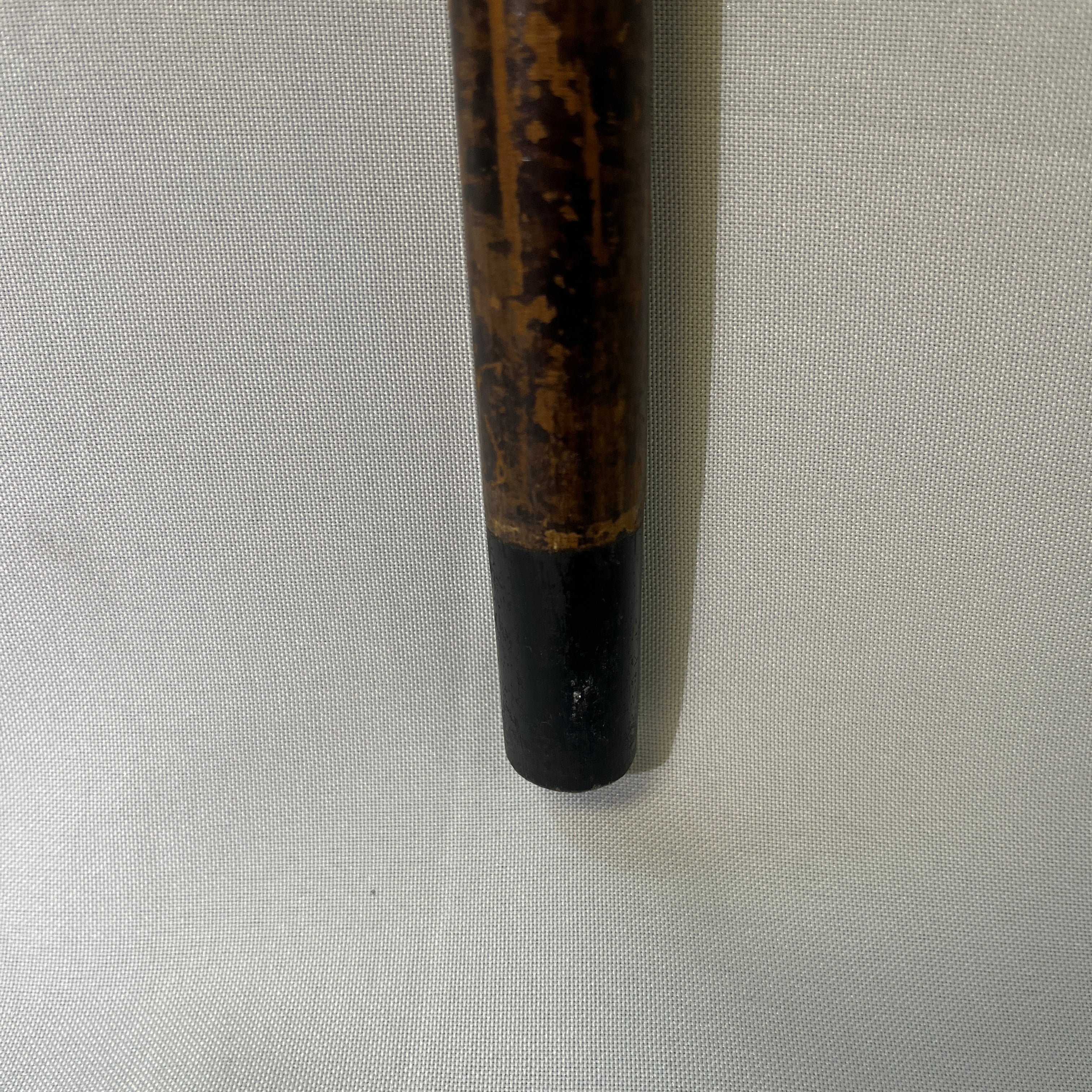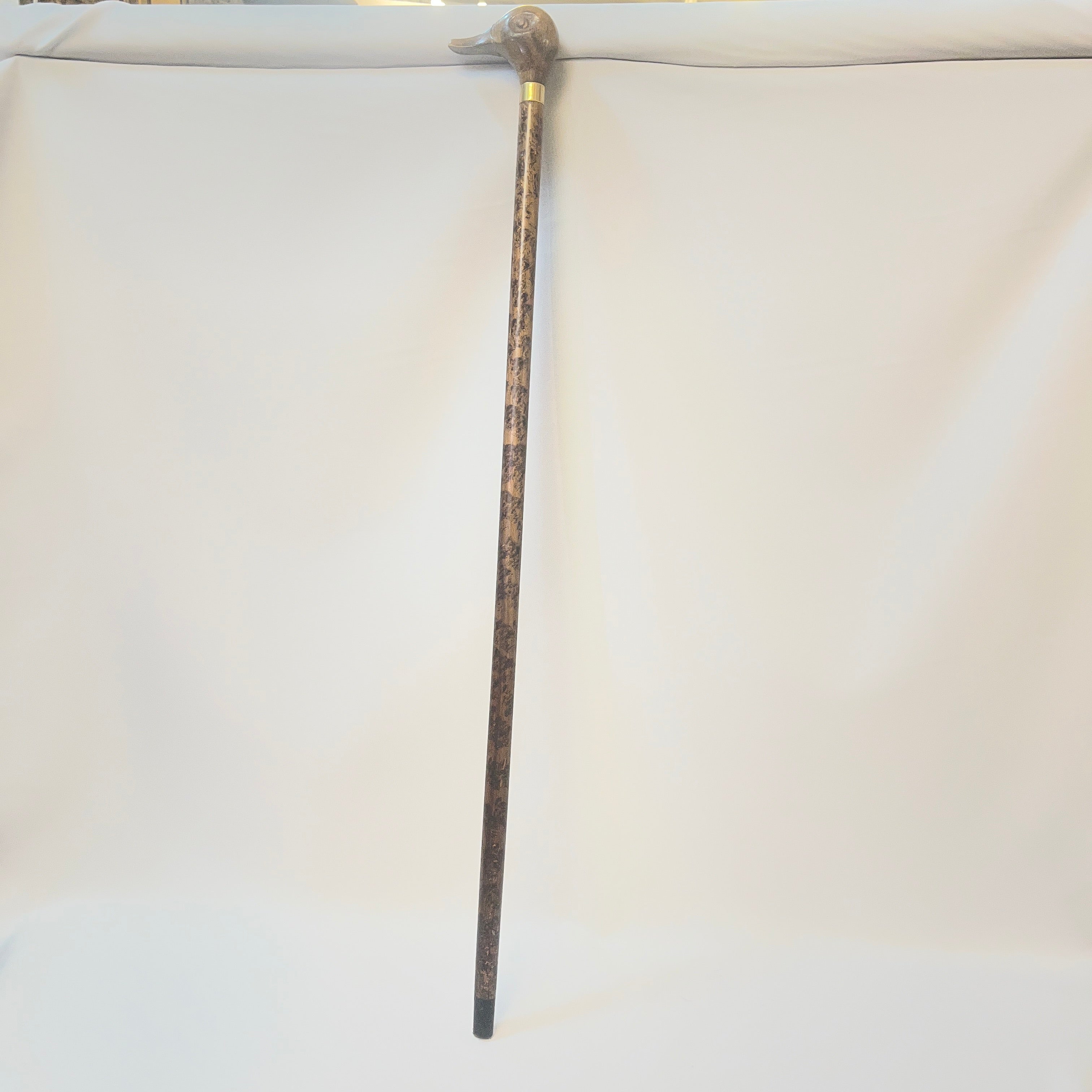 Elegante bastón francés de madera nativa enchapada en veta manchada, lo que le entrega una particular belleza. La empuñadura es una cabeza de pato tallada a mano, cintillo de bronce y su punta con un cinto pintado negro.