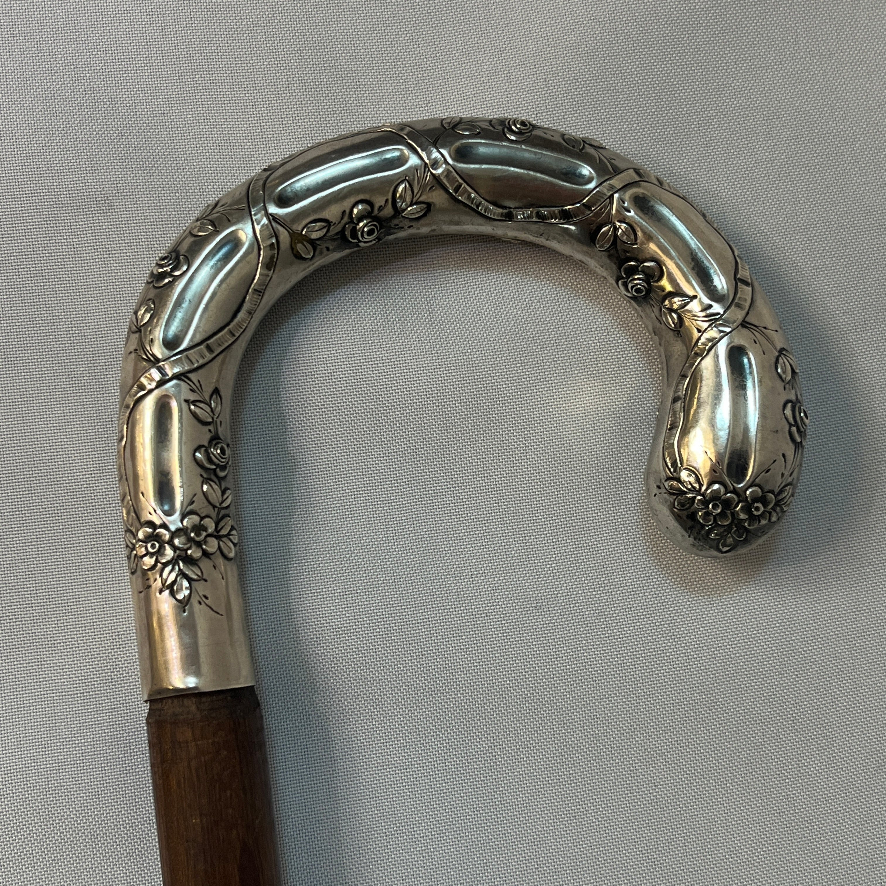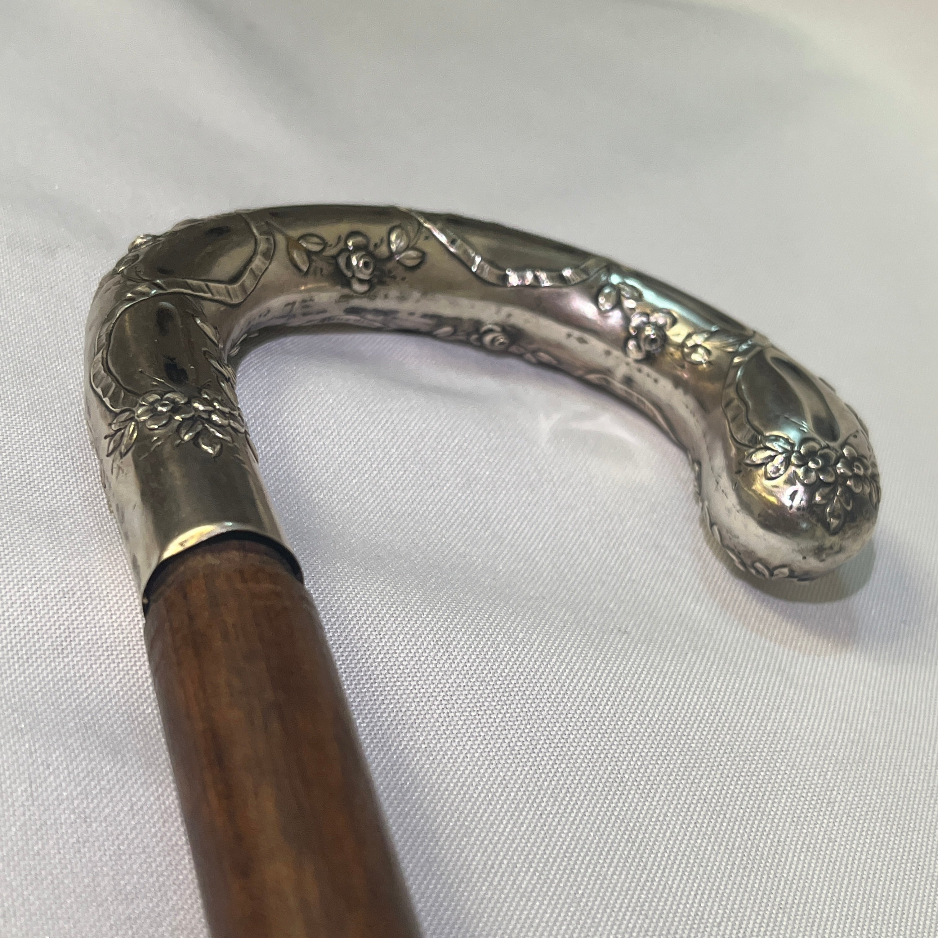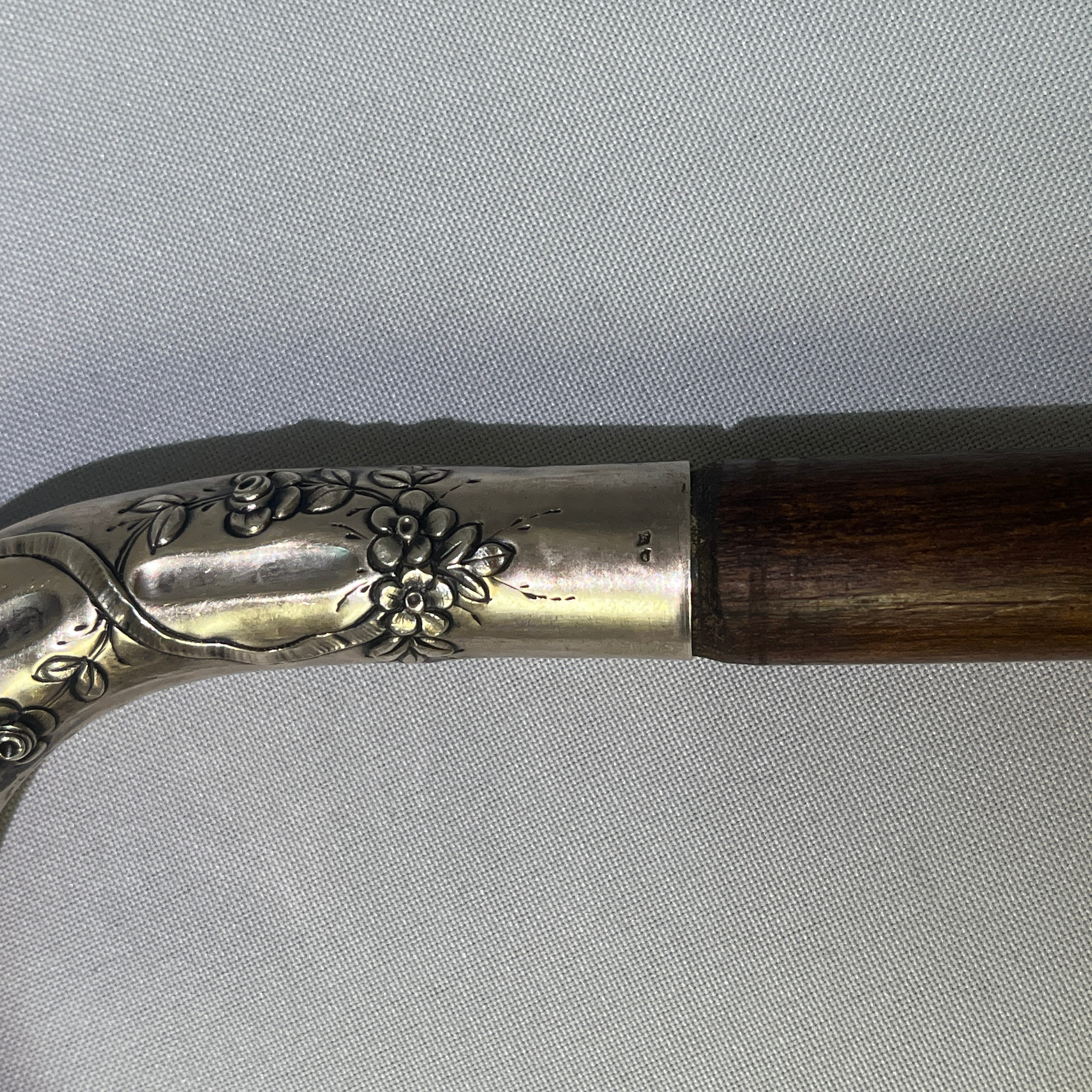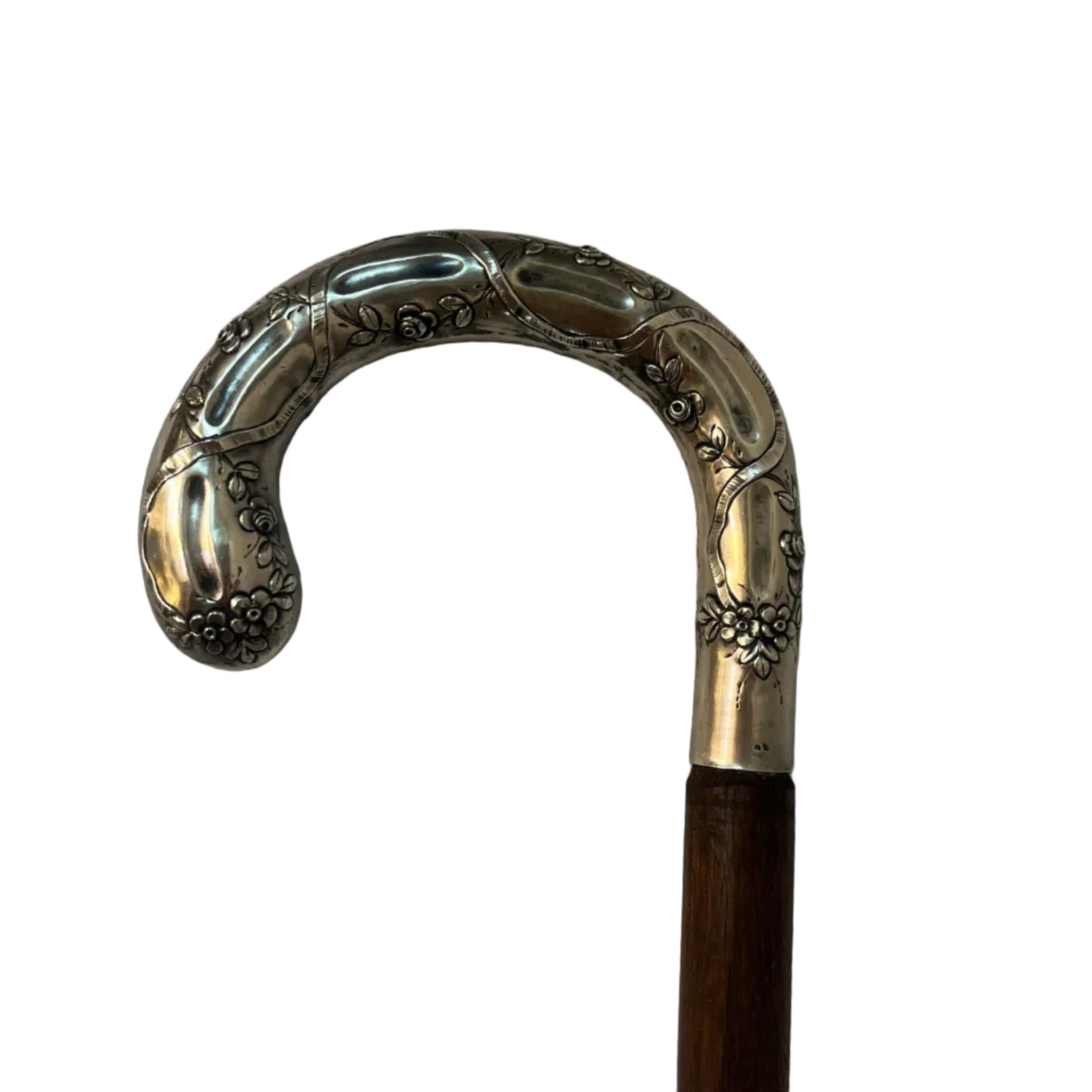 Elegante bastón francés de madera con empuñadura de plata finamente trabajada con diseño curvo y floral. La sobriedad de la madera pulida se combina con la nobleza del metal, otorgándole un carácter distinguido y atemporal.