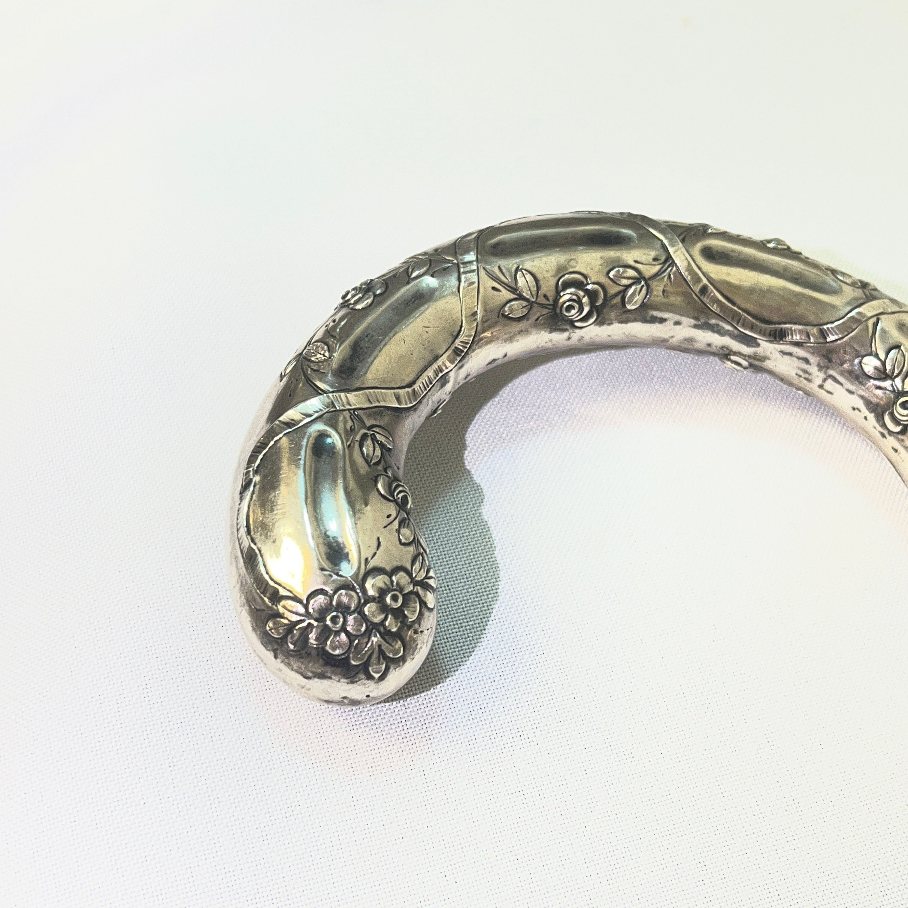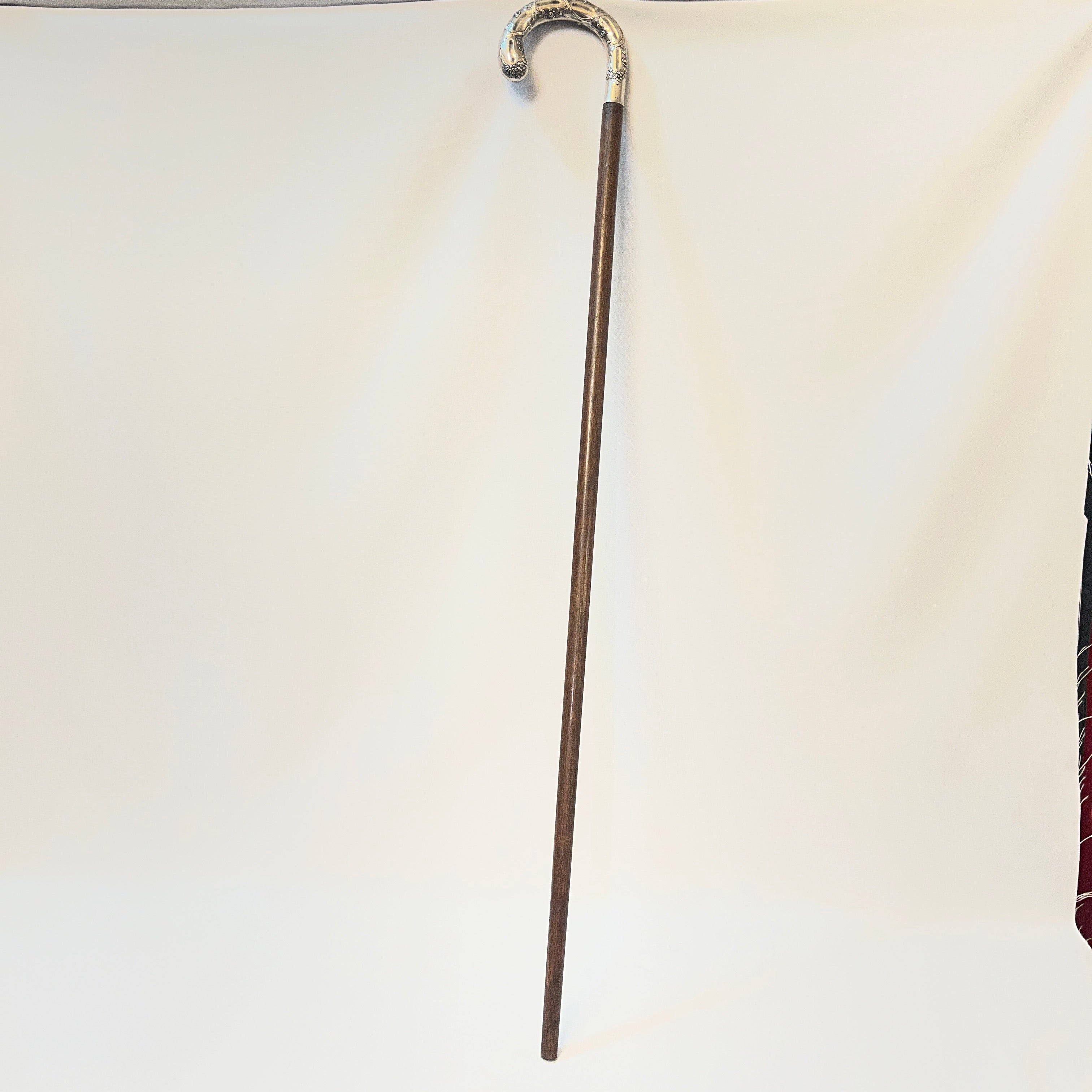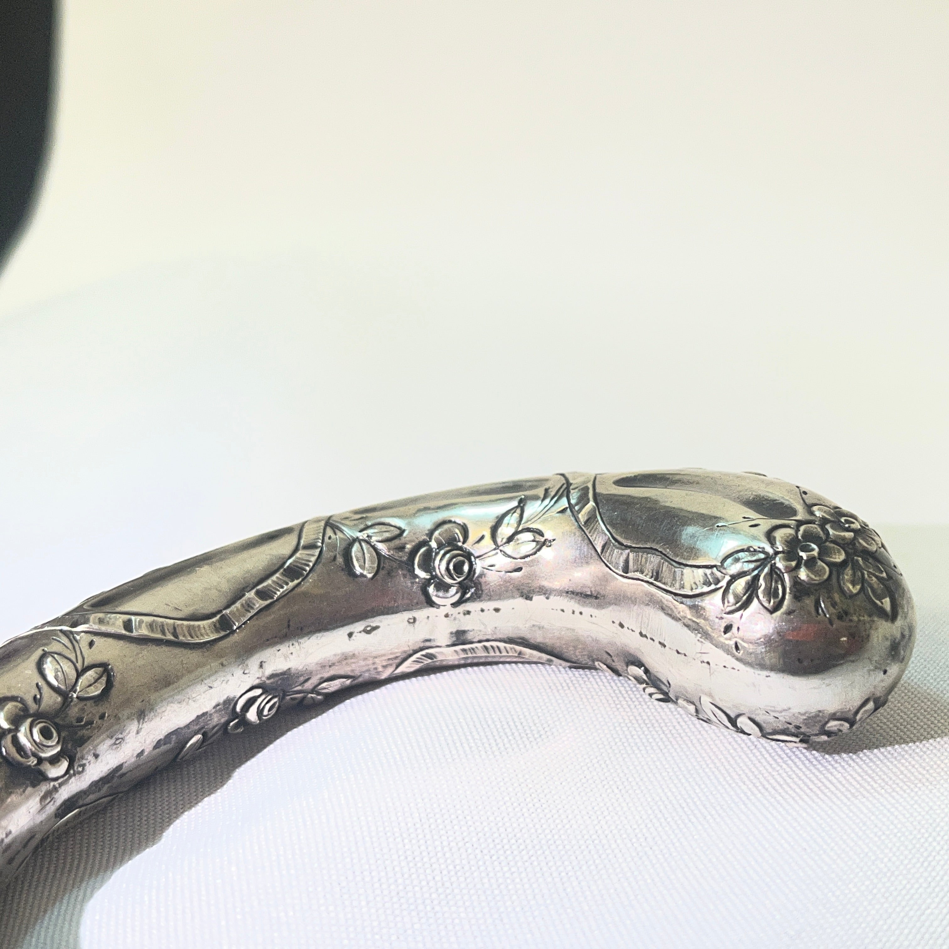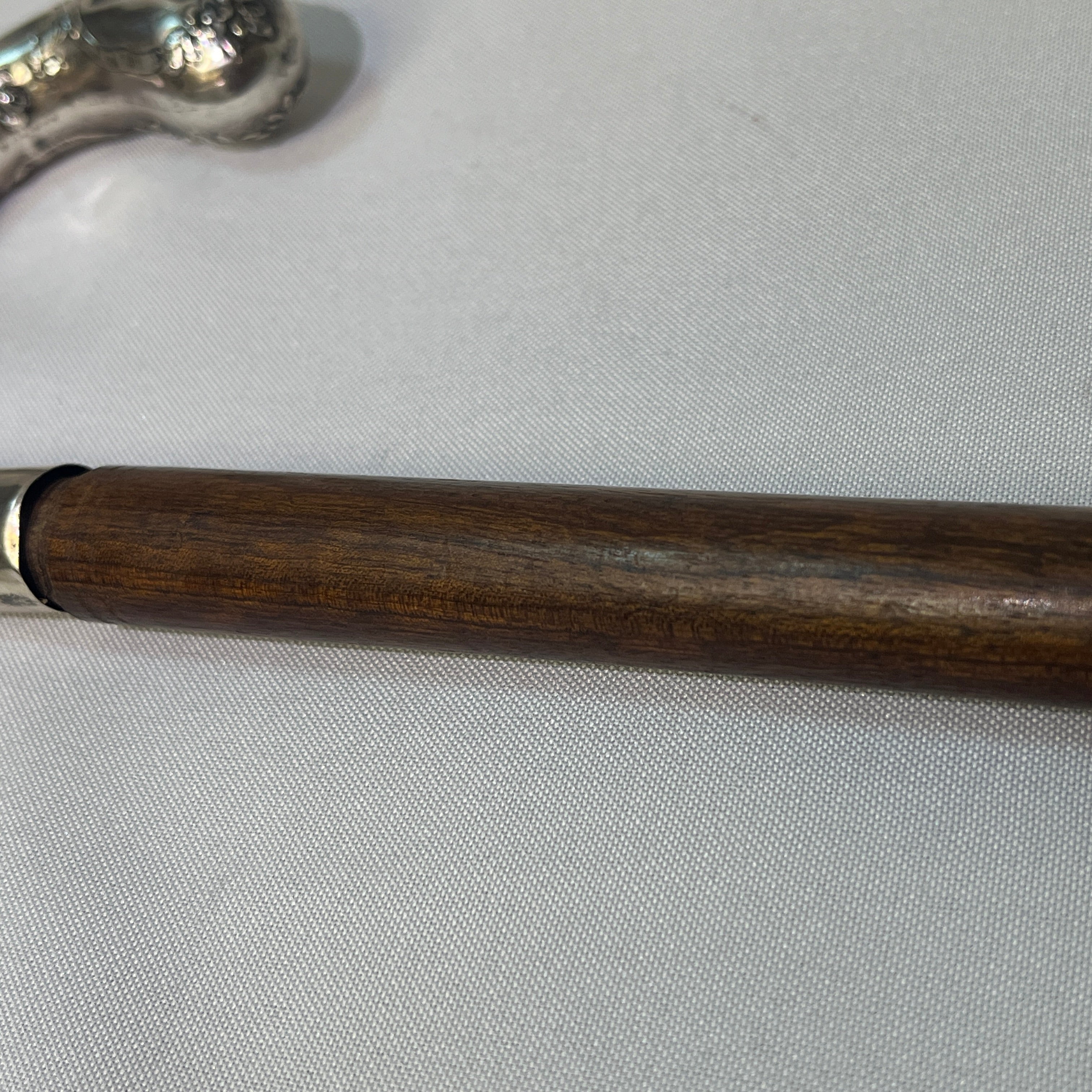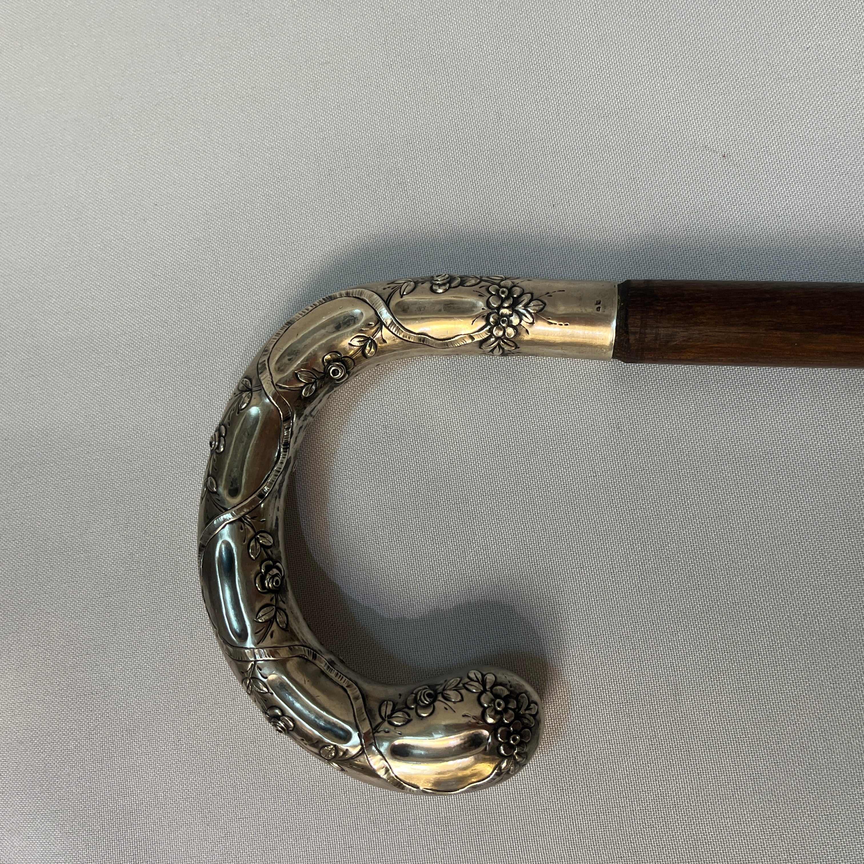 Elegante bastón francés de madera con empuñadura de plata finamente trabajada con diseño curvo y floral. La sobriedad de la madera pulida se combina con la nobleza del metal, otorgándole un carácter distinguido y atemporal.