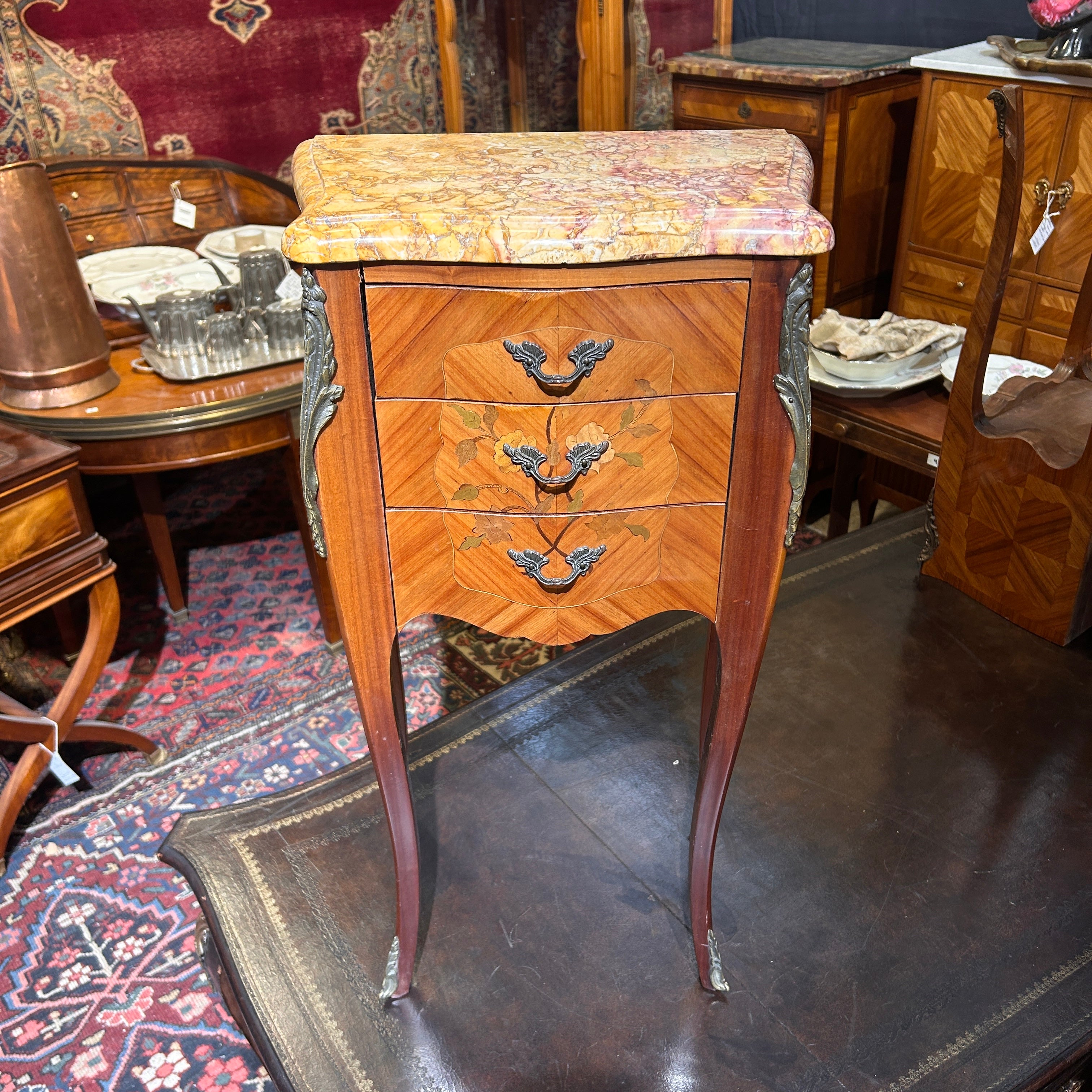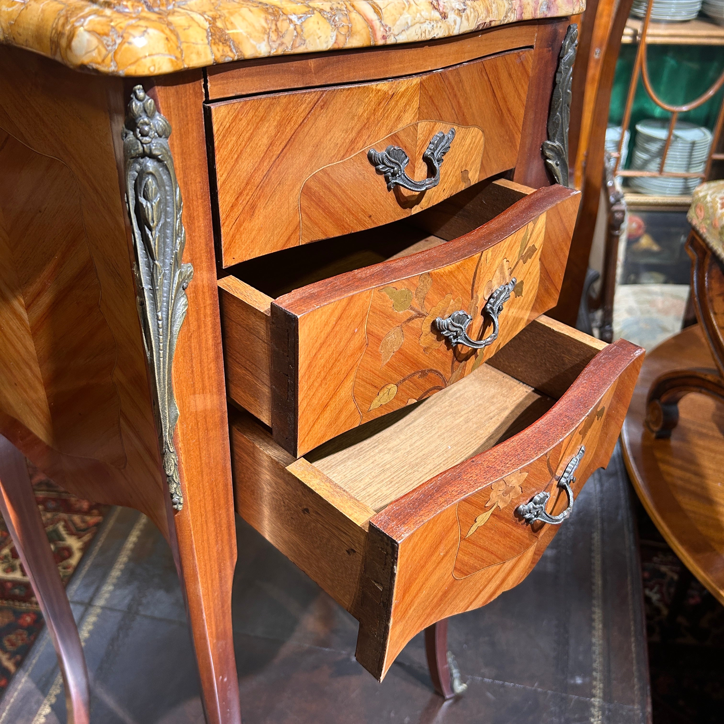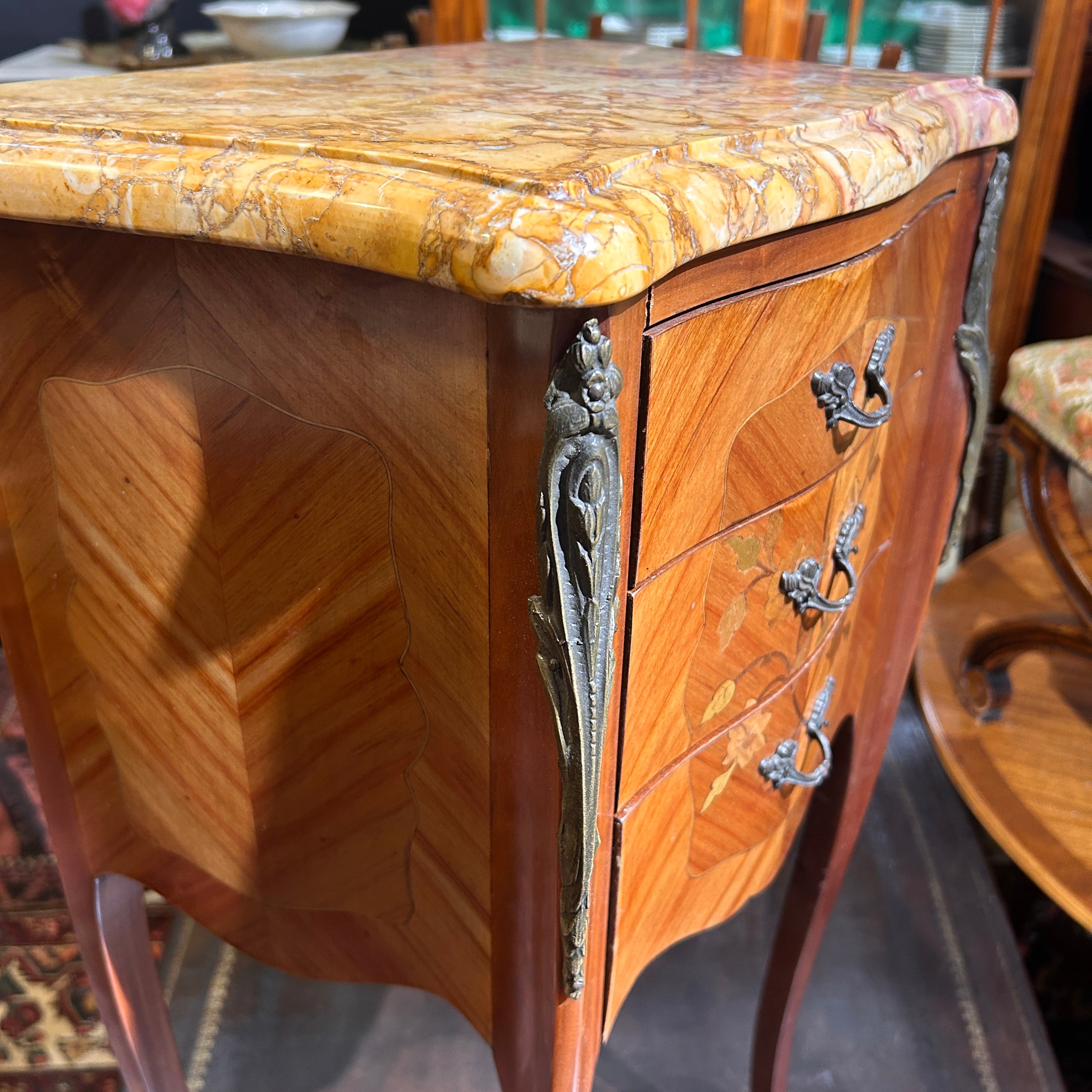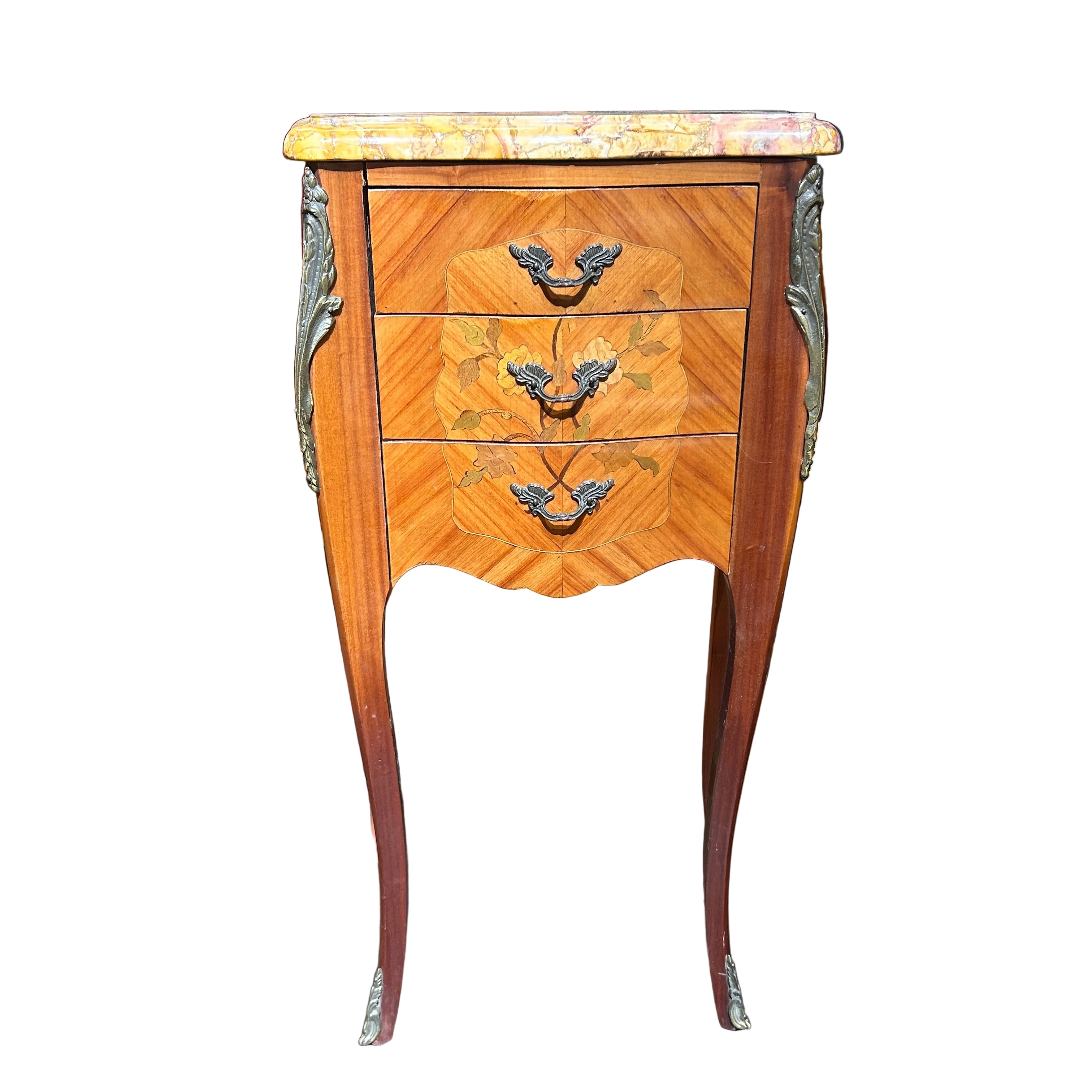 Chevet o velador francés estilo Luis XV mármol veteado tres cajones circa 1950