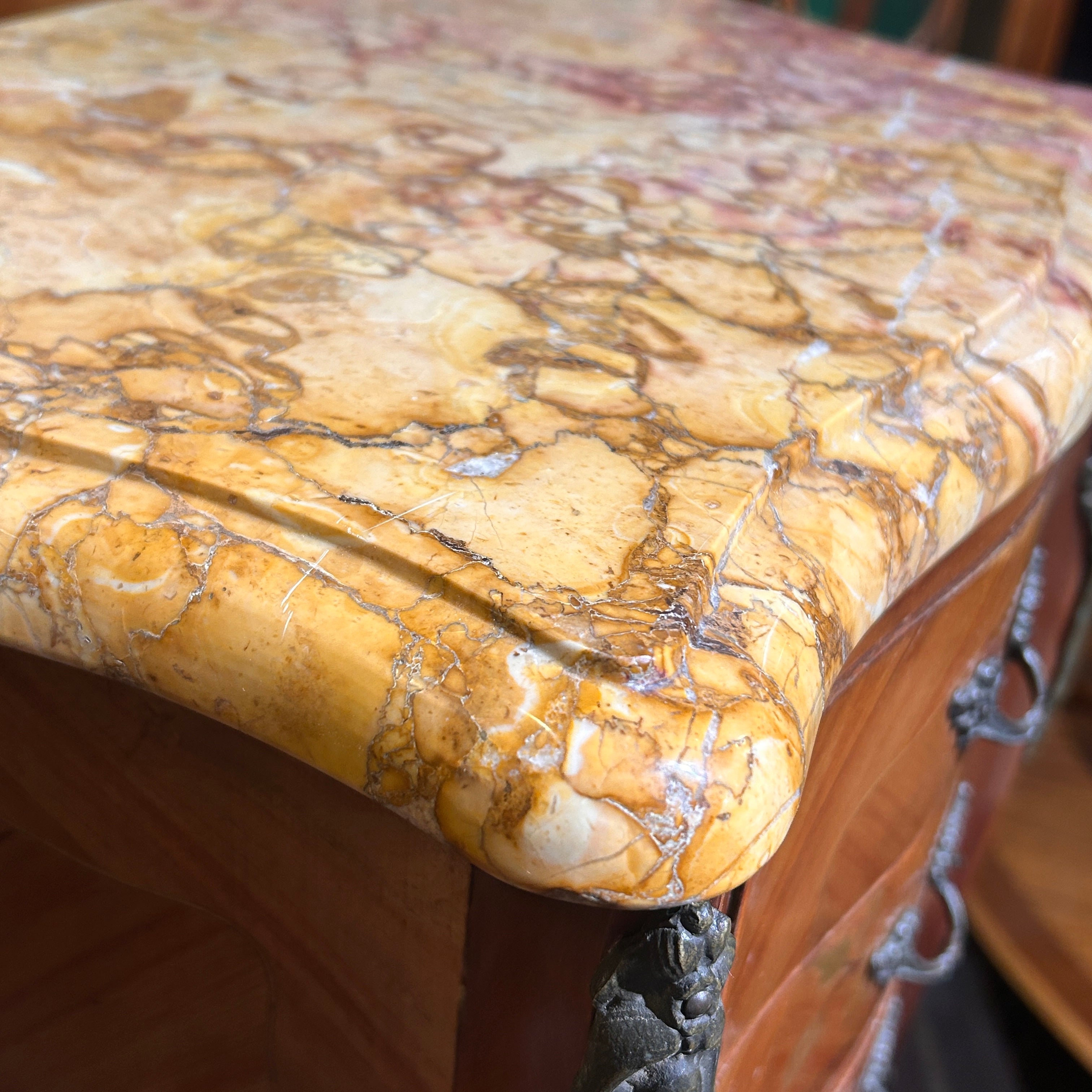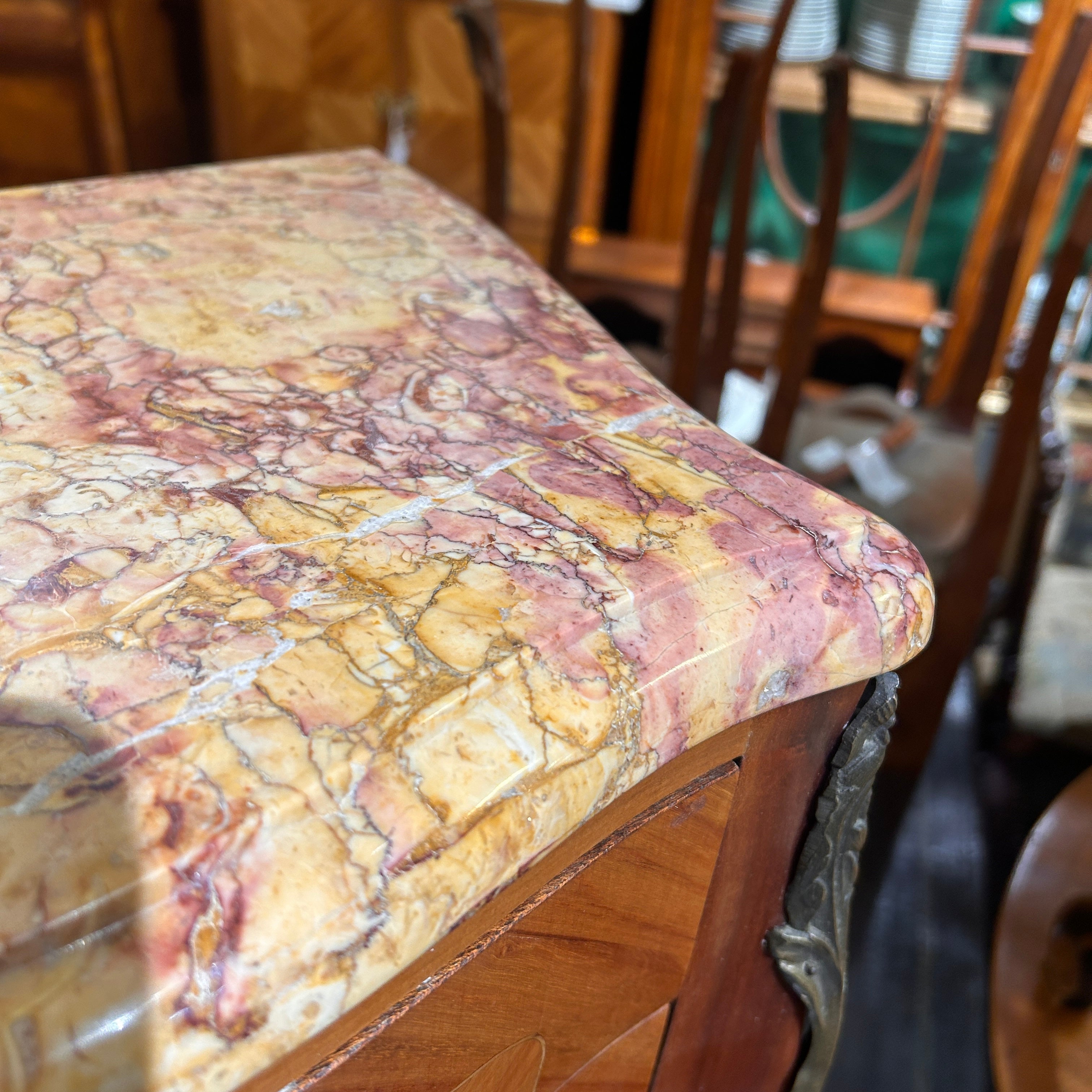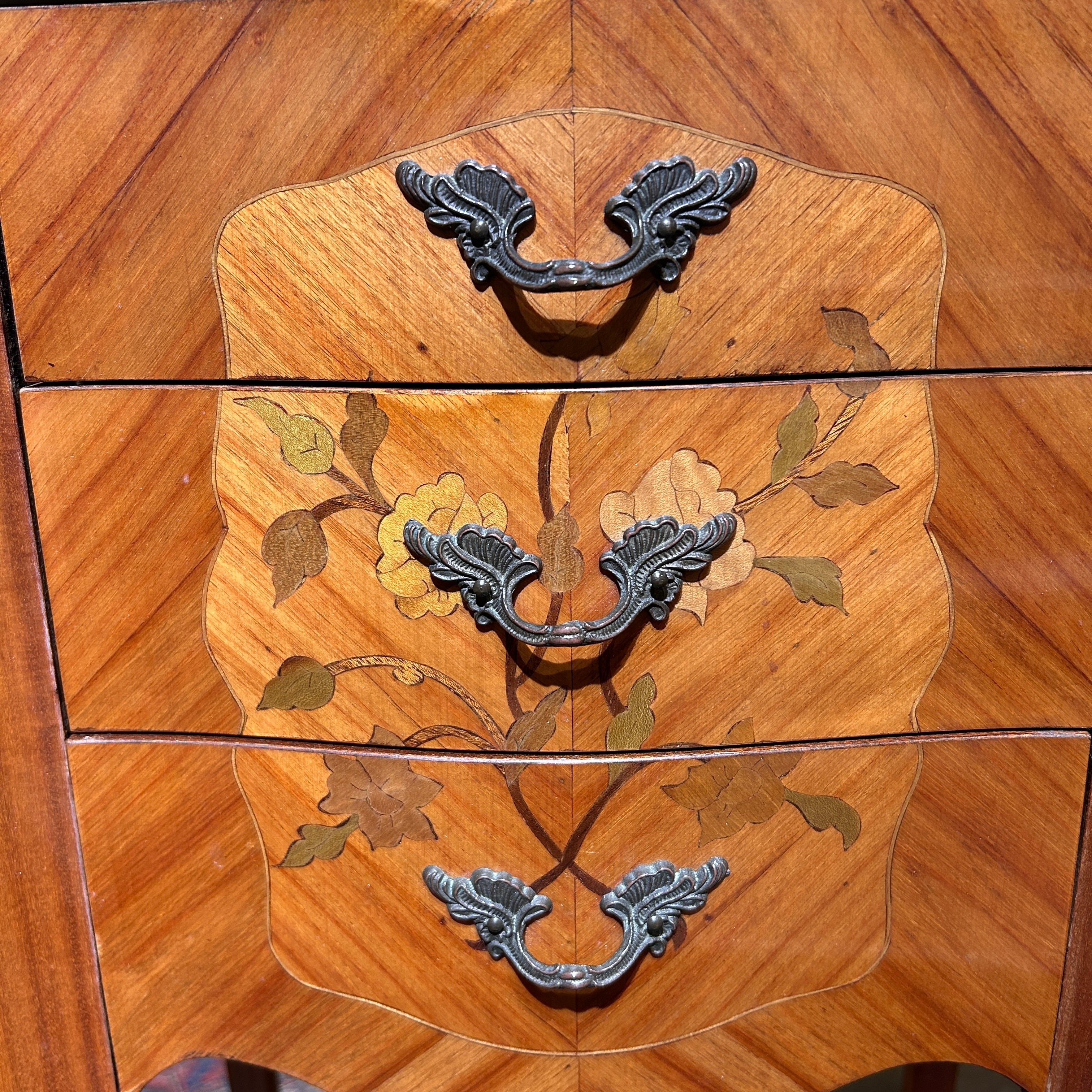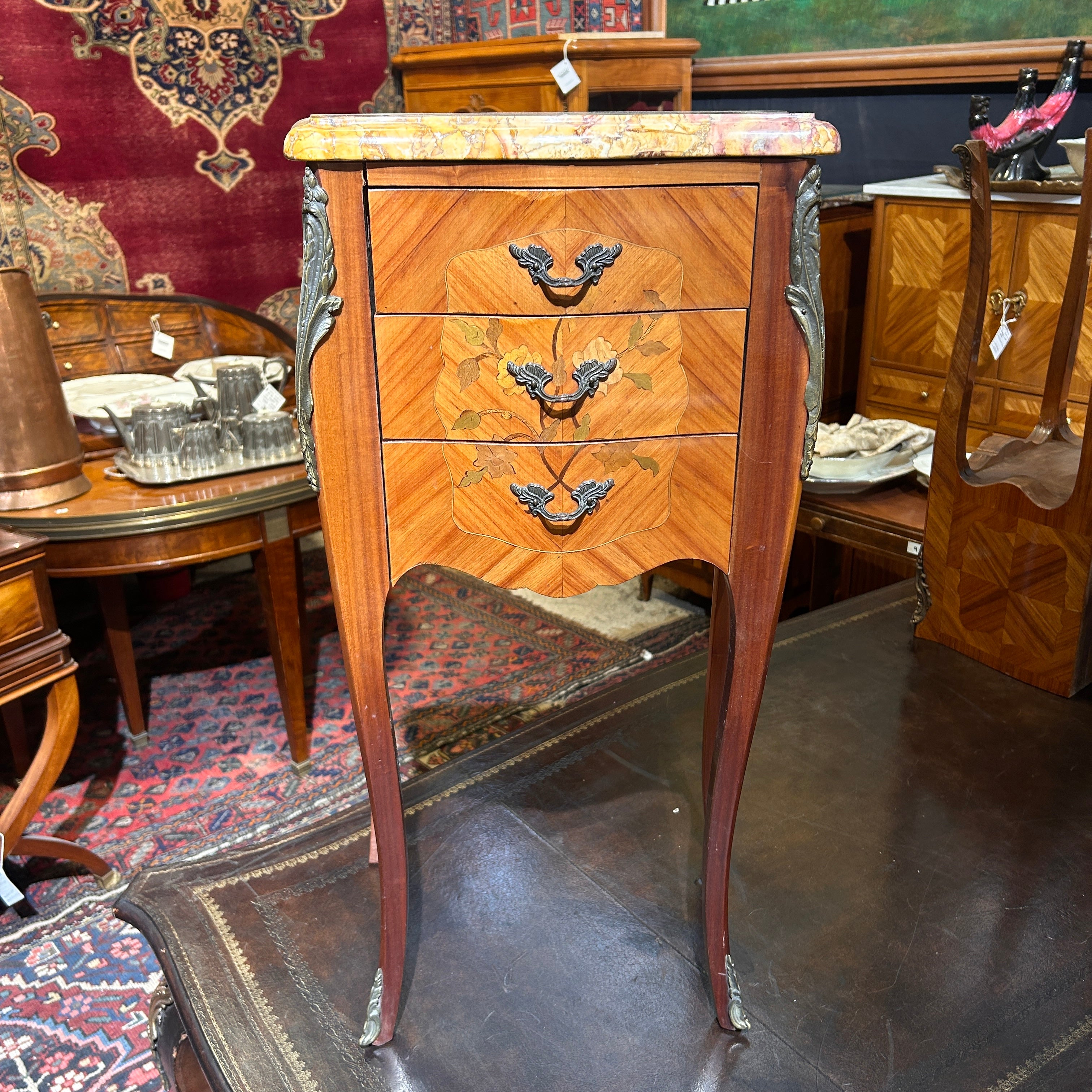 Chevet o velador francés estilo Luis XV mármol veteado tres cajones circa 1950