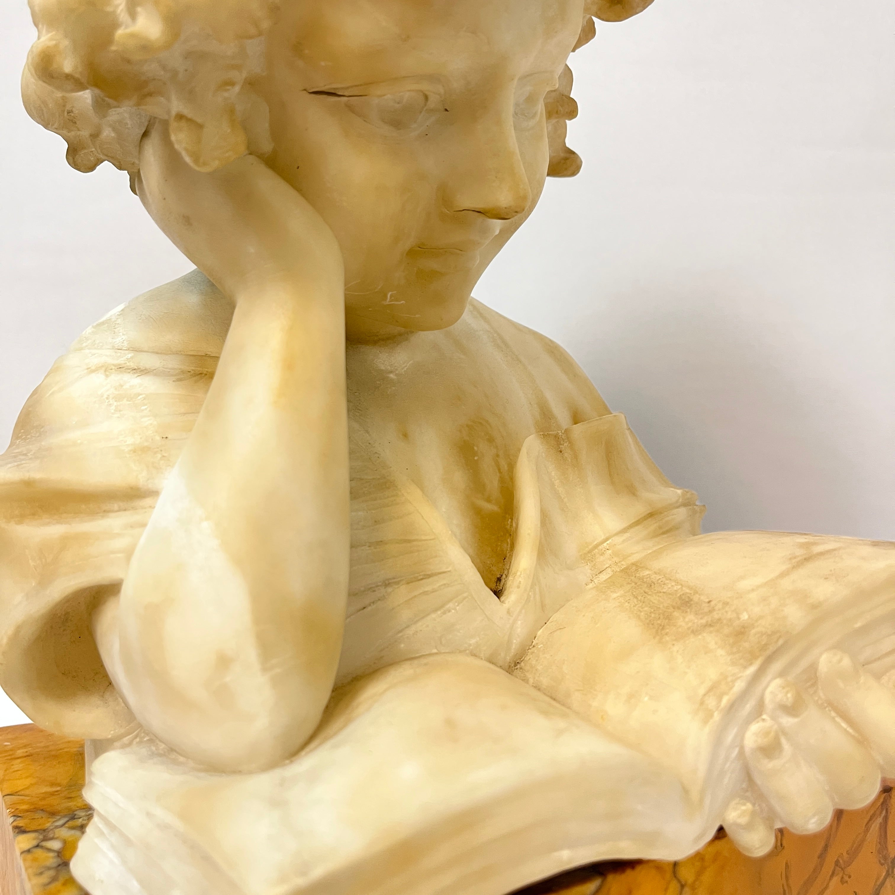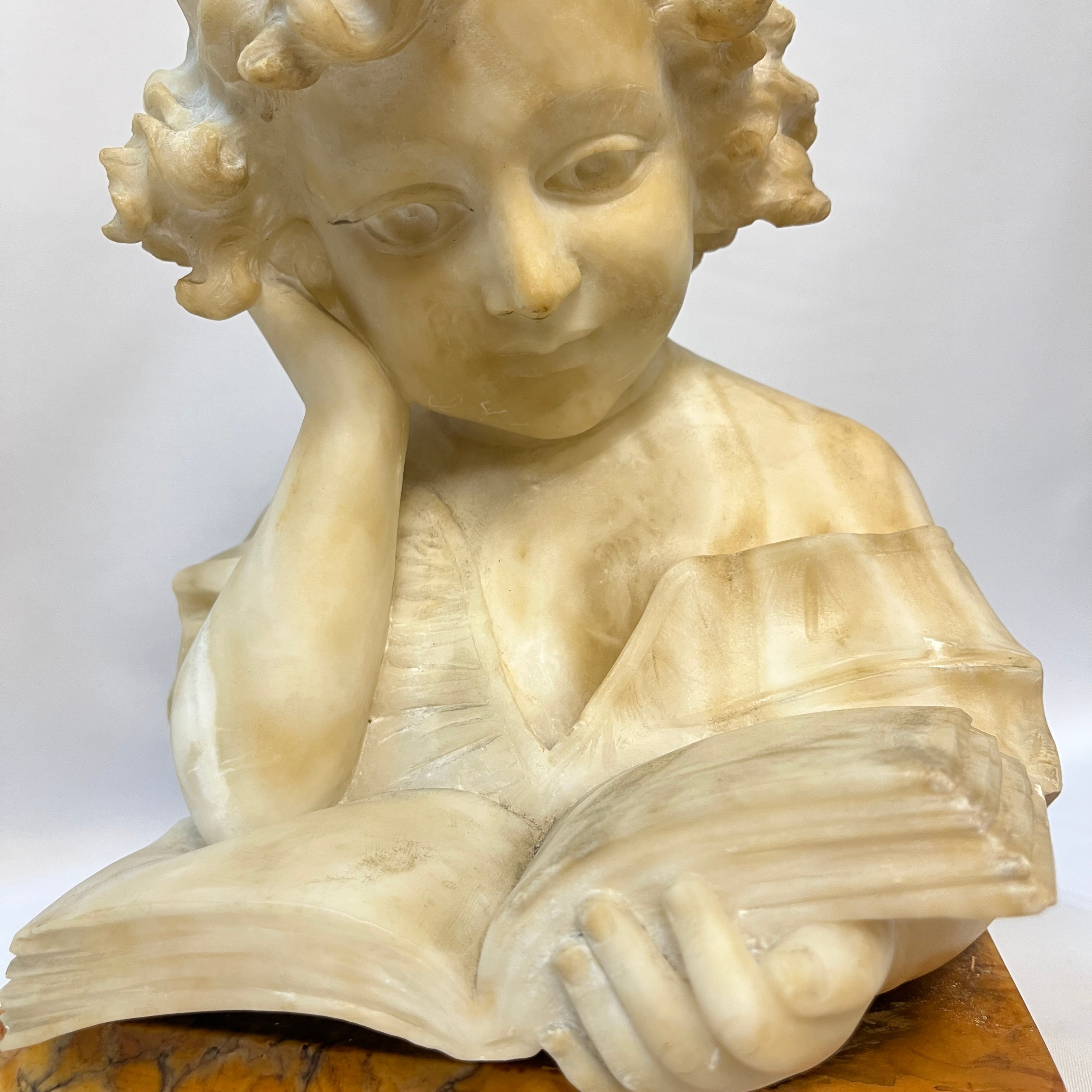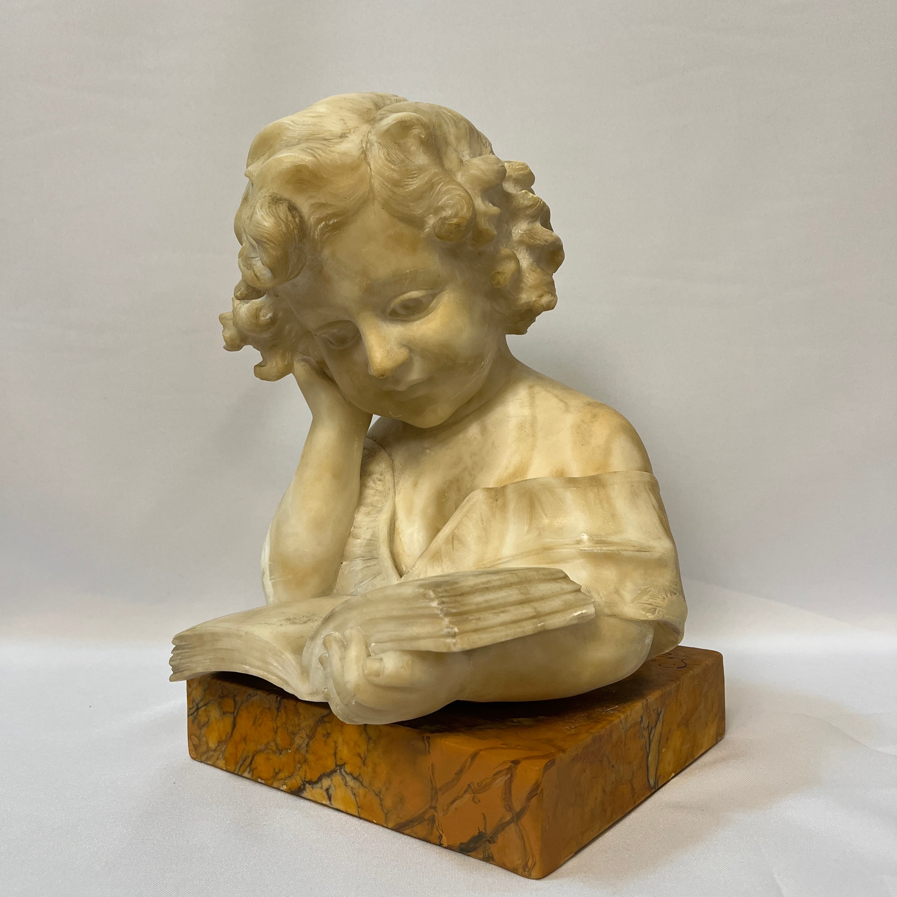 Esta es una de las piezas más reconocidas y reproducidas del escultor italiano Cristoforo Vicari, hecha de alabastro sobre una base de mármol amarillo de Siena, firmada en la base por el mismo. Su trabajo se caracterizó por sus esculturas de bustos y rostros femeninos, siendo la ‘Niña Leyendo’ una pieza especial que posee un carácter dulce e inocente.