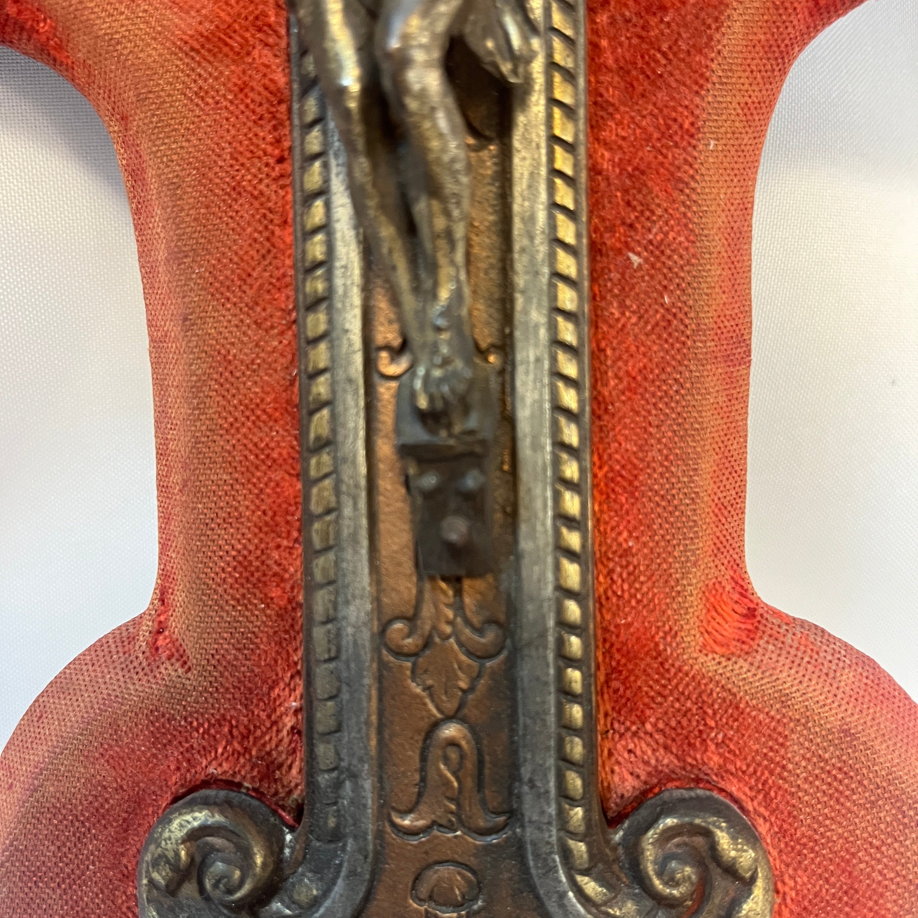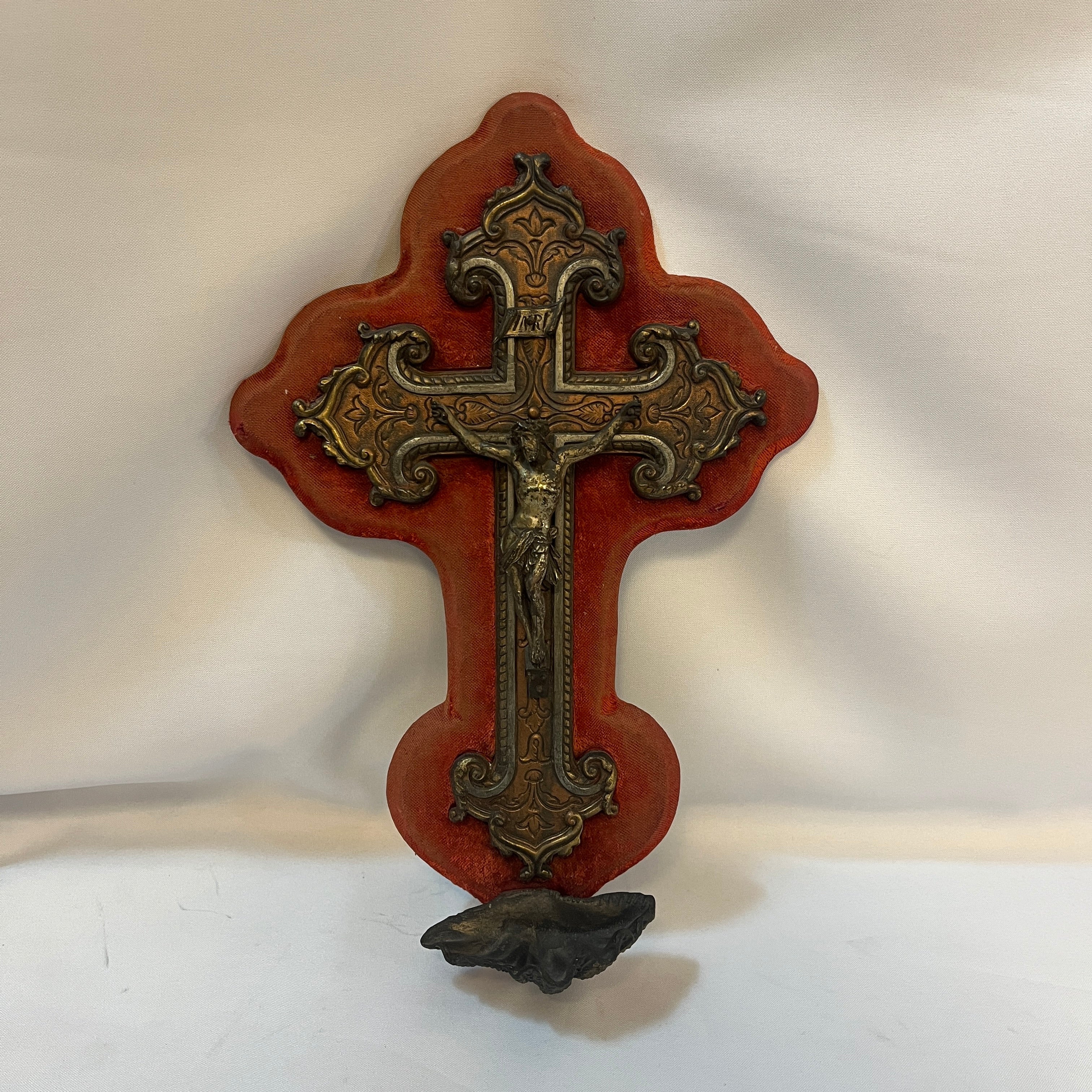 Exclusivo Crucifijo de origen francés de mediados del s. XIX. Pieza compuesta por una cruz de madera revestida de terciopelo rojo de base, sobre la cual se superpone un crucifijo en bronce y cobre trabajado al buril. La parte inferior contiene el receptáculo destinado a contener agua bendita, lo que lo convierte en una pieza devocional funcional y además de decorativa.