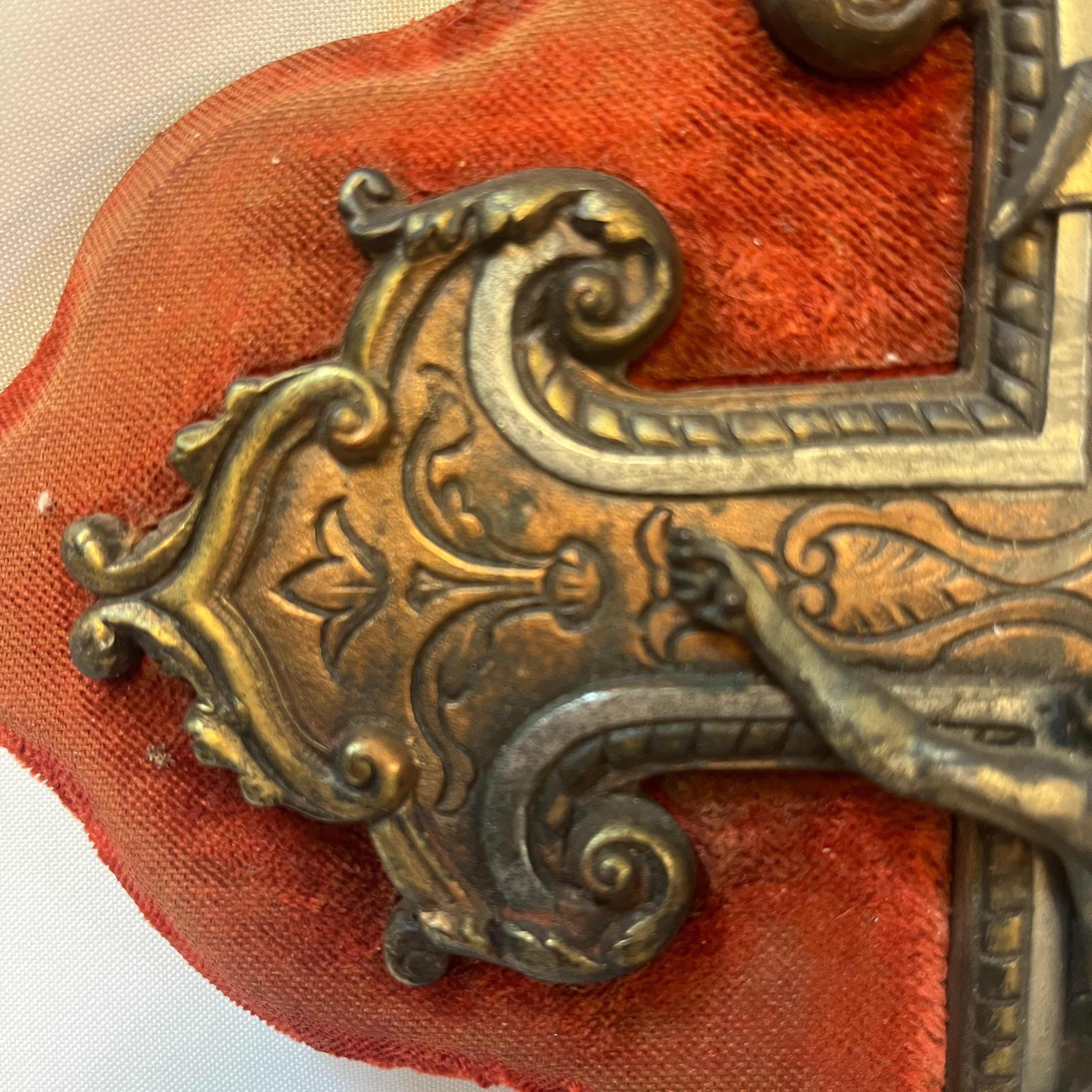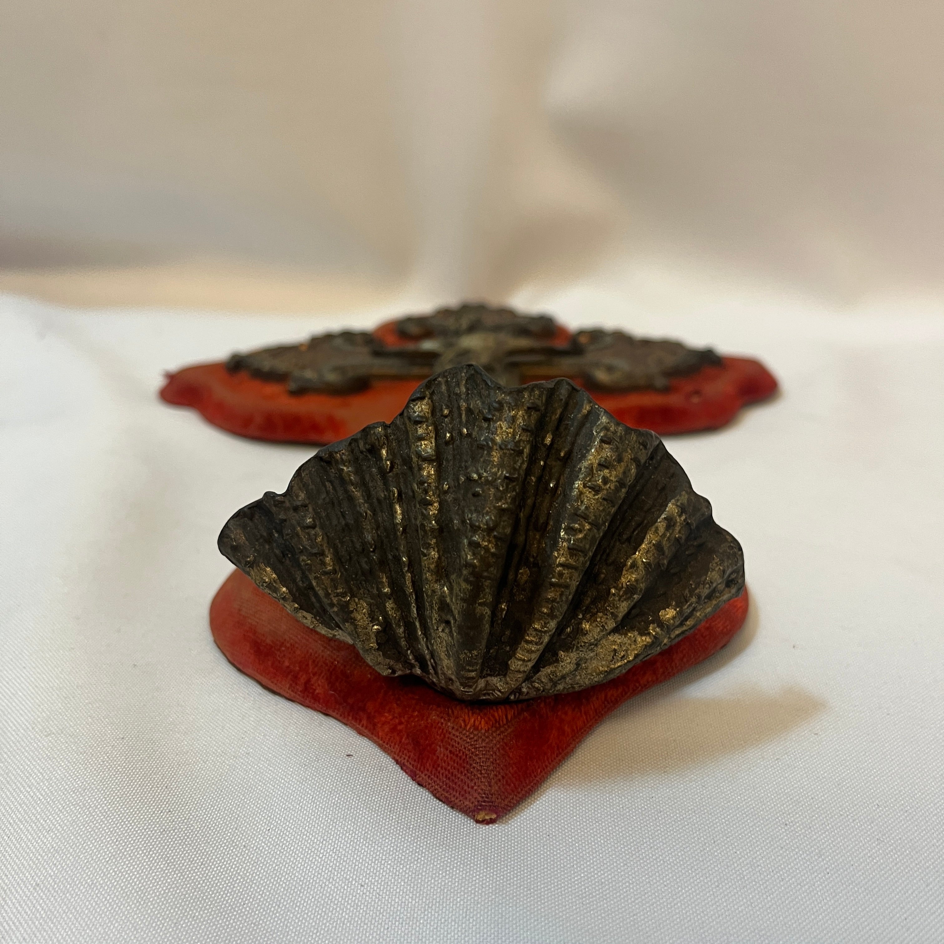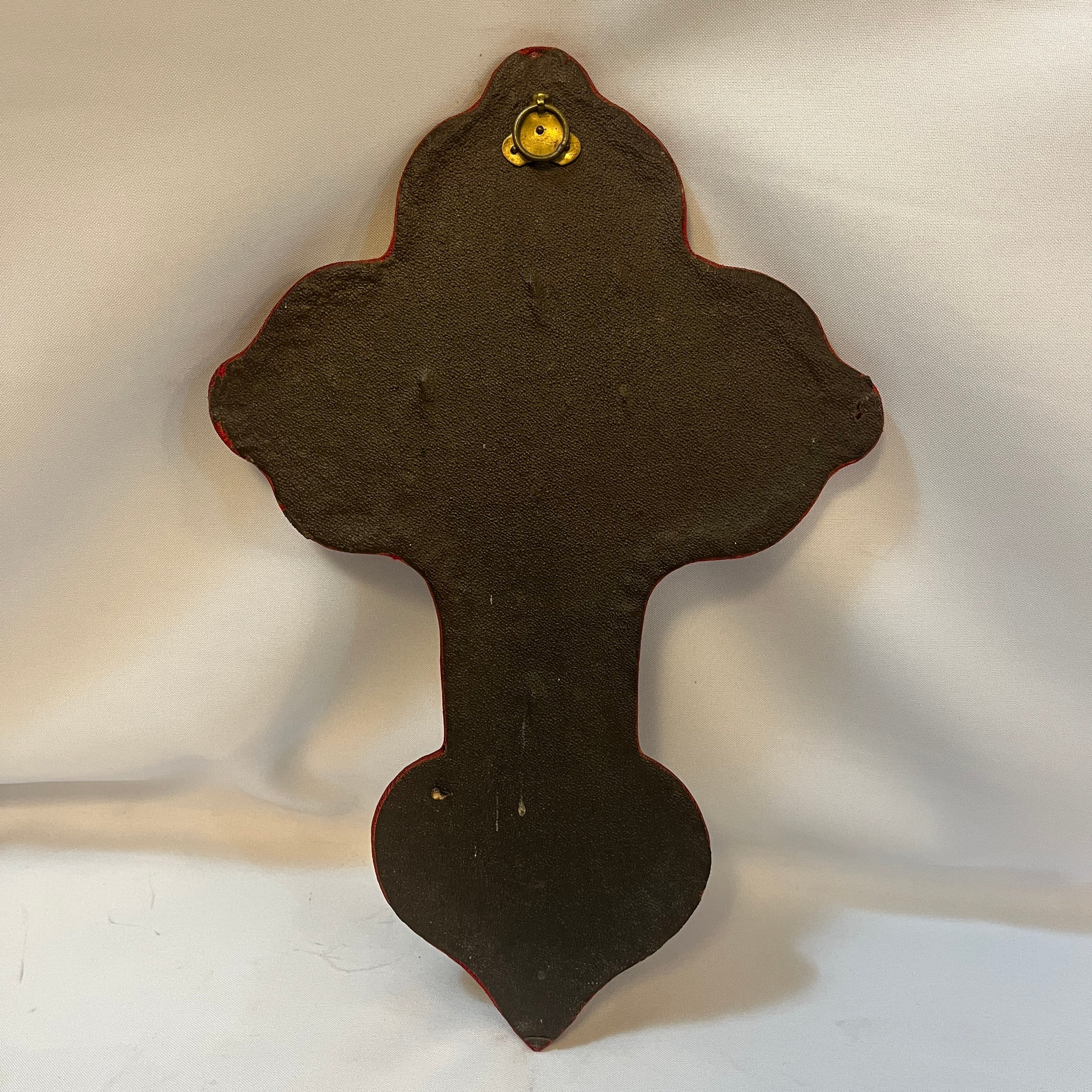 Crucifijo con benditera francés en bronce y madera sobre terciopelo rojo fines s.XIX