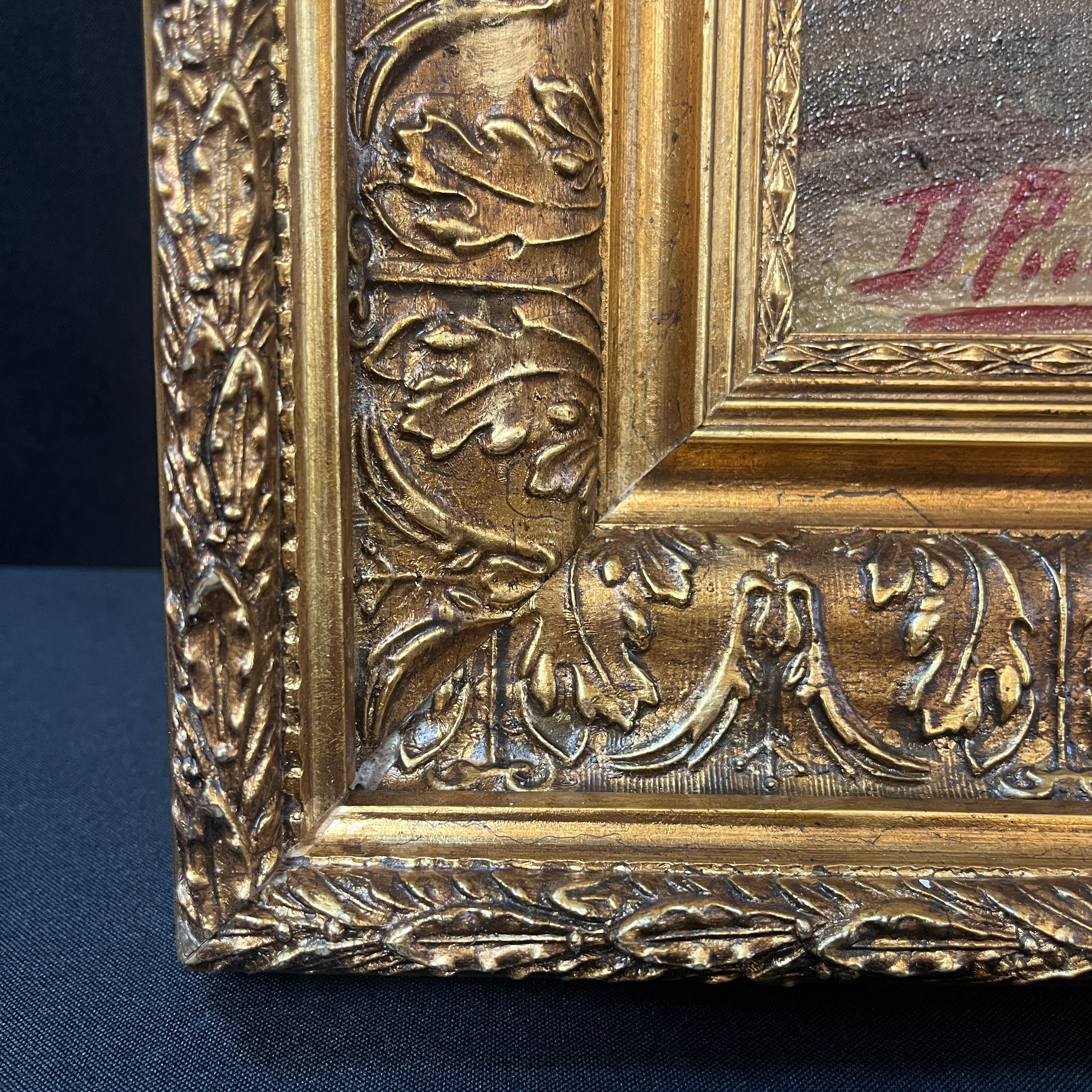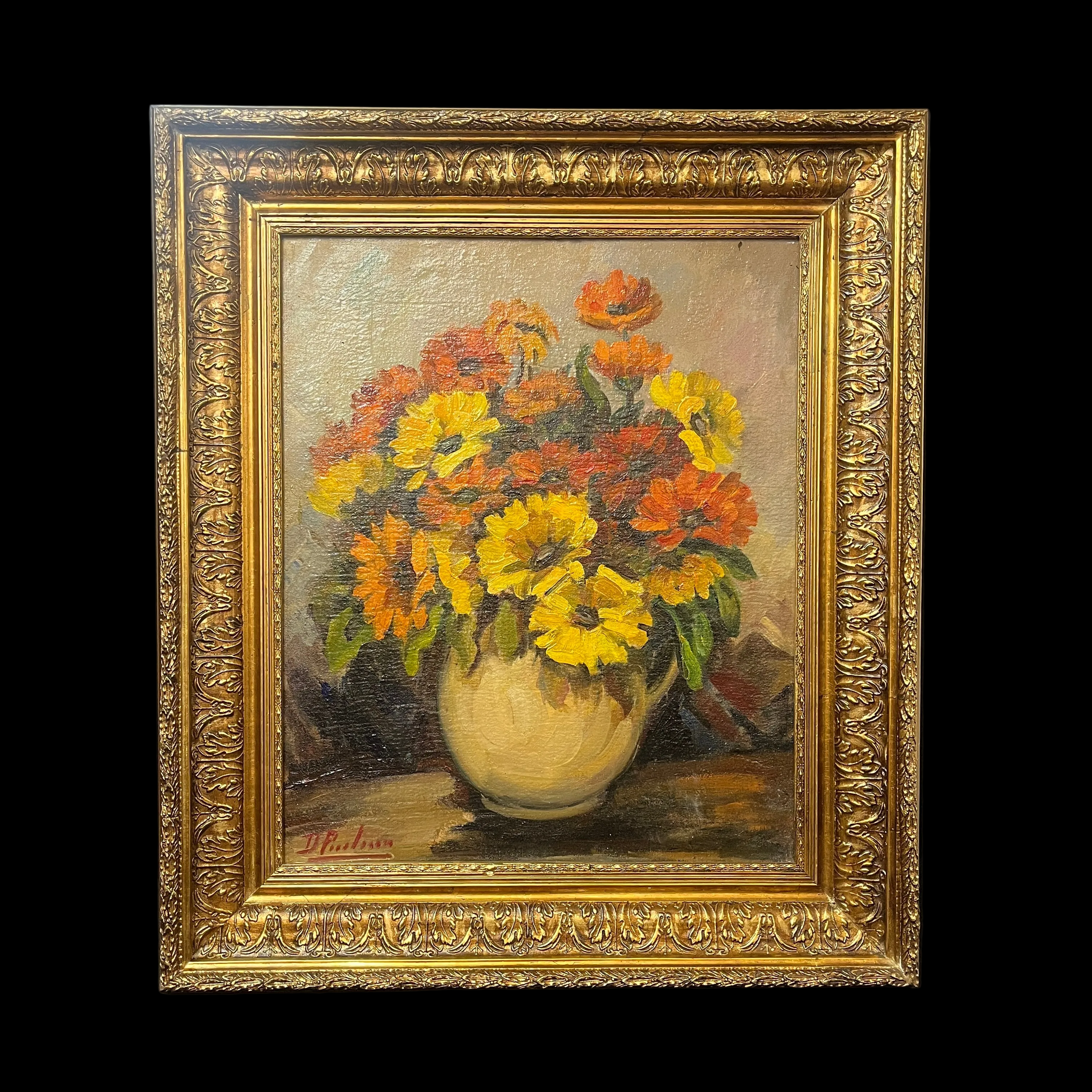 Bello óleo de la reconocida pintora, escultora y profesora chilena Dora Puelma (1898-1972), tenemos en un primer plano un gran jarrón blanco con asa lateral y un ramillete de gerberas de tonos amarillos y naranjos. Es una pintura que cautiva por su realismo e intensidad en sus colores.