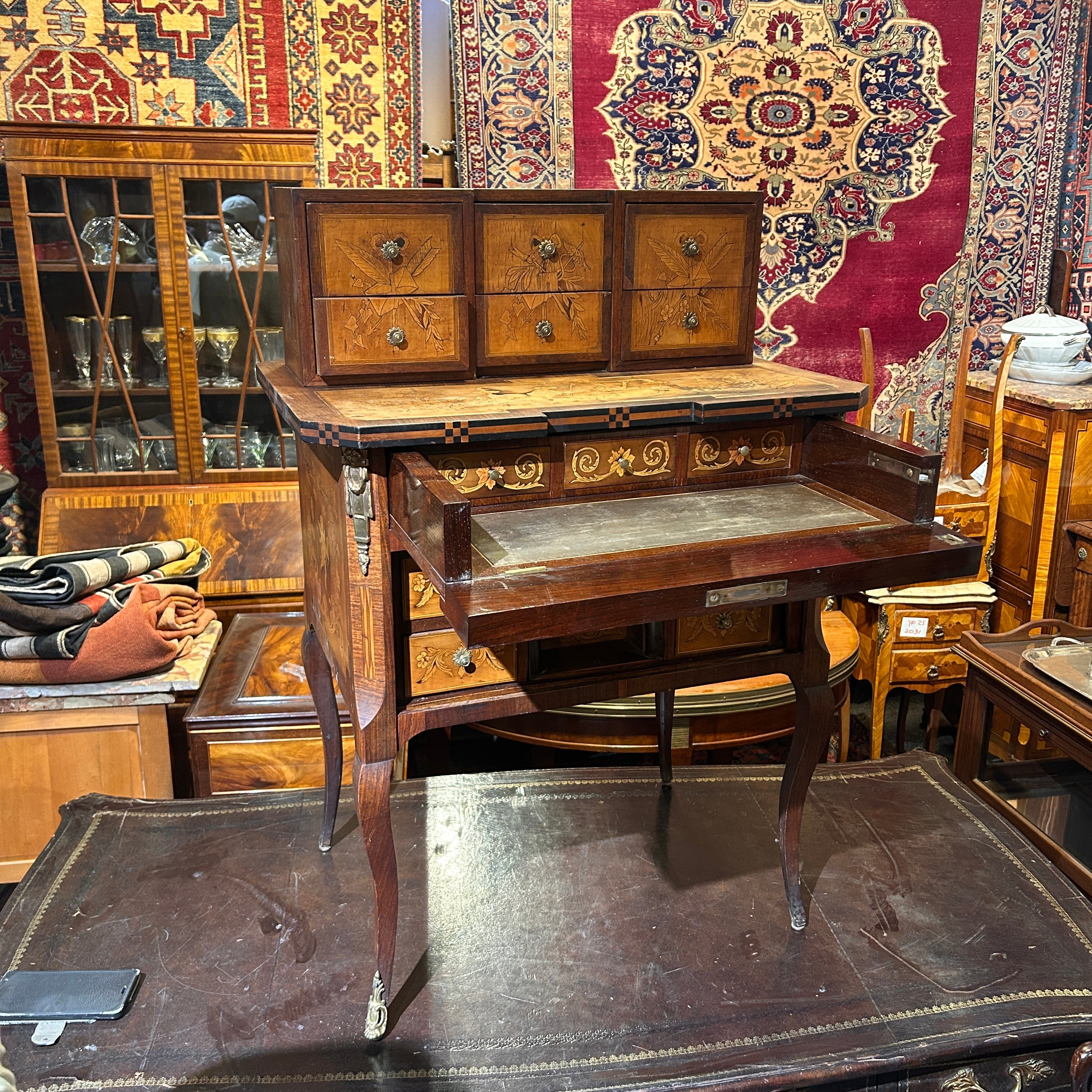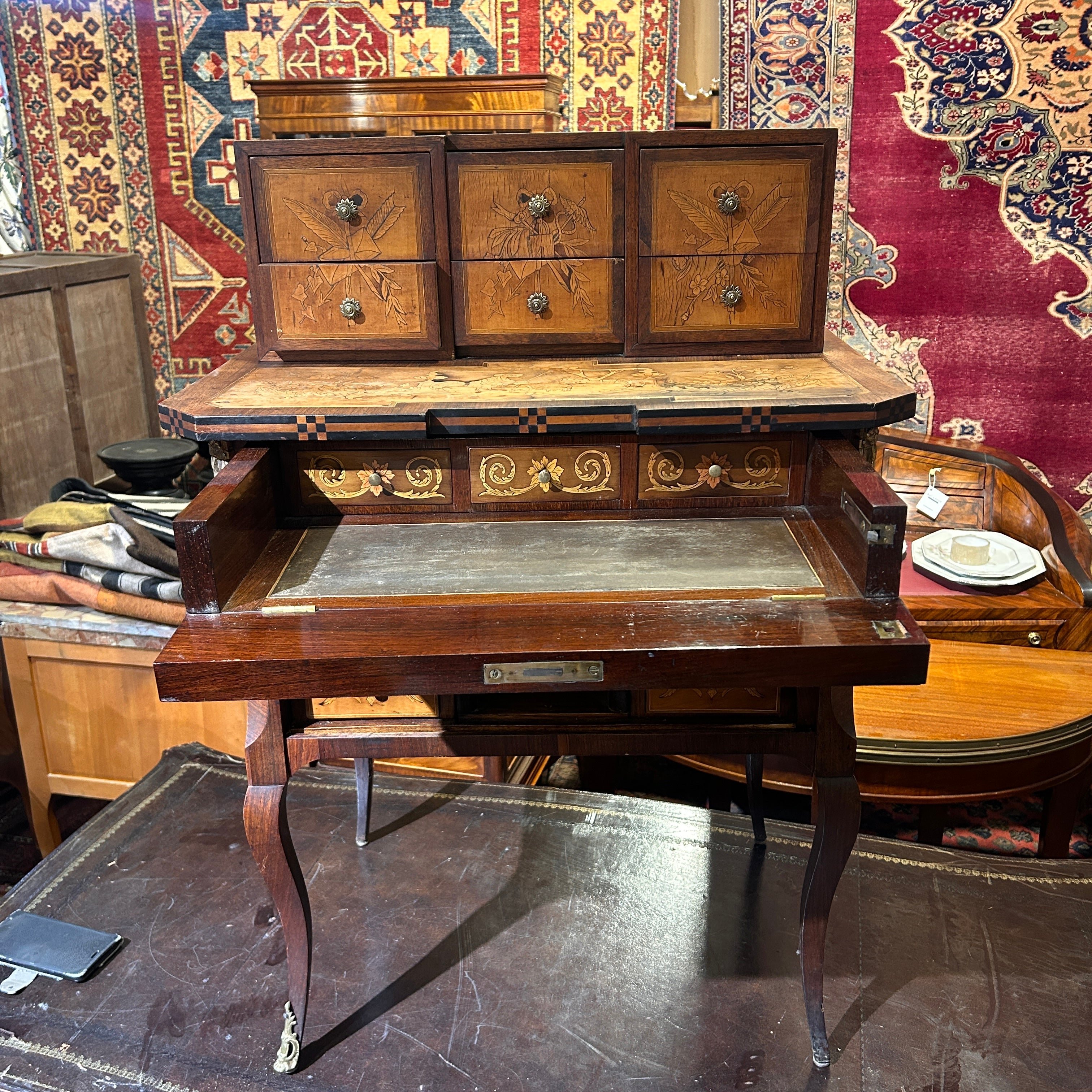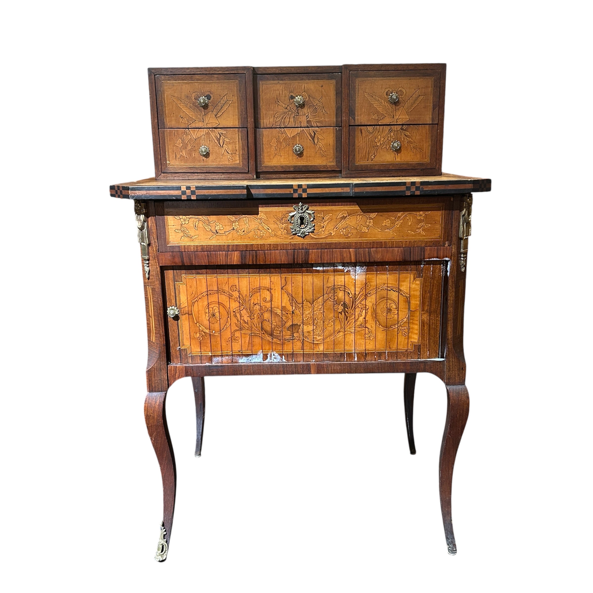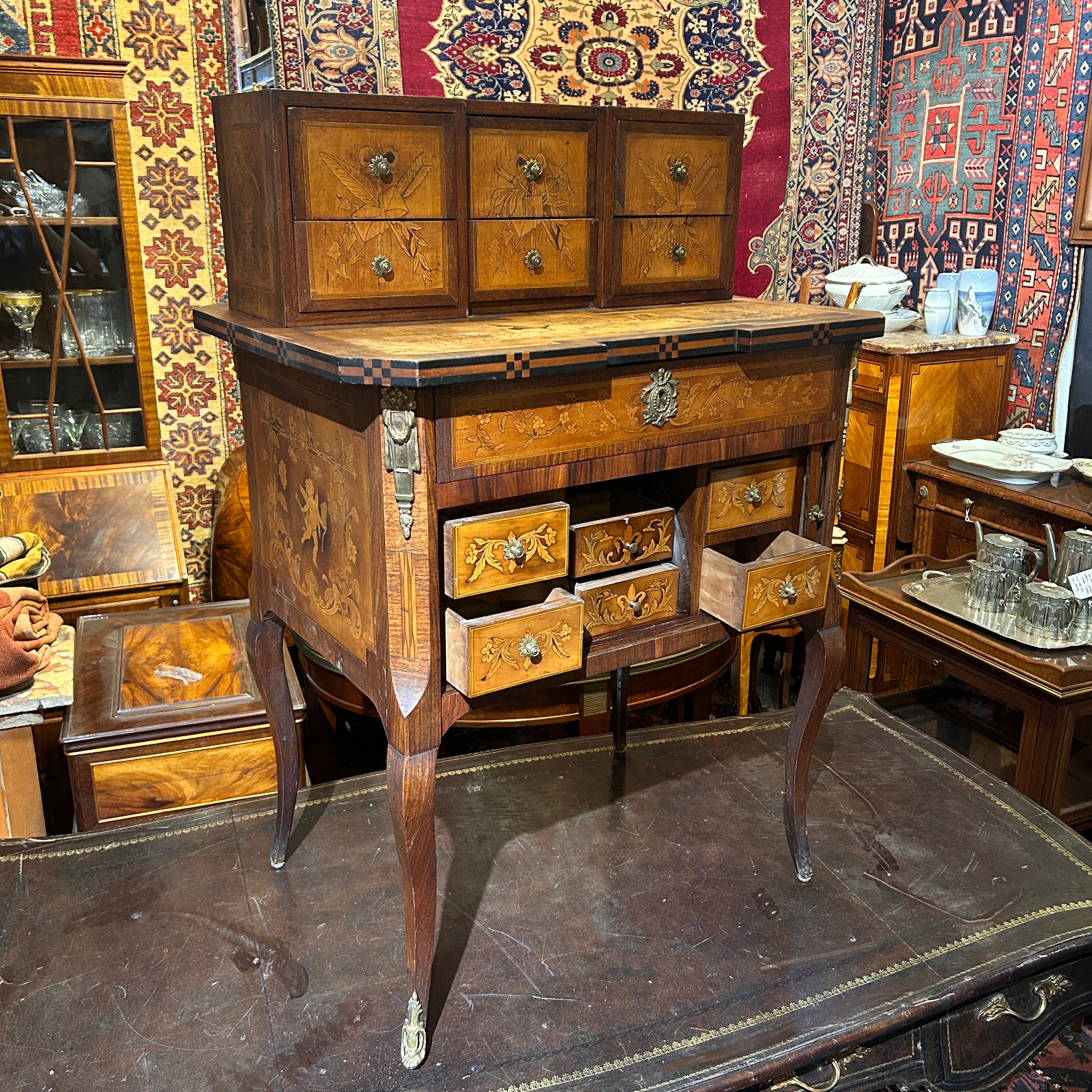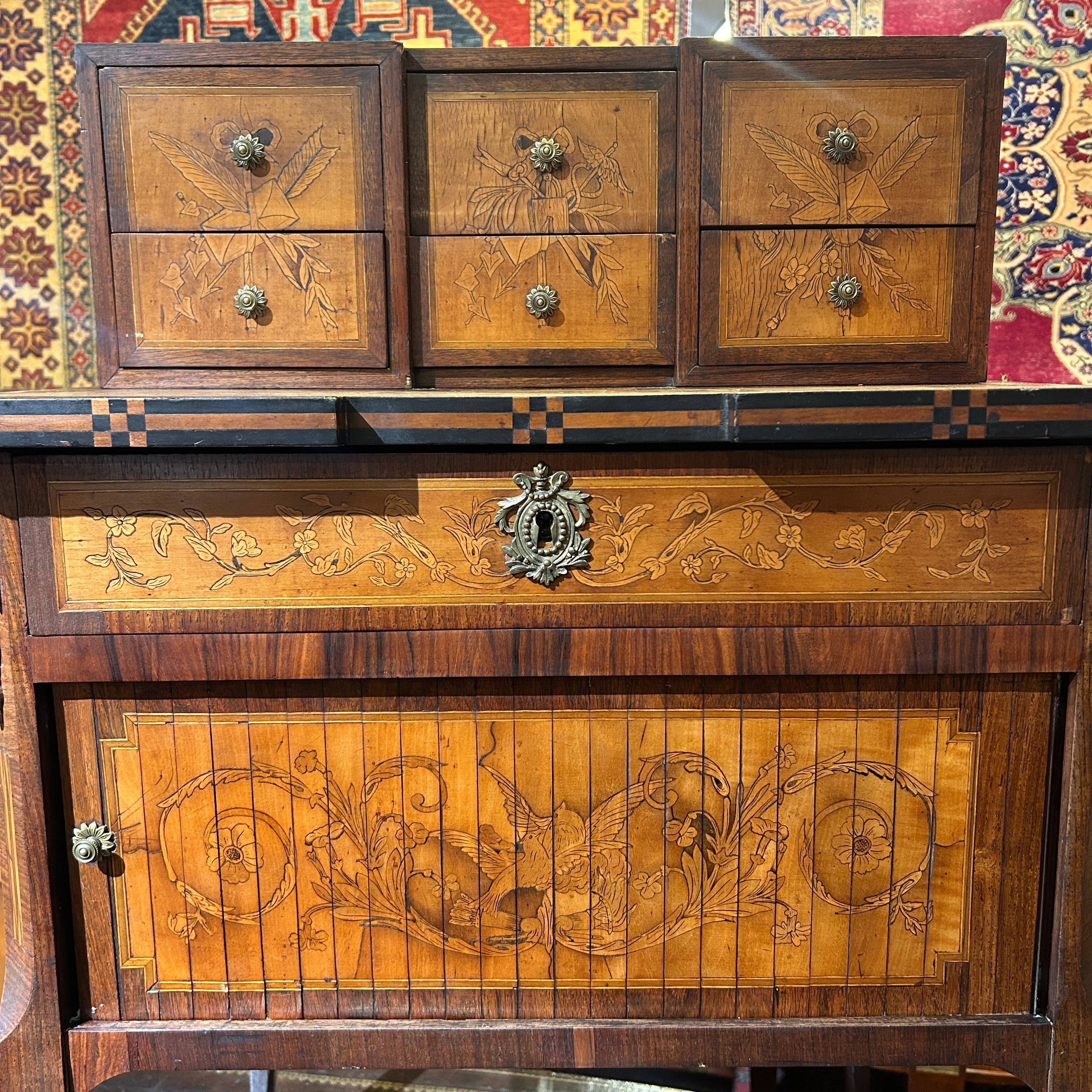 Secretaire de ensueño para dama estilo Bonheur du Jour, un tipo de mueble pensado específicamente para las mujeres. Es estilo Transición de mediados del siglo XIX. Tiene seis cajones pirograbados en la parte superior con tiradores florales de bronce. Cuenta con una hermosa separación de nivel en marquetería con la imagen de una pastora y sus animales. En el centro está la superficie abatible con base de cuero y borde grabado dorado para escribir y cuenta con cerradura independiente. En la parte inferior un pequeño armario con puerta corrediza de delicada marquetería y en su interior seis cajones más. Por último, elegantes y finas patas curvas. El mueble en su conjunto es estilo Charles Topino.