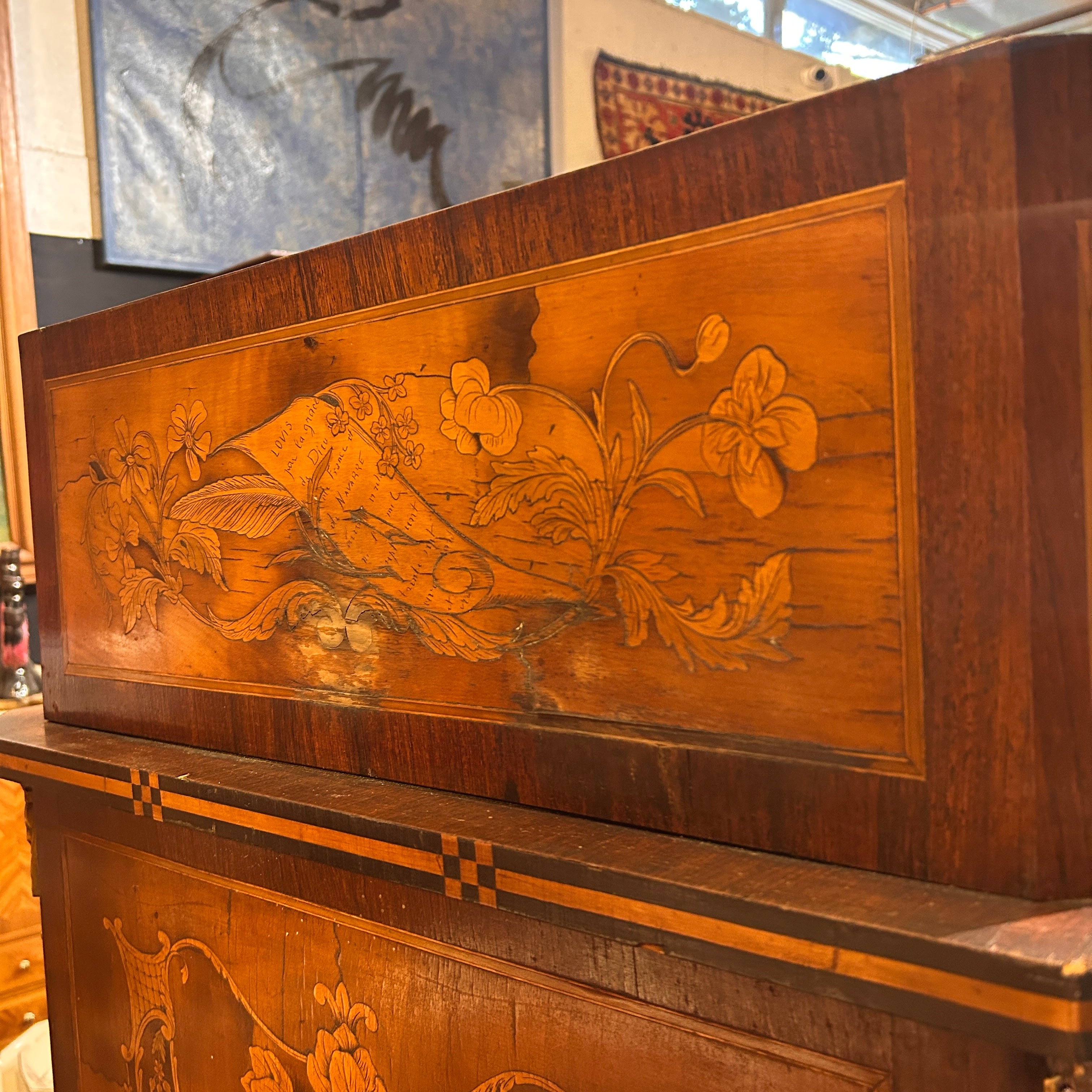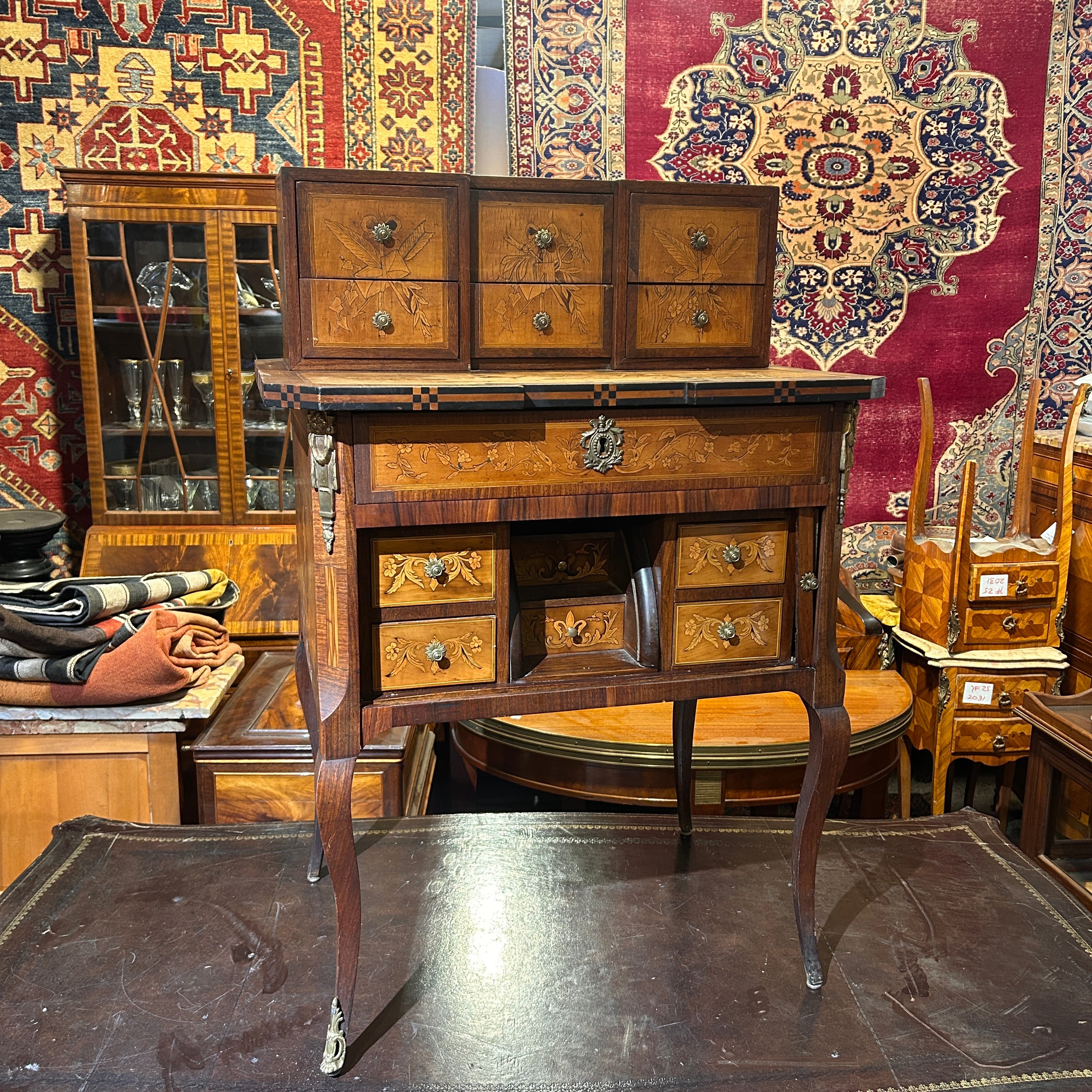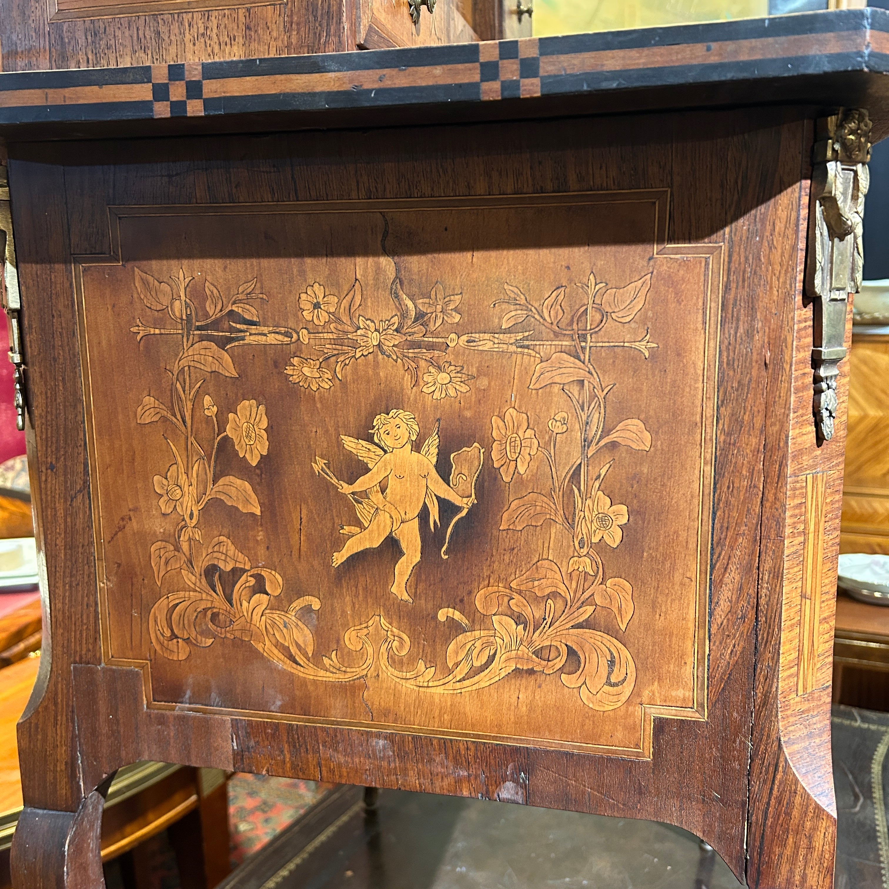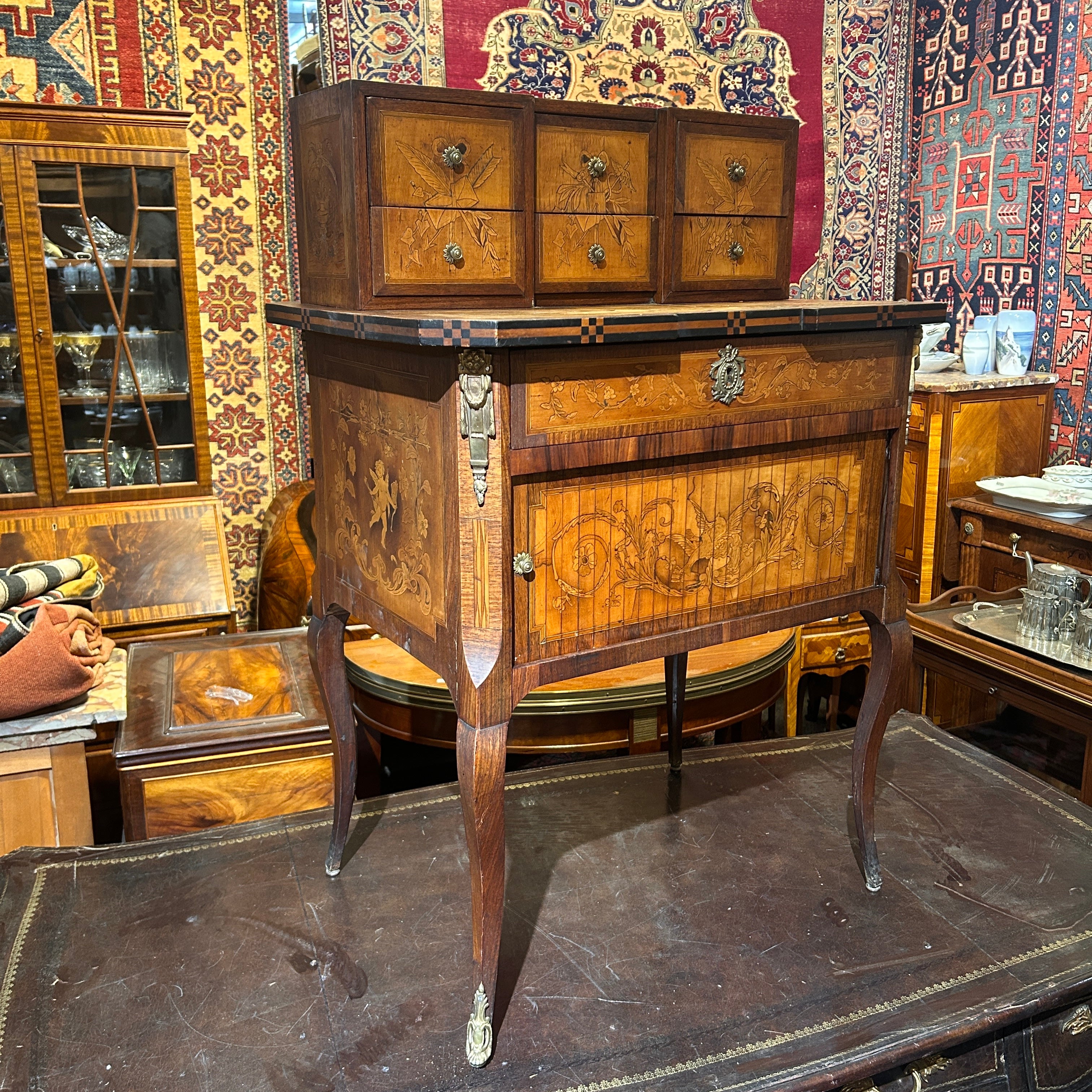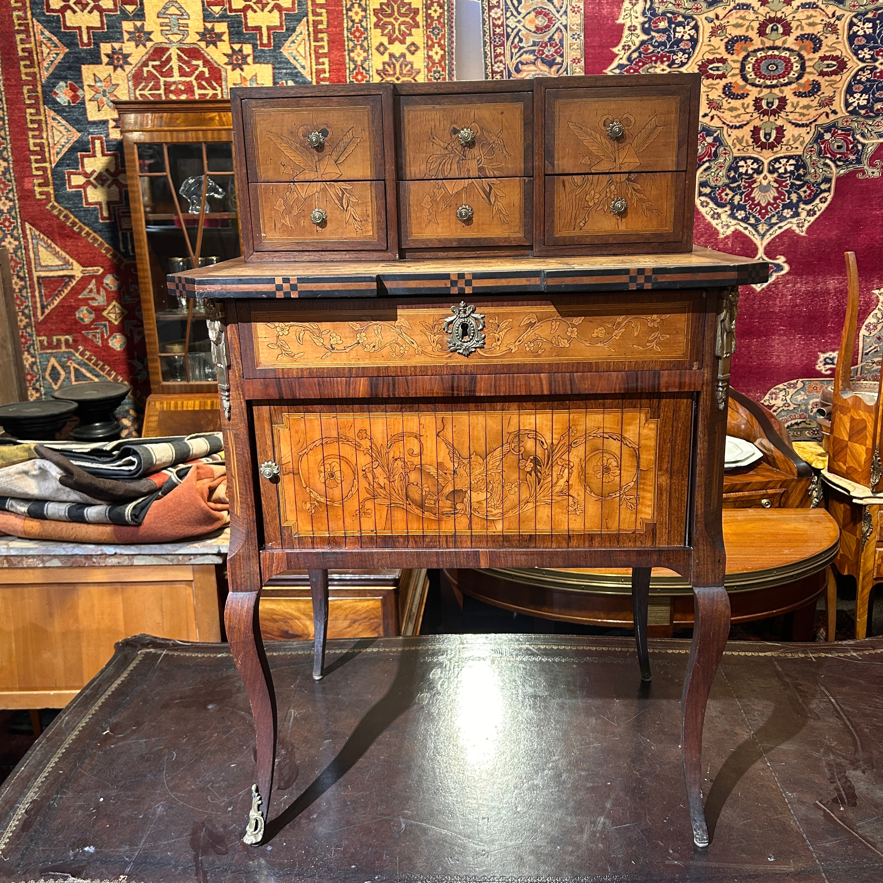 Secretaire de ensueño para dama estilo Bonheur du Jour, un tipo de mueble pensado específicamente para las mujeres. Es estilo Transición de mediados del siglo XIX. Tiene seis cajones pirograbados en la parte superior con tiradores florales de bronce. Cuenta con una hermosa separación de nivel en marquetería con la imagen de una pastora y sus animales. En el centro está la superficie abatible con base de cuero y borde grabado dorado para escribir y cuenta con cerradura independiente. En la parte inferior un pequeño armario con puerta corrediza de delicada marquetería y en su interior seis cajones más. Por último, elegantes y finas patas curvas. El mueble en su conjunto es estilo Charles Topino.