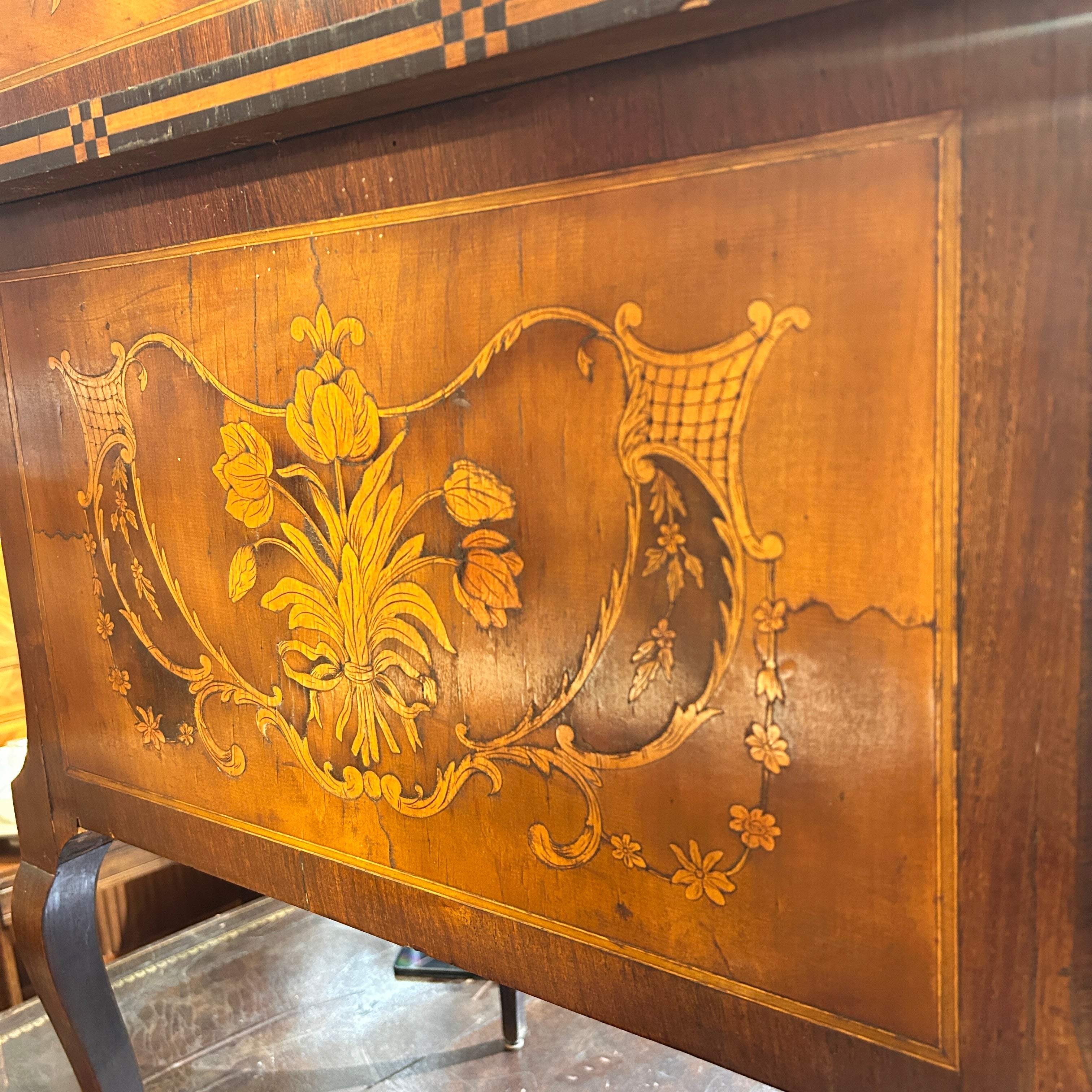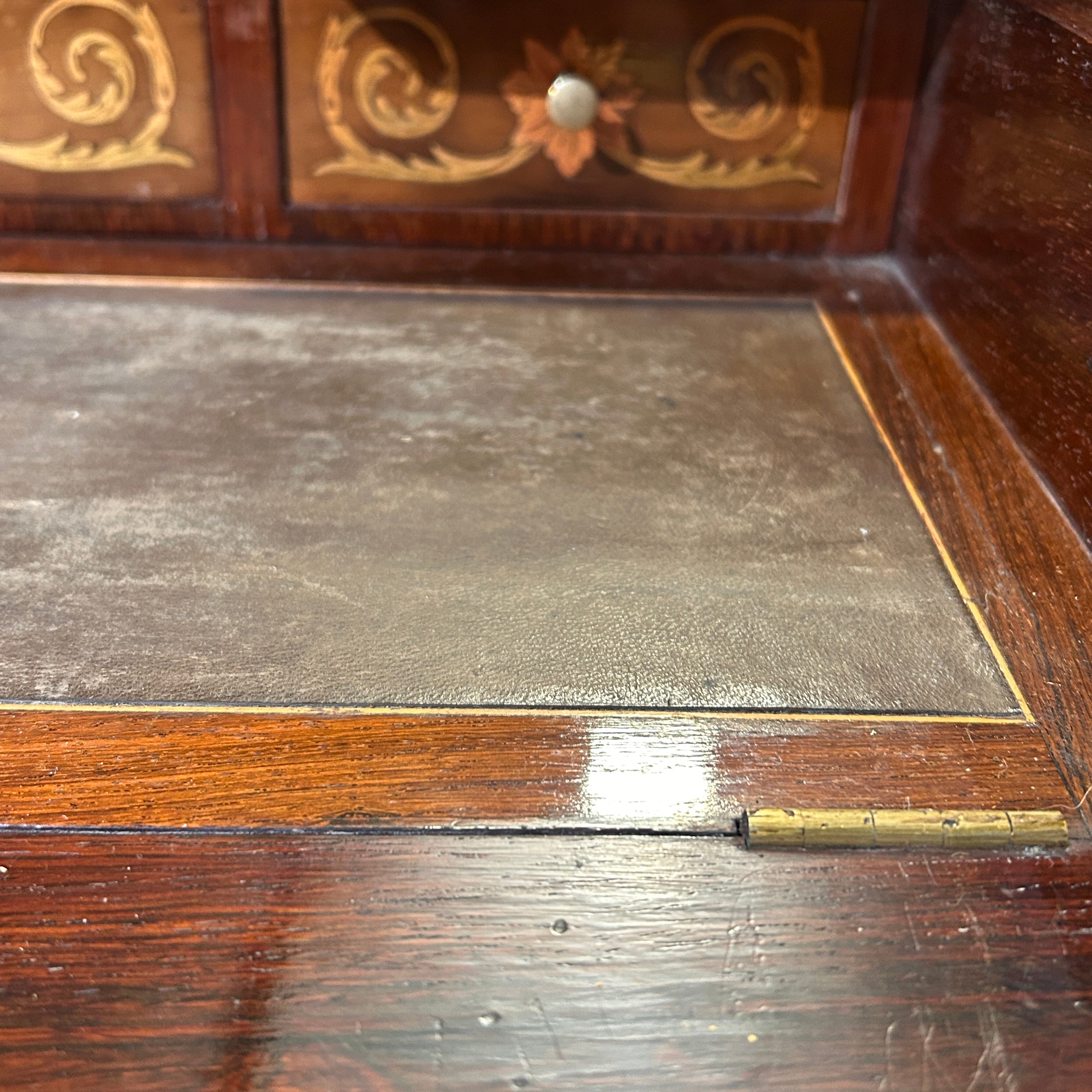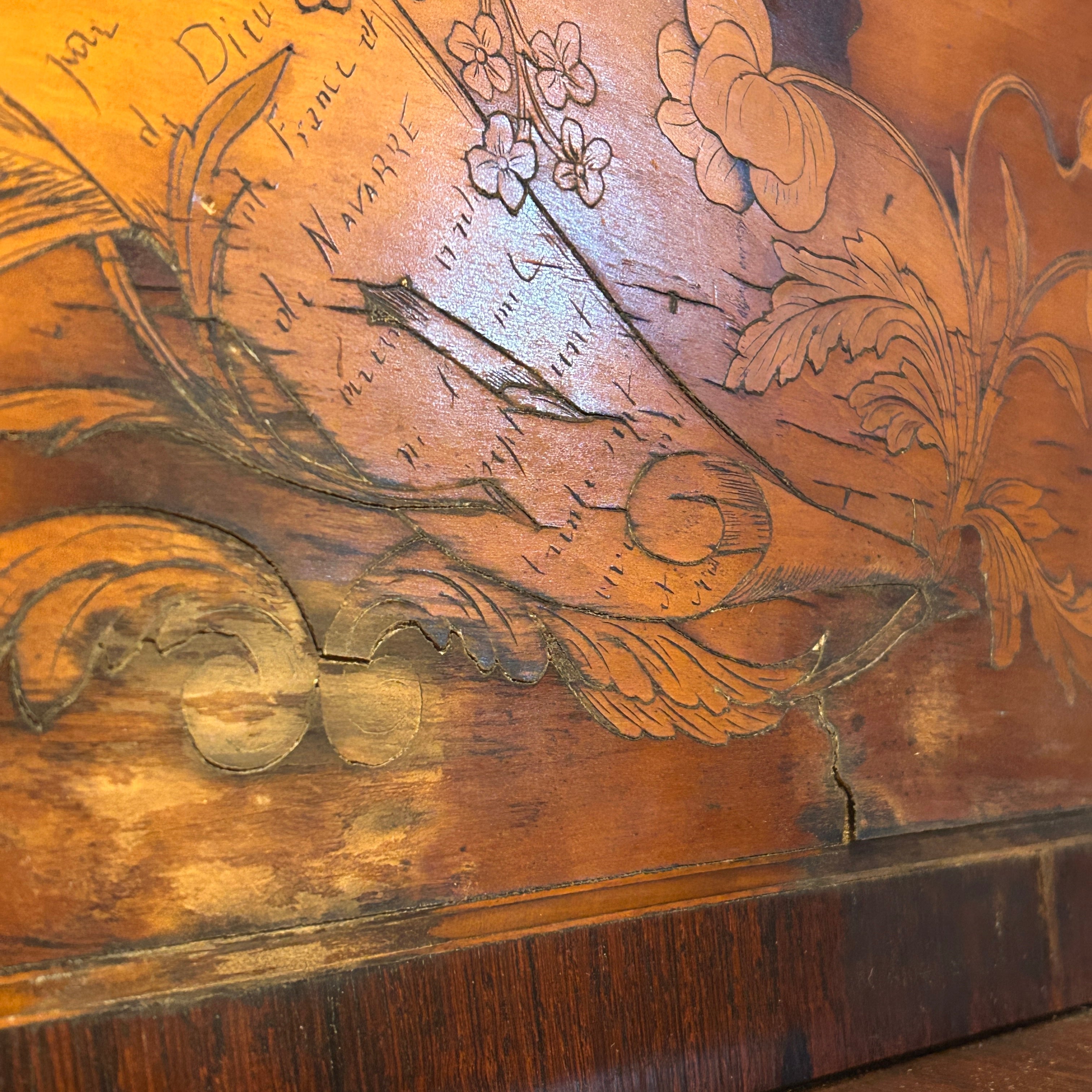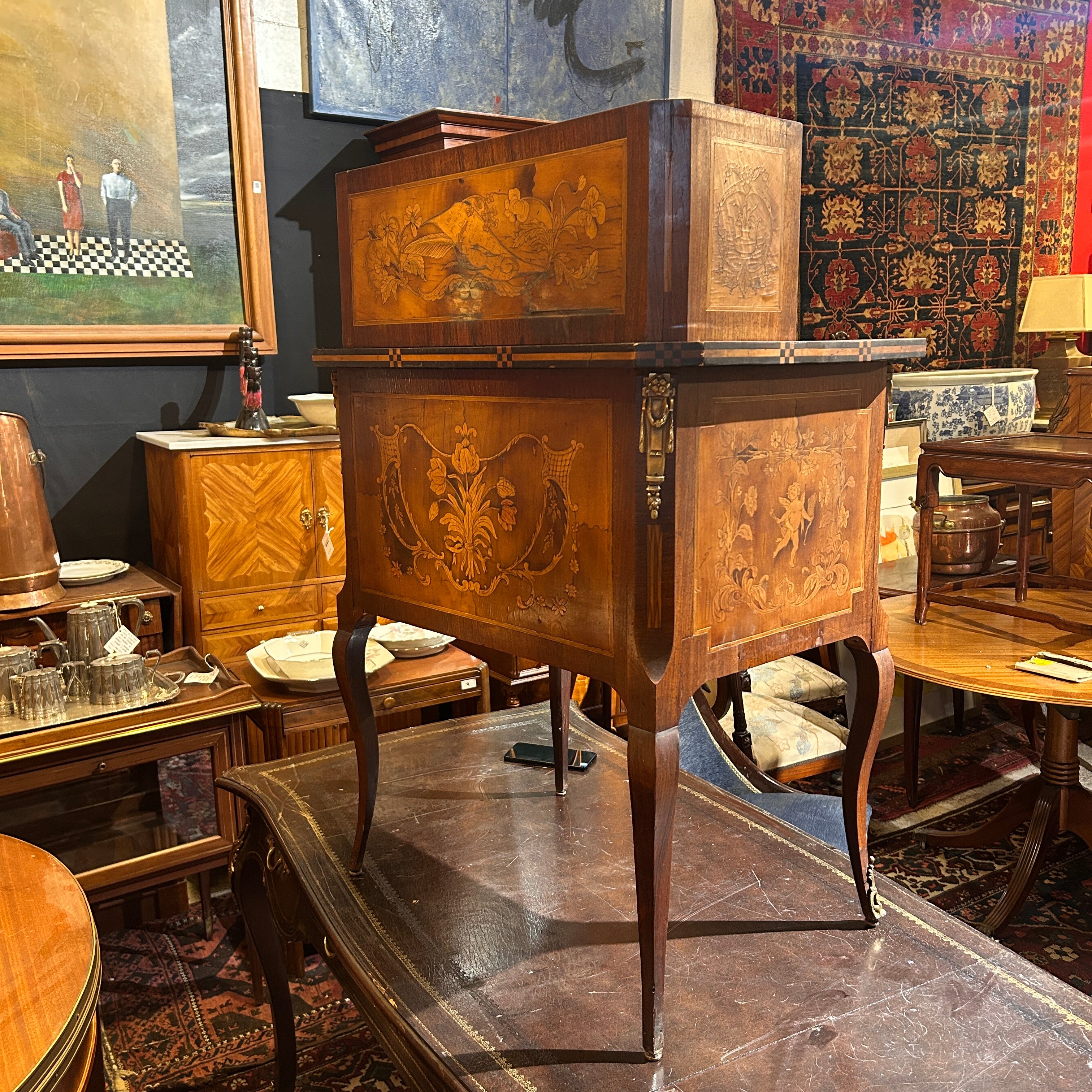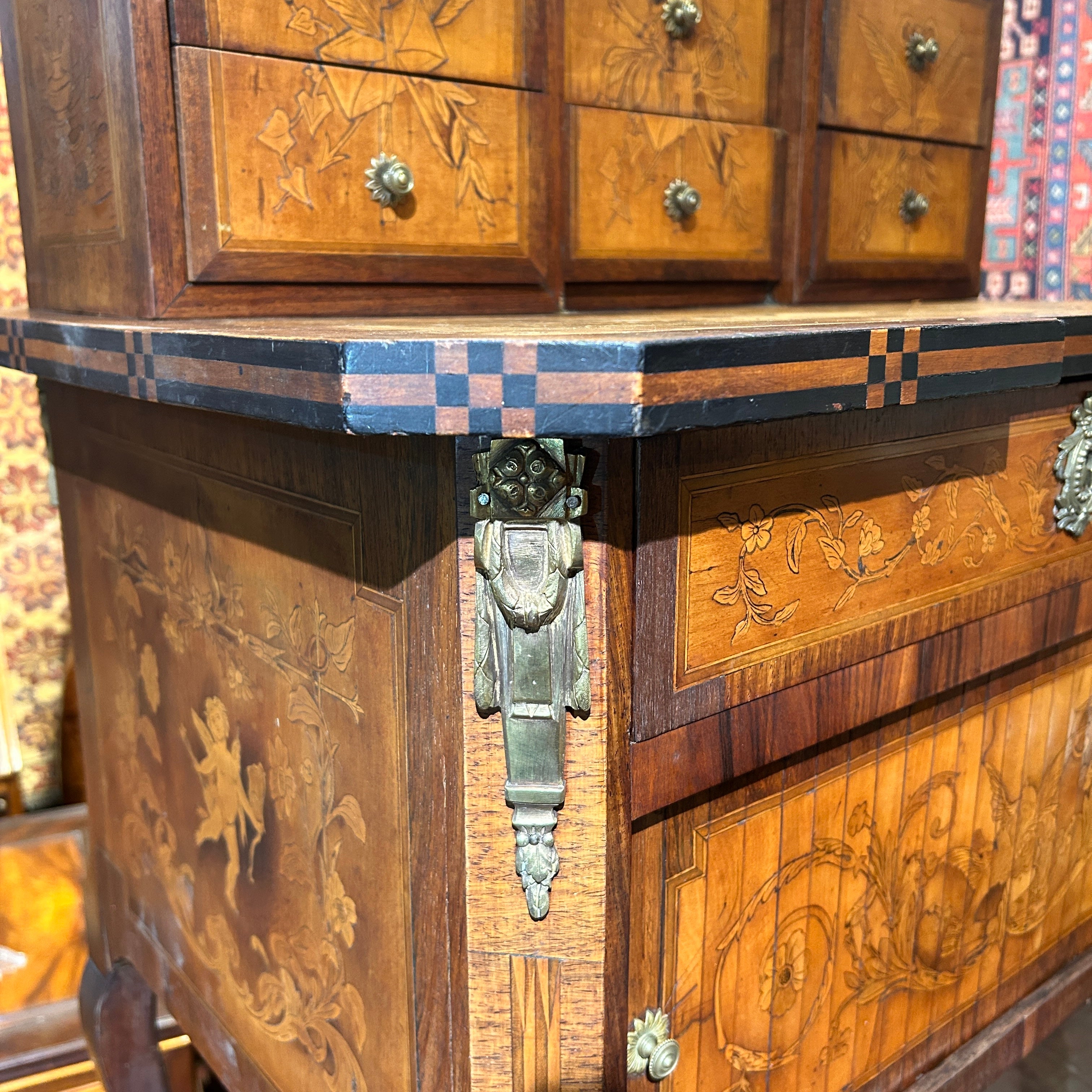 Secretaire de ensueño para dama estilo Bonheur du Jour, un tipo de mueble pensado específicamente para las mujeres. Es estilo Transición de mediados del siglo XIX. Tiene seis cajones pirograbados en la parte superior con tiradores florales de bronce. Cuenta con una hermosa separación de nivel en marquetería con la imagen de una pastora y sus animales. En el centro está la superficie abatible con base de cuero y borde grabado dorado para escribir y cuenta con cerradura independiente. En la parte inferior un pequeño armario con puerta corrediza de delicada marquetería y en su interior seis cajones más. Por último, elegantes y finas patas curvas. El mueble en su conjunto es estilo Charles Topino.