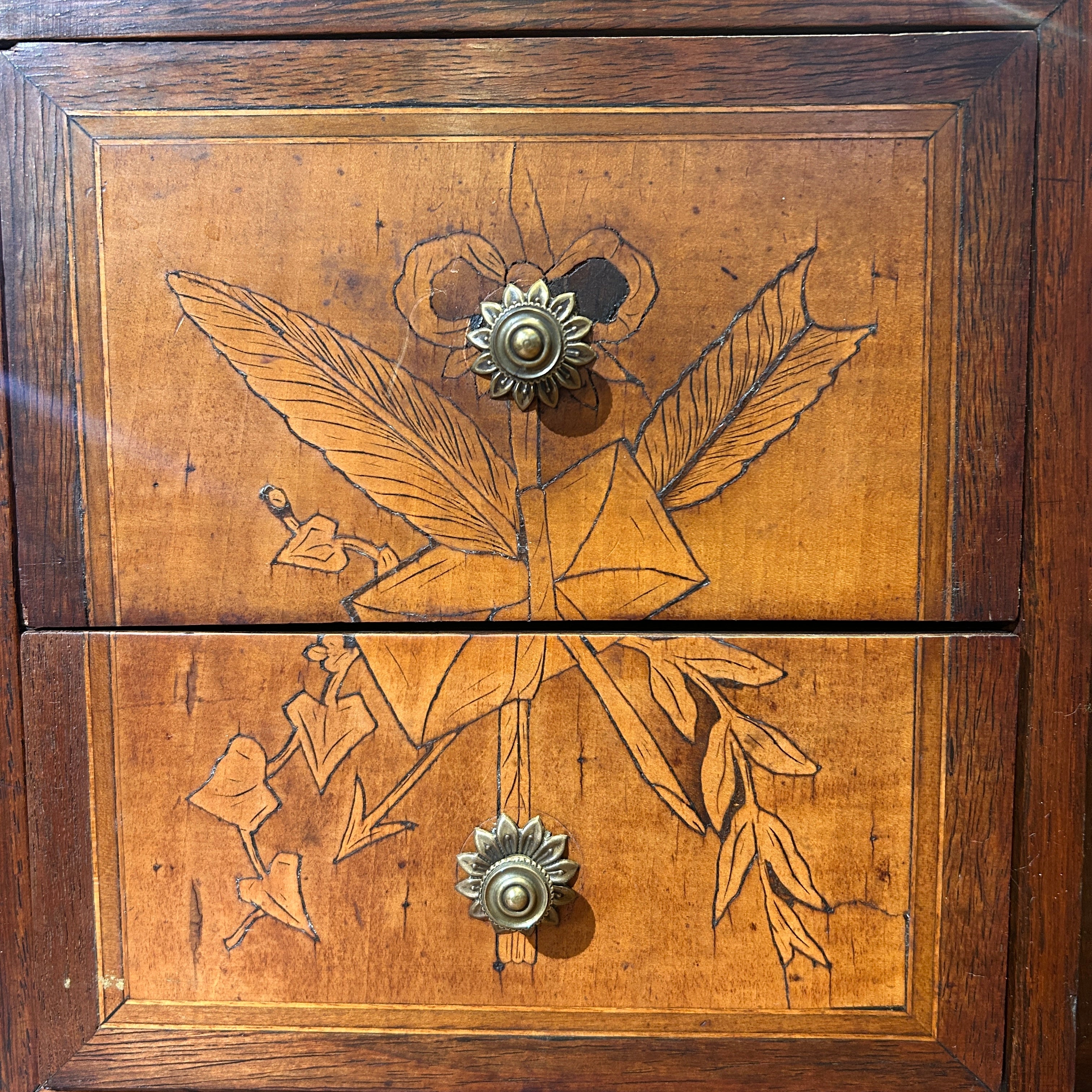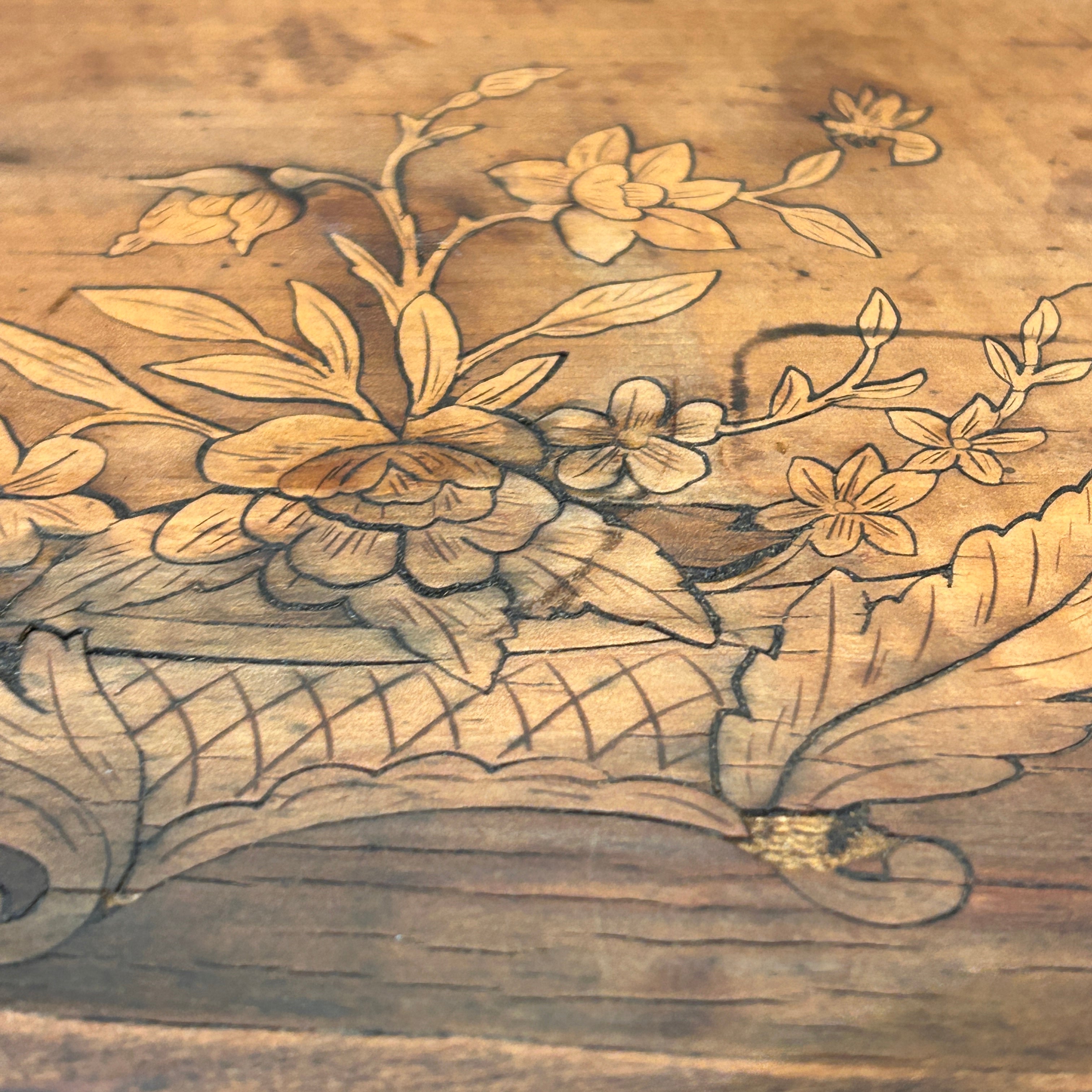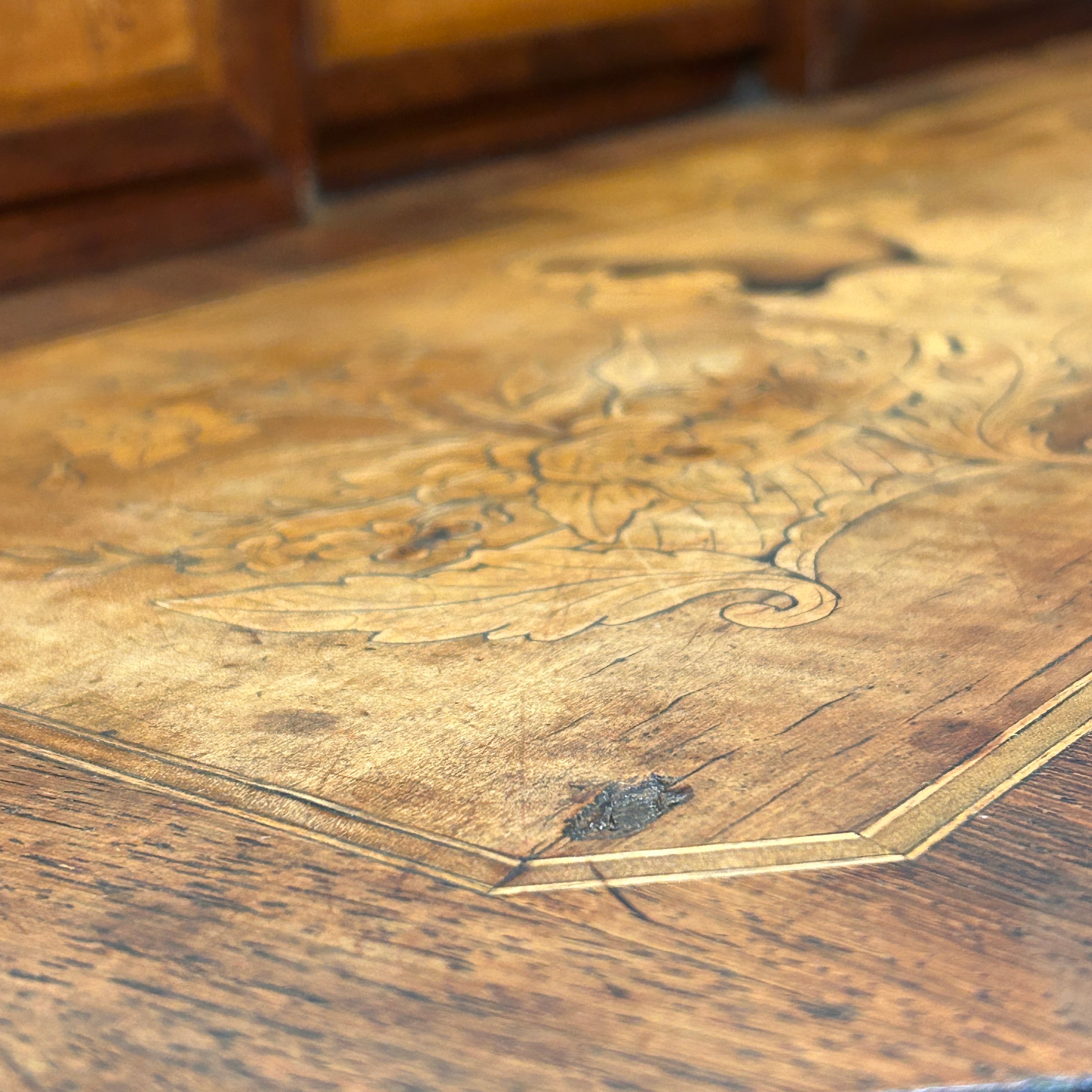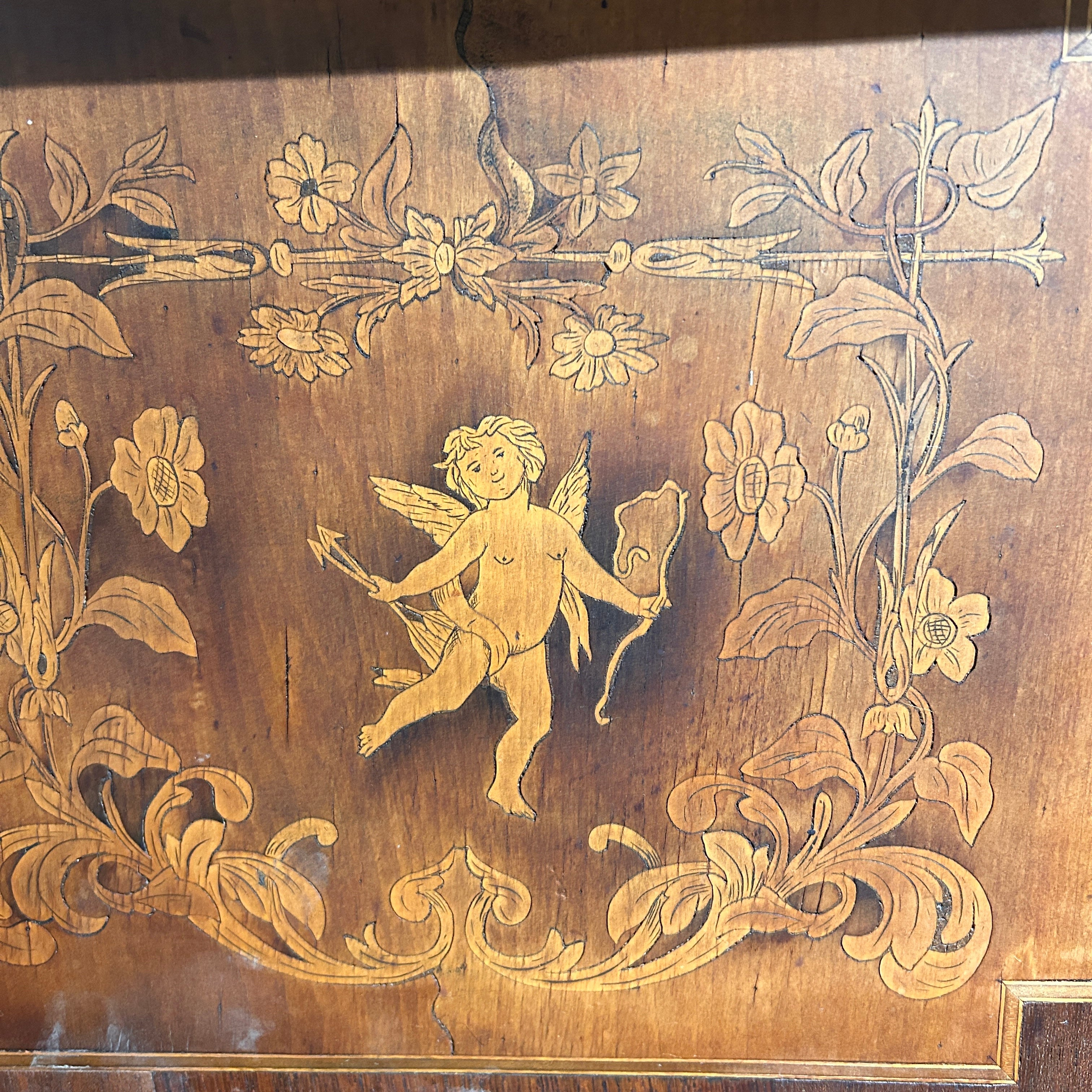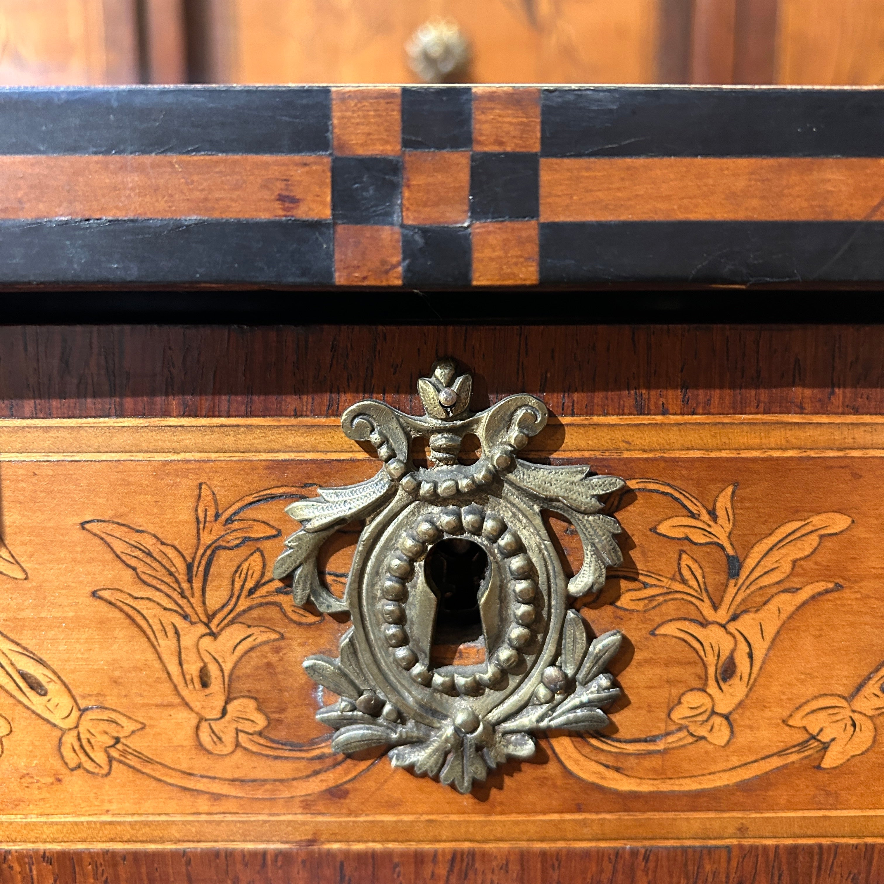 Secretaire de ensueño para dama estilo Bonheur du Jour, un tipo de mueble pensado específicamente para las mujeres. Es estilo Transición de mediados del siglo XIX. Tiene seis cajones pirograbados en la parte superior con tiradores florales de bronce. Cuenta con una hermosa separación de nivel en marquetería con la imagen de una pastora y sus animales. En el centro está la superficie abatible con base de cuero y borde grabado dorado para escribir y cuenta con cerradura independiente. En la parte inferior un pequeño armario con puerta corrediza de delicada marquetería y en su interior seis cajones más. Por último, elegantes y finas patas curvas. El mueble en su conjunto es estilo Charles Topino.