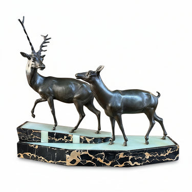 Magnética escultura de bronce de una pareja de ciervos, firmada por que reconocido escultor francés Prosper Lecourtier (1851-1925). El gran tamaño de la pieza permite poder observar en detalle el trabajo manual del escultor, destacando la minuciosidad con que esculpe a los animales y también ofrece un preciosa base de ónix color verde agua y un borde de mármol negro con vetas doradas.