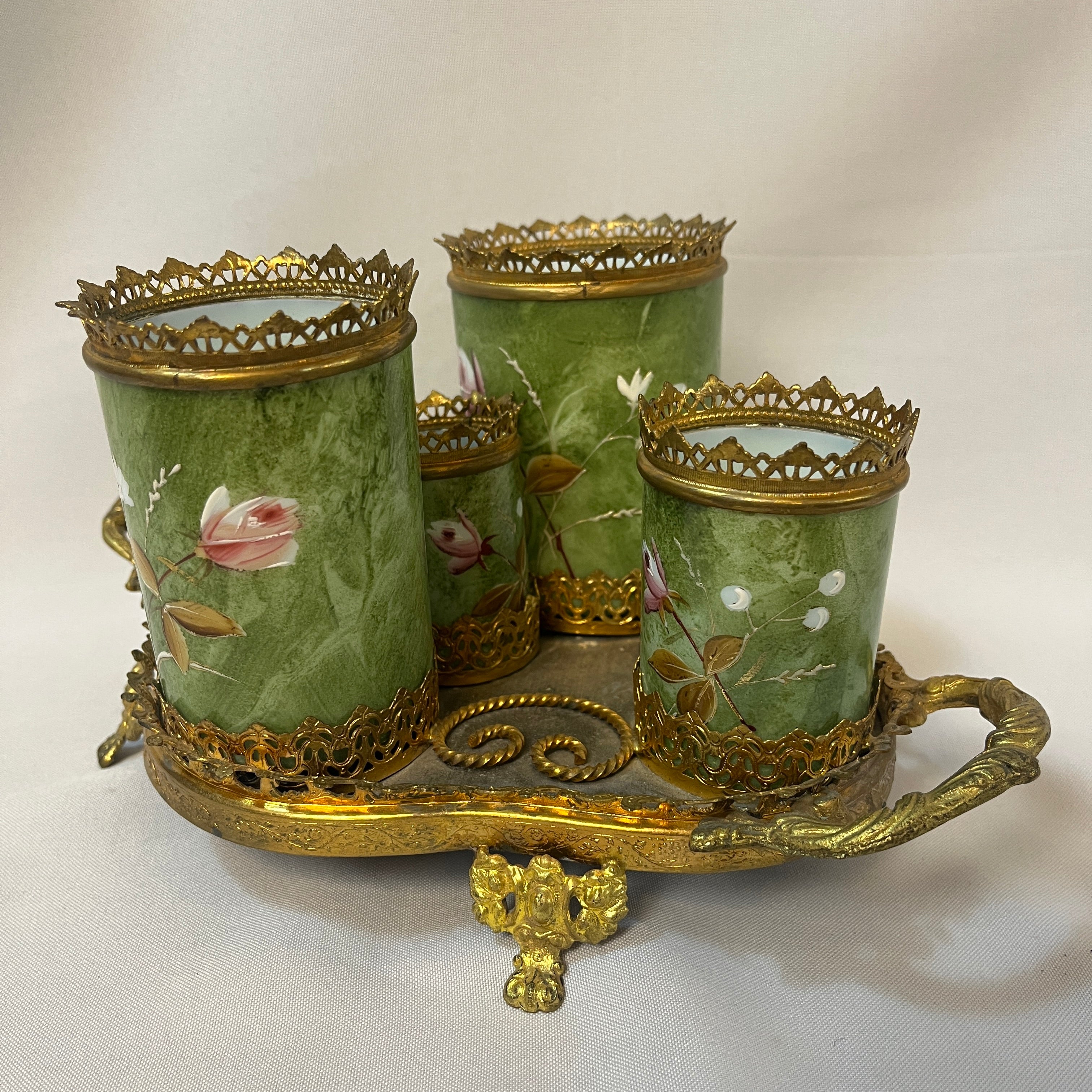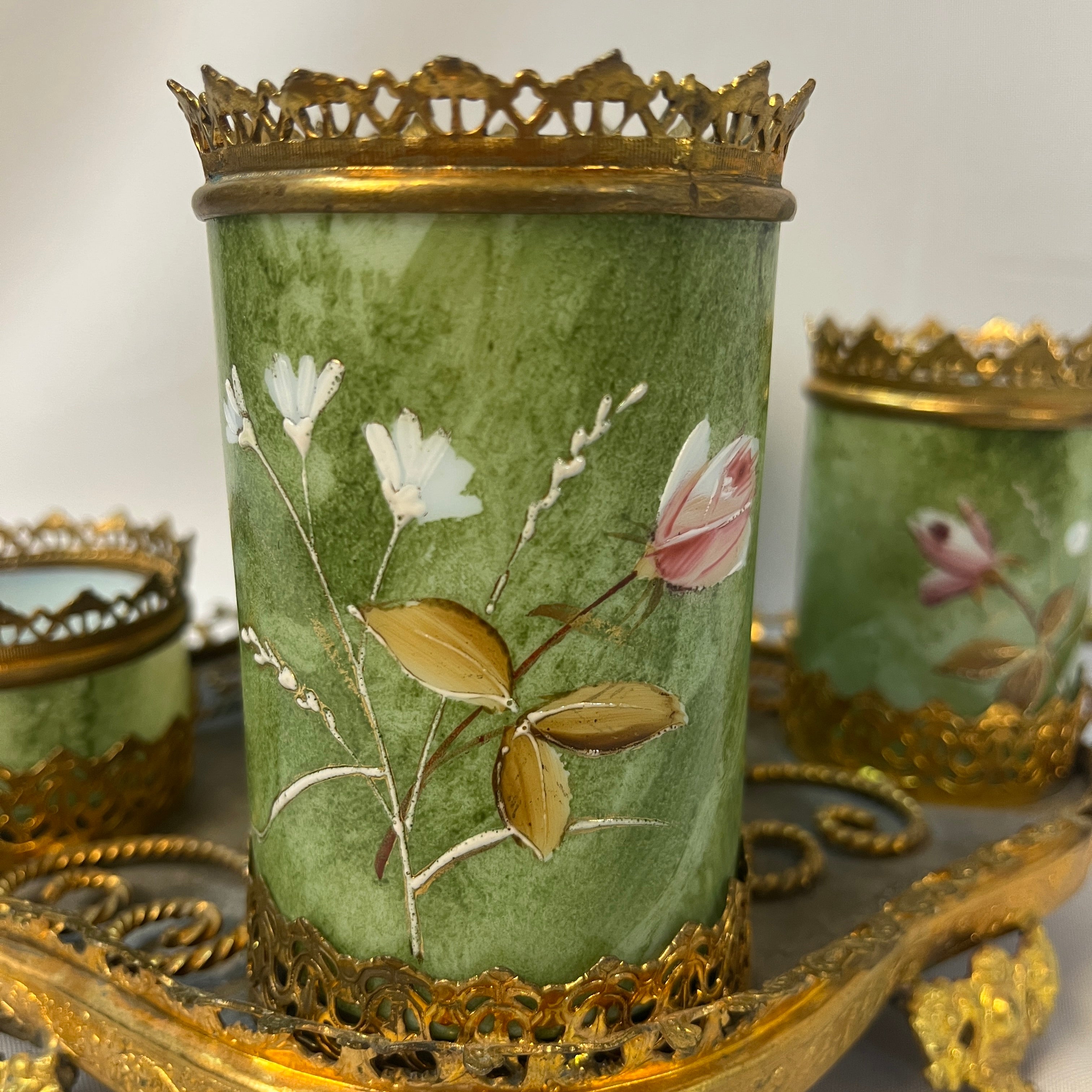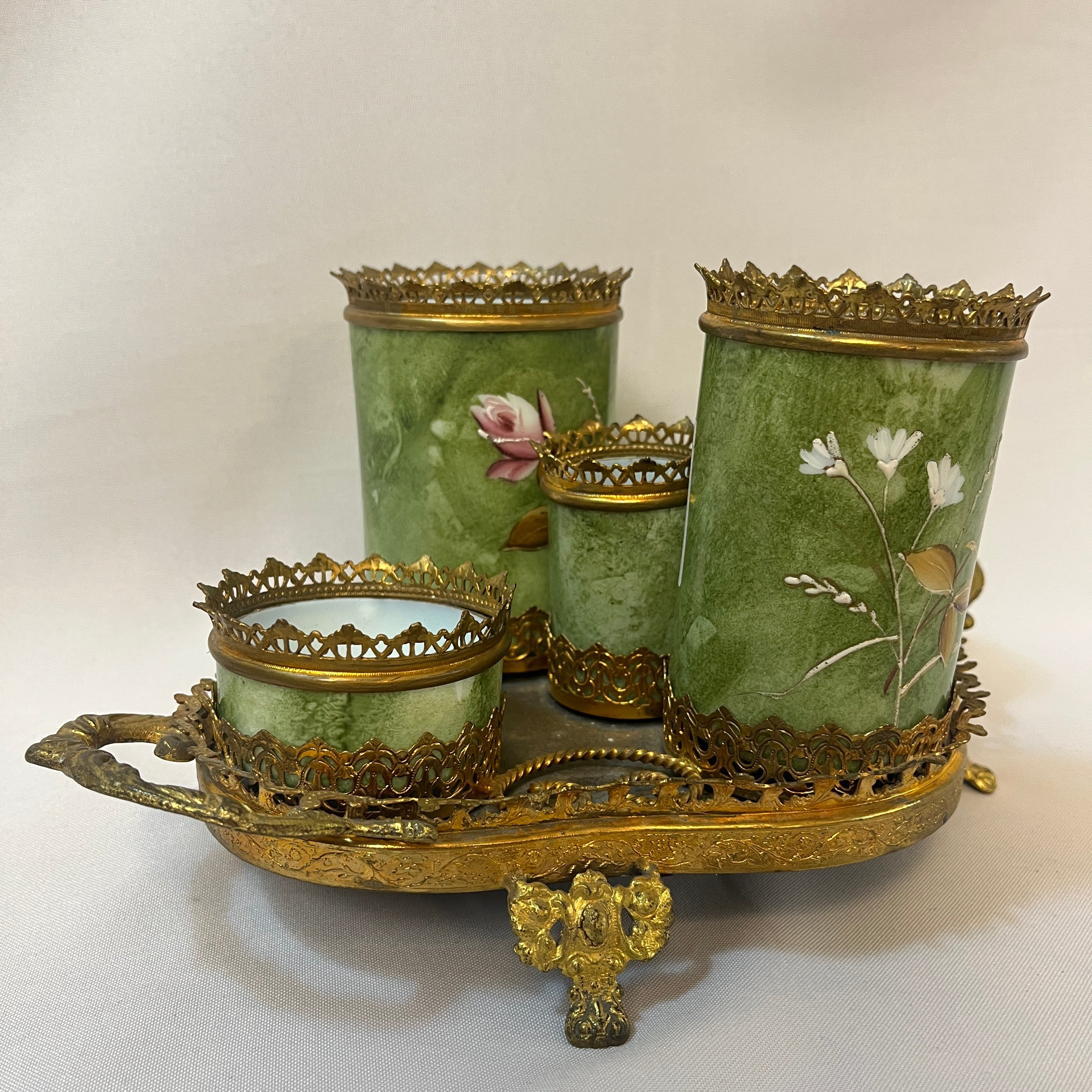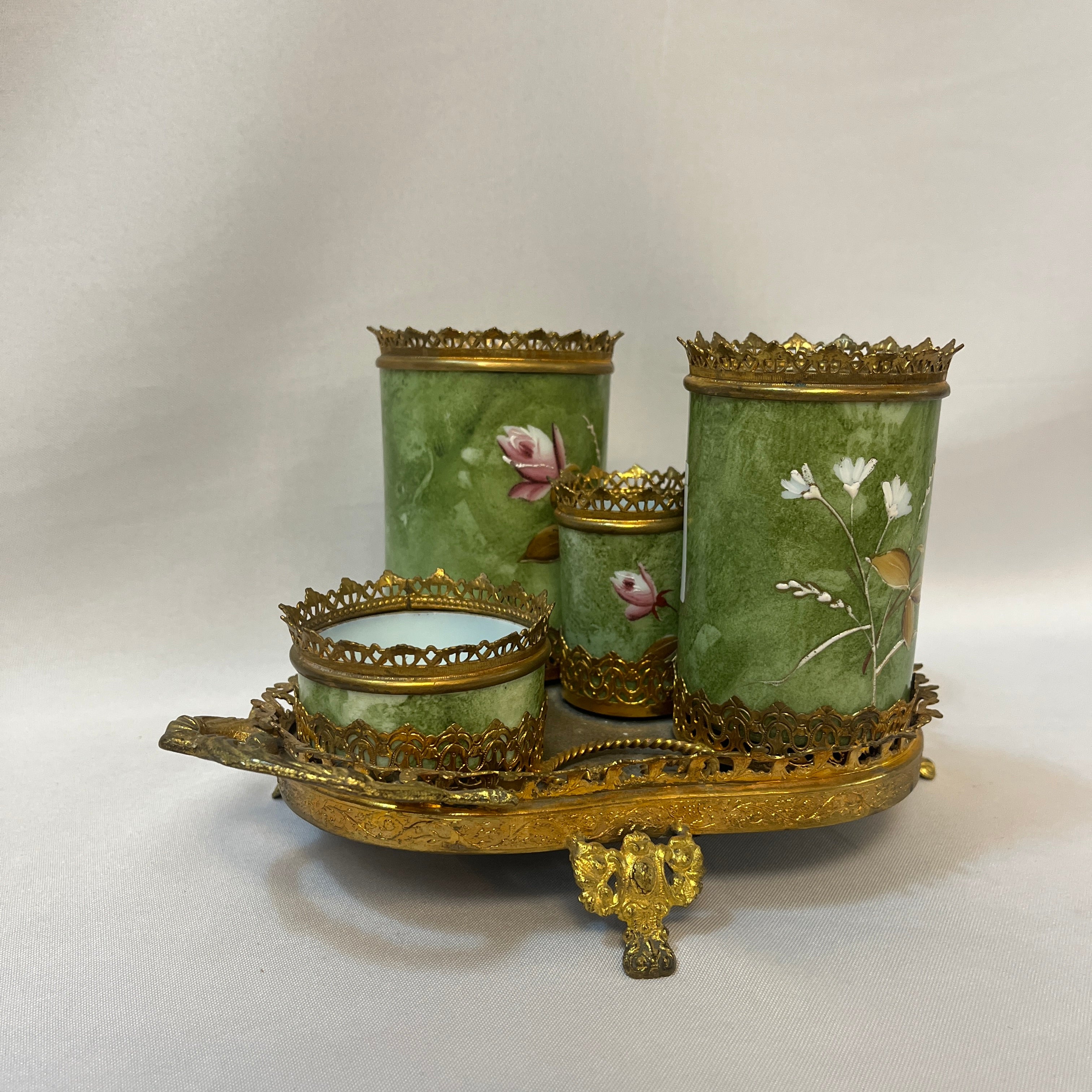 Bello juego de tocador para fumador ideal para dama, de porcelana verde olivo y delicadas flores en tonos rosa y aplicaciones en bronce. La montura tiene bellas bases en latón dorado con un calce perfecto para cada recipiente y sus patas y asas son de un elegante bronce ormolú. Esta es una pieza de principio del s.XIX.