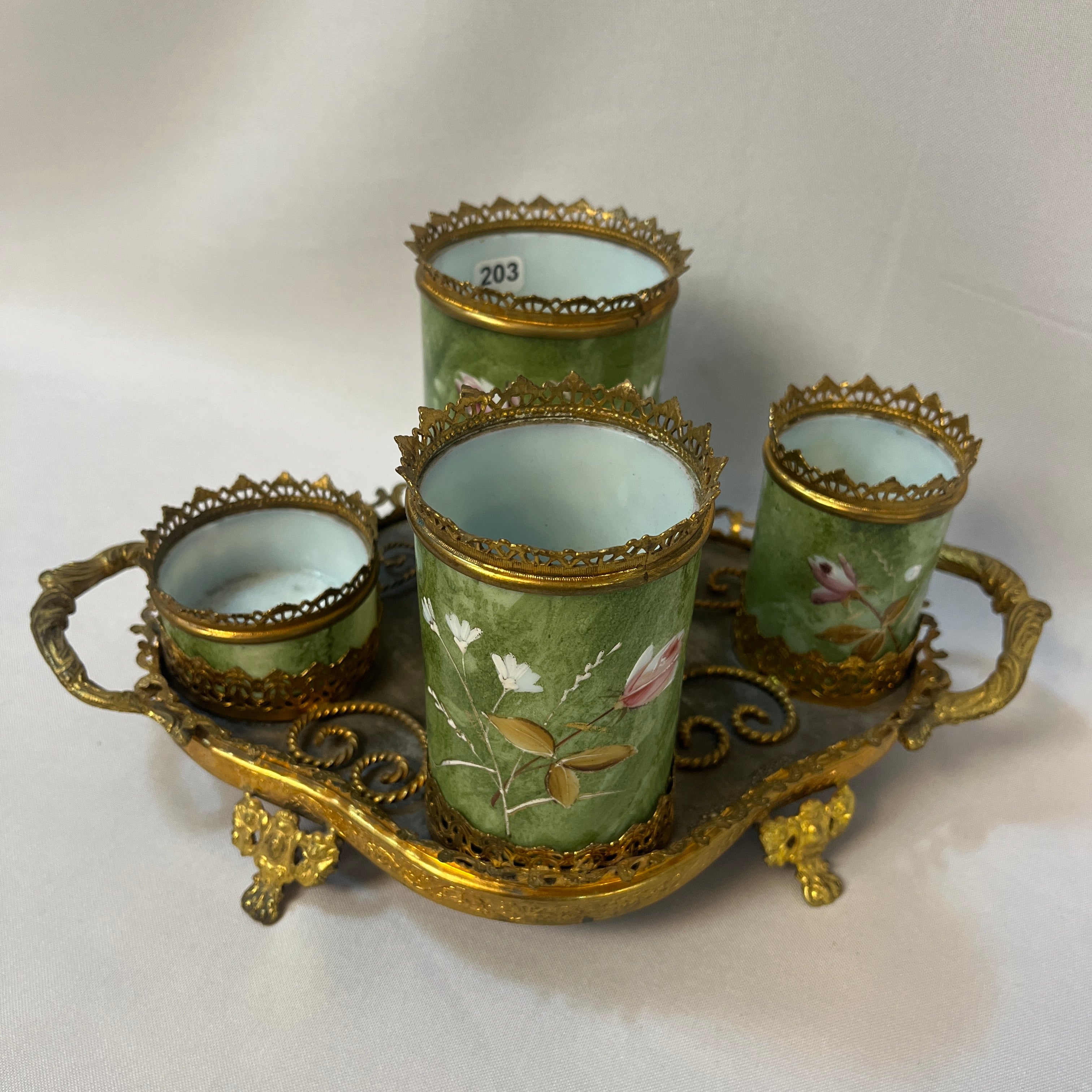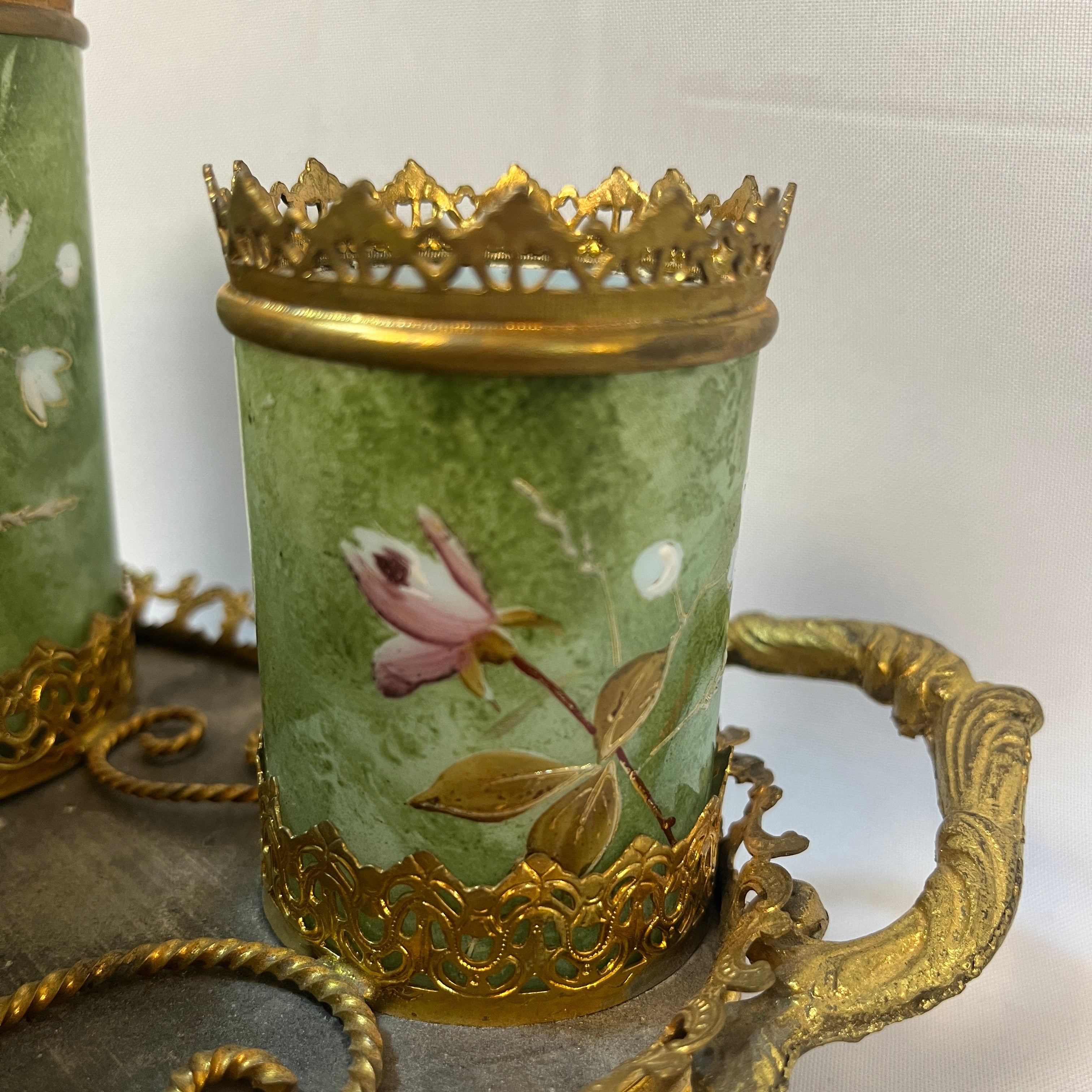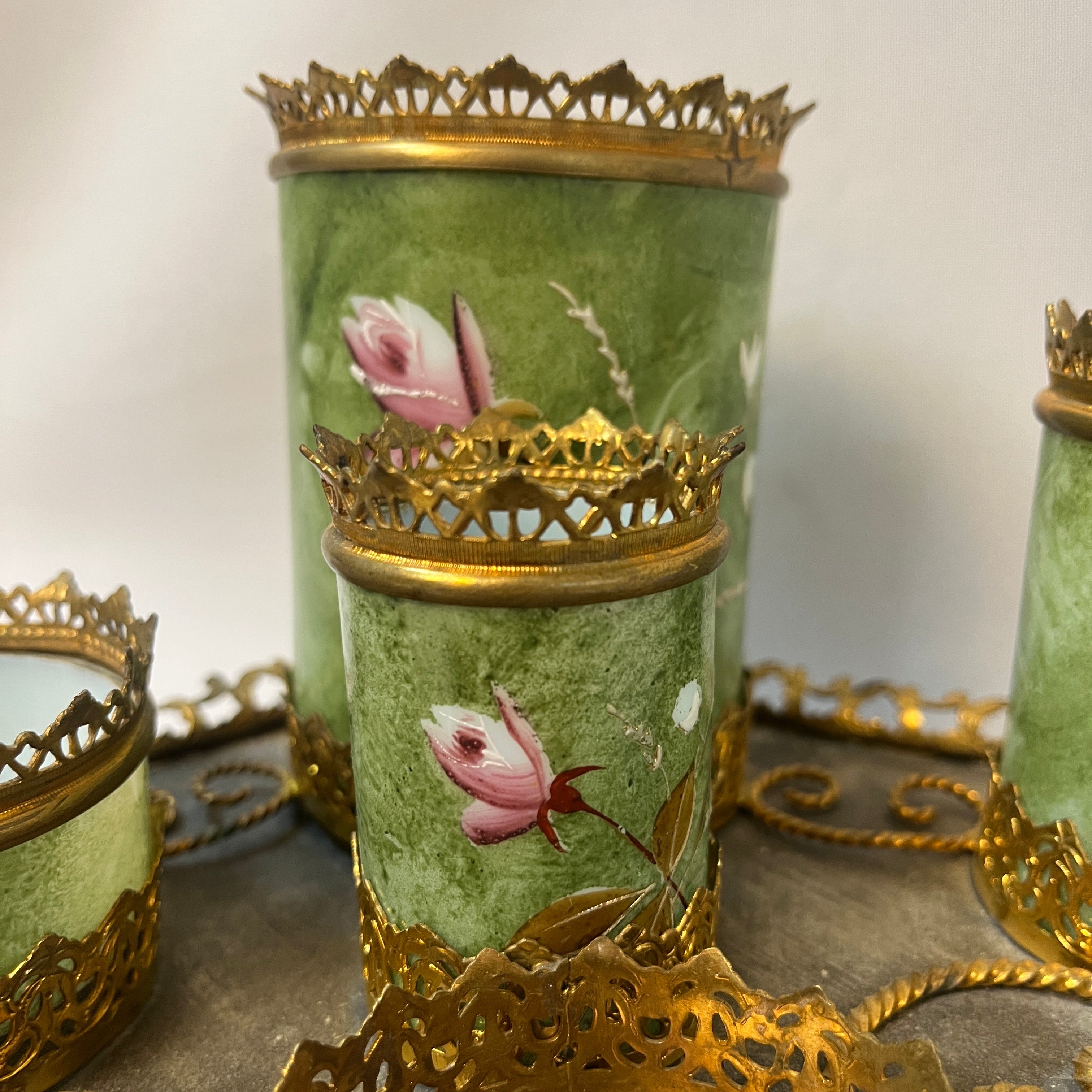Bello juego de tocador para fumador ideal para dama, de porcelana verde olivo y delicadas flores en tonos rosa y aplicaciones en bronce. La montura tiene bellas bases en latón dorado con un calce perfecto para cada recipiente y sus patas y asas son de un elegante bronce ormolú. Esta es una pieza de principio del s.XIX.