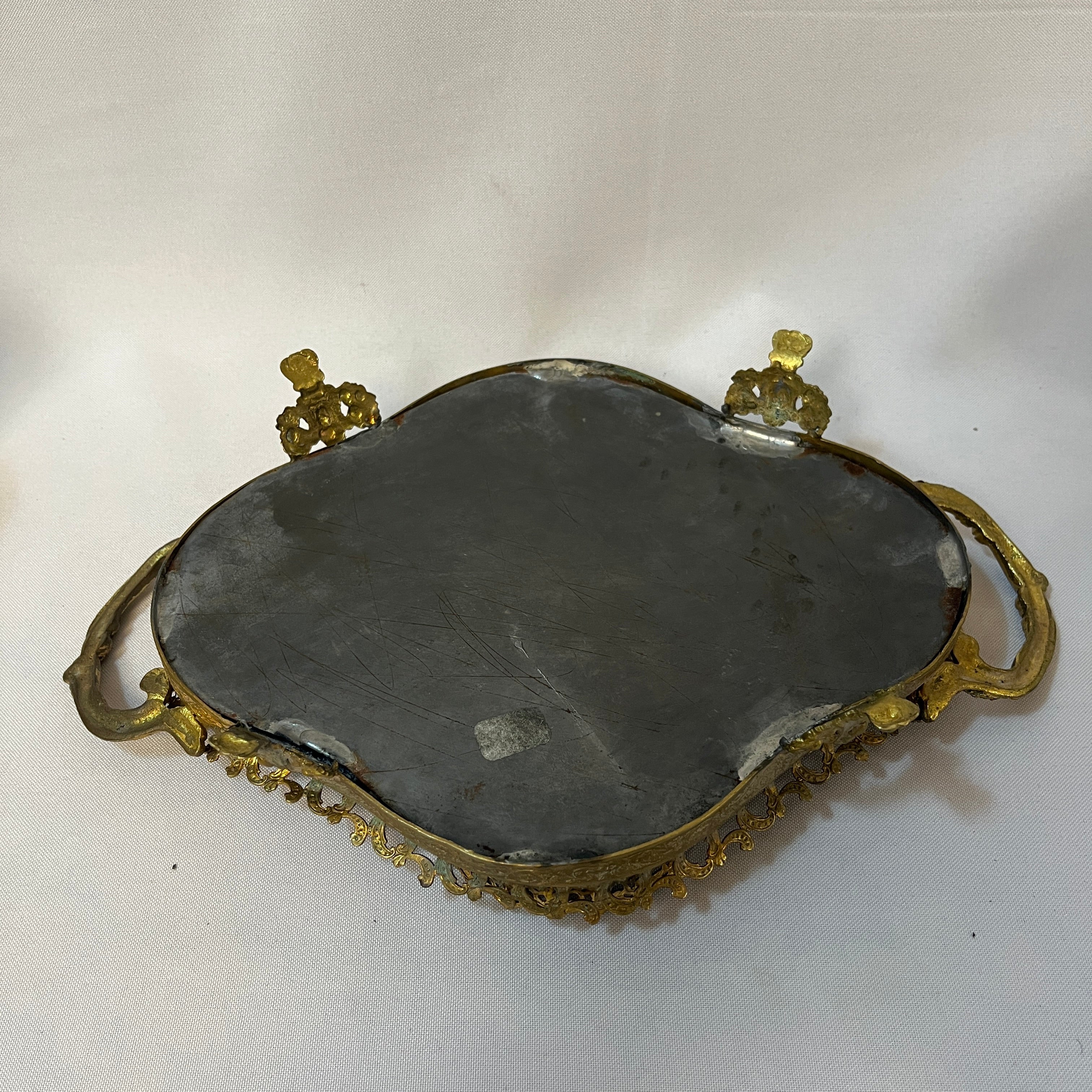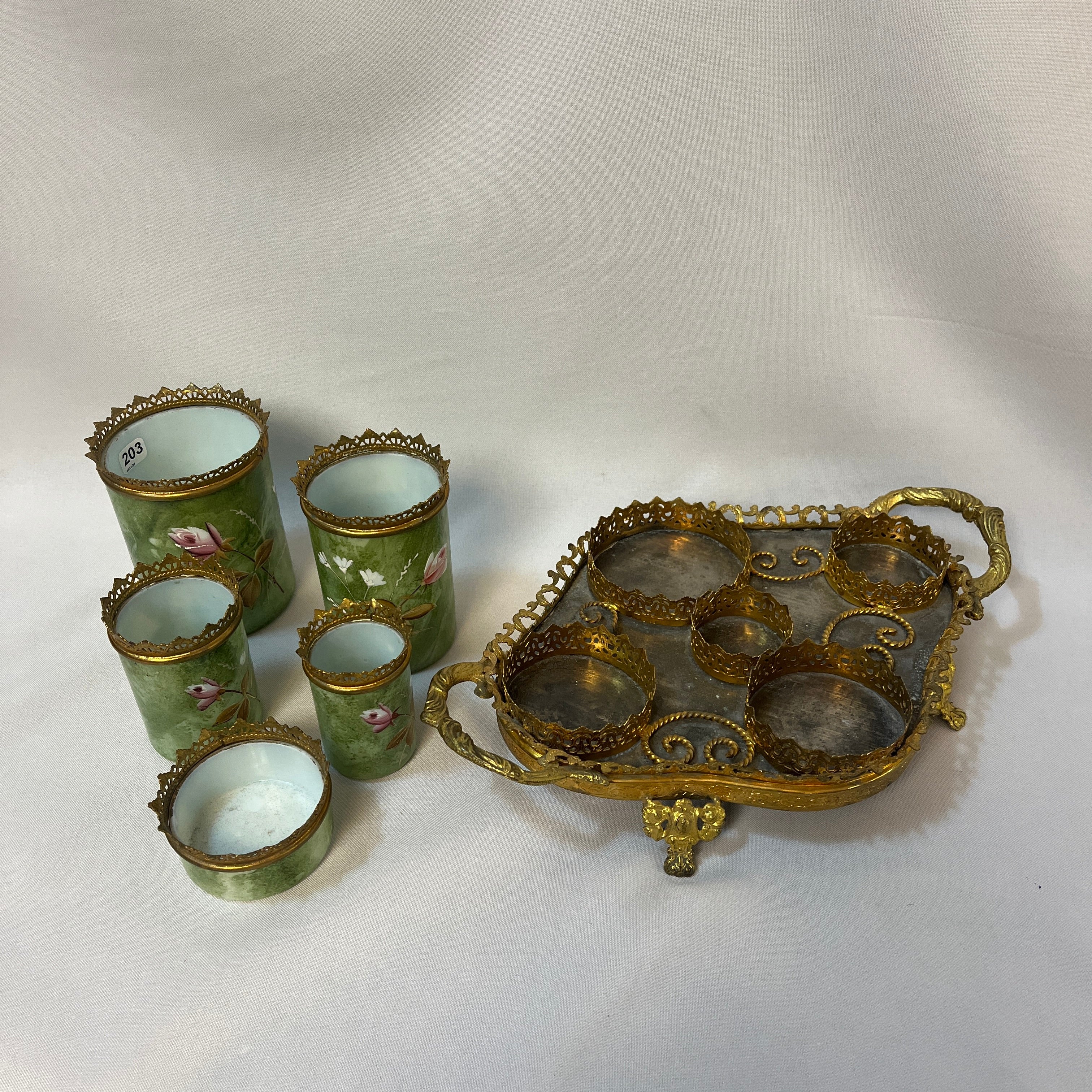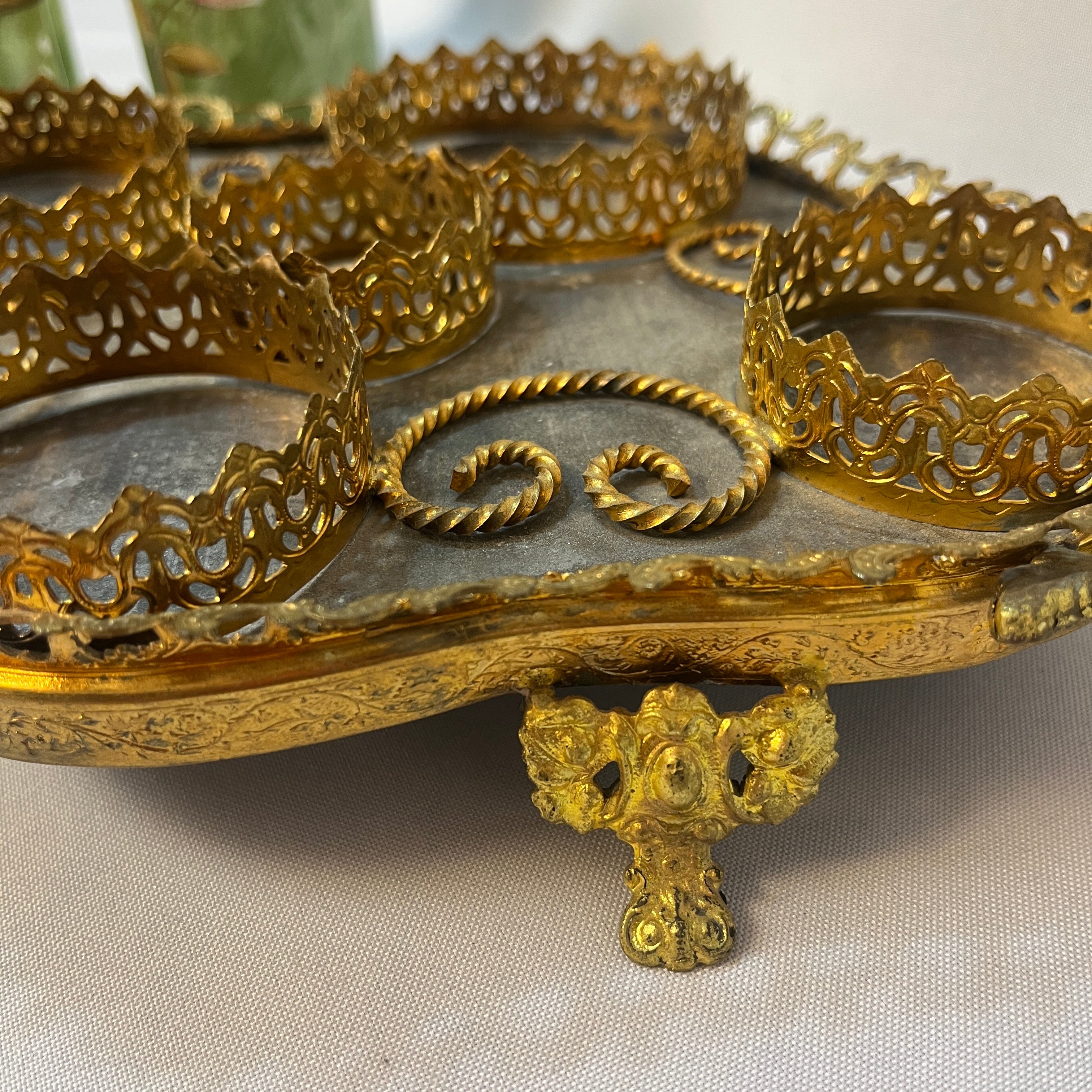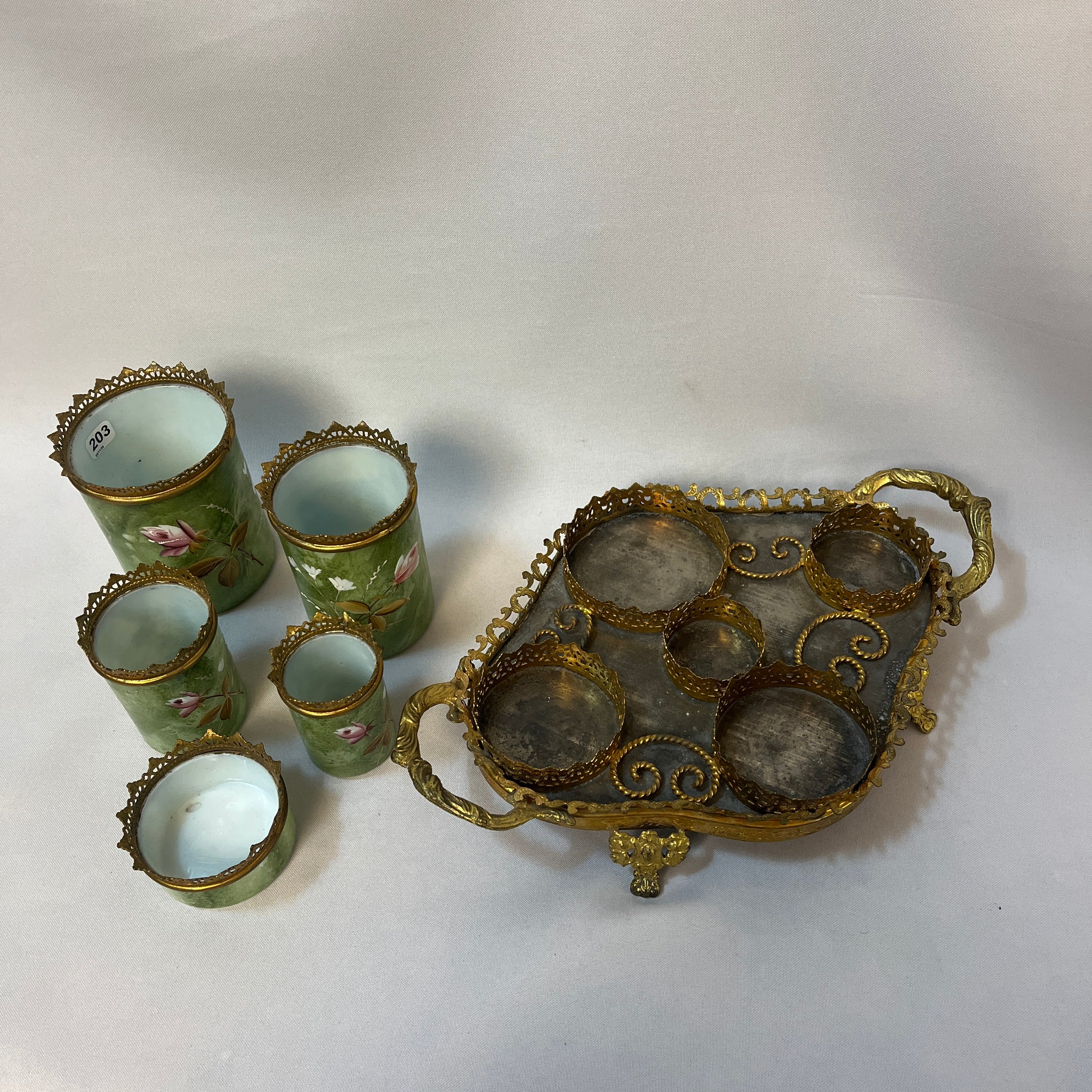 Bello juego de tocador para fumador ideal para dama, de porcelana verde olivo y delicadas flores en tonos rosa y aplicaciones en bronce. La montura tiene bellas bases en latón dorado con un calce perfecto para cada recipiente y sus patas y asas son de un elegante bronce ormolú. Esta es una pieza de principio del s.XIX.
