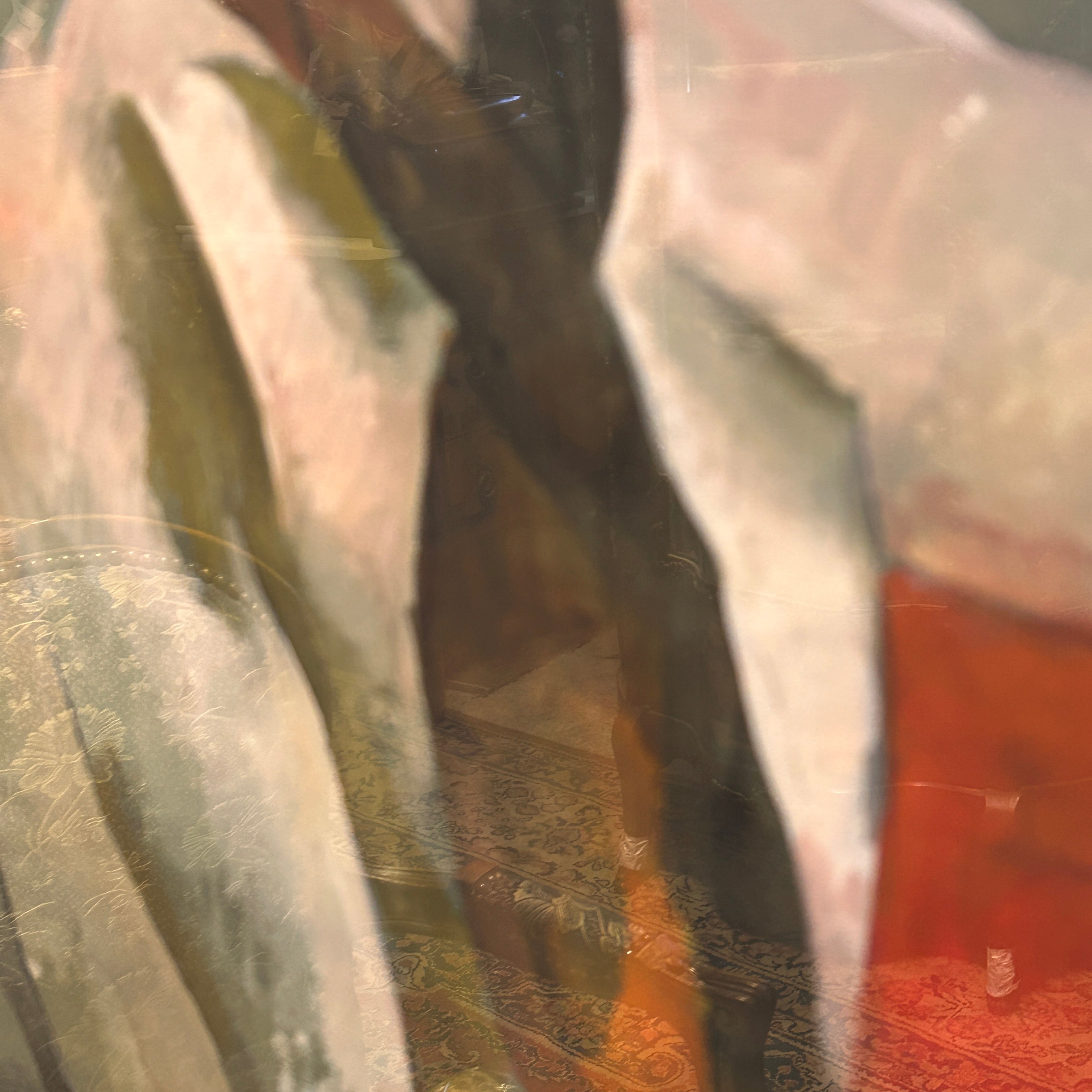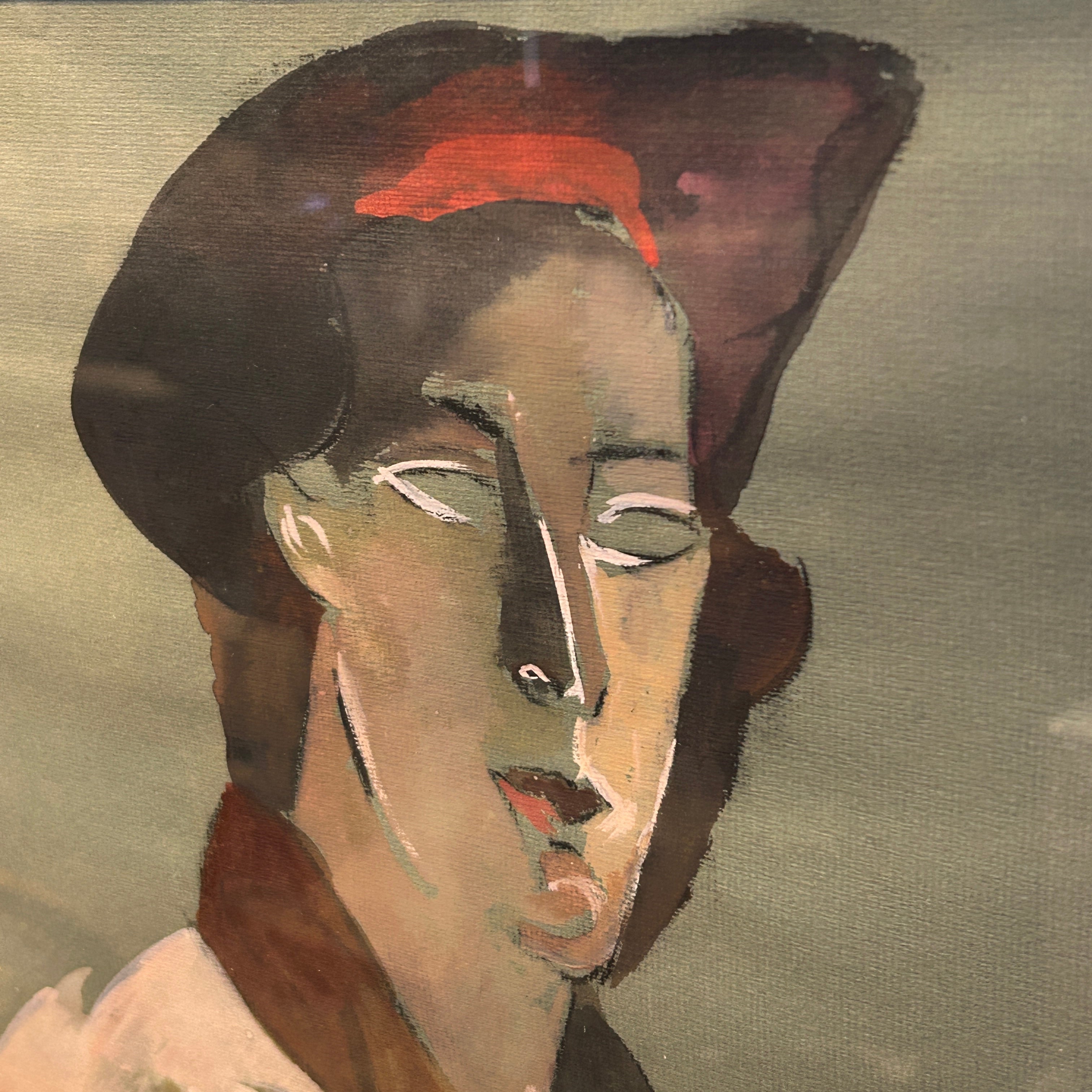 Técnica mixta Wash sobre papel del artista chileno Luis Tejada, representando a un joven sentado, con una bufanda y boina. La obra retrata gran parte del personaje, pero el artista hace el gesto de dejar inacabados algunos detalles y utilizando un fuerte contrapunto de rojos, generando una ausencia de partes del cuerpo y realzando la técnica por sobre la figura. La obra tiene un marco de madera contemporánea terminada en plateado.
