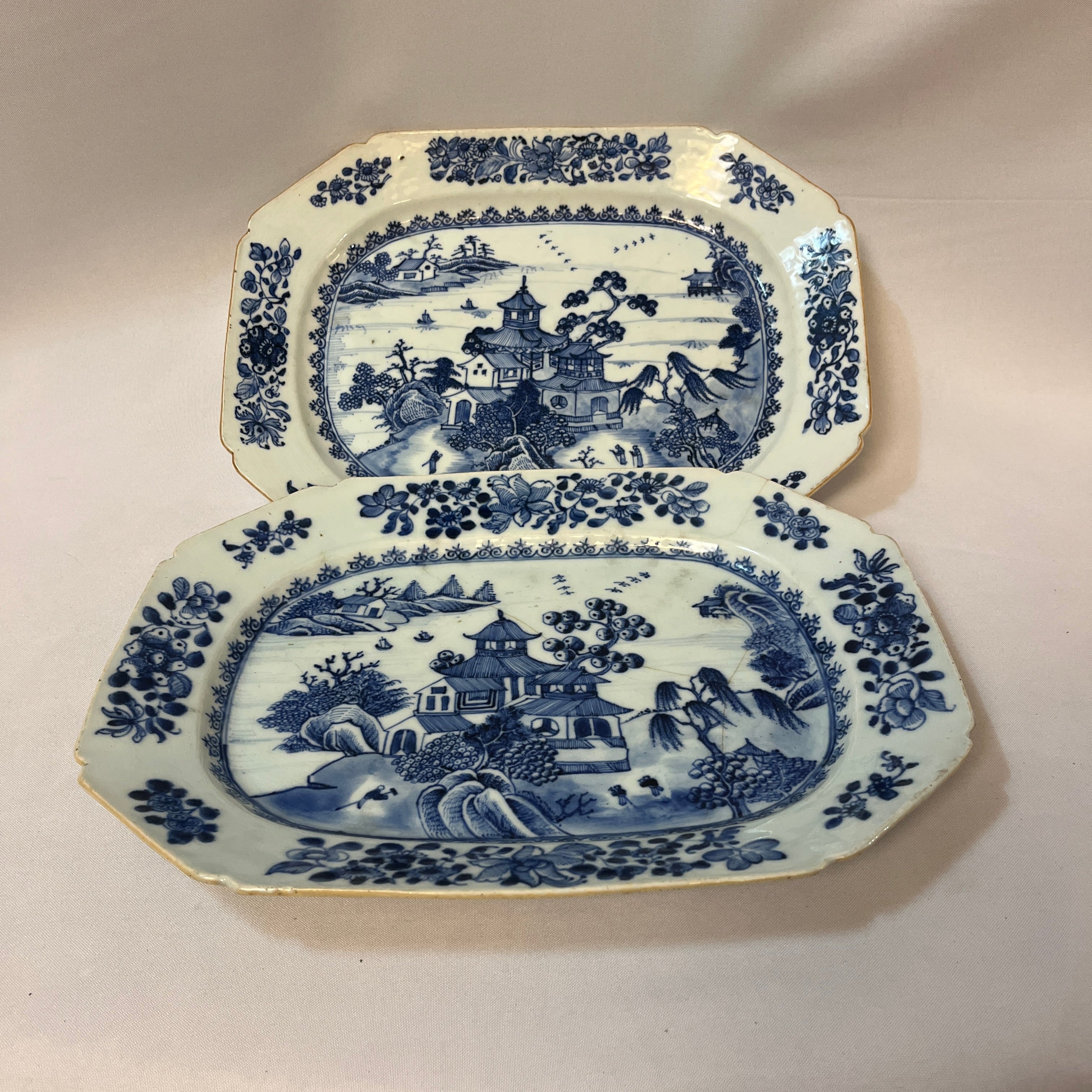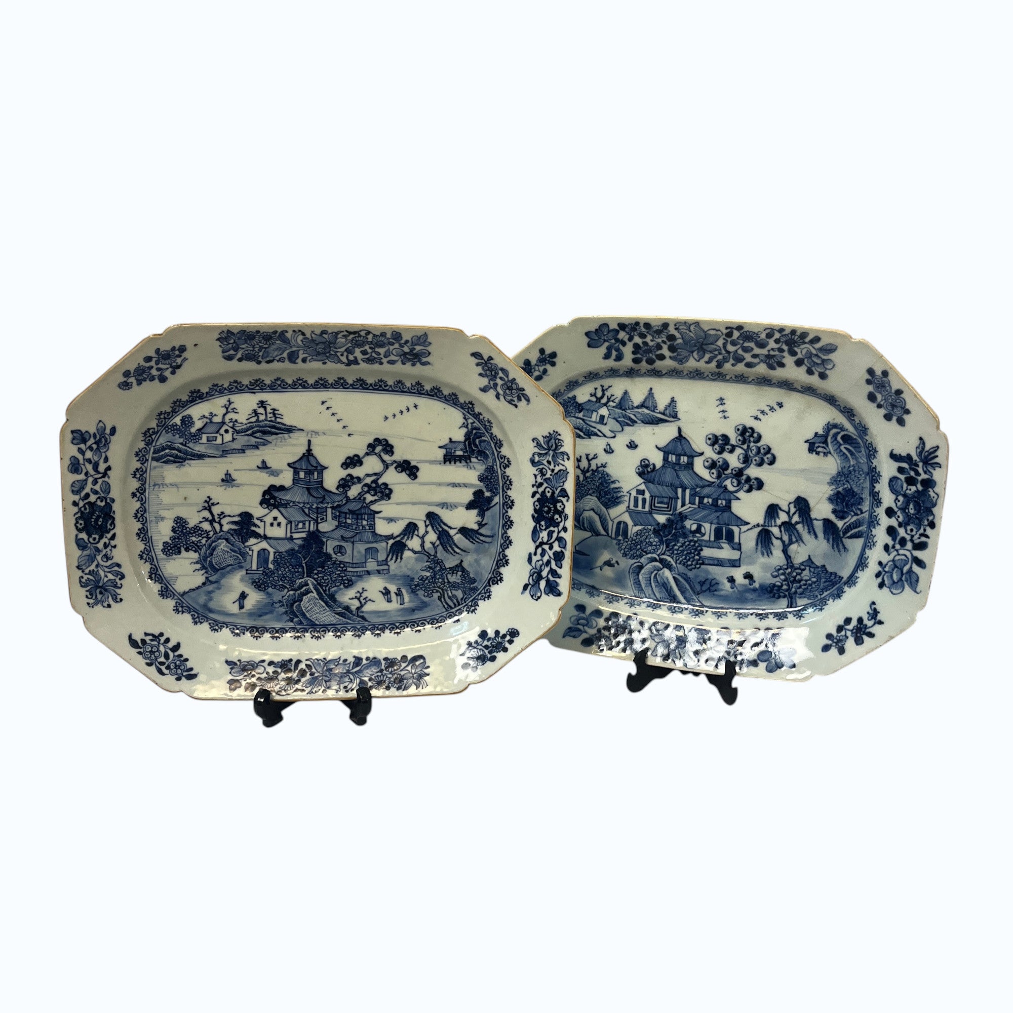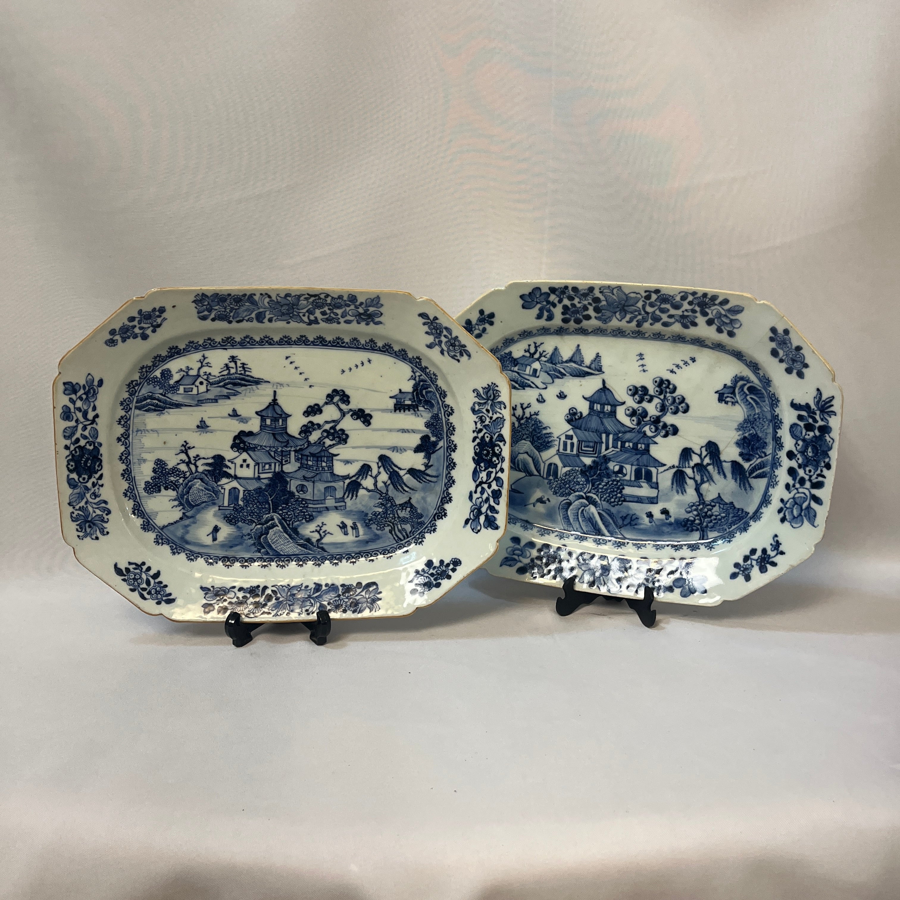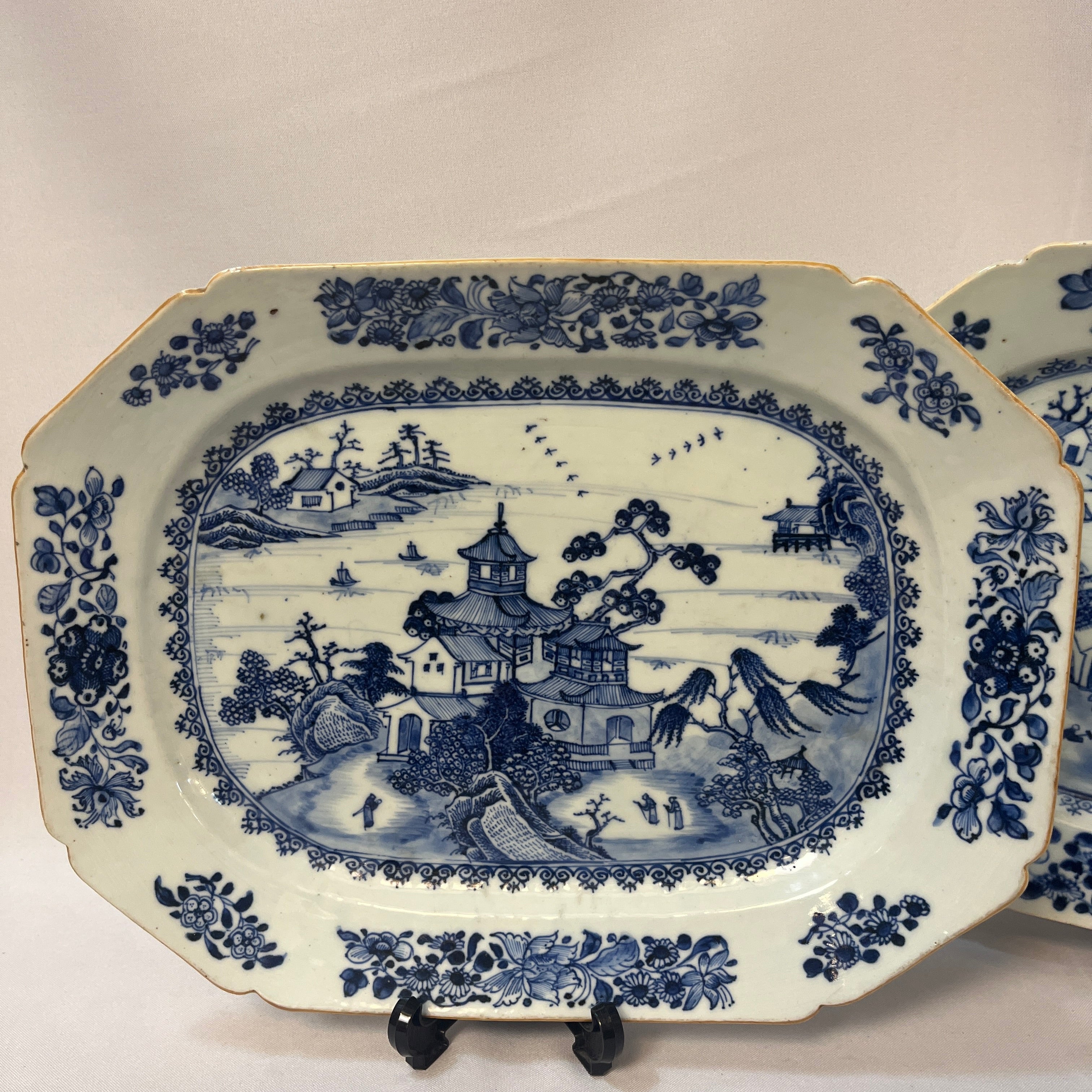 Hermosa pareja de platos de porcelana china estilo Compañía de Indias, con delicado paisaje lacustre oriental con sus construcciones y embarcaciones artesanales, paisaje que es enmarcado en azul y su contorno tiene una maravillosa ornamentación floral en sus ocho lados. Son platos ideales para decorar hogares ó ser exhibidos en vitrinas. Fines del s.XIX, China.