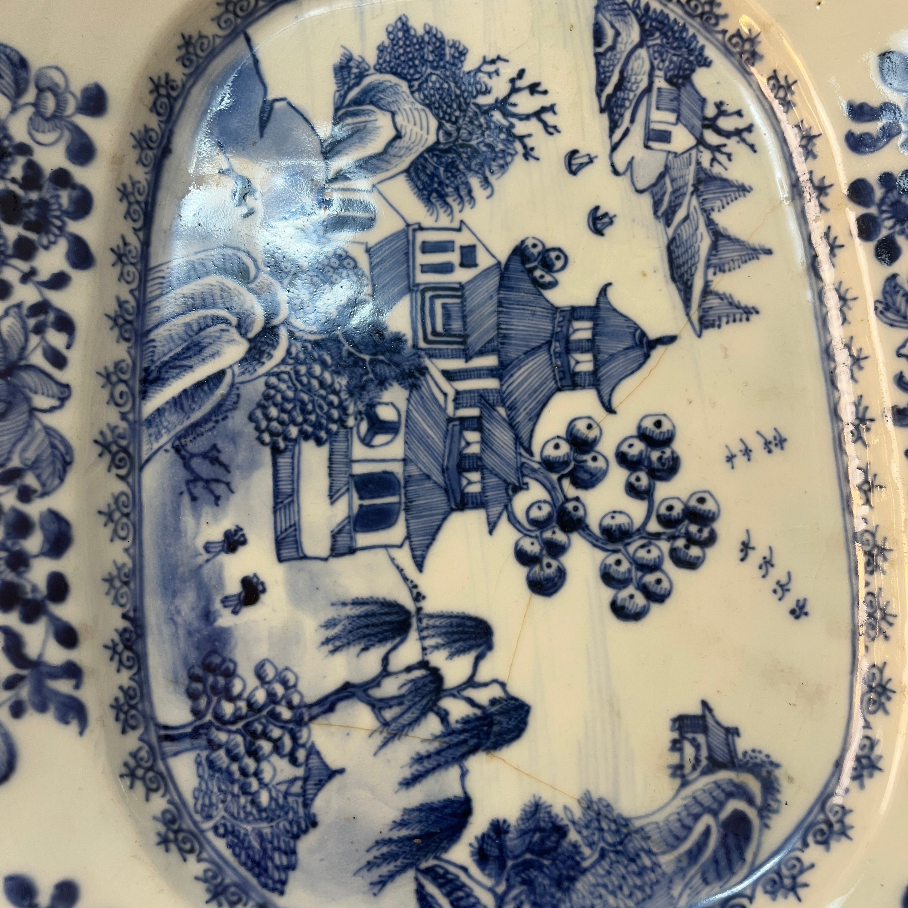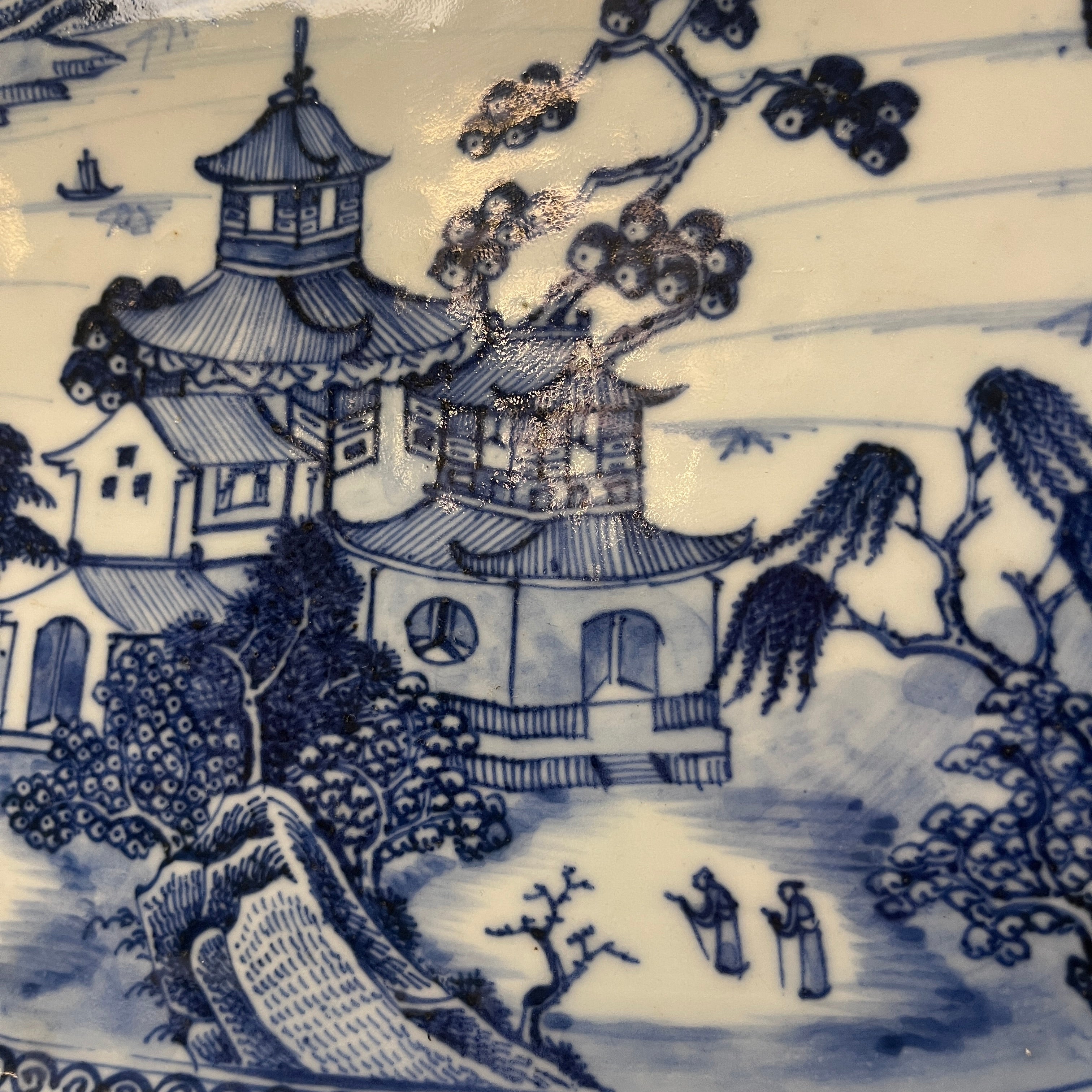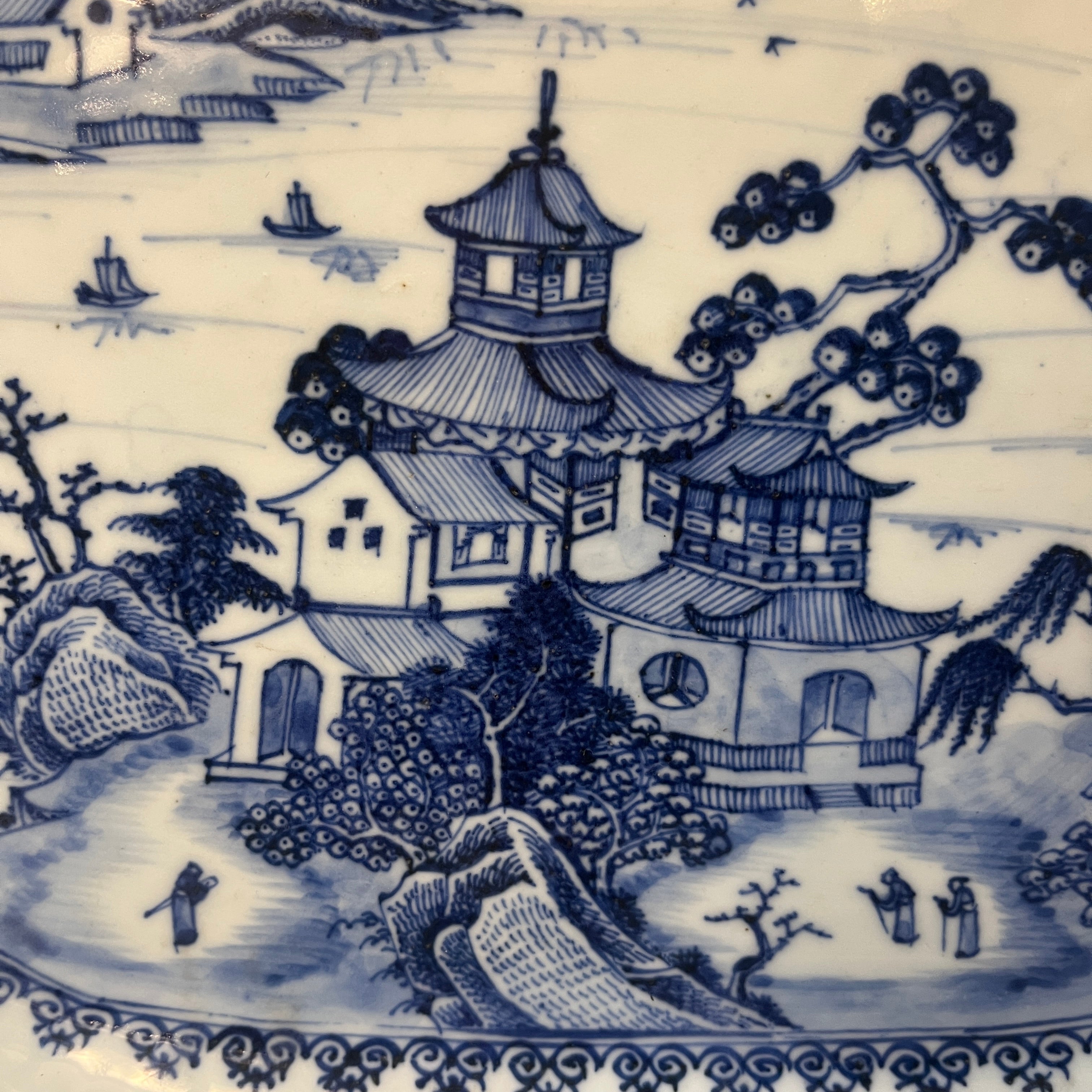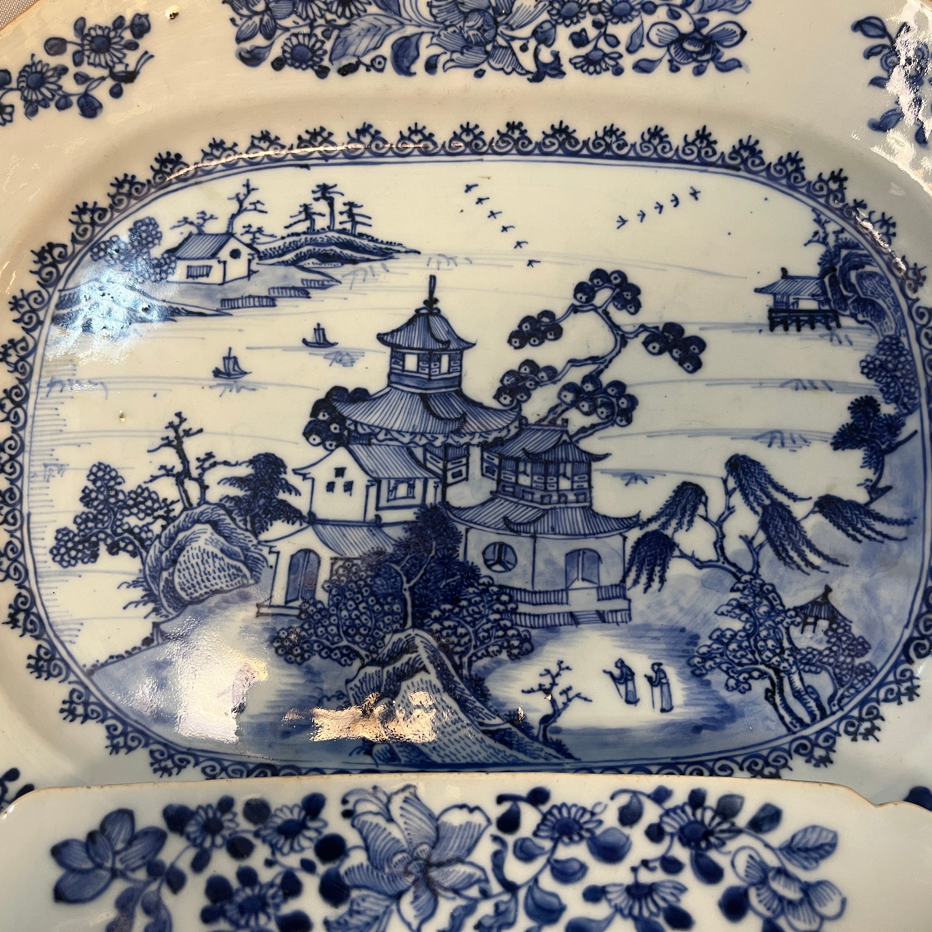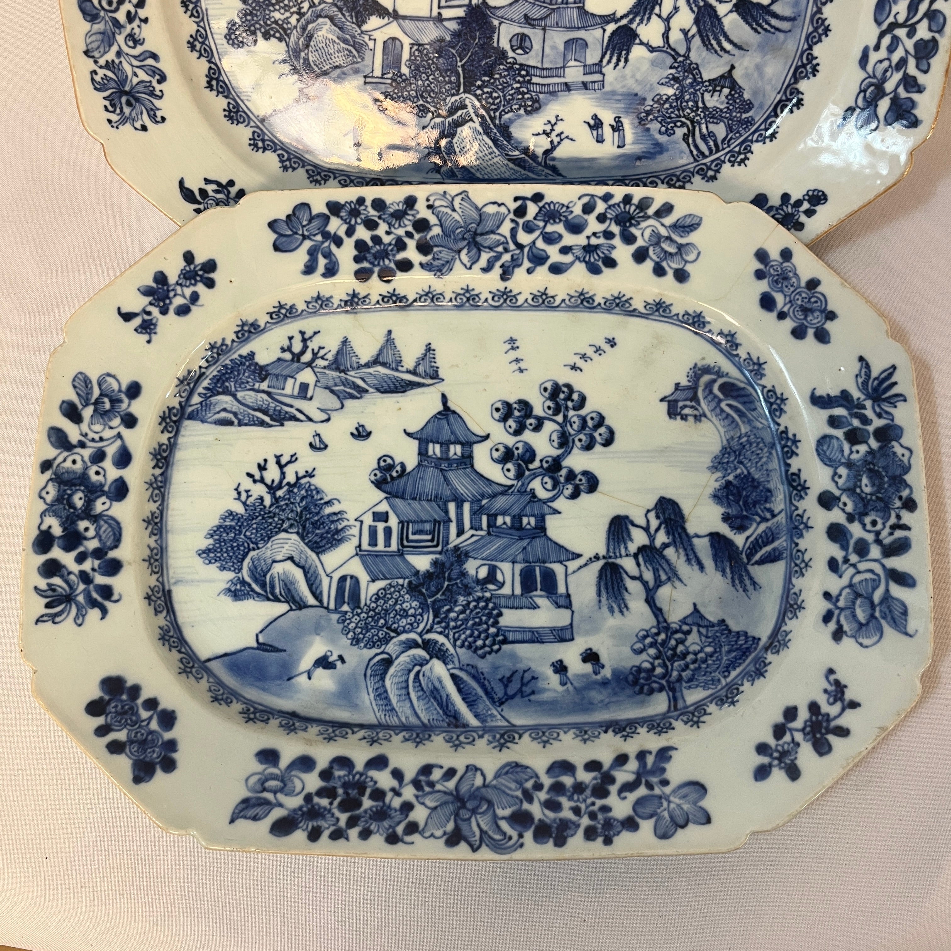 Hermosa pareja de platos de porcelana china estilo Compañía de Indias, con delicado paisaje lacustre oriental con sus construcciones y embarcaciones artesanales, paisaje que es enmarcado en azul y su contorno tiene una maravillosa ornamentación floral en sus ocho lados. Son platos ideales para decorar hogares ó ser exhibidos en vitrinas. Fines del s.XIX, China.