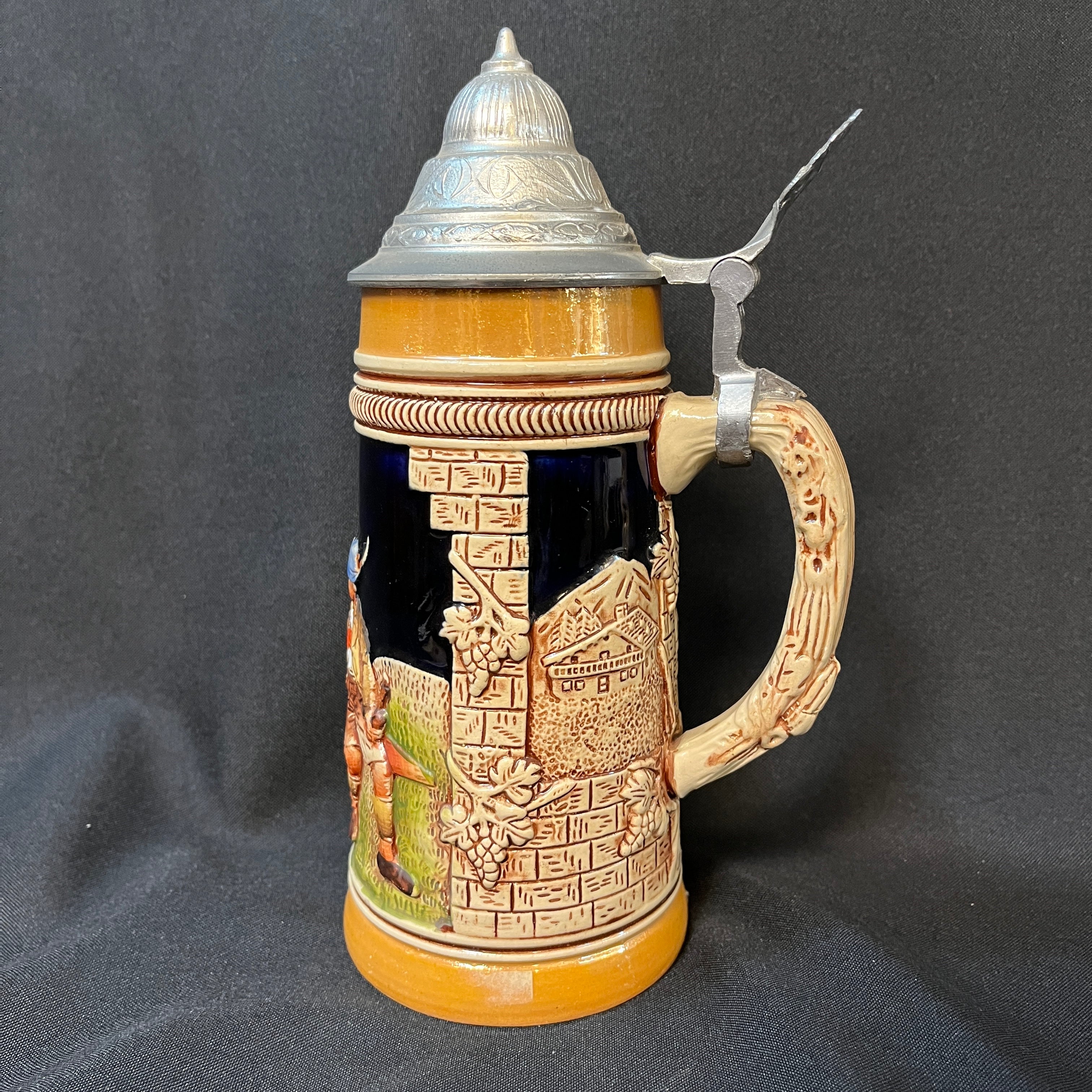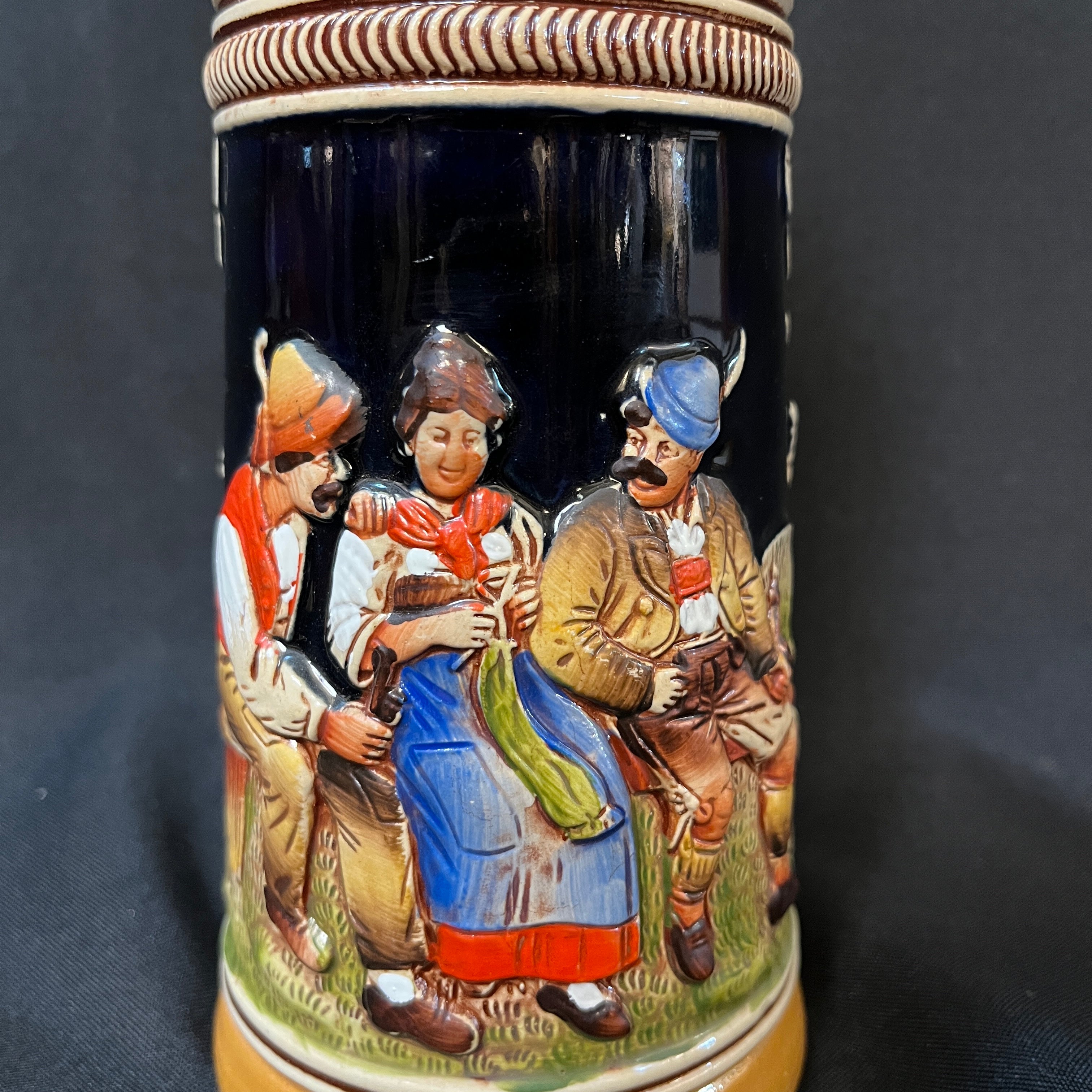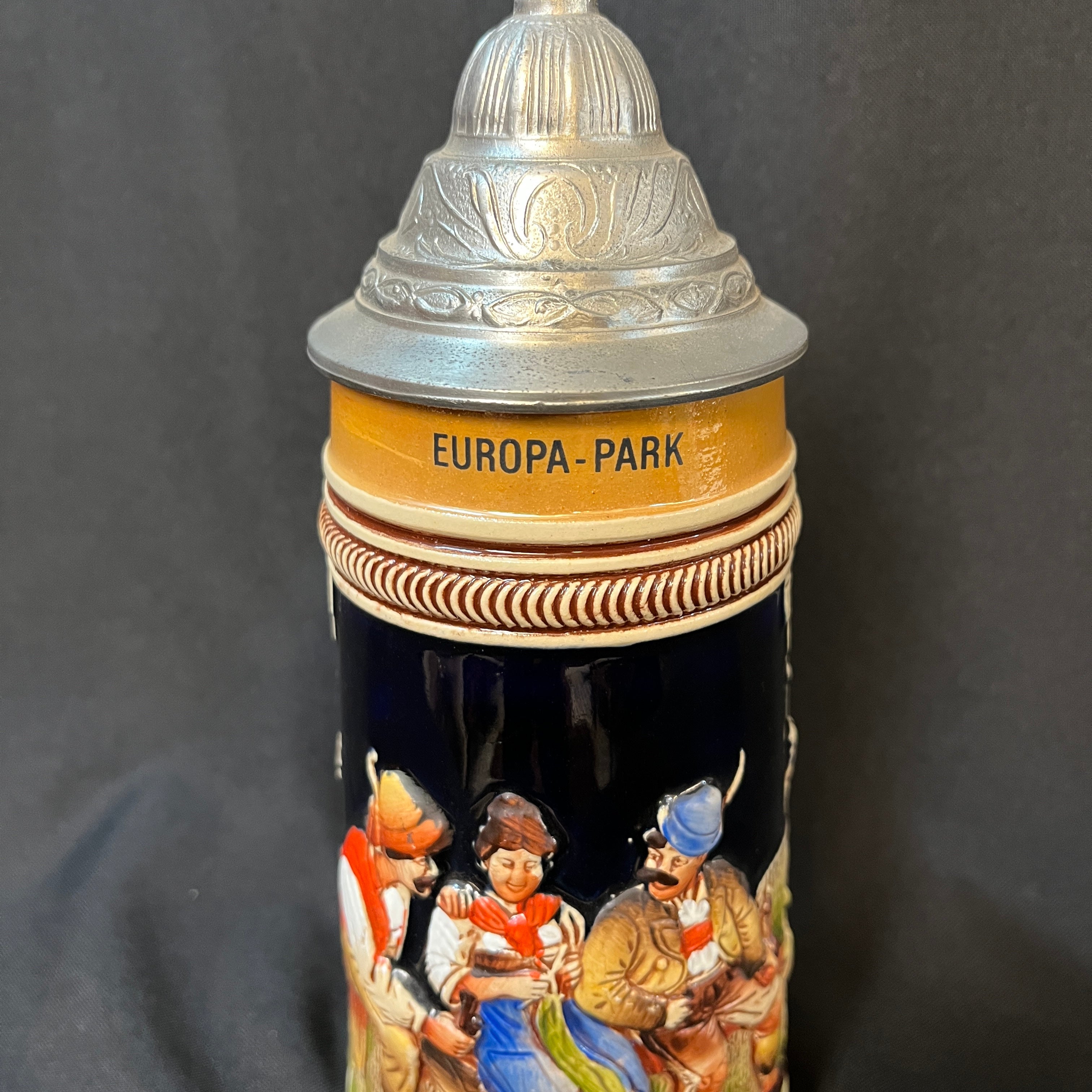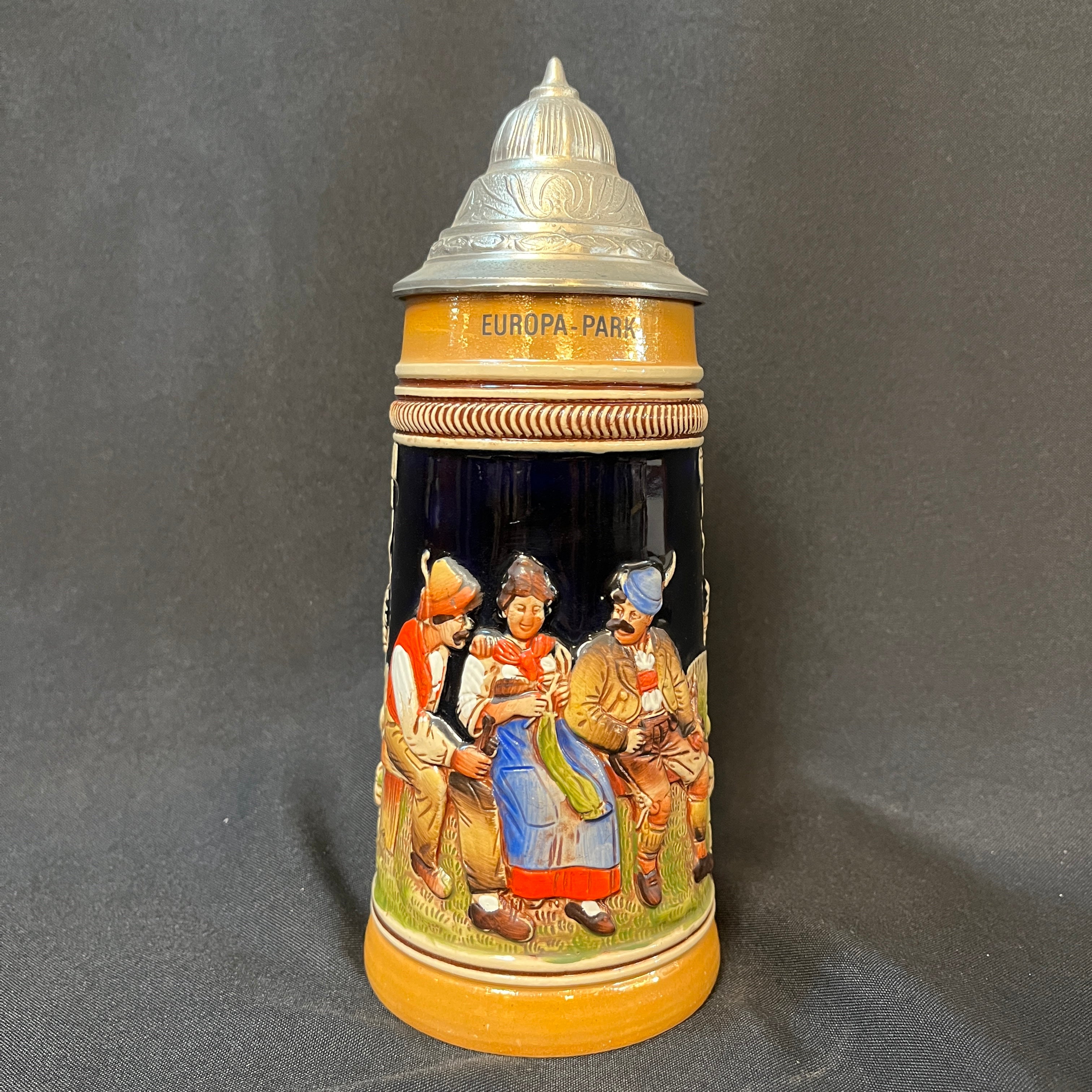 Pintoresco shopero alemán de porcelana y tapa de peltre con una original escena de dos caballeros cortejando a una damas, todos con sus respectivas vestimentas folklóricas.