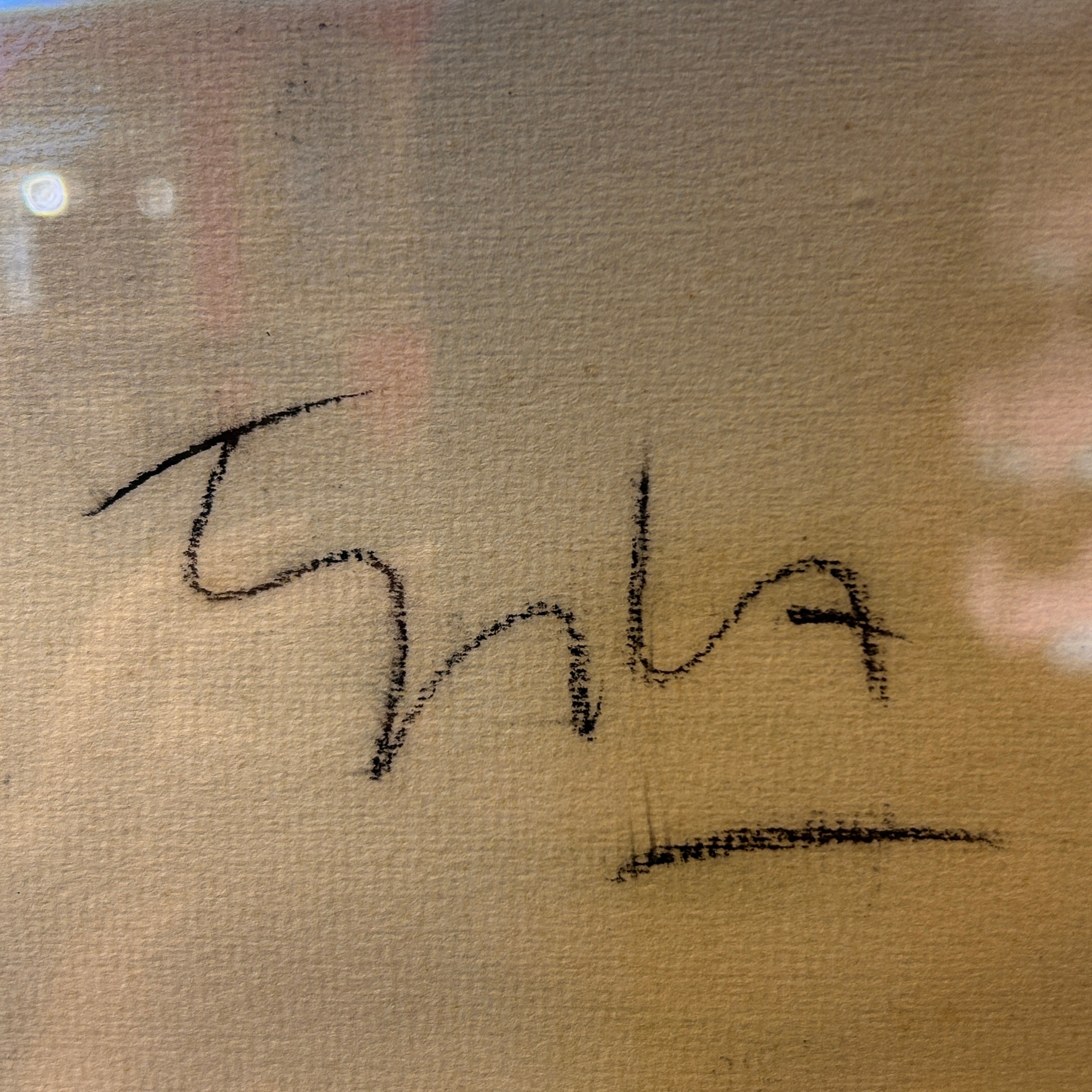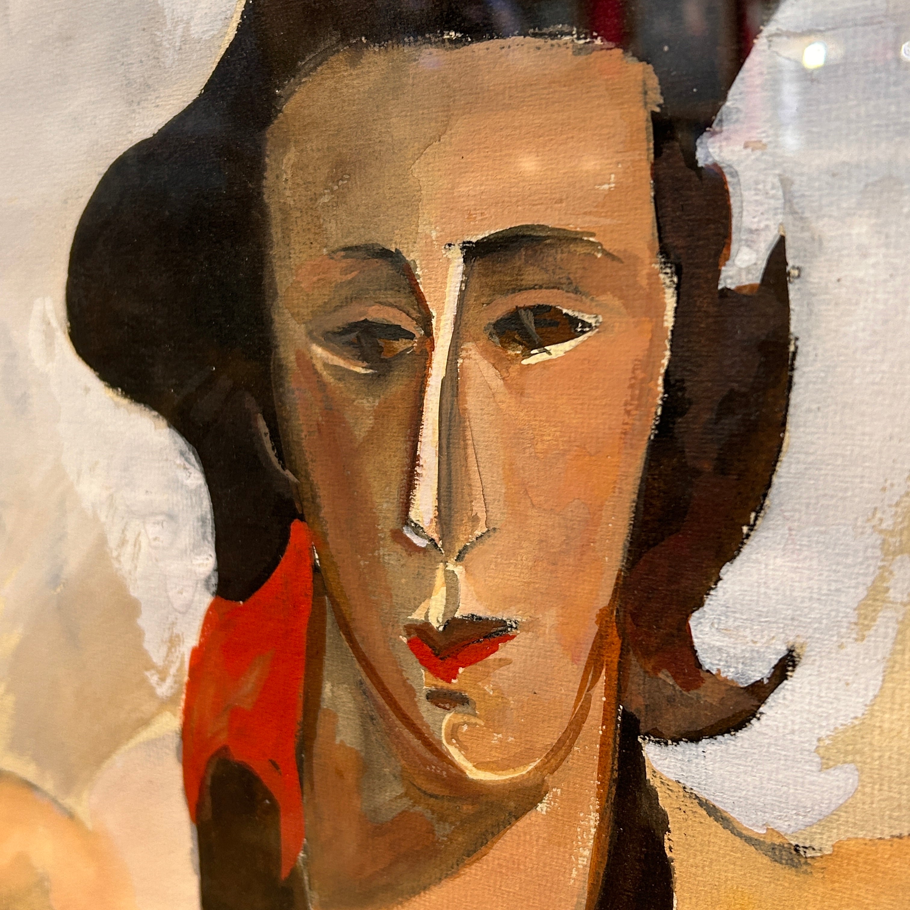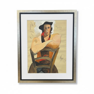 Técnica mixta Wash sobre papel del artista chileno Luis Tejada, representando a un hombre joven sentado sobre una silla al revés. Hay en el gesto del joven un gesto relajado, pero consciente de ser pintado, que remarca su figura, de gran volumen, en contraposición a unos rasgos finos y marcados que le dan gran carácter a su rostro. La obra tiene un marco de madera contemporáneo terminado en plateado.
