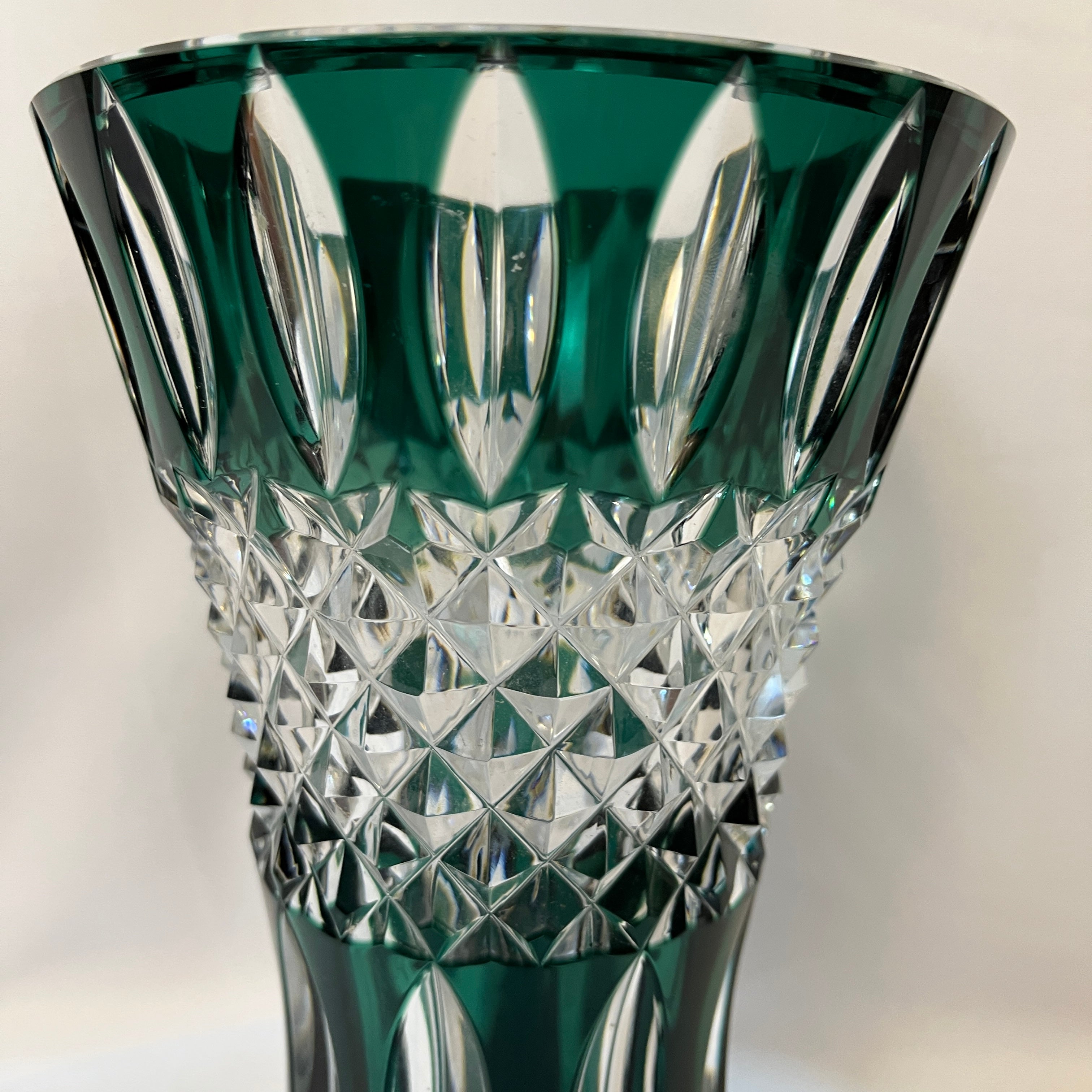 Hermoso jarrón teniers de cristal tallado estilo Cut to clear (tallado transparente) de la prestigiosa marca belga Val Saint Lambert, con un distinguido verde esmeralda, que resalta el trabajo de la pieza y le entrega una prestancia única para decorar los hogares. En su centro posee fino tallado diamantado transparente. Es un jarrón de más de un centímetro de grosor, resistente y a la vez delicado. Posee en su base tallado 'Val Saint Lambert'