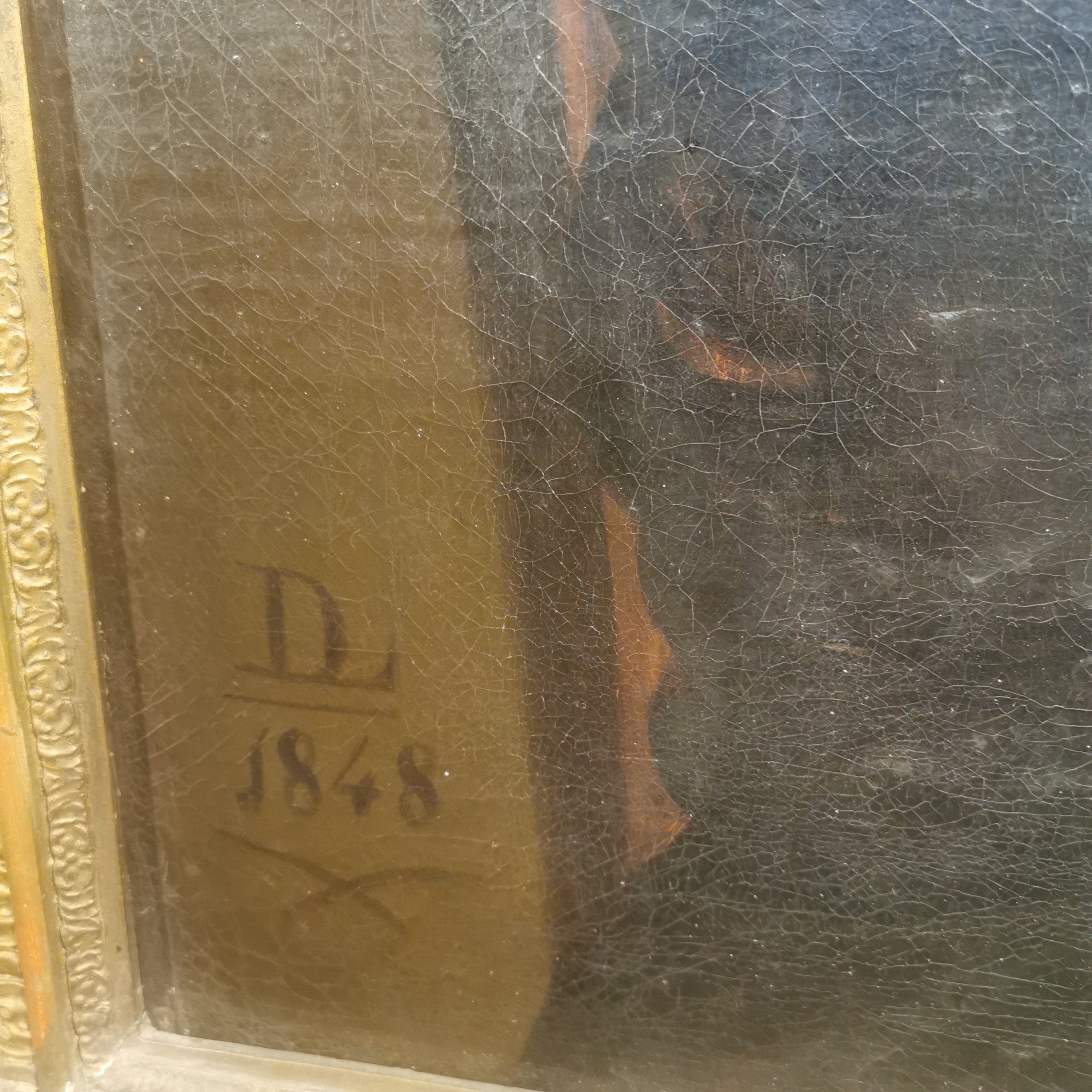 Elegante retrato de una mujer noble Británica. Escuela inglesa, siglo XlX. Cuadro firmado D. L. 1848. Se observa una mujer sentada con una expresión tranquila y comunicativa.