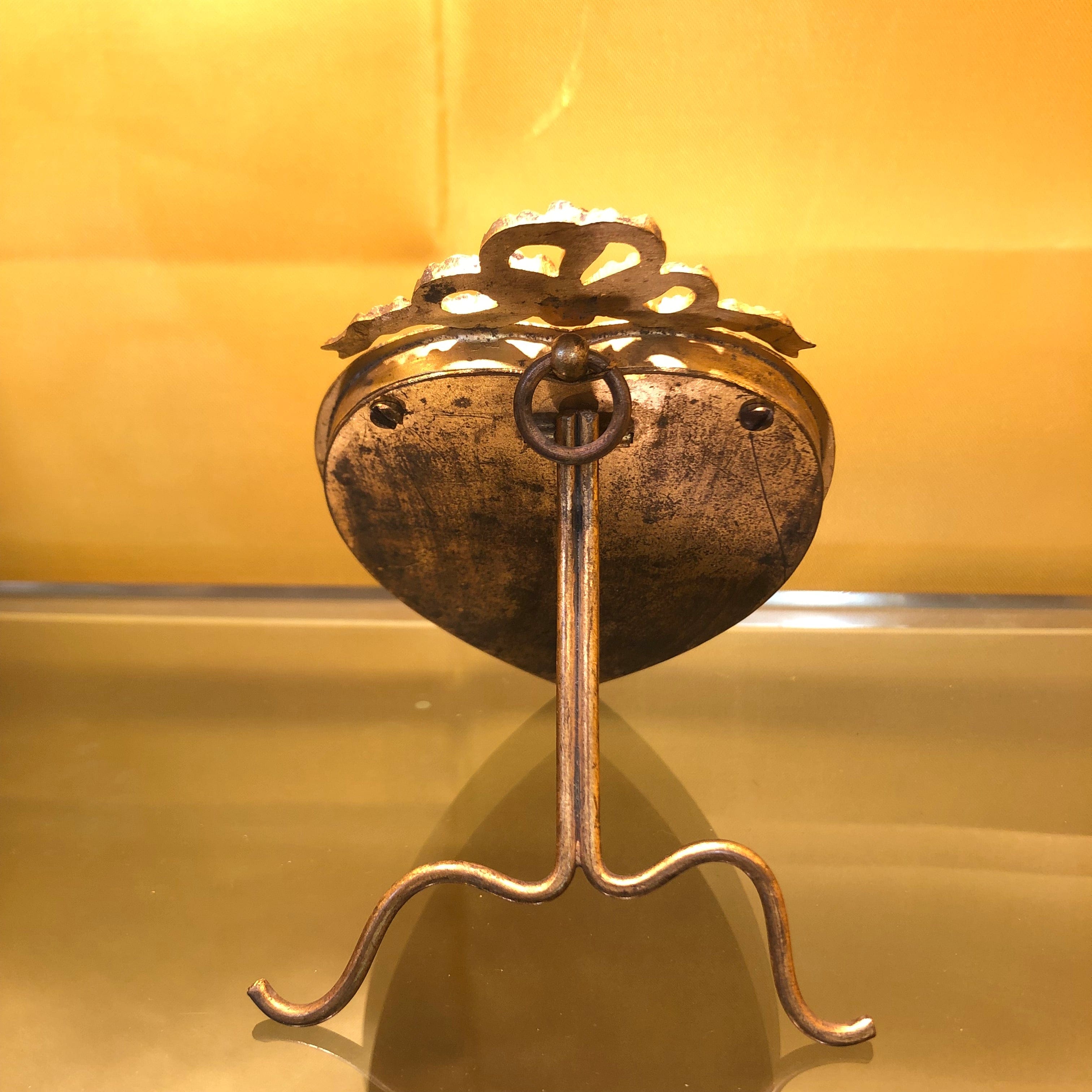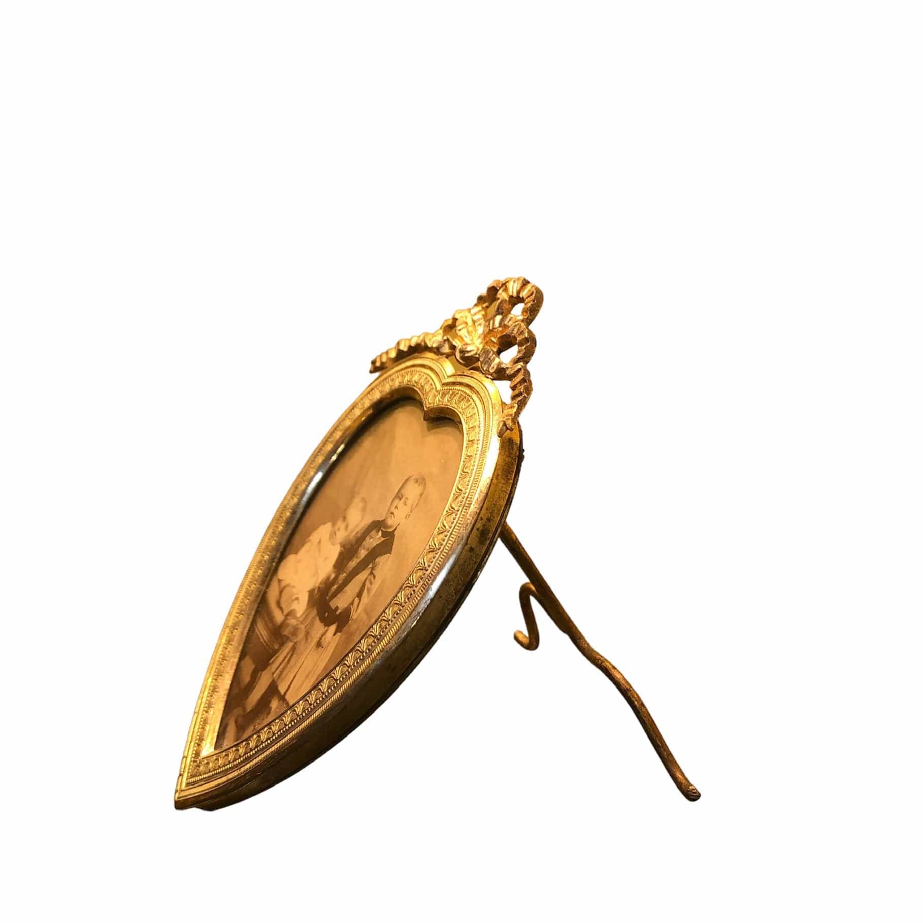 Hermoso portarretrato en forma de corazón en bronce or moulu (oro molido) con finos y delicados detalles enApto para colgar o sostenerse.