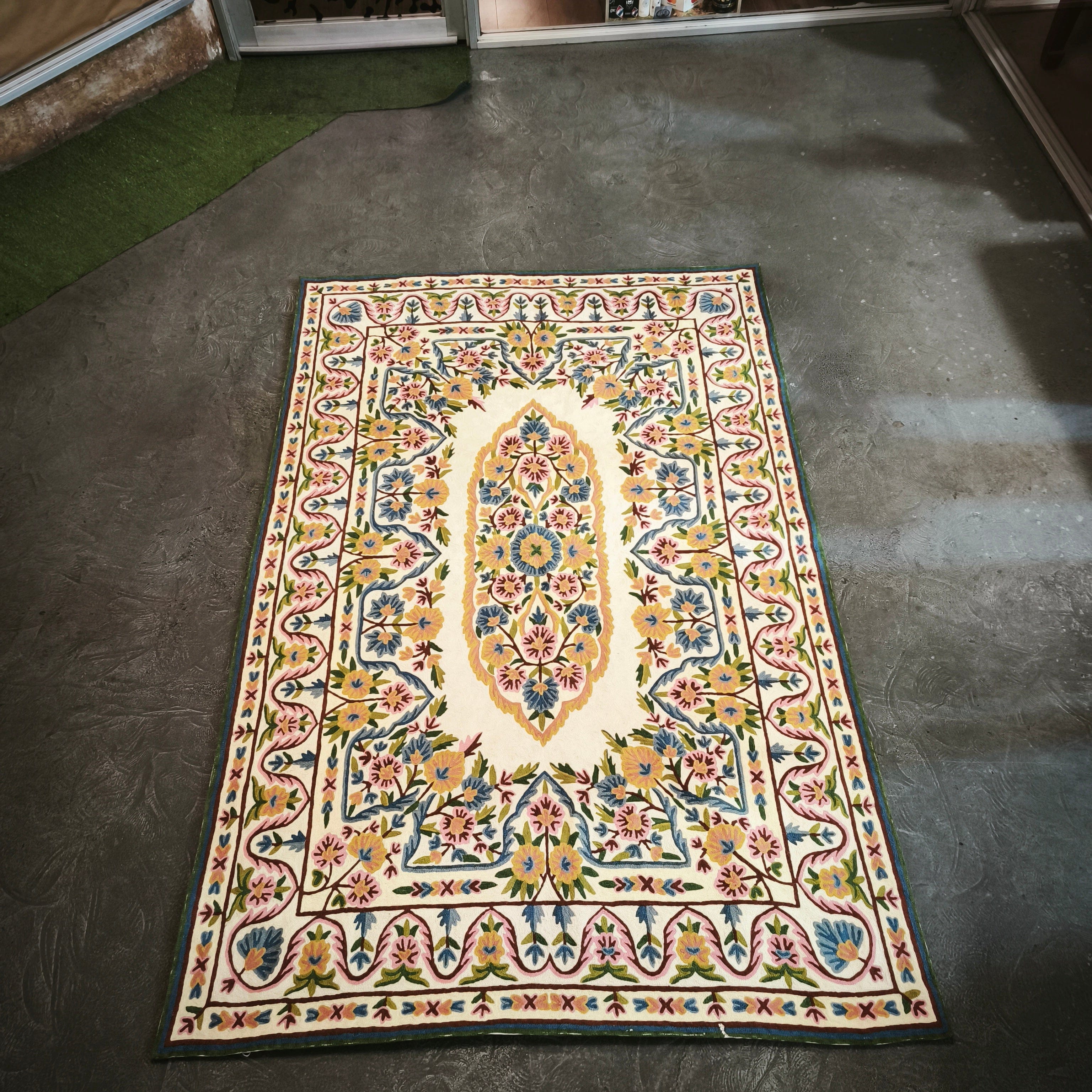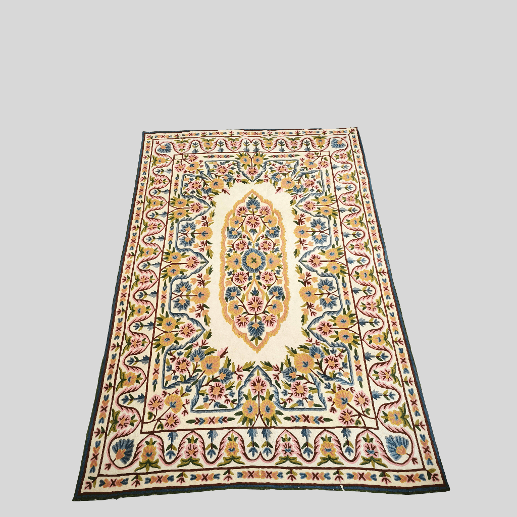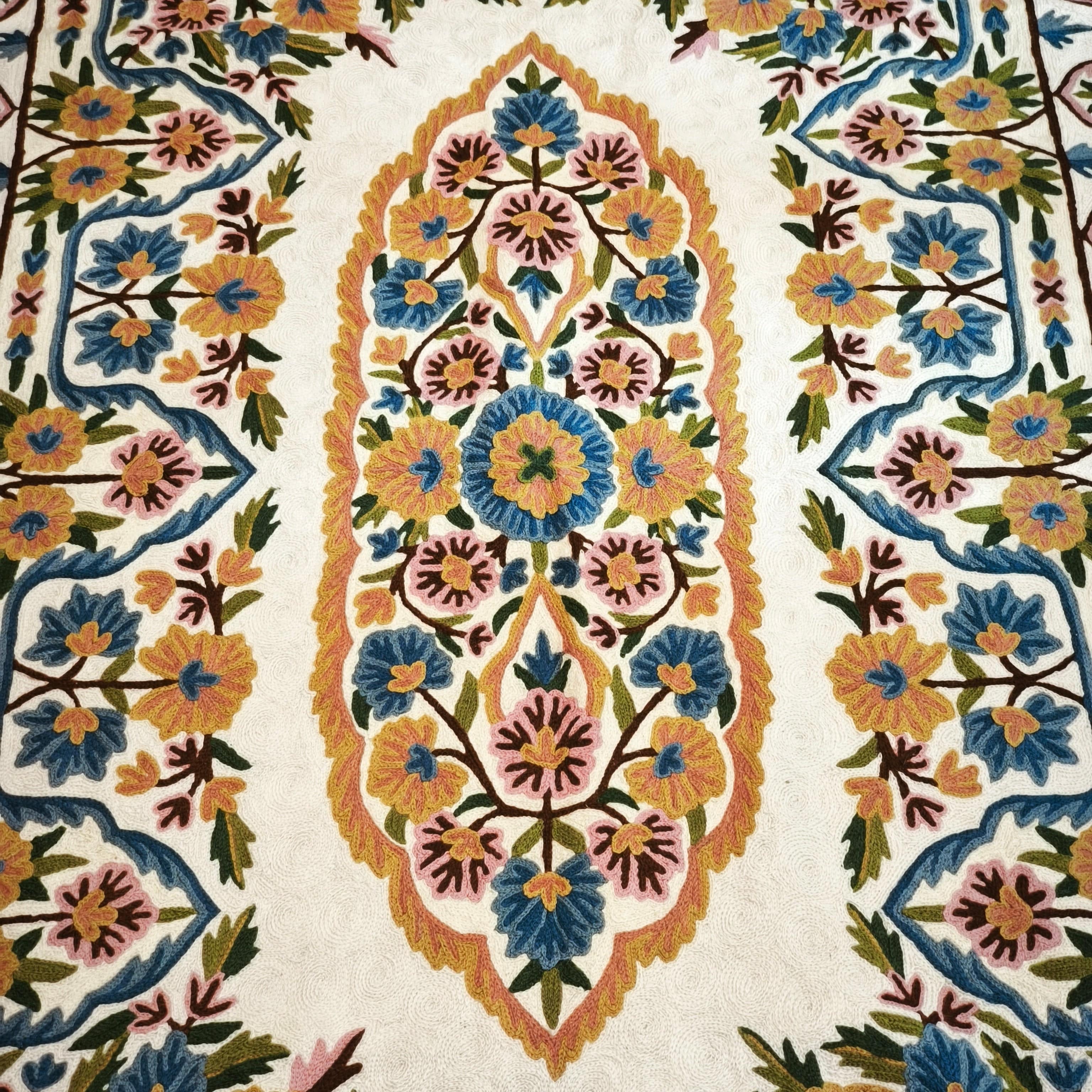 Bellísima tapicería de cachemira bordada a mano en punto de cadena con preciosos patrones florales, en amarillo, dorado y azul, con detalles en verde y rosa. La pieza tiene un fondo blanco que genera un excelente contraste, resaltando el diseño del bordado.