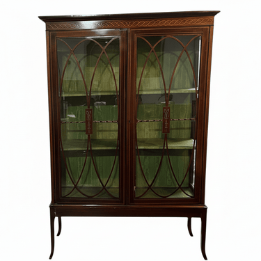 Hermosa vitrina de origen inglés estilo Edwardian, hecha de madera caoba y fina marquetería en madera frutal en su parte superior, con diseño de guirnalda. Además, la pieza tiene un diseño típico del estilo Edwardian en su vidrio, con incrustaciones de madera curvas pintadas a mano. La pieza tiene un interior tapizado de una llamativa tela verde con textura bicolor, que combina muy bien con el color de la madera, y dos repisas para exhibir.