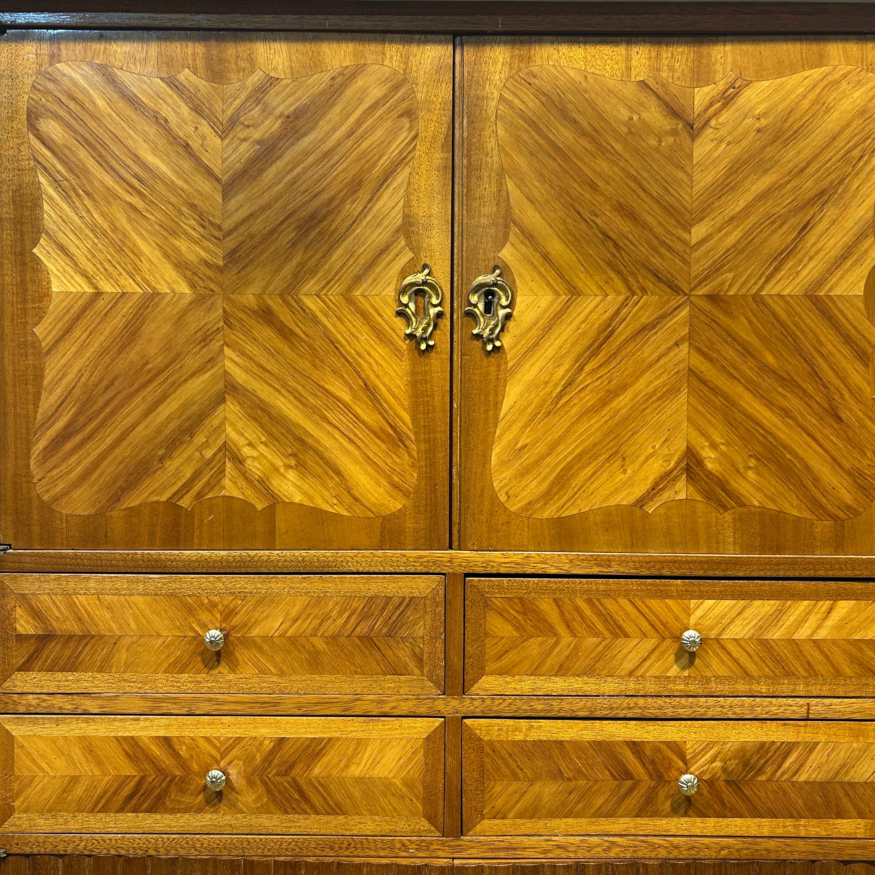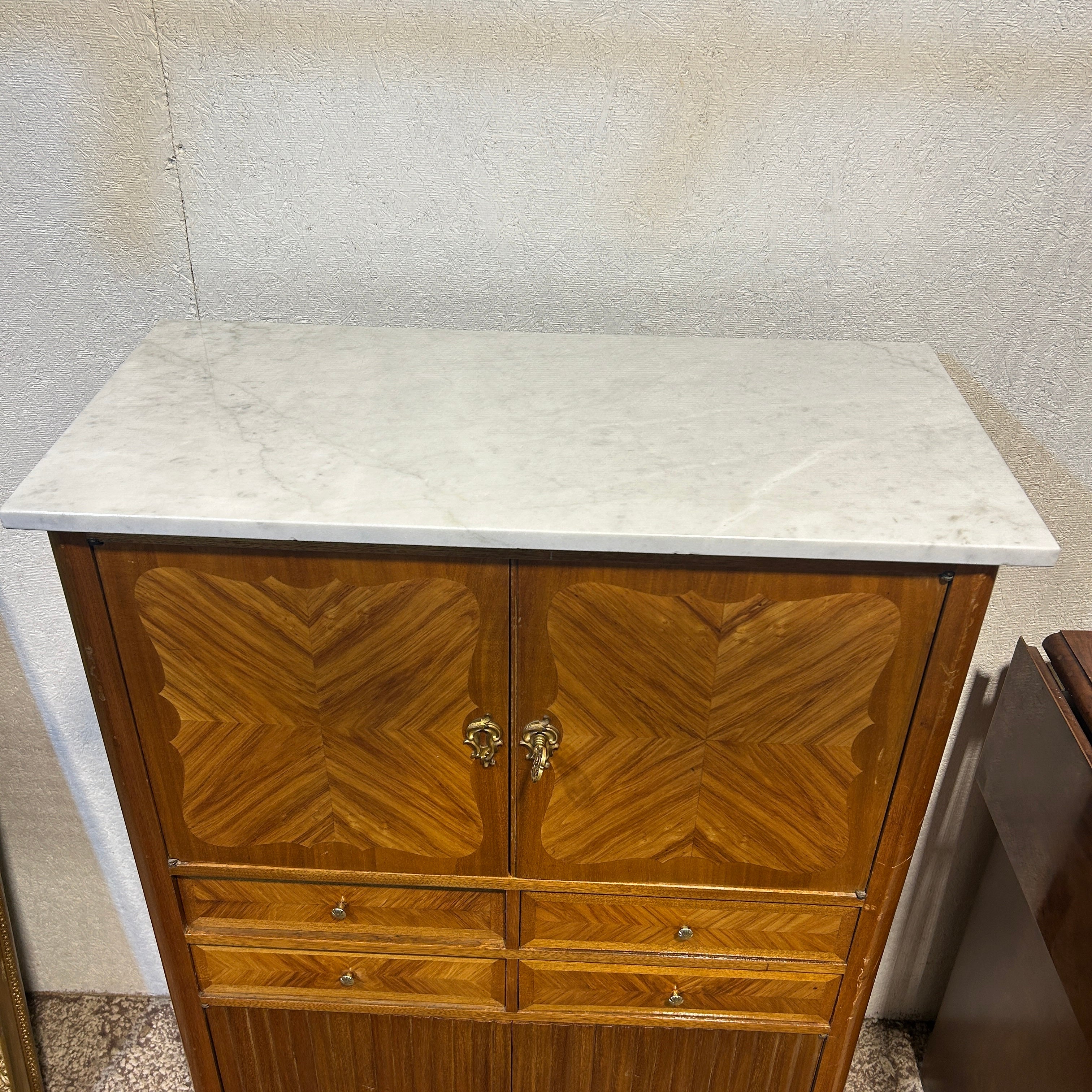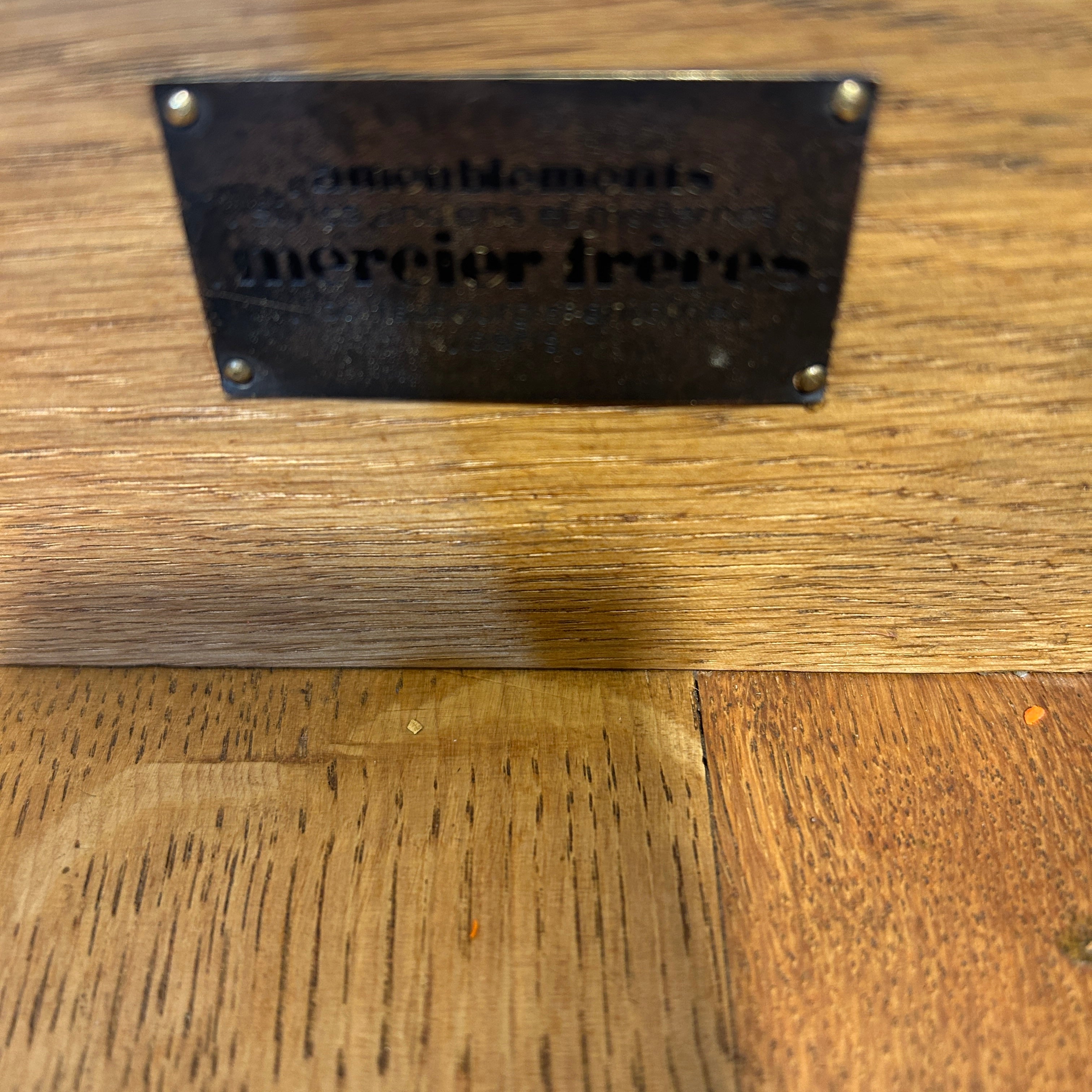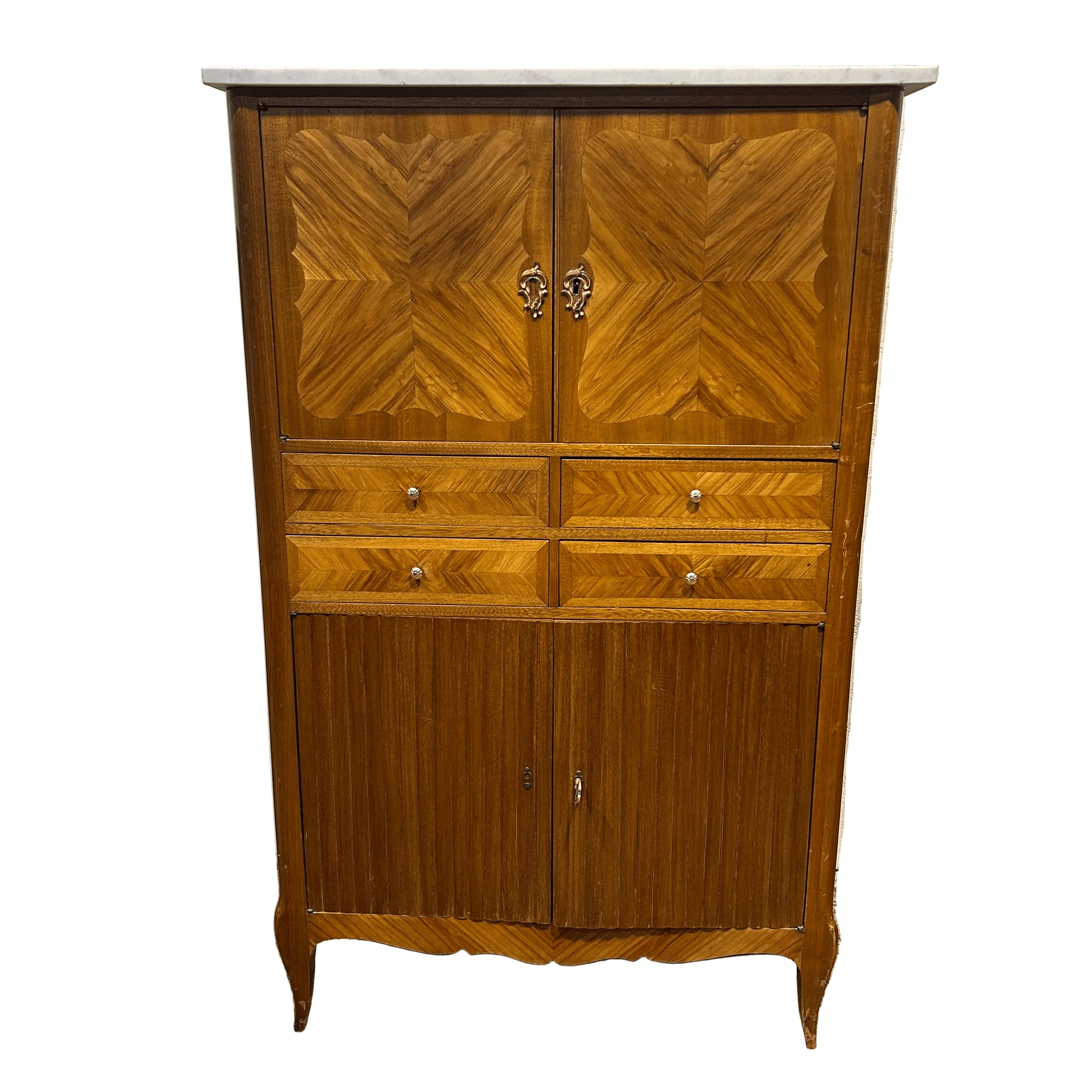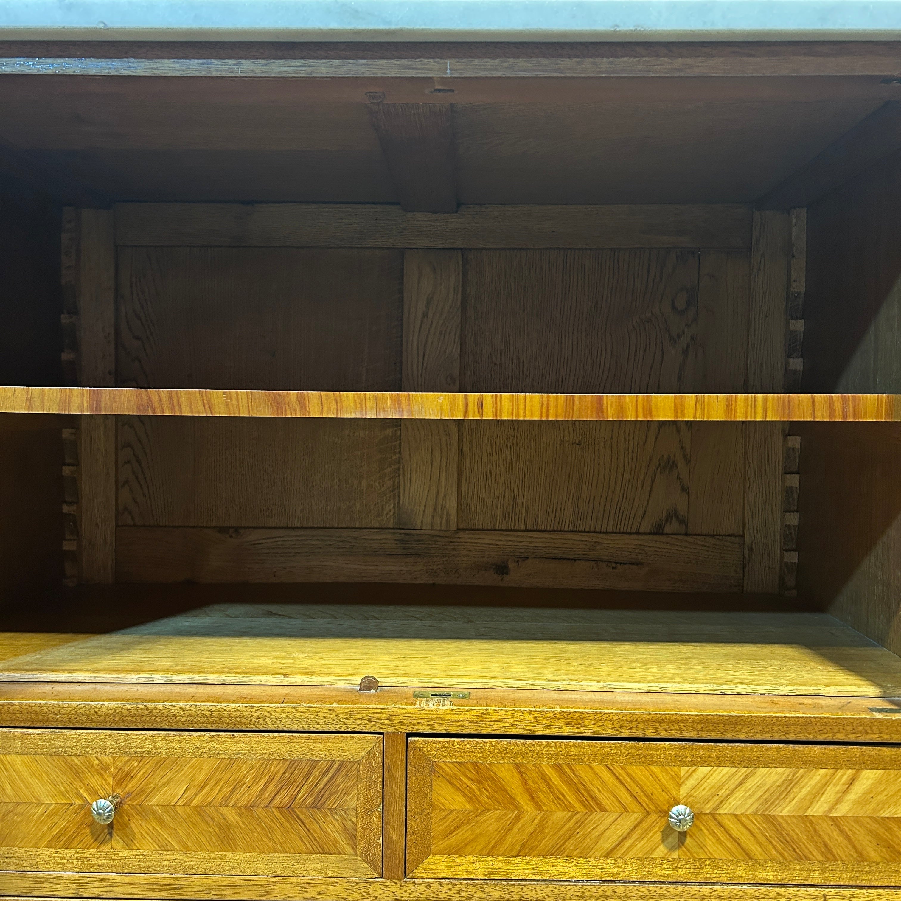 Exclusiva y lujosa alacena francesa de madera de encino con marquetería de caoba rubia y palo de rosa, manufacturado por el prestigioso Atelier parisino Mercier Frères una pieza que conjuga nobleza material y refinamiento artesanal. Su interior es encino puro, una madera que destaca por su capacidad de no absorber humedad, lo que la convierte en un mueble que traspasa el paso del tiempo. utilidad. Al centro, cuatro pequeños cajones, uno de ellos con la placa original del atelier la aportan identidad y valor histórico. La sección inferior se distingue por su puerta tallada, cuyo diseño evoca el lenguaje de las antiguas correderas. La cubierta de mármol, no original, pero añade un contraste posterior sin restar protagonismo a la estructura original.