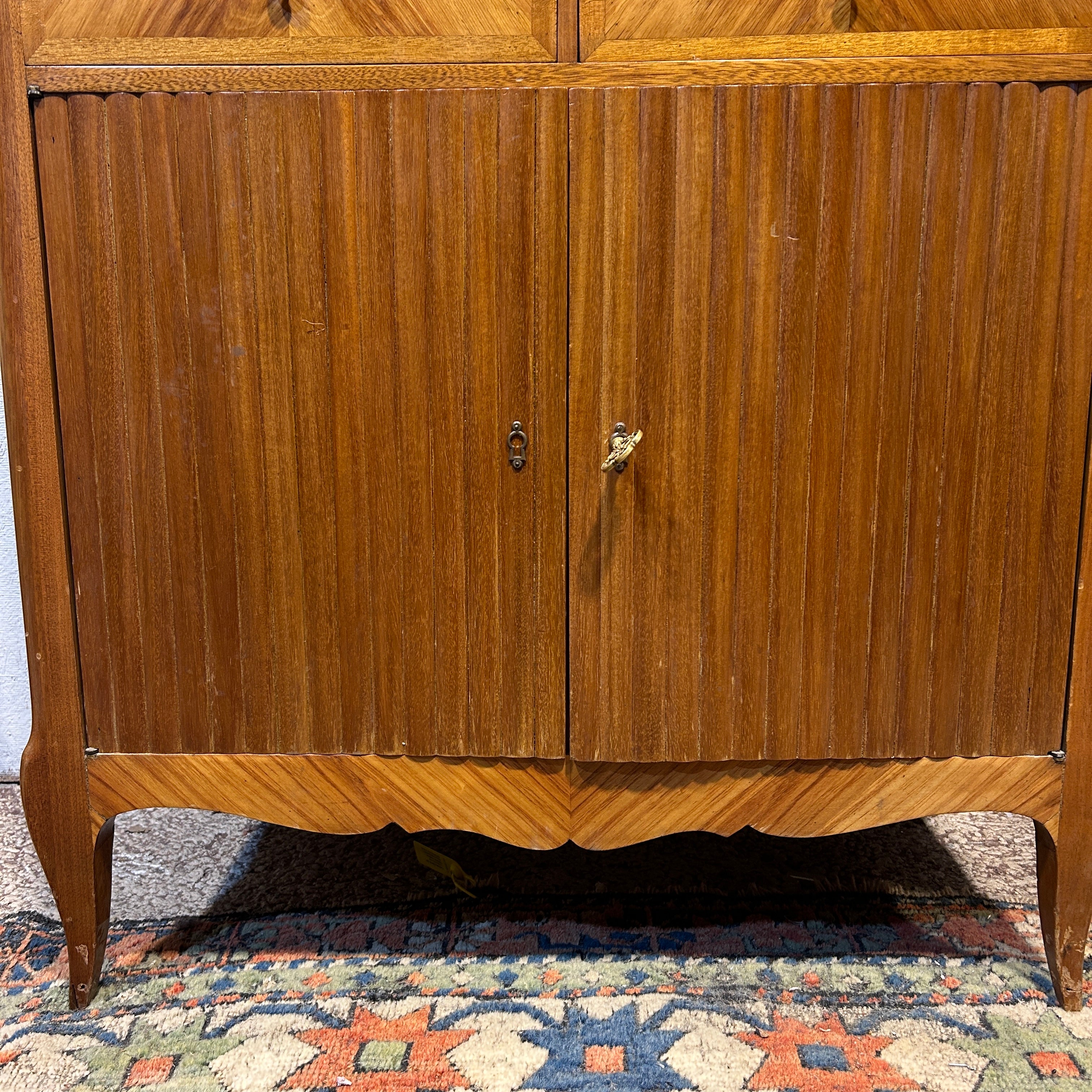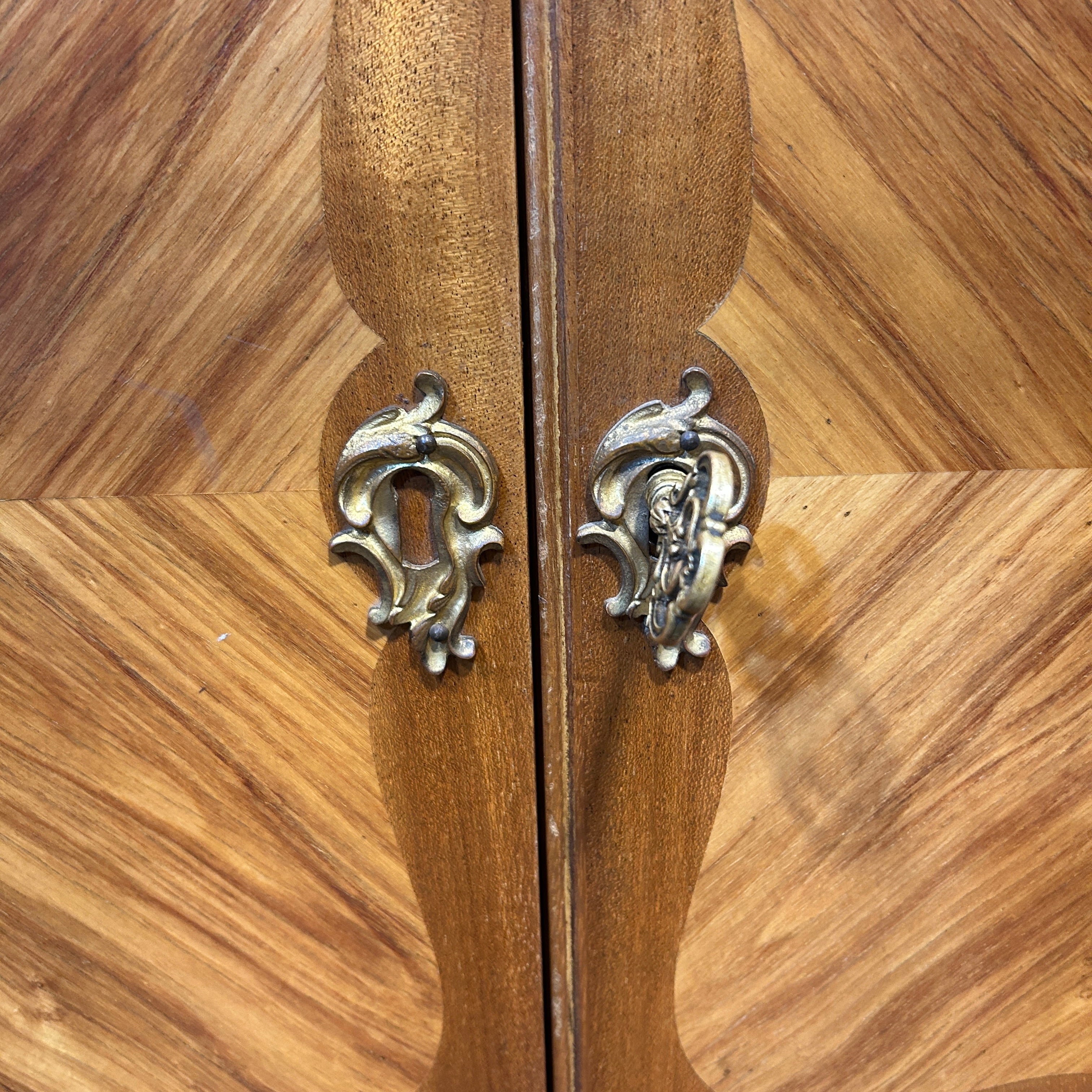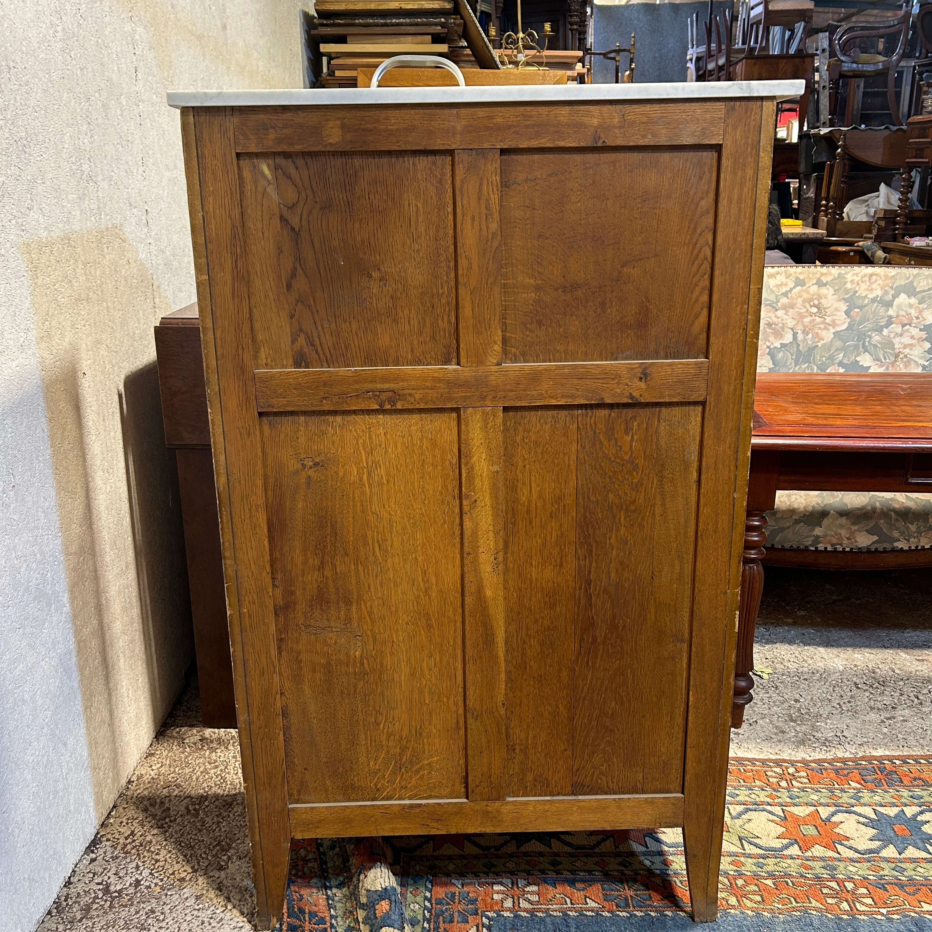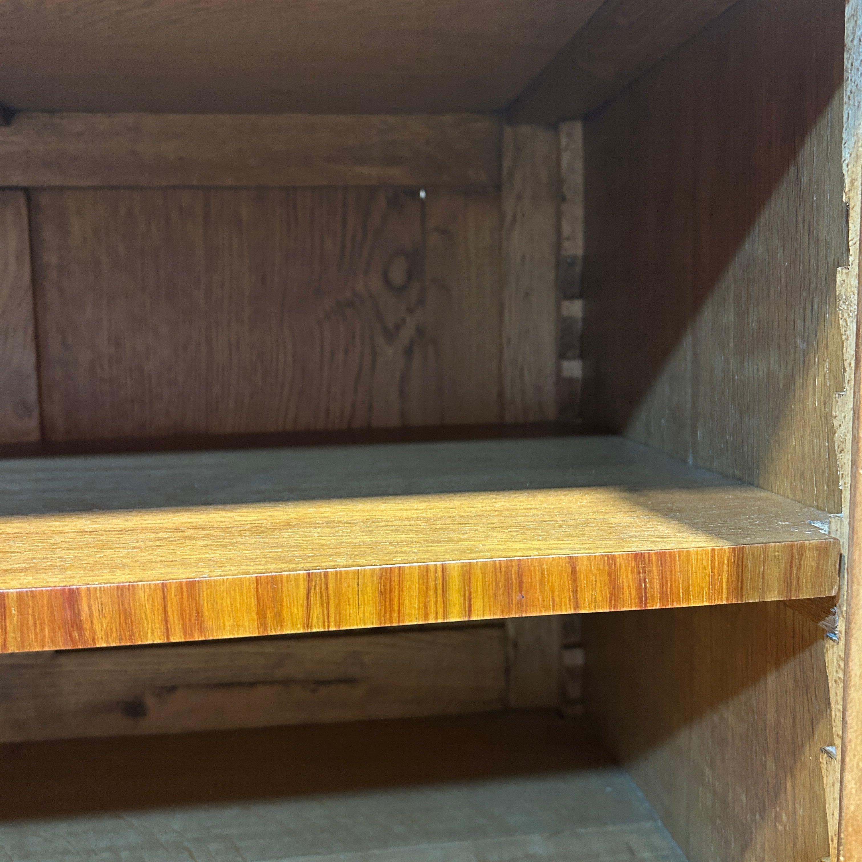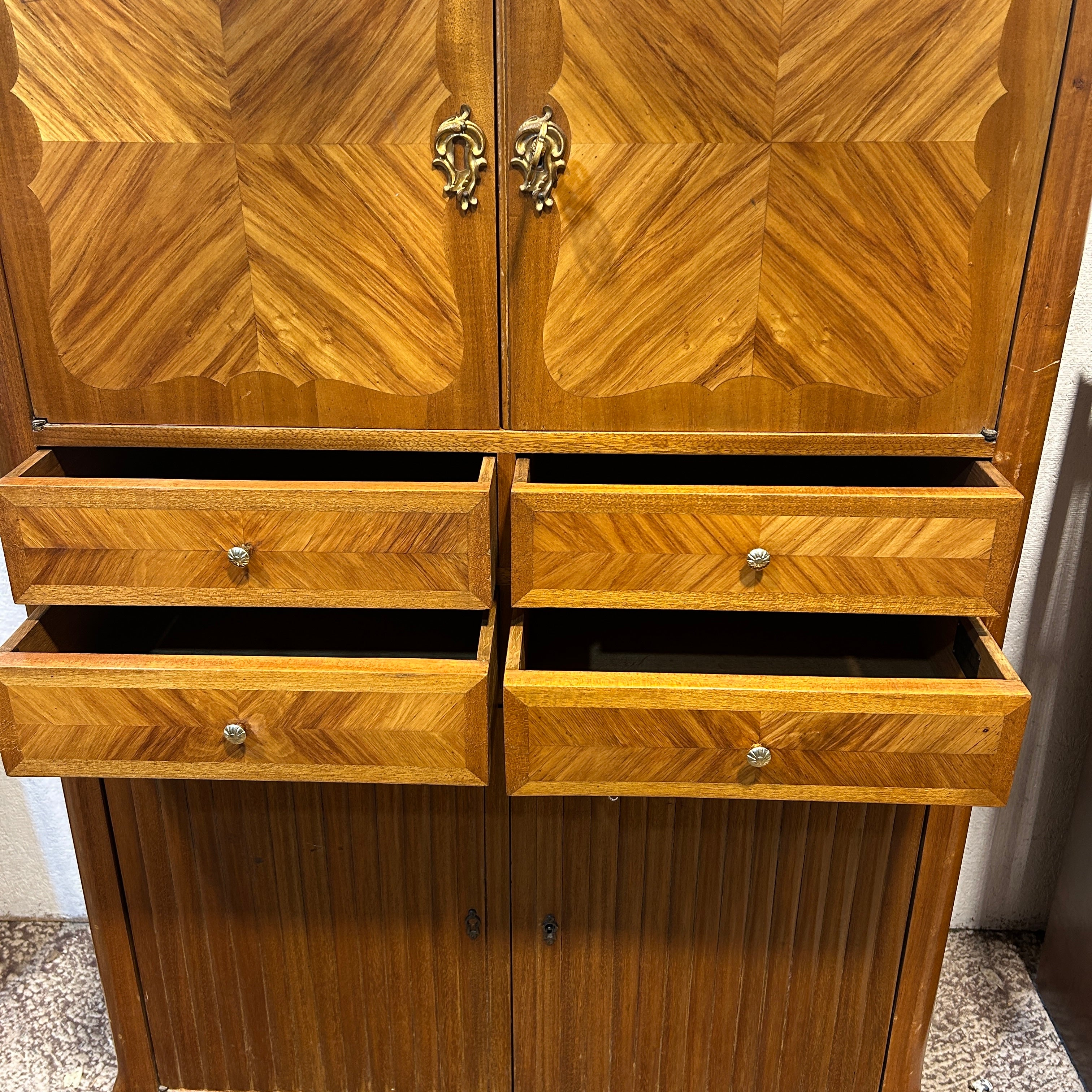 Exclusiva y lujosa alacena francesa de madera de encino con marquetería de caoba rubia y palo de rosa, manufacturado por el prestigioso Atelier parisino Mercier Frères una pieza que conjuga nobleza material y refinamiento artesanal. Su interior es encino puro, una madera que destaca por su capacidad de no absorber humedad, lo que la convierte en un mueble que traspasa el paso del tiempo. utilidad. Al centro, cuatro pequeños cajones, uno de ellos con la placa original del atelier la aportan identidad y valor histórico. La sección inferior se distingue por su puerta tallada, cuyo diseño evoca el lenguaje de las antiguas correderas. La cubierta de mármol, no original, pero añade un contraste posterior sin restar protagonismo a la estructura original.