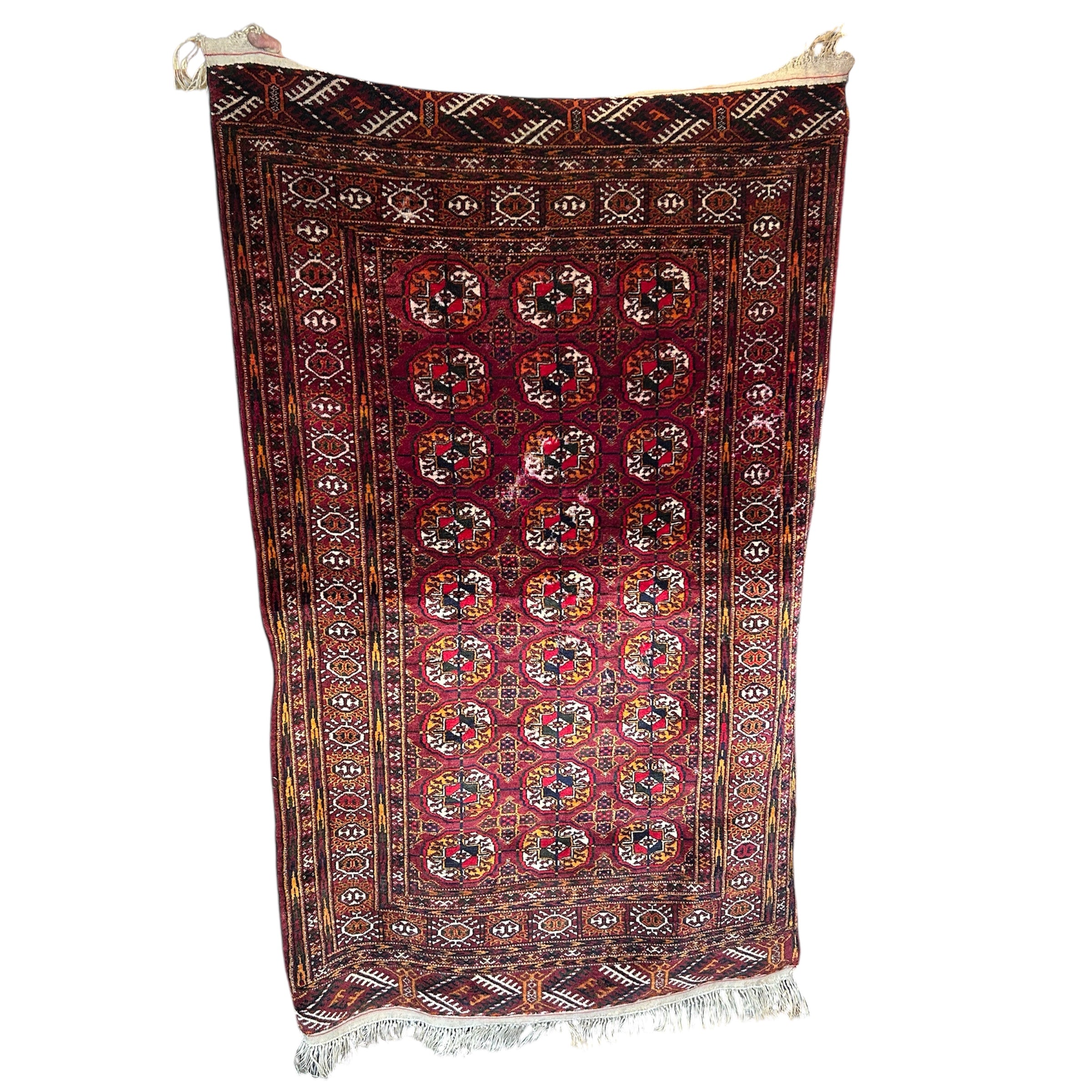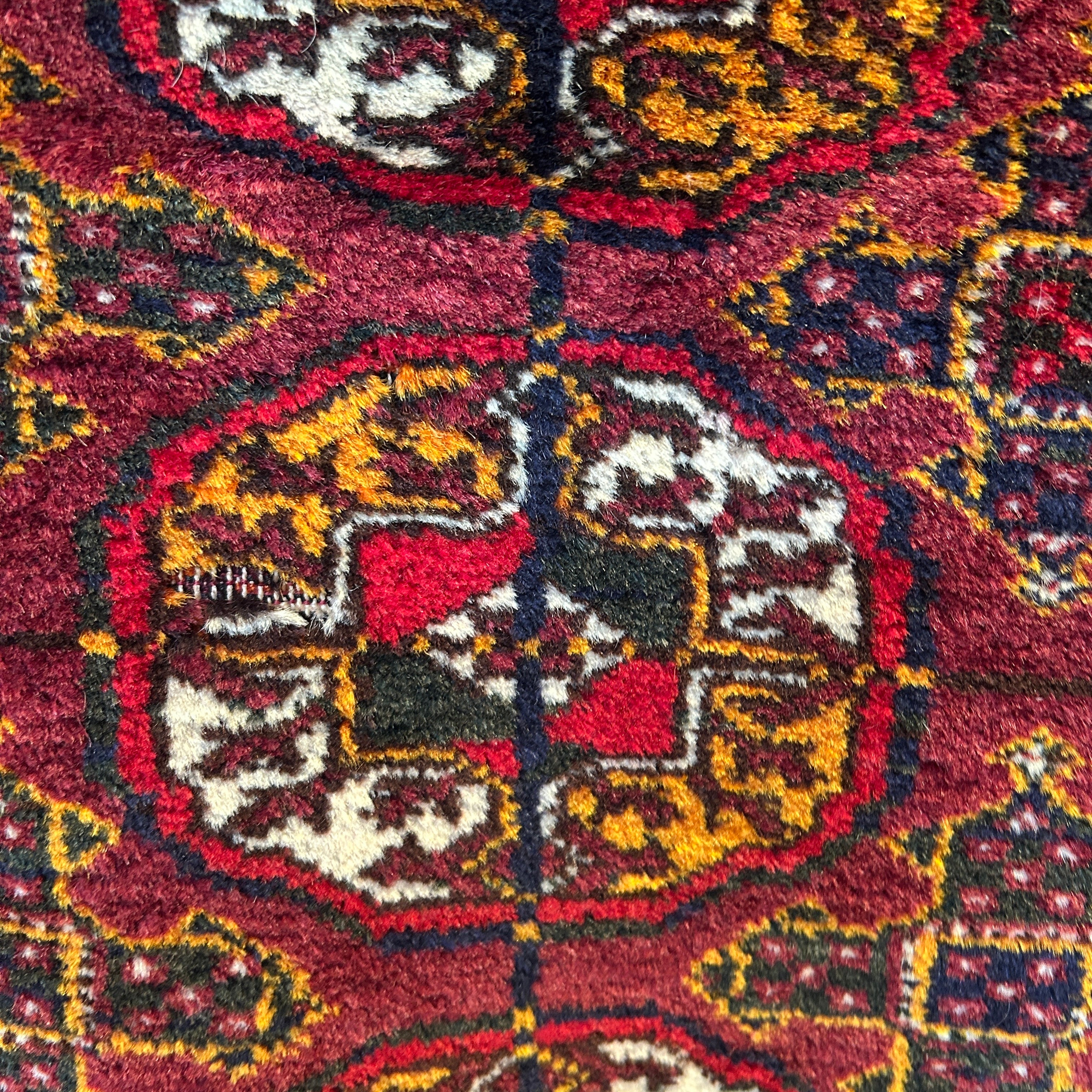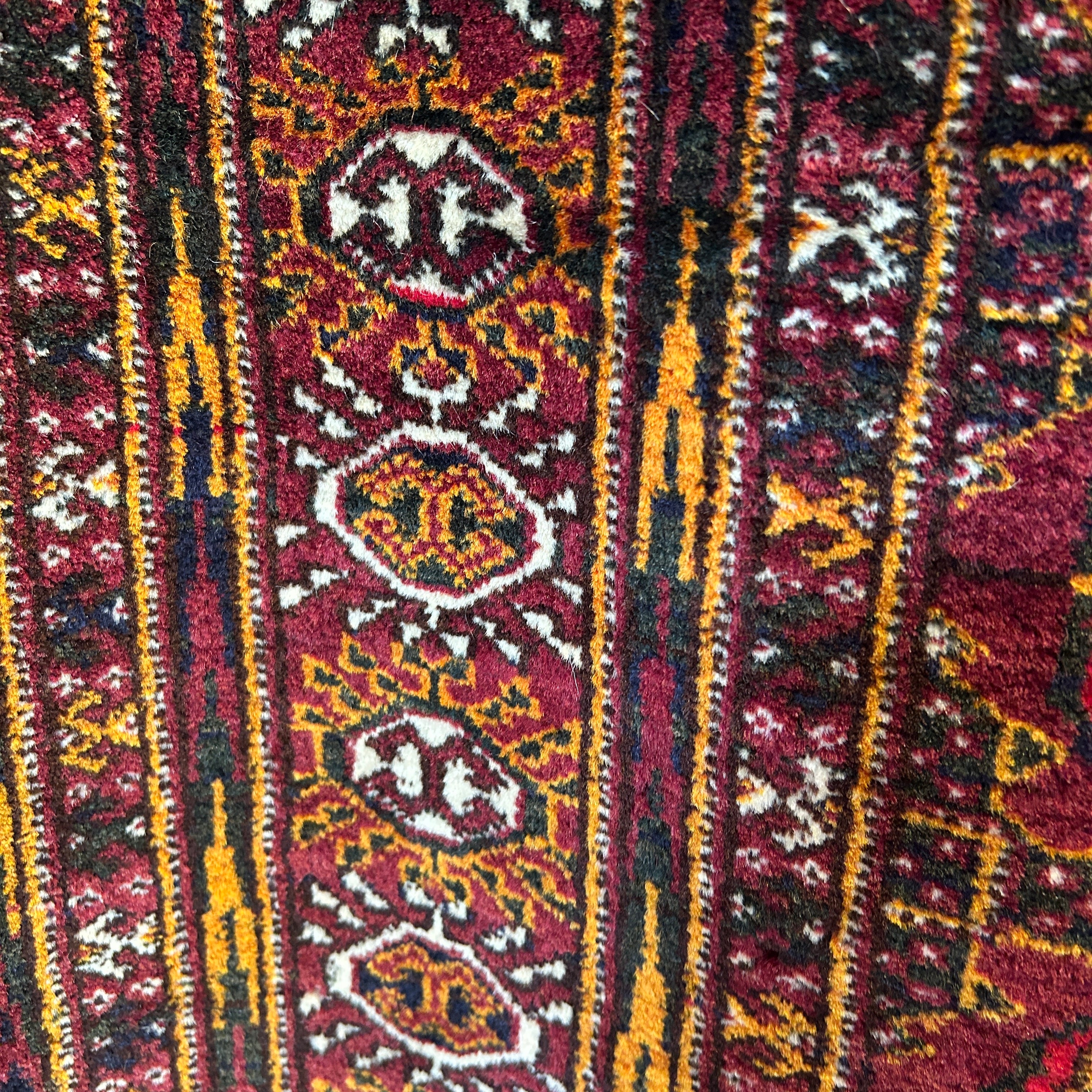Bella alfombra de origen pakistaní Bucara, tejida a mano en lana teñida en rojo, amarillo y detalles verdes. Esta pieza tiene tres zonas con diferentes patrones geométricos: la primera tiene figuras circulares, con detalles an blanco, amarillo y verde, sobre un fondo rojo, y a segunda corresponde a los bordes de cintillos en patrones. Los extremos de la alfombra tienen otro patrón terminado en la urdimbre a la vista, mostrando la materia prima sobre la cual se teje esta increíble alfombra.