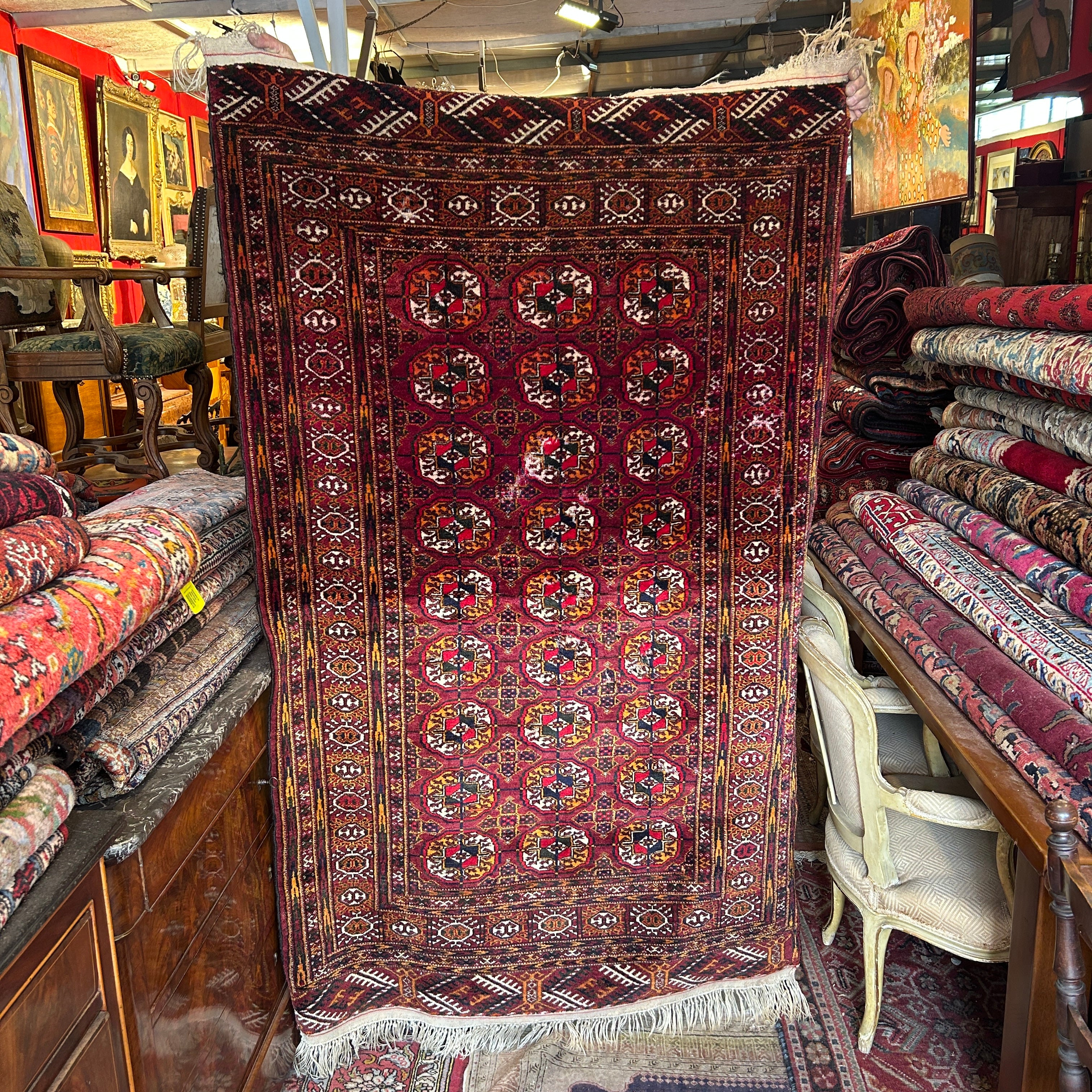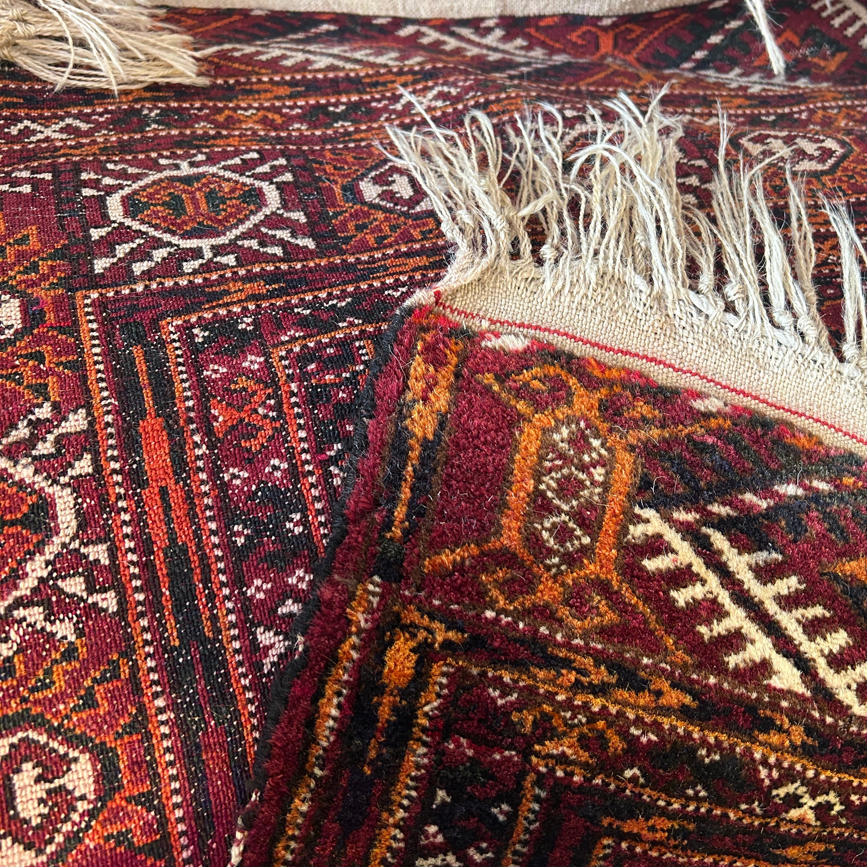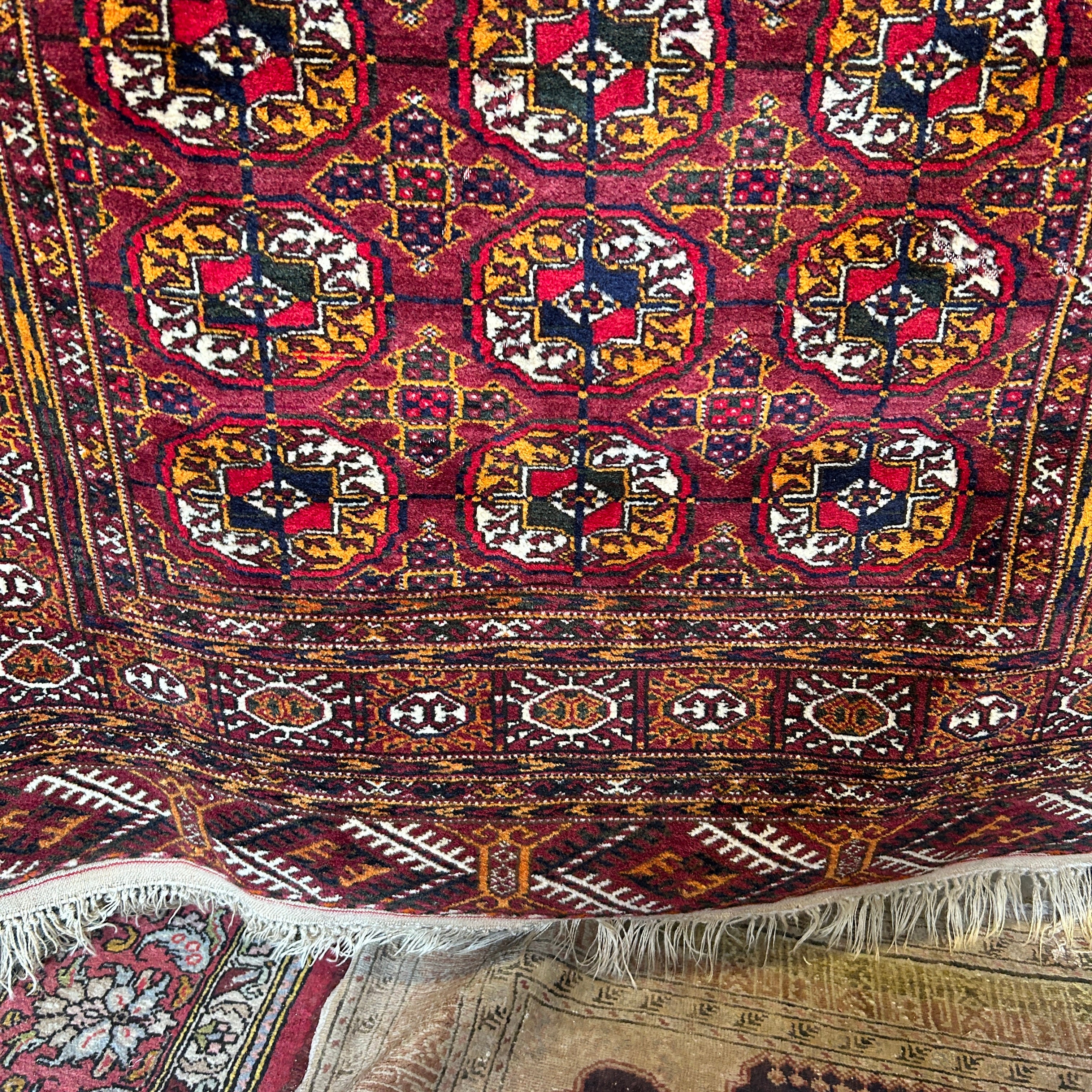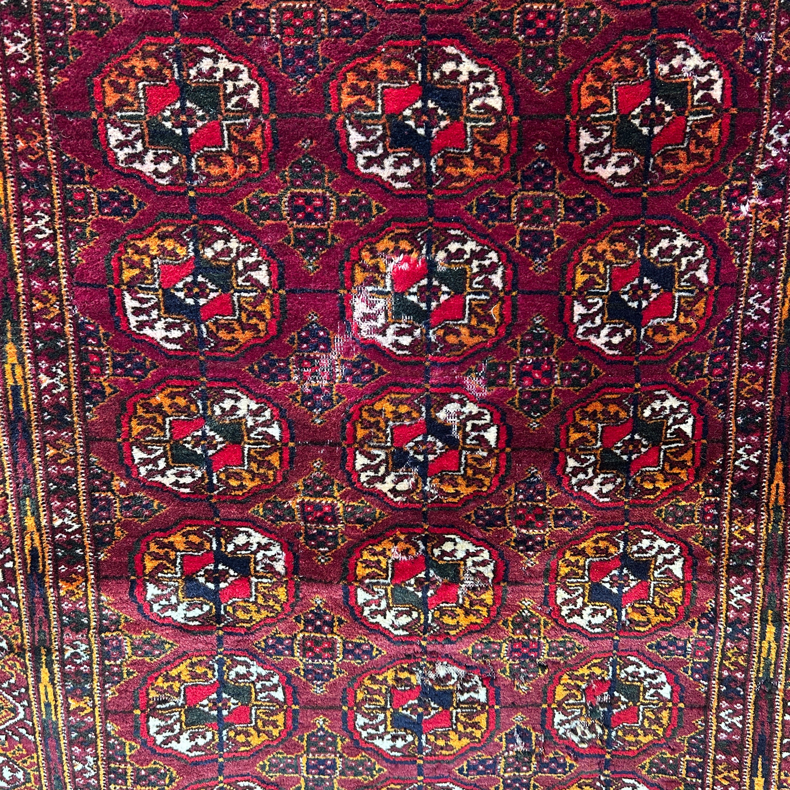 Bella alfombra de origen pakistaní Bucara, tejida a mano en lana teñida en rojo, amarillo y detalles verdes. Esta pieza tiene tres zonas con diferentes patrones geométricos: la primera tiene figuras circulares, con detalles an blanco, amarillo y verde, sobre un fondo rojo, y a segunda corresponde a los bordes de cintillos en patrones. Los extremos de la alfombra tienen otro patrón terminado en la urdimbre a la vista, mostrando la materia prima sobre la cual se teje esta increíble alfombra.