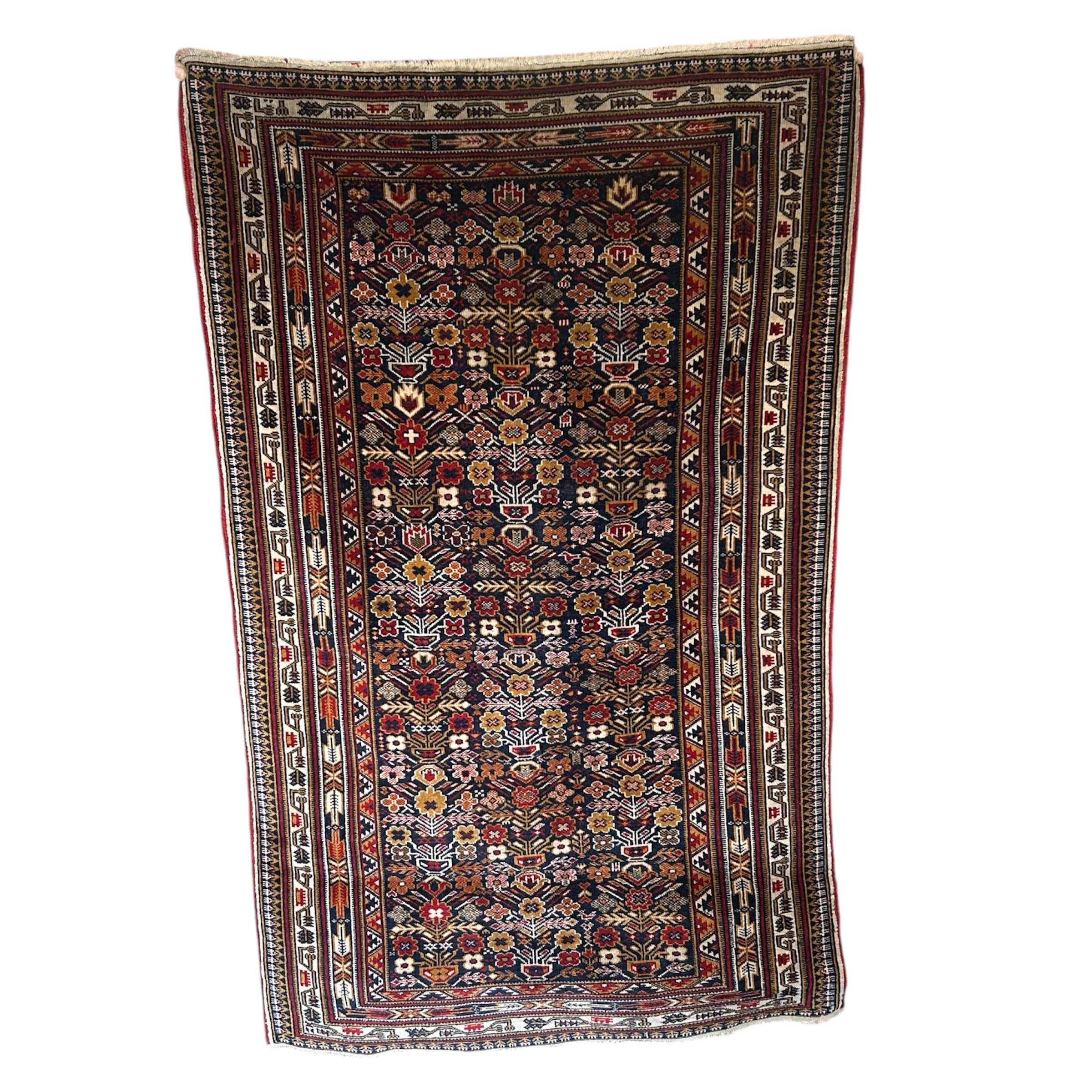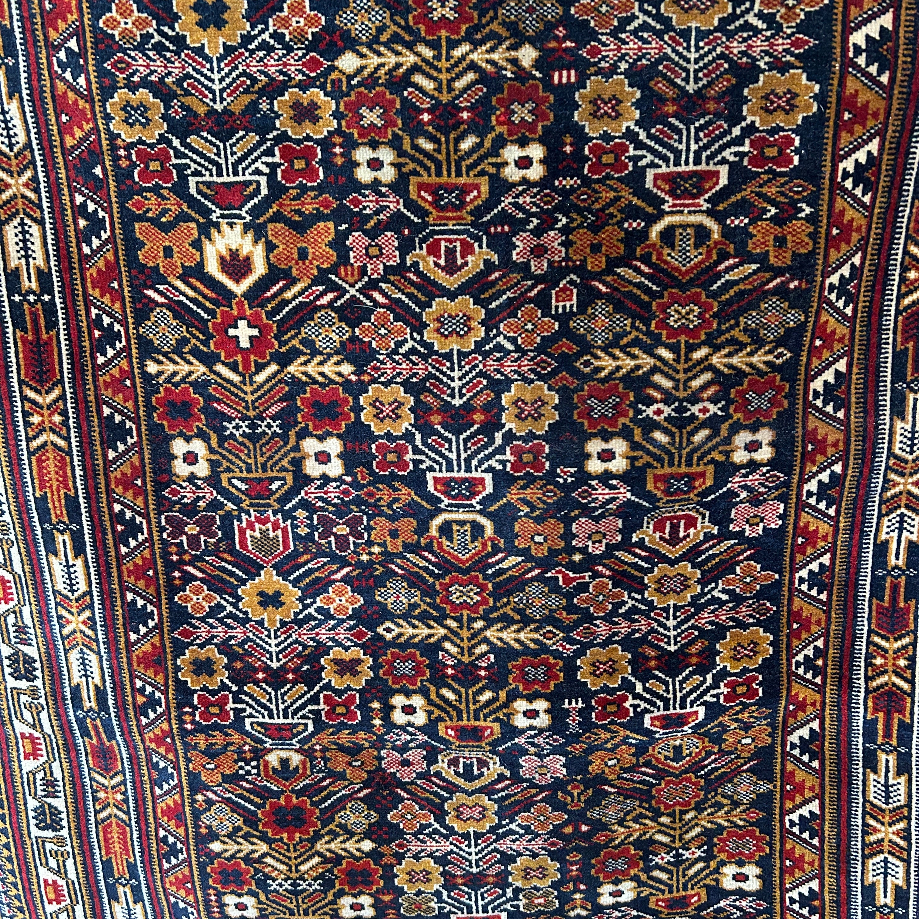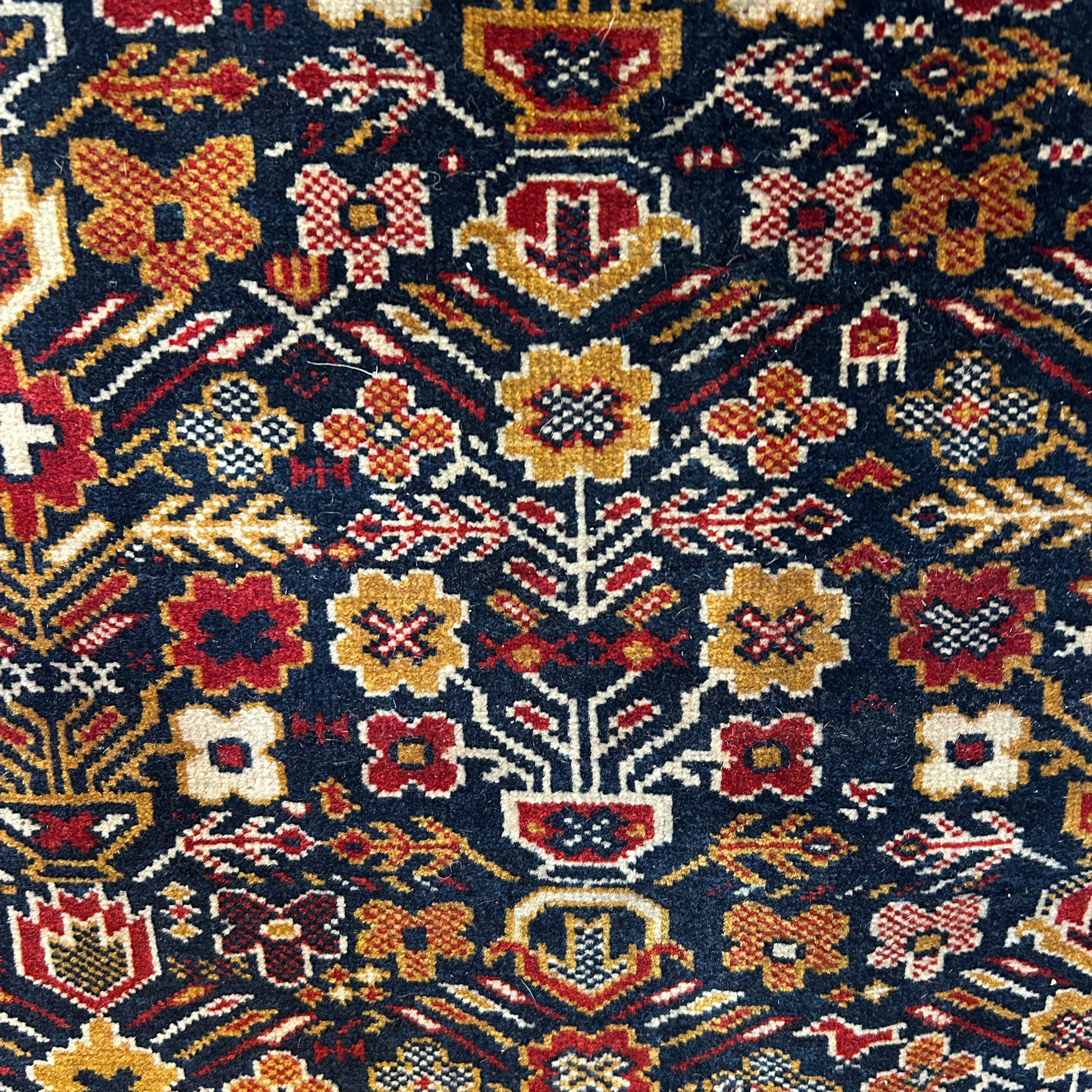 Bella alfombra de origen Cáucaso Ruso de la zona Derbent, tejido a mano en lana en patrones florales teñidos de colores rojos, amarillos y naranjos, sobre un fondo azul oscuro. La pieza tiene una zona central de fondo azul, con un patrón de pequeñas flores con bordes blancos, seguida de la zona de los bordes, hecha de cadenas geométricas.