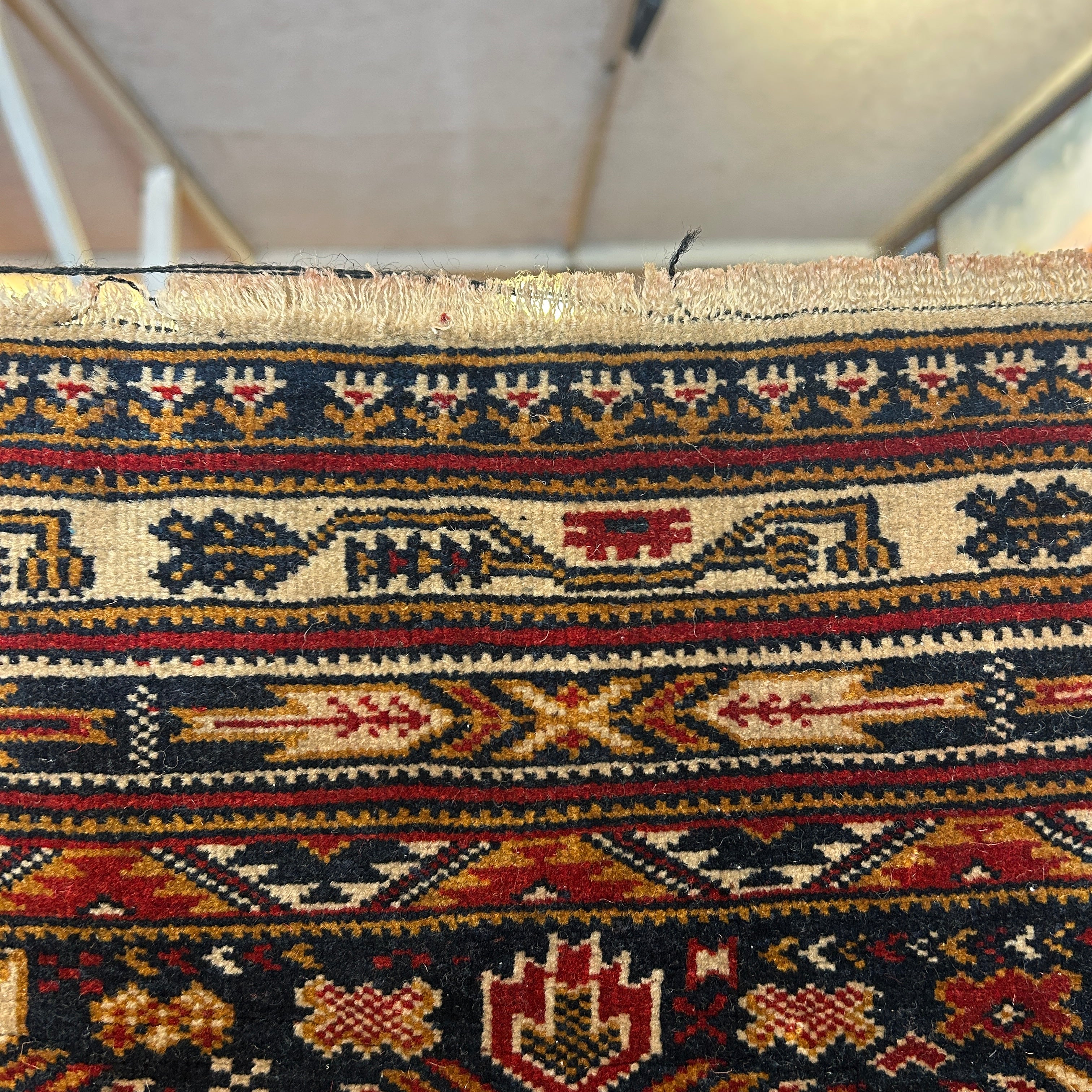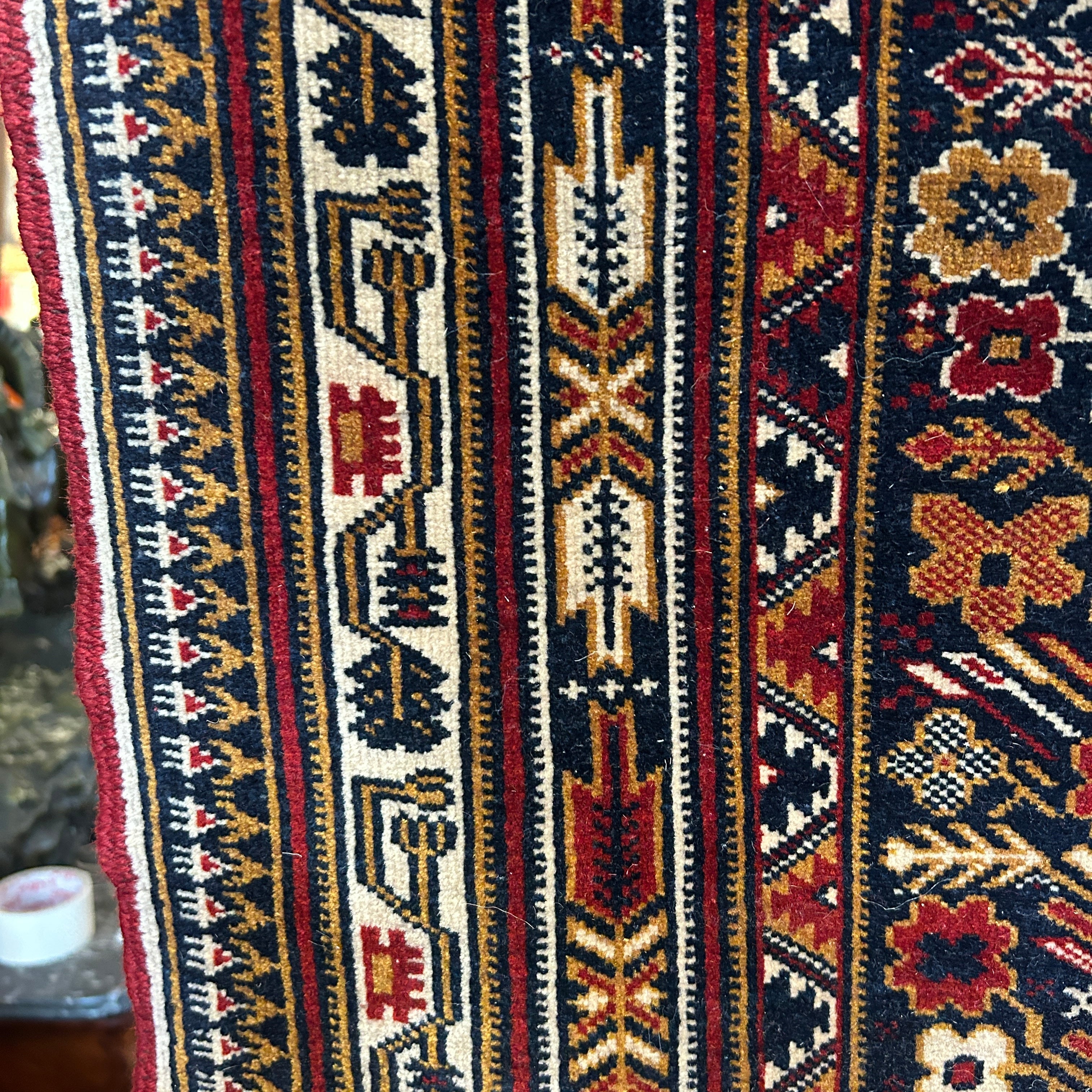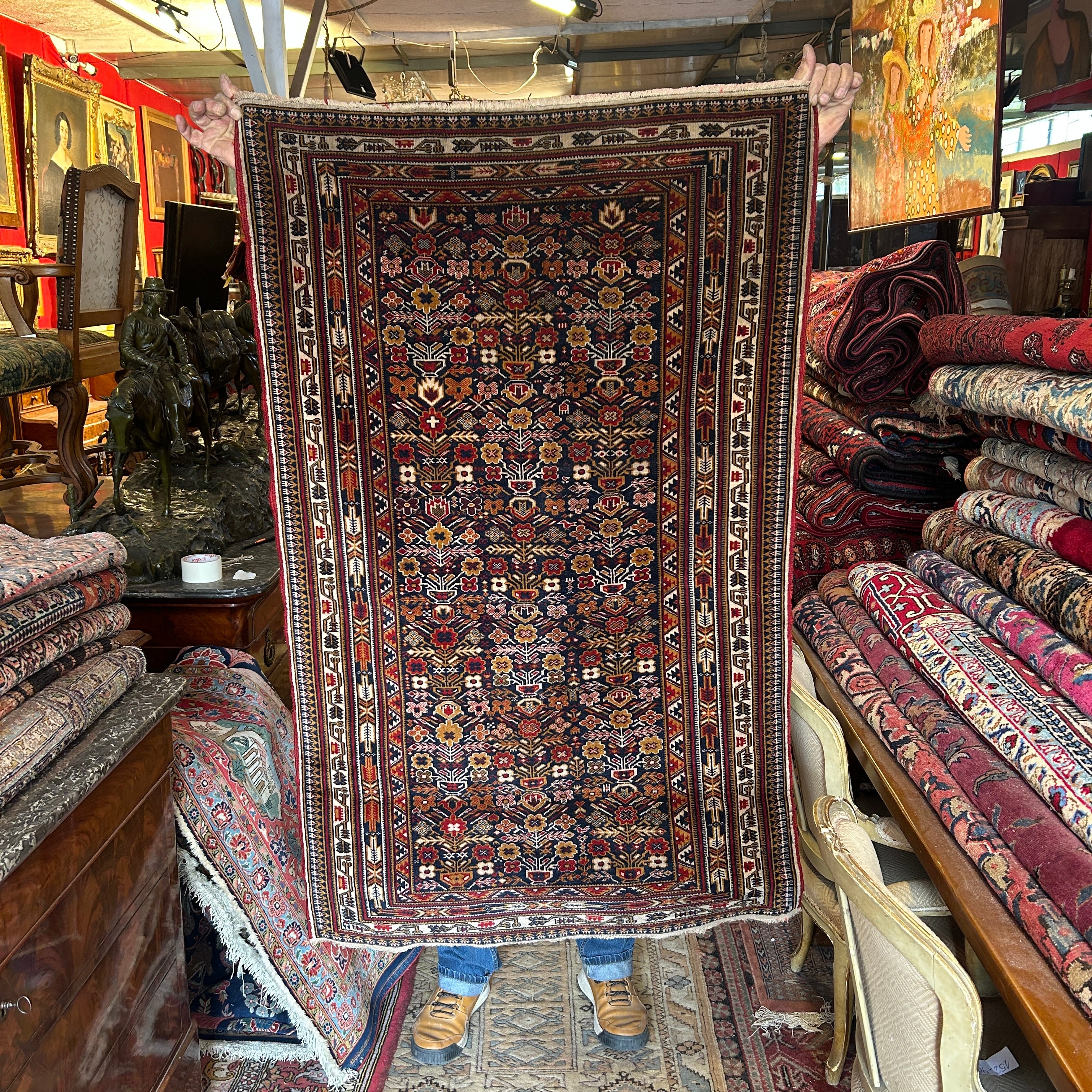 Bella alfombra de origen Cáucaso Ruso de la zona Derbent, tejido a mano en lana en patrones florales teñidos de colores rojos, amarillos y naranjos, sobre un fondo azul oscuro. La pieza tiene una zona central de fondo azul, con un patrón de pequeñas flores con bordes blancos, seguida de la zona de los bordes, hecha de cadenas geométricas.