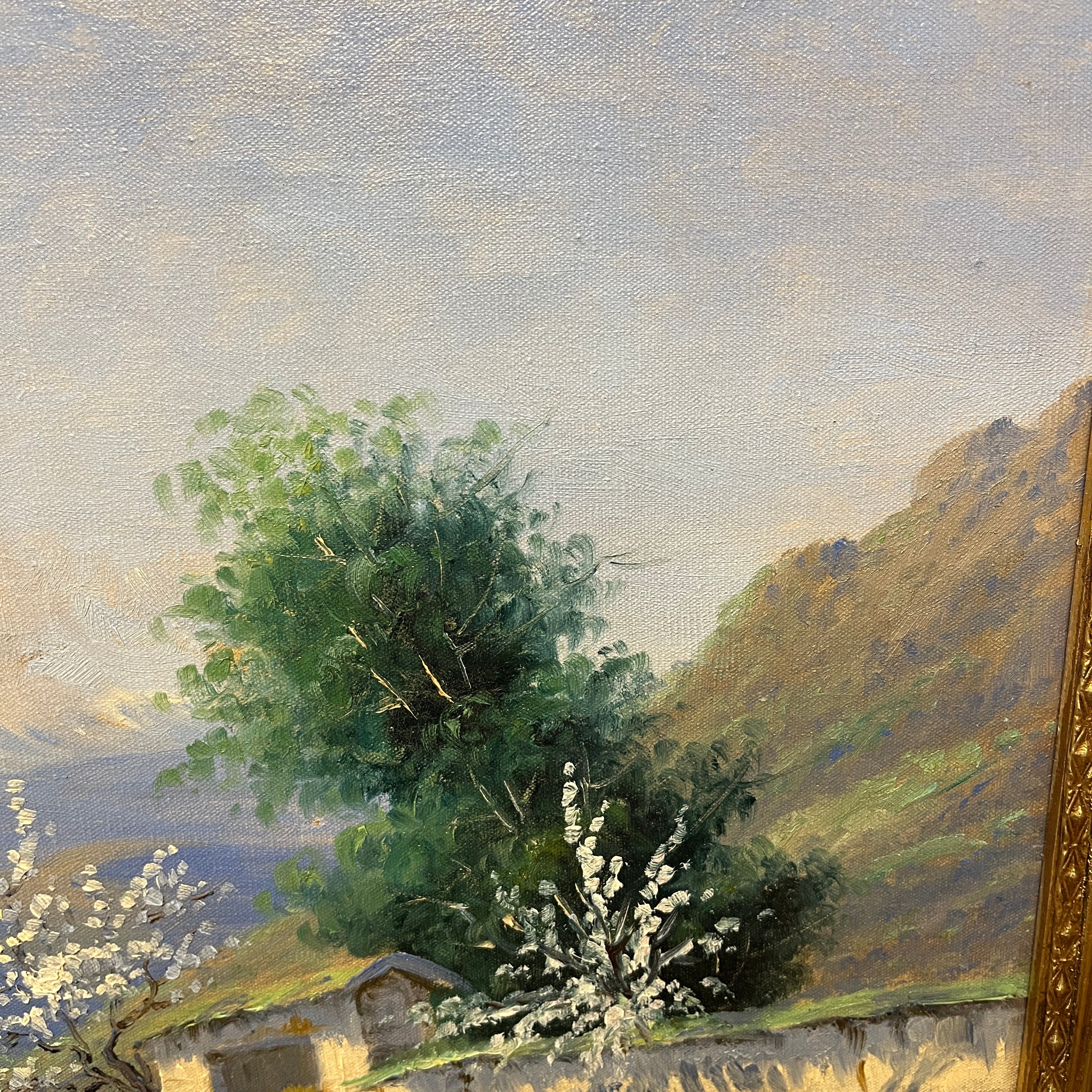 Óleo sobre tela del reconocido artista chileno Alfredo Lobos Alfaro, representando un paisaje del valle central, en el que dos perros atraviesan un camino rural, rodeado de bella vegetación y la entrada a una parcela, todo acompañado por la cordillera en el horizonte. La obra tiene un marco de madera dorada, tallada en bellos relieves.