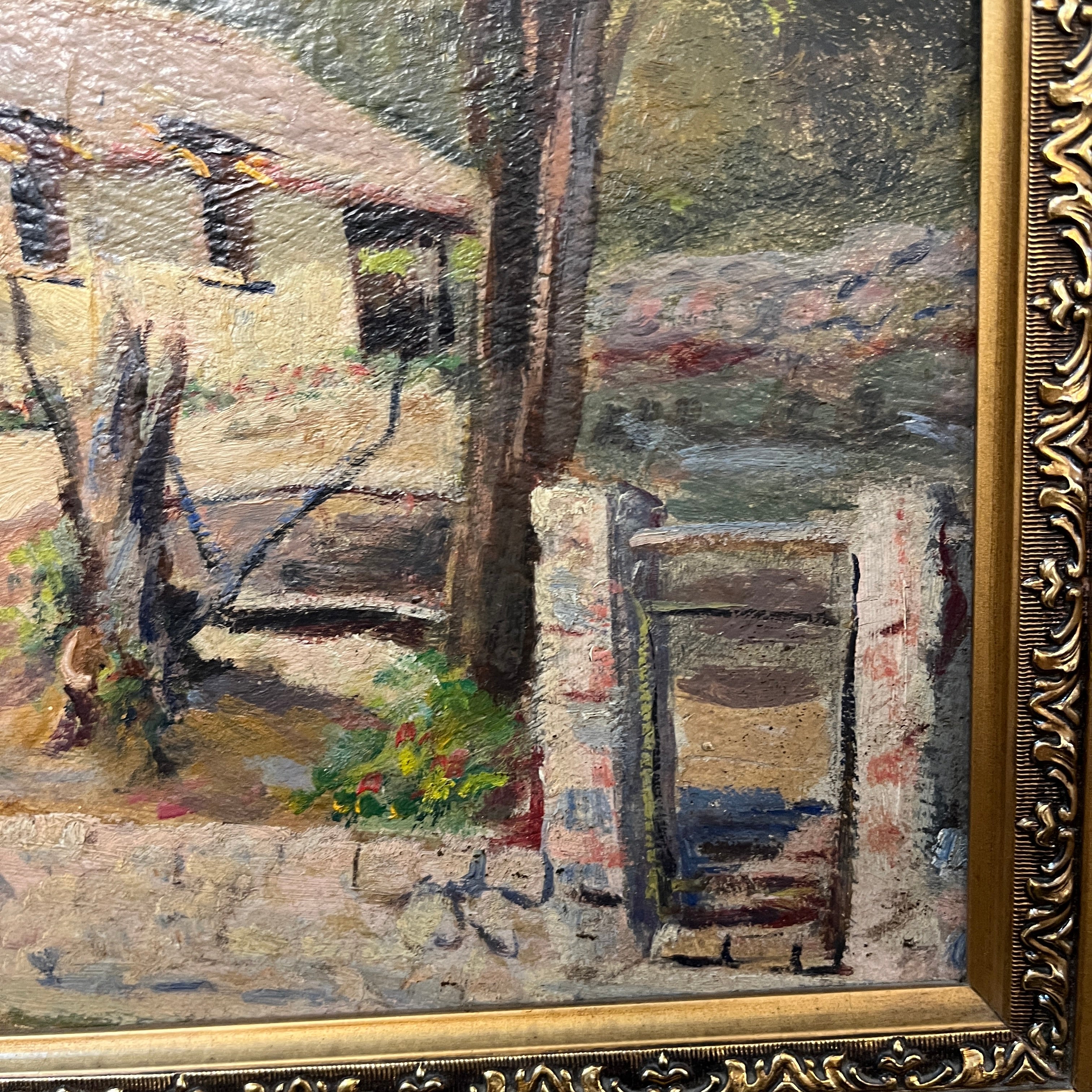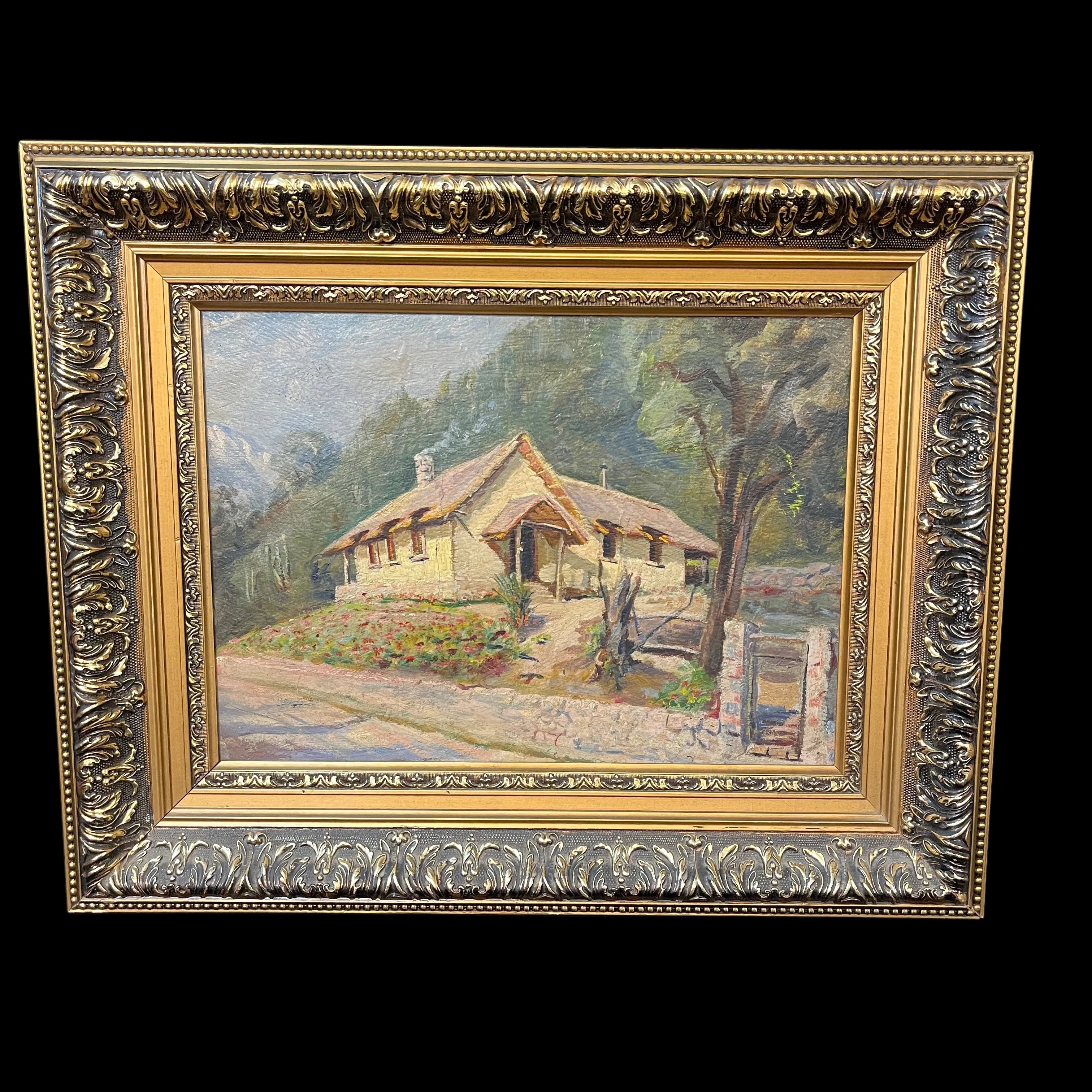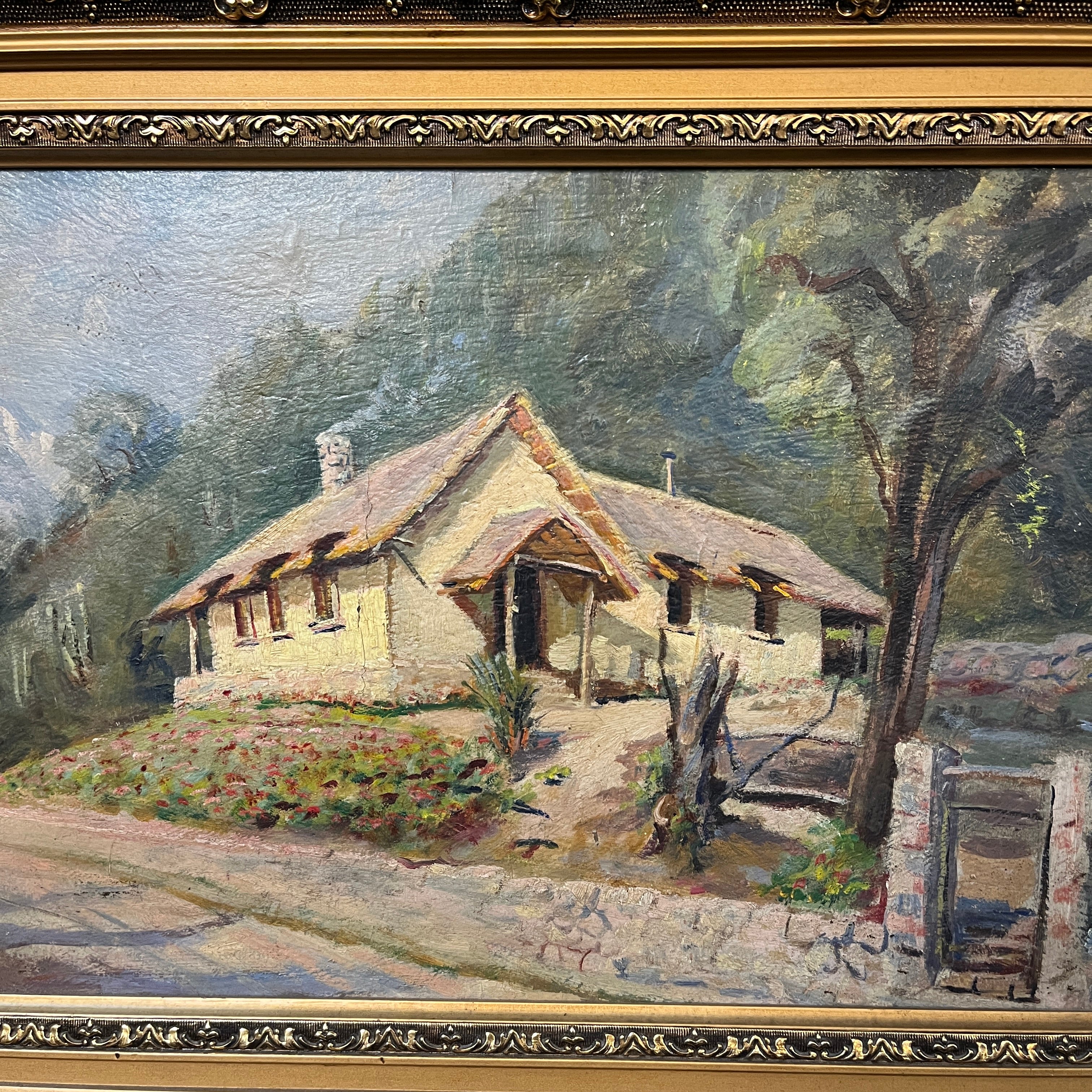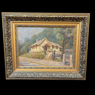 Óleo sobre madera representando un paisaje rural en el que se ve una casita de campo desde el camino, mostrando la puerta, el jardín anterior y la fachada. La obra evoca una imagen muy reconocible del mundo rural chileno, retratándola con cariño a los detalles, haciéndo lo reconocible, íntimo y cercano.