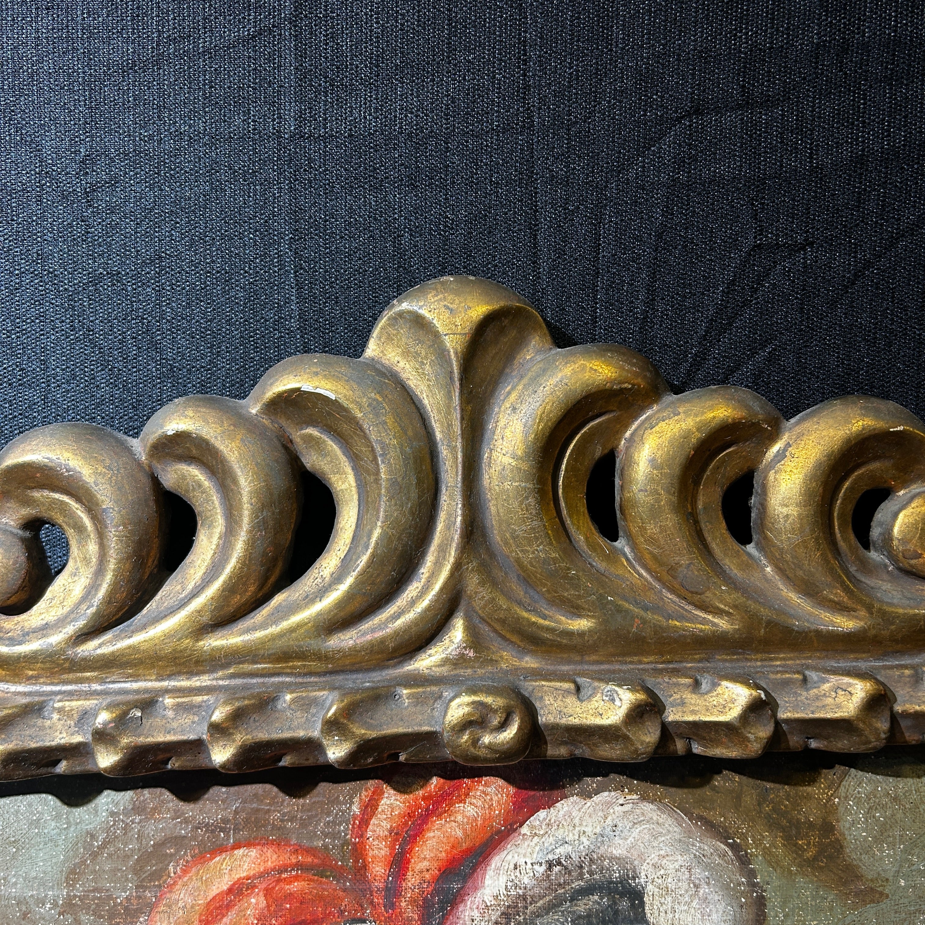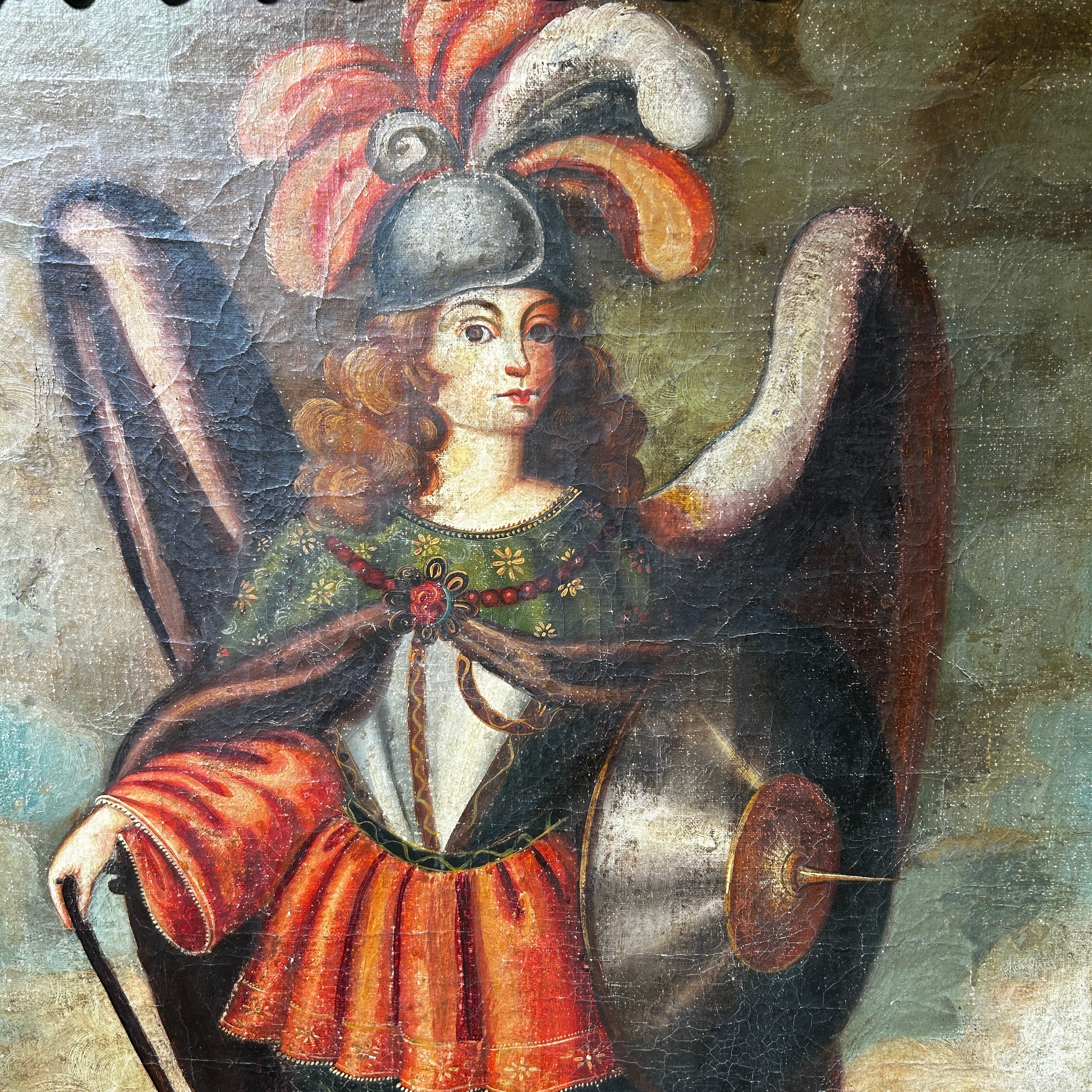 Óleo de la escuela cuzqueña con la figura de San Miguel Arcángel, en su tradicional representación de soldado con armadura, escudo, bastón y casco con plumaje. La sigue una línea similar a otras representaciones de este Santo en la escuela Cuzqueña, pero destaca en la fineza de sus detalles, que le dan textura al paisaje y su vestimenta, llena de detalles borados y brillos en sus telas. La obra tiene un marco de madera tallada en un llamativo y elegante diseño de puntas, terminado en luminoso dorado.