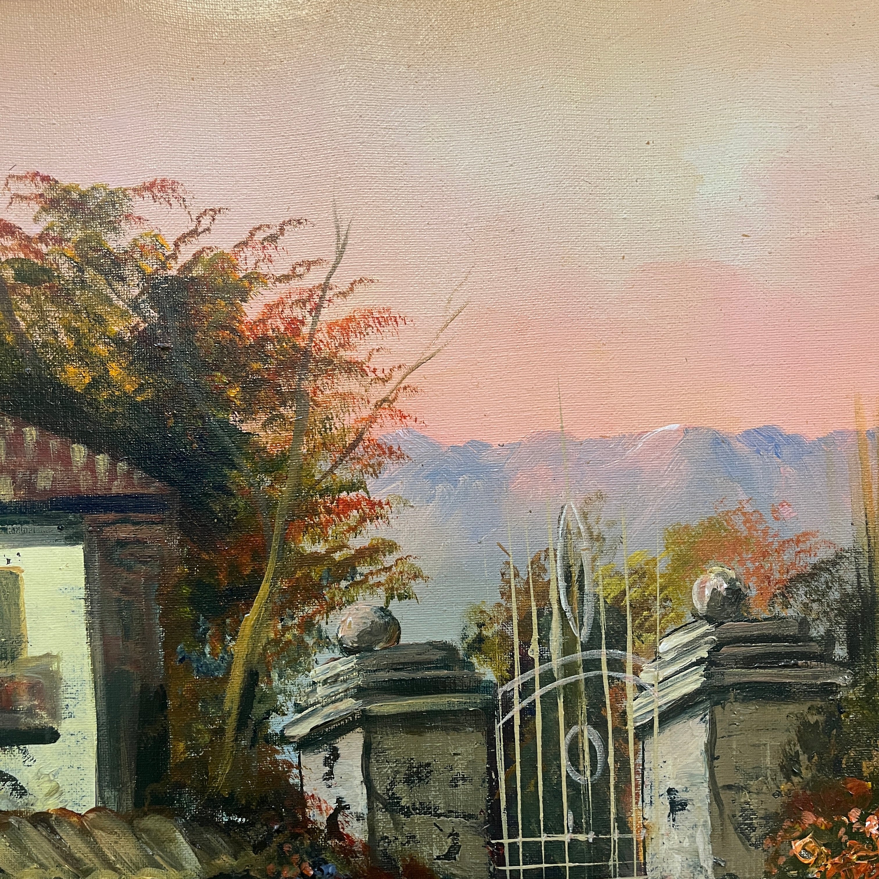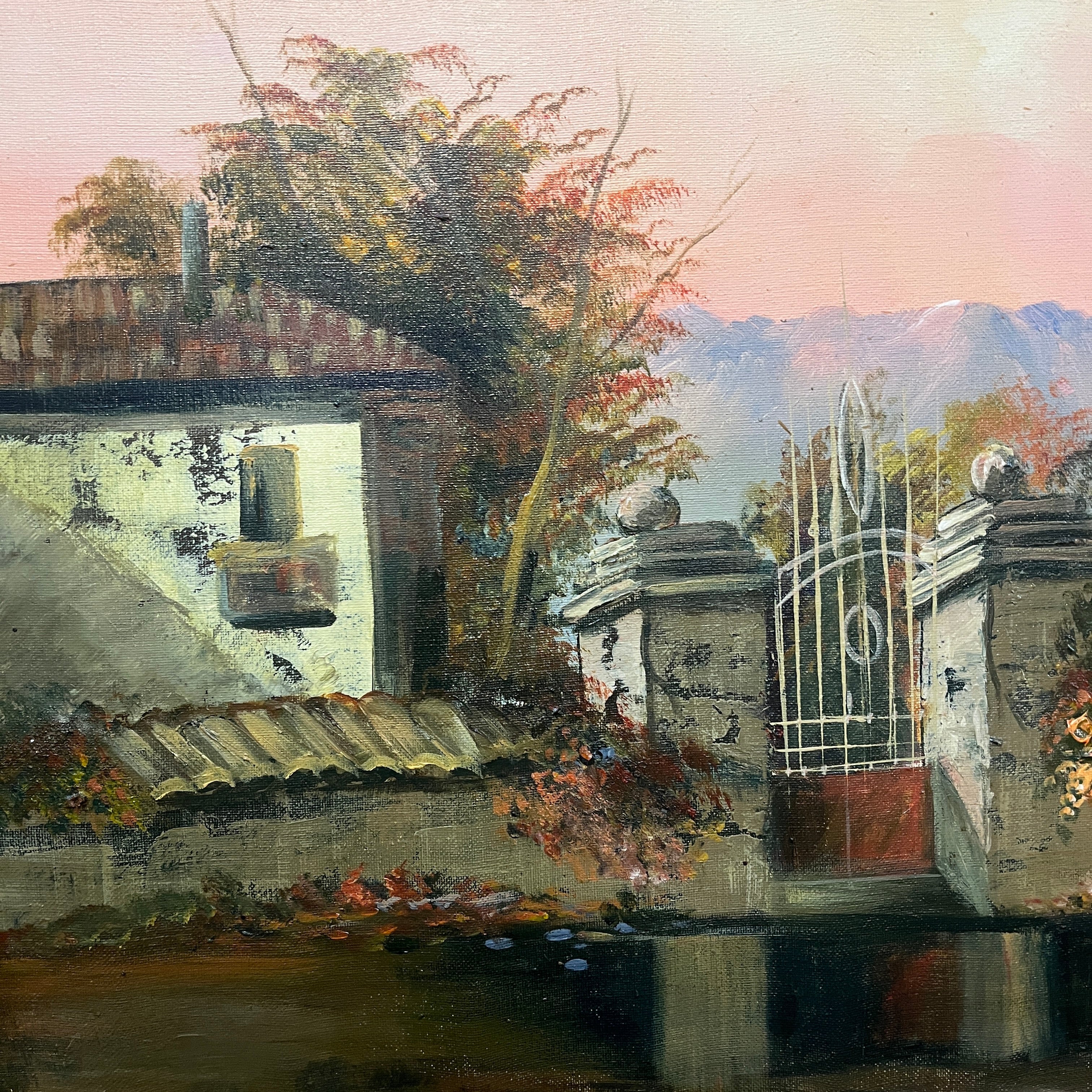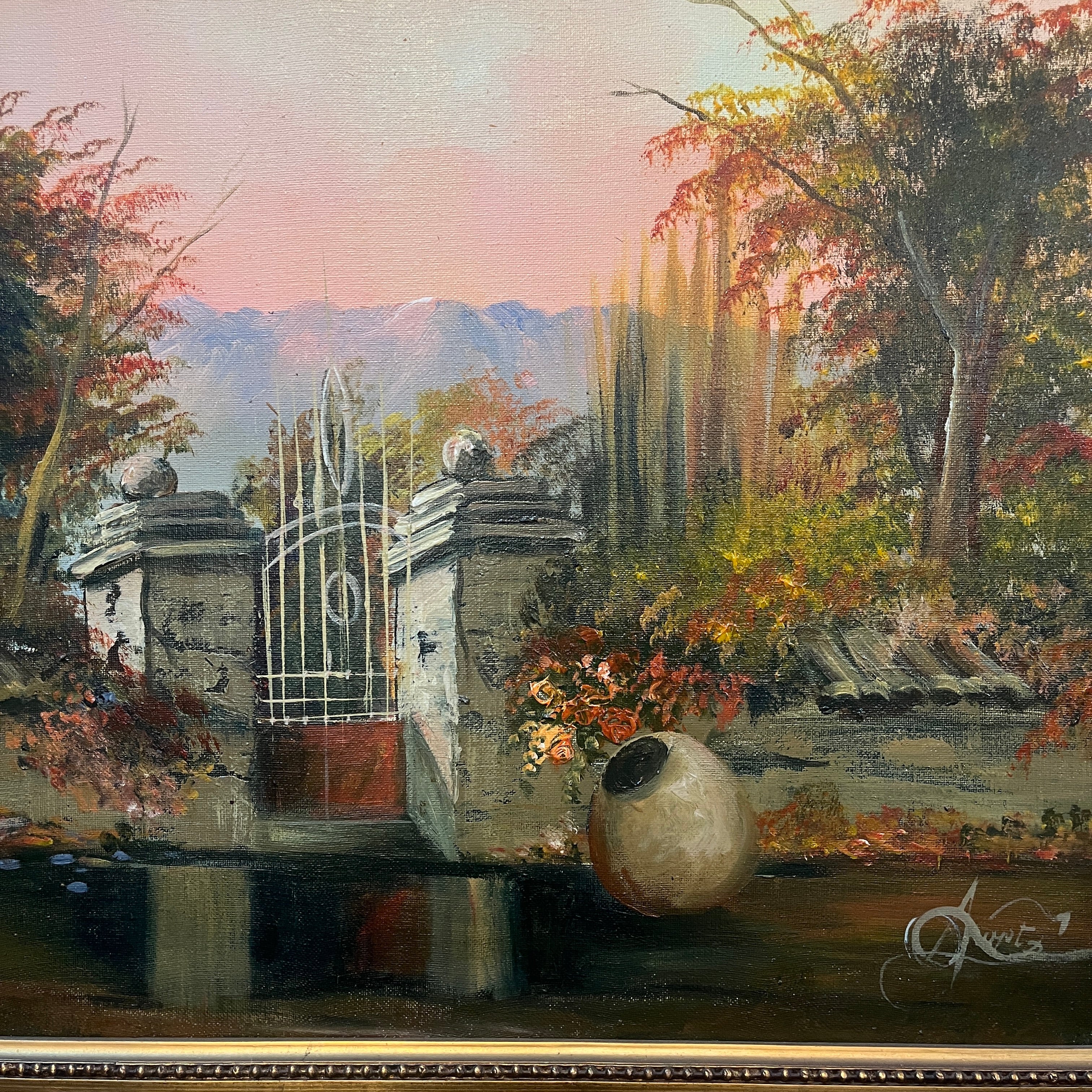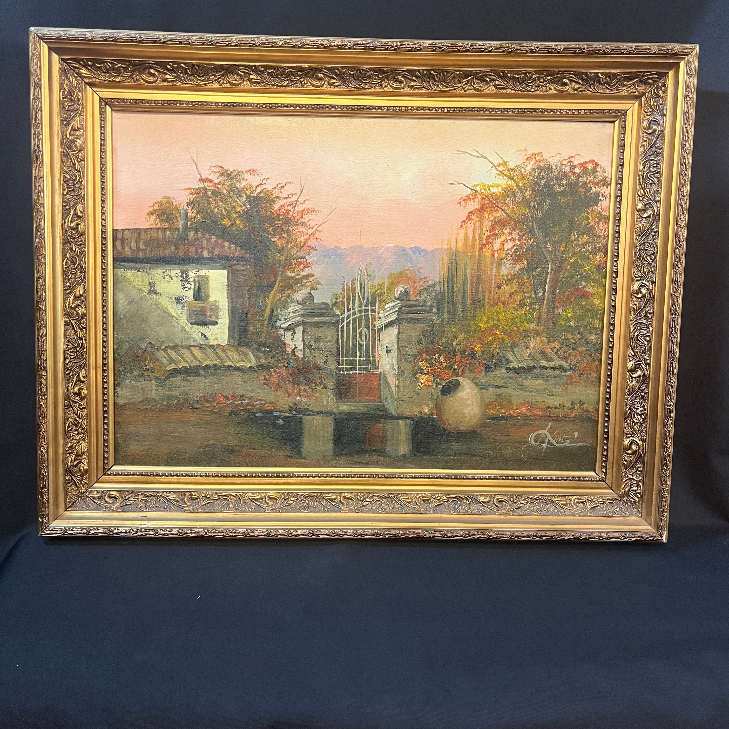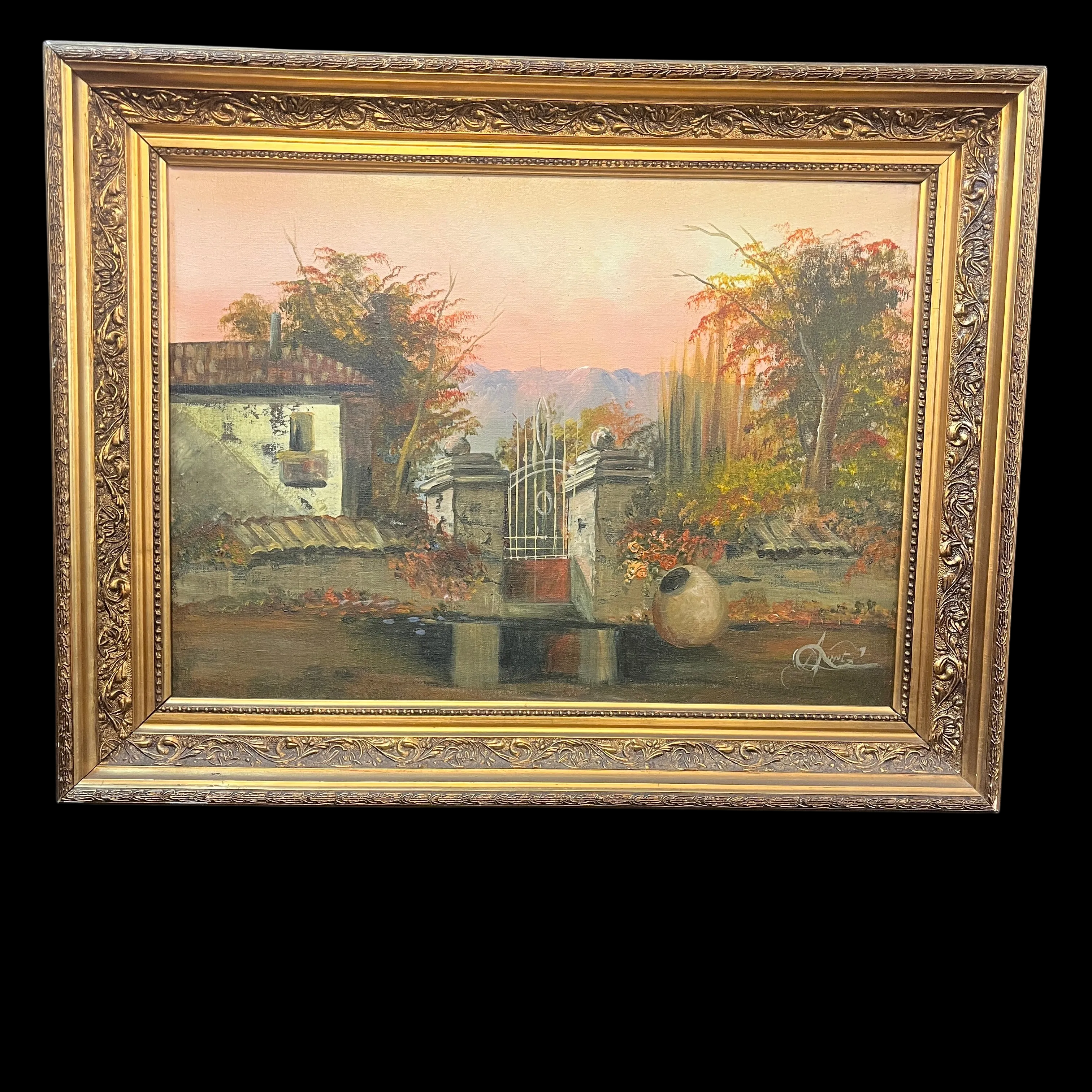 Hermoso paisaje rural de que retrata la fachada de un fundo clásico de la zona centro sur del país al amanecer. La obra destaca por su realismo en los detalles, como es el desgaste en la pintura de la fachada o, las tejas. Fuertes tonos rojizos en el follaje hacen pensar en un amanecer otoñal con árboles que cambian el color de sus hojas antes de caer y el bello reflejo de un charco en la entrada convierten esta pintura en una escena perfecta.