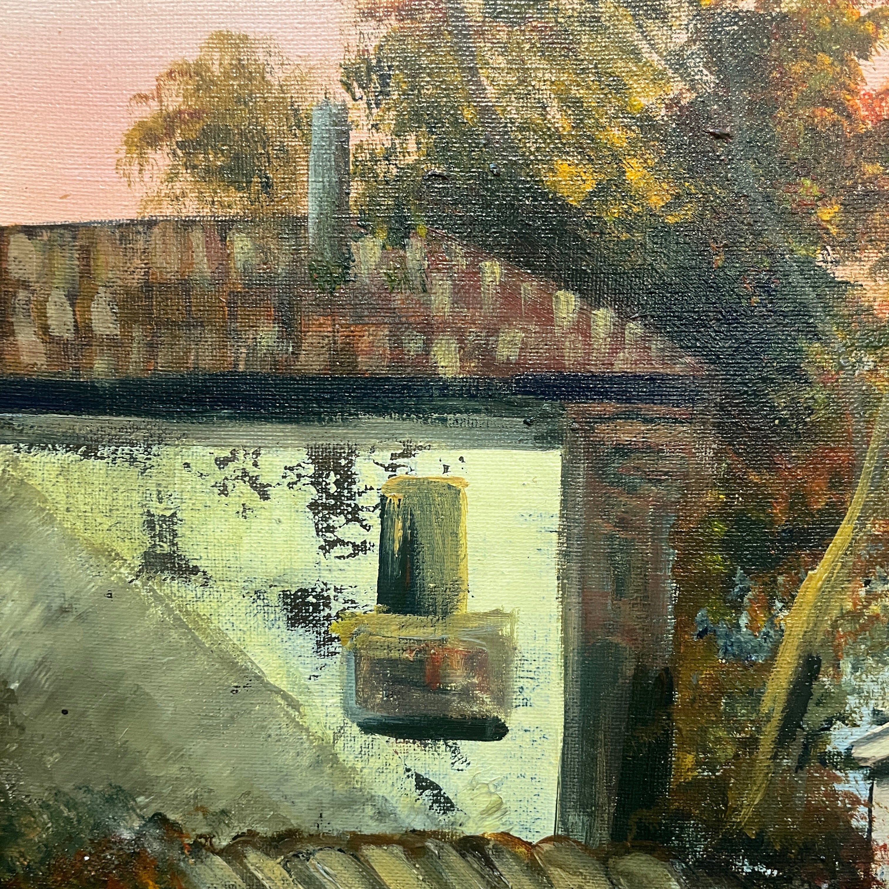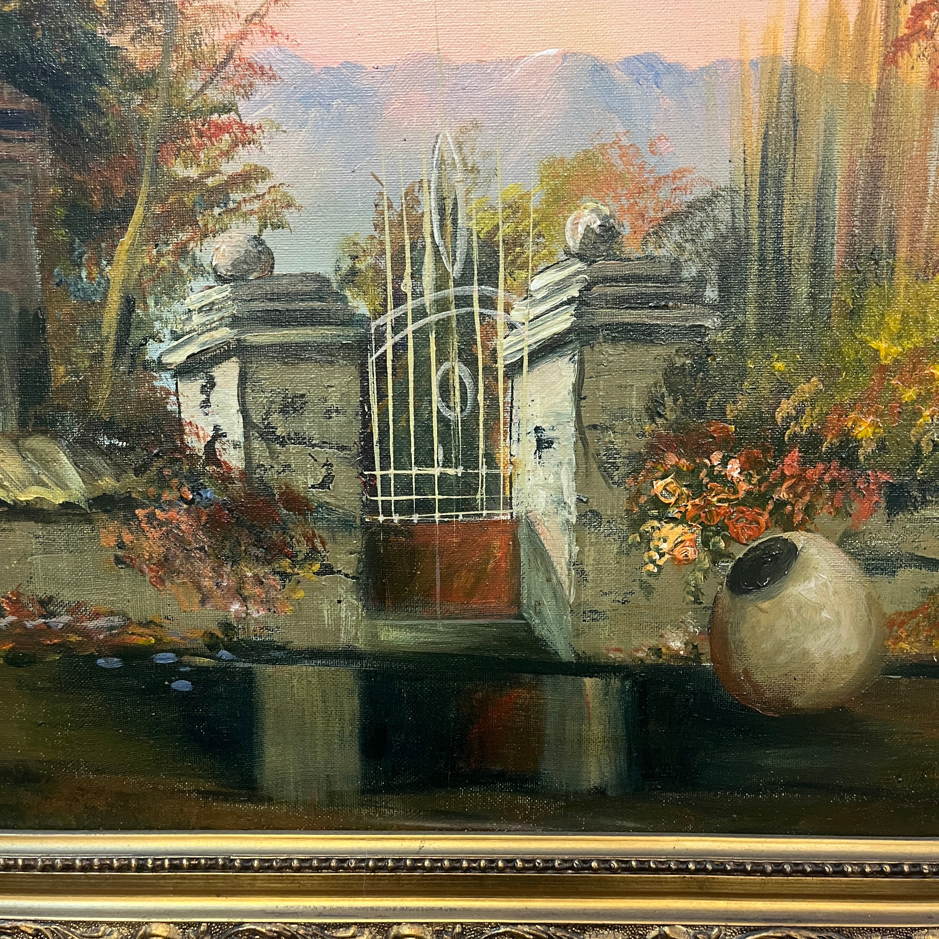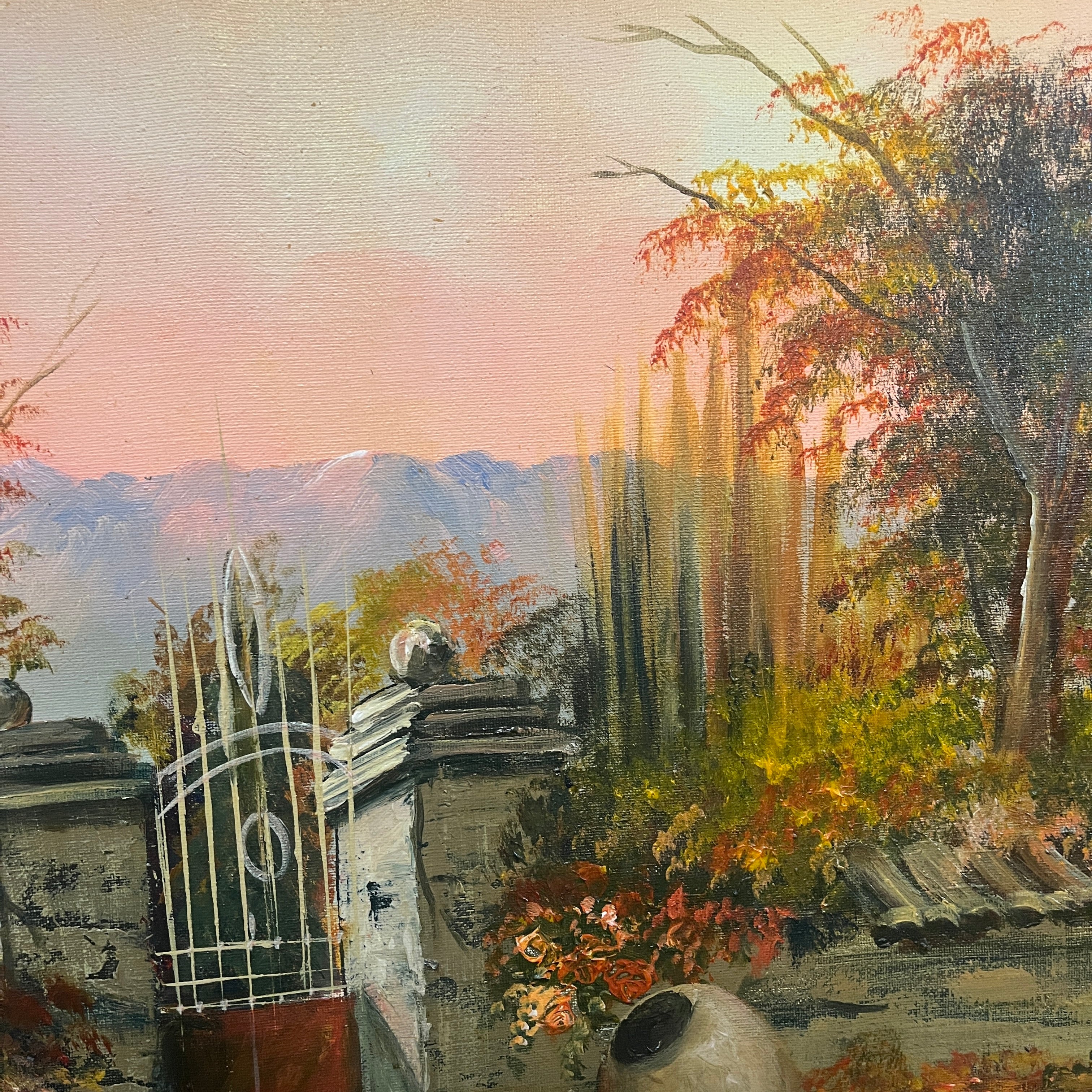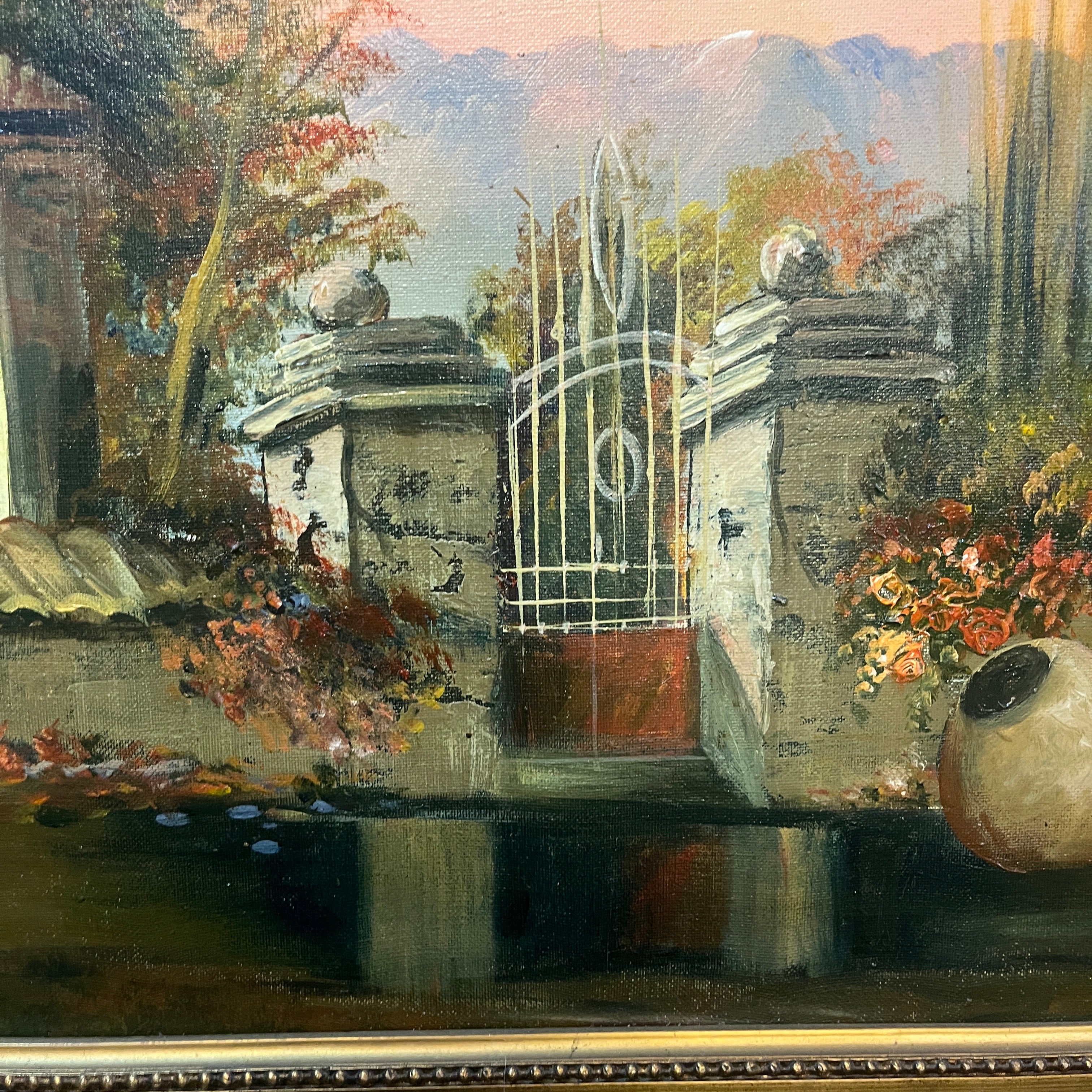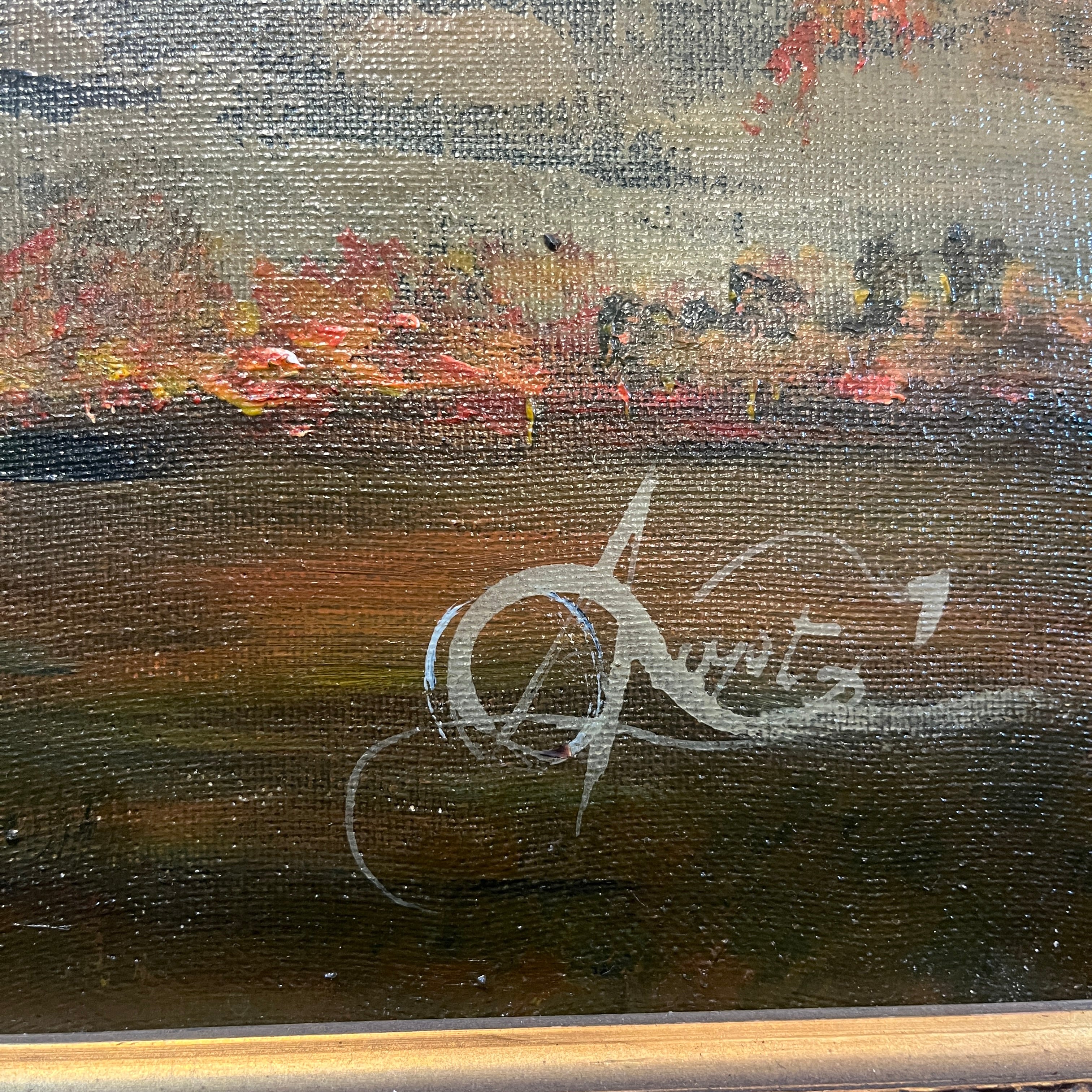 Hermoso paisaje rural de que retrata la fachada de un fundo clásico de la zona centro sur del país al amanecer. La obra destaca por su realismo en los detalles, como es el desgaste en la pintura de la fachada o, las tejas. Fuertes tonos rojizos en el follaje hacen pensar en un amanecer otoñal con árboles que cambian el color de sus hojas antes de caer y el bello reflejo de un charco en la entrada convierten esta pintura en una escena perfecta.