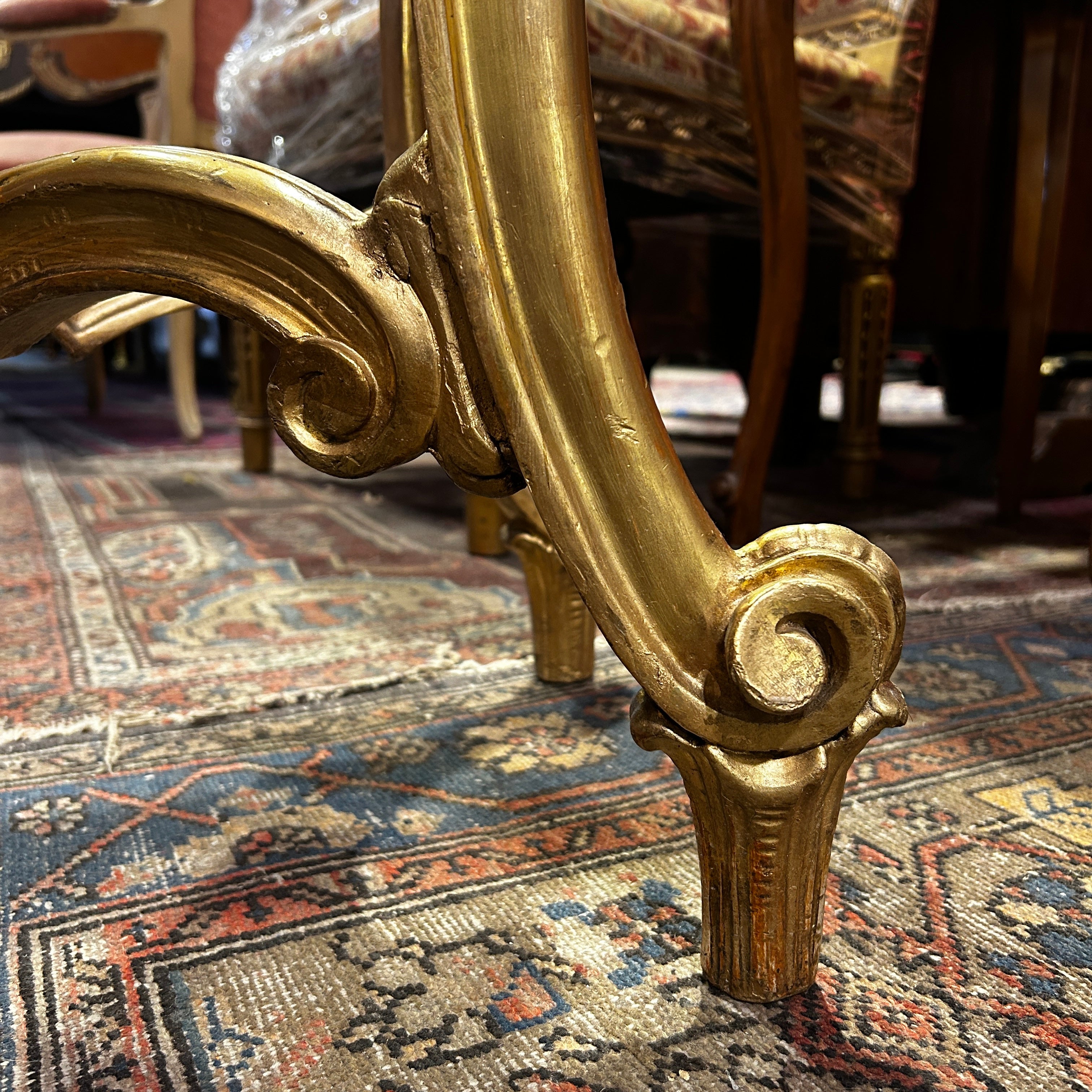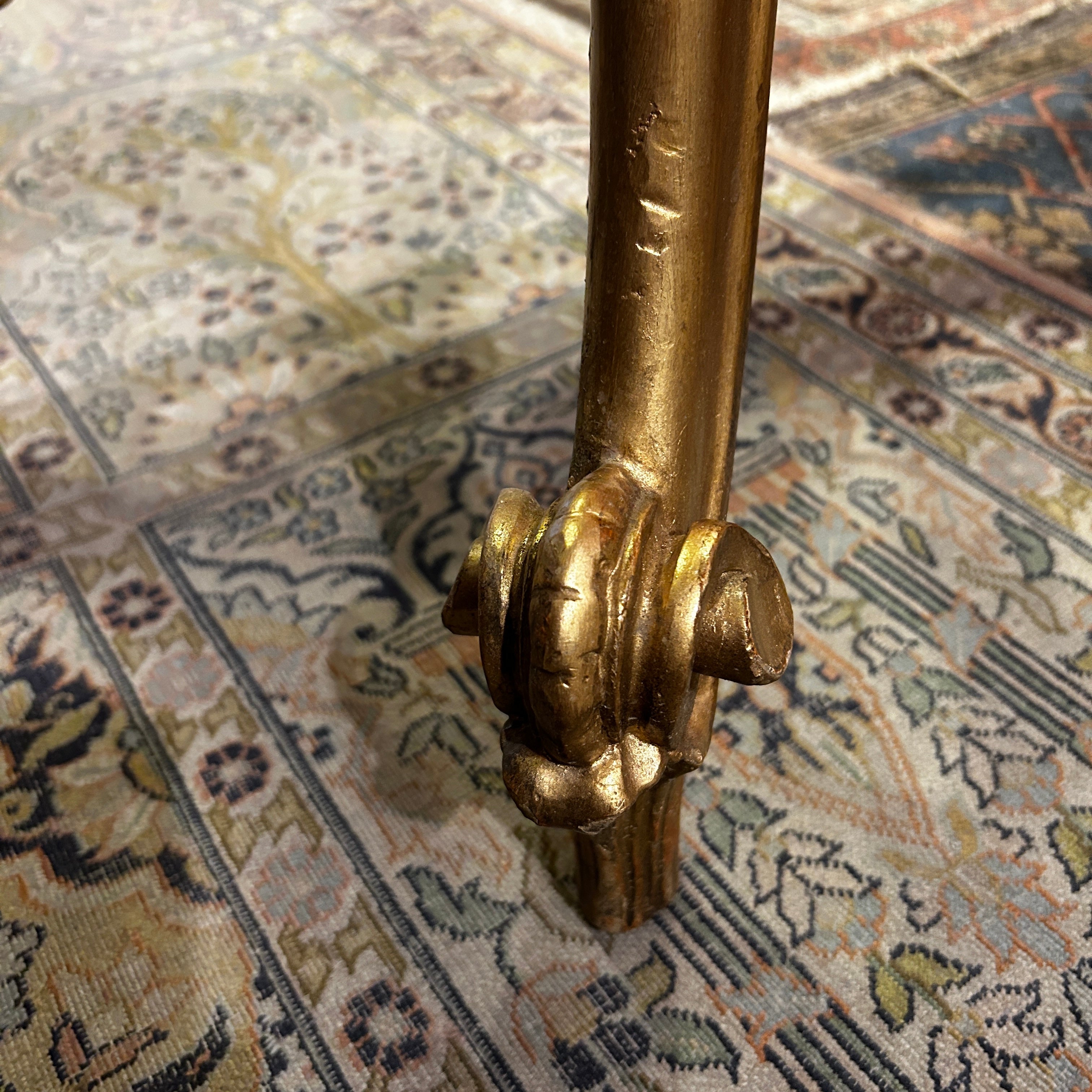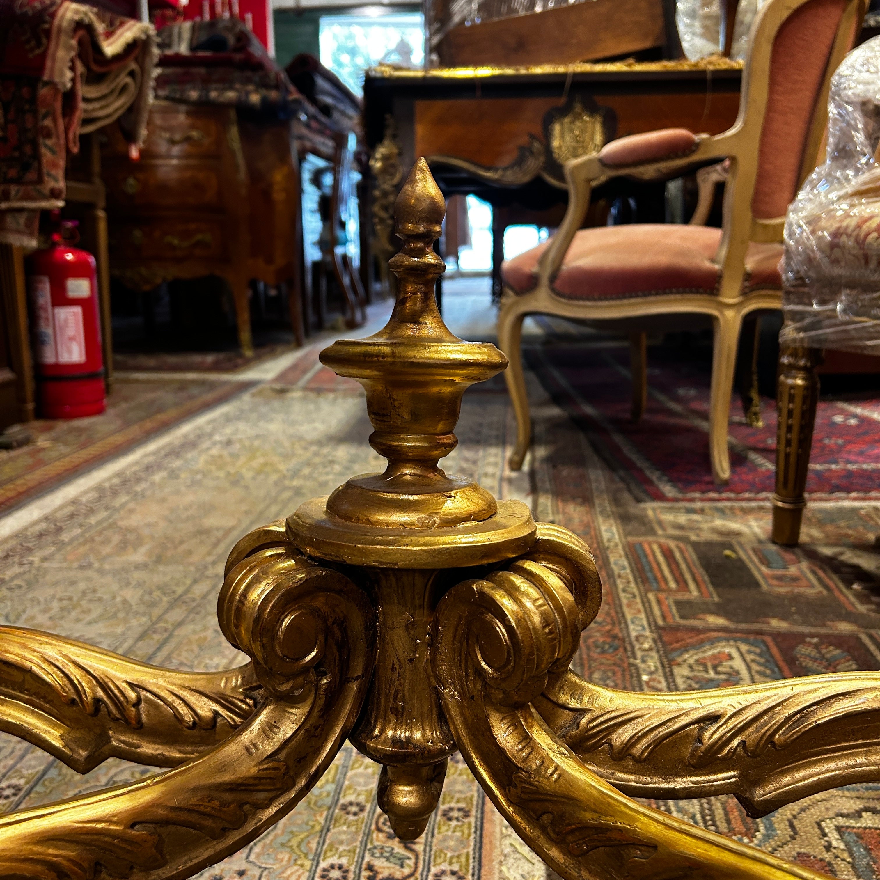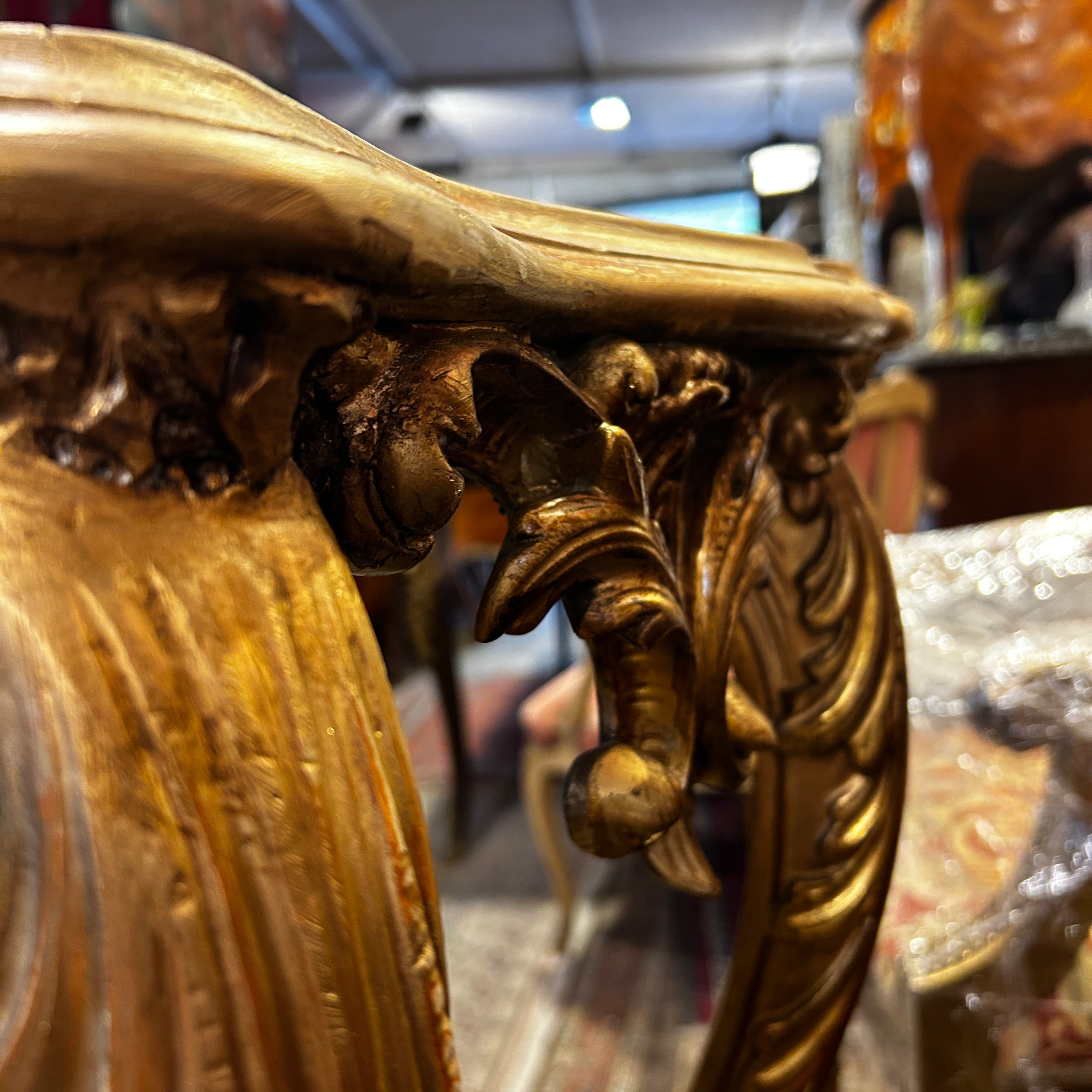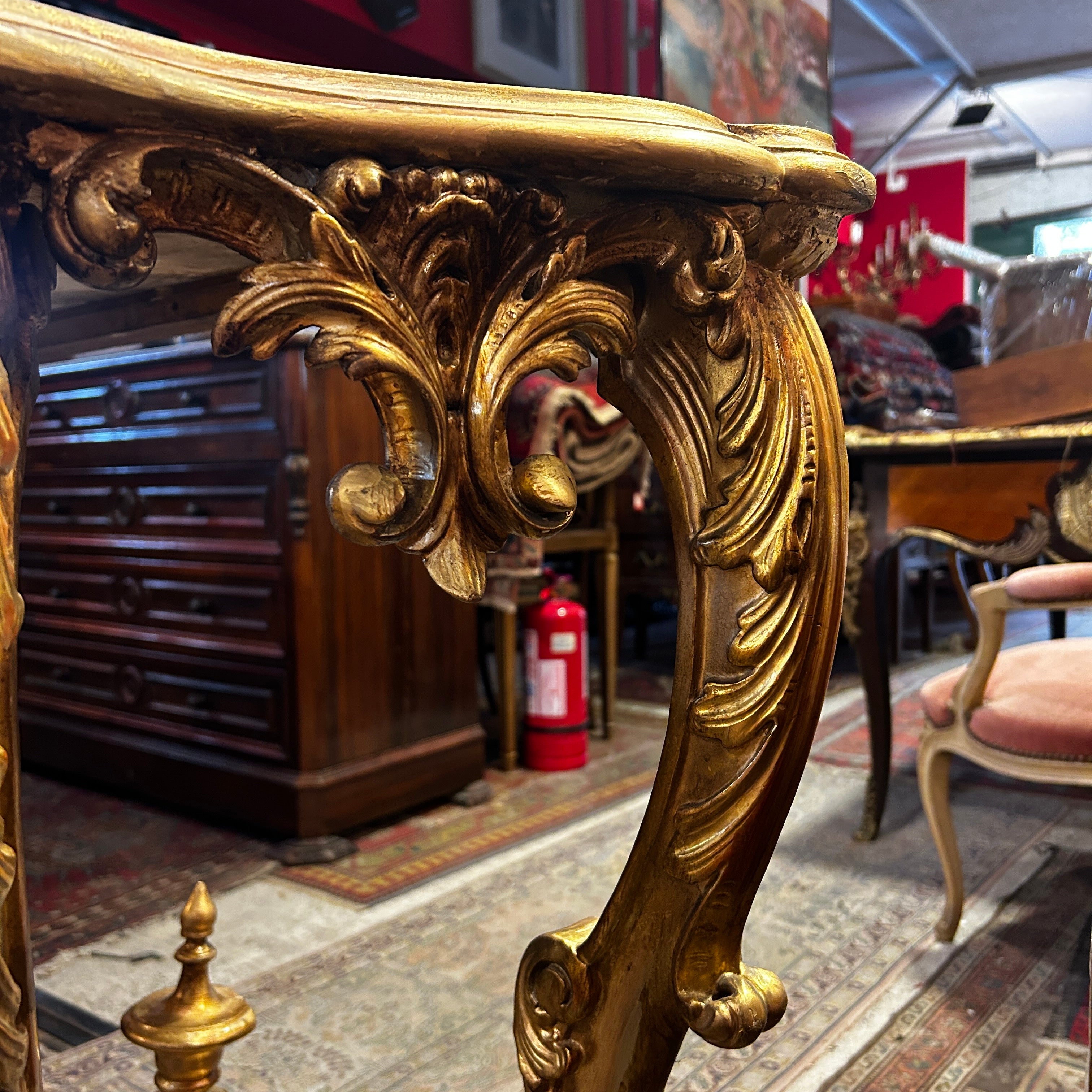 Precioso arrimo de madera dorada retocada estilo Luis XV con superficie de mármol de alepo original. Posee un delicado calado frontal y lateral con detalles florales. Posee un copón central y cruceta de cuatro brazos.