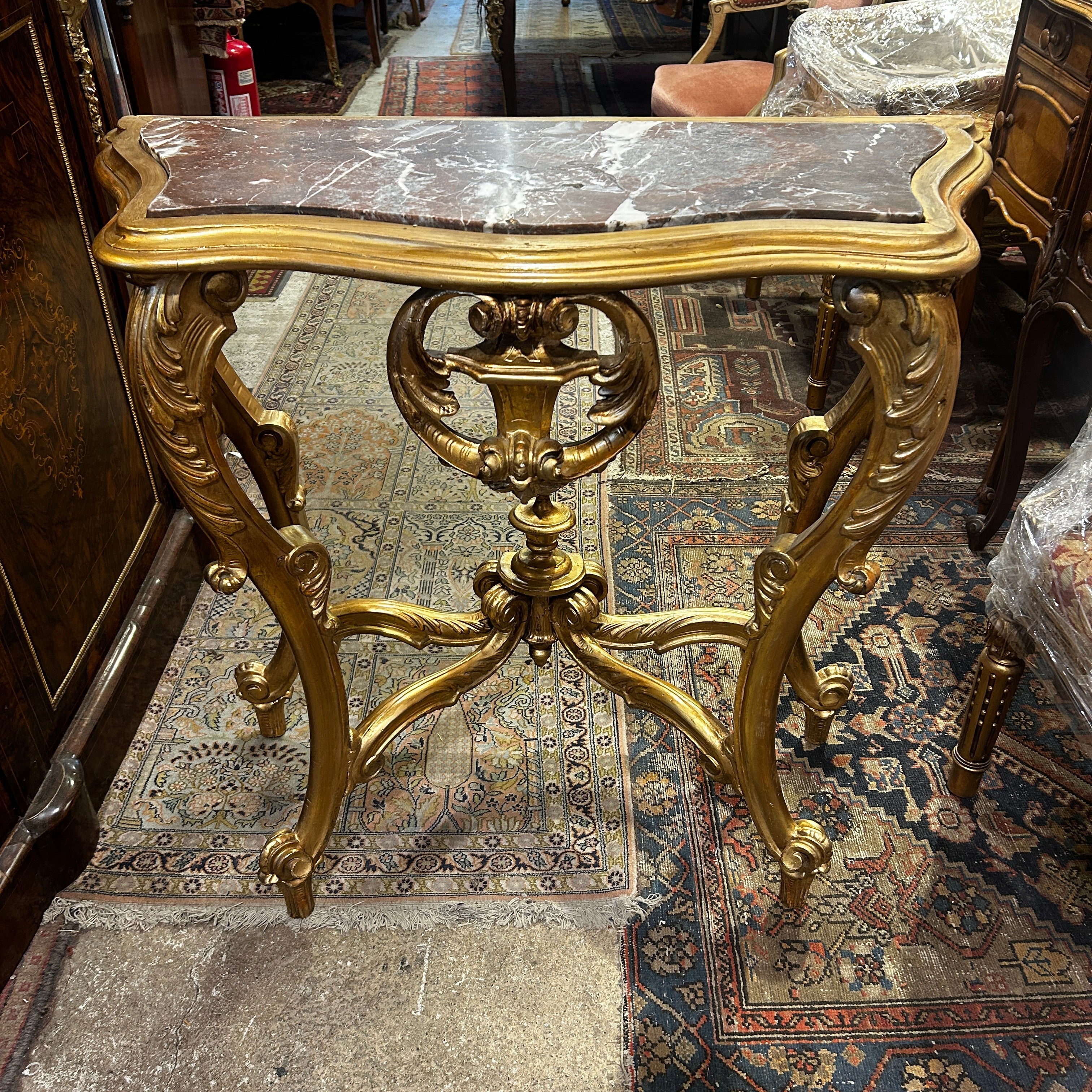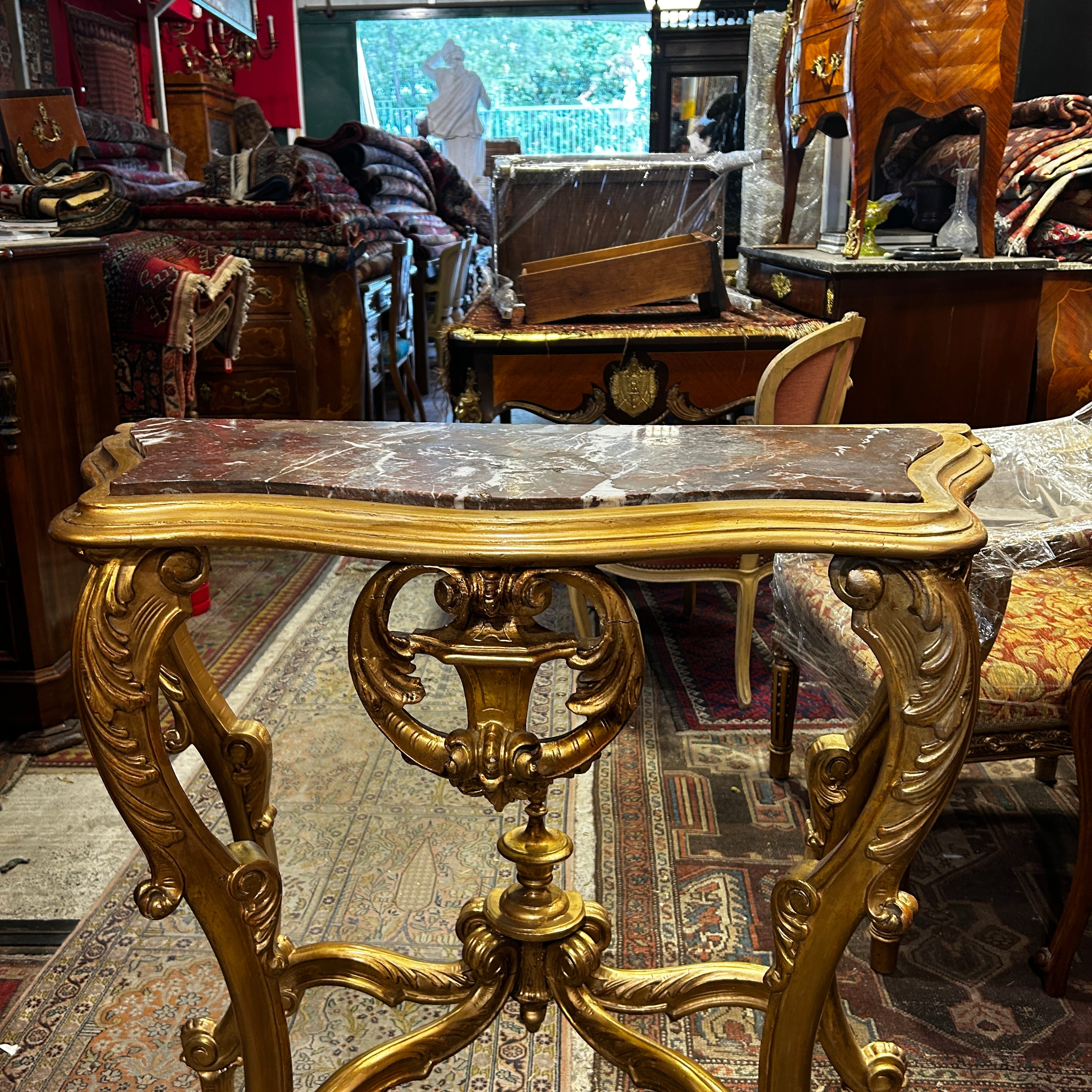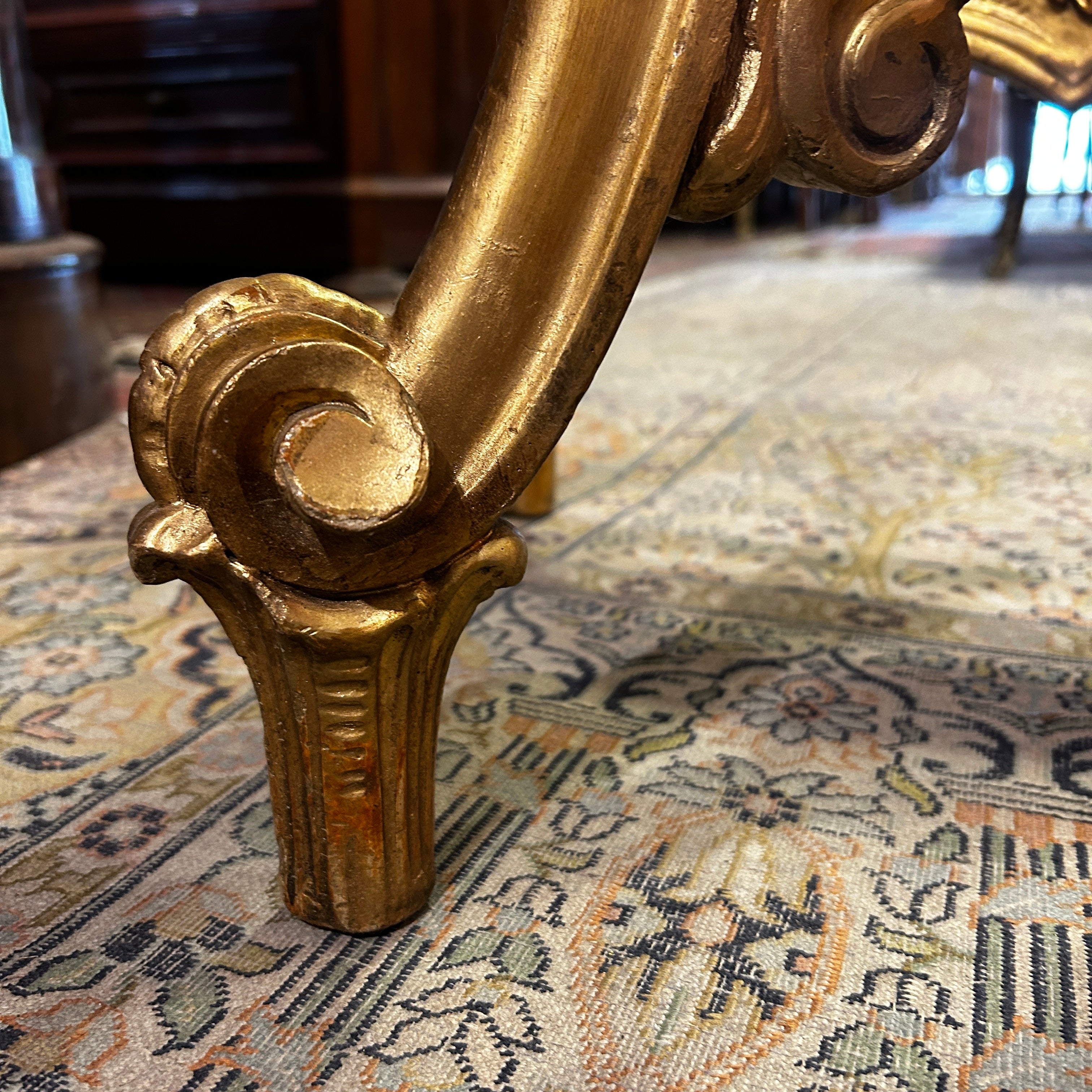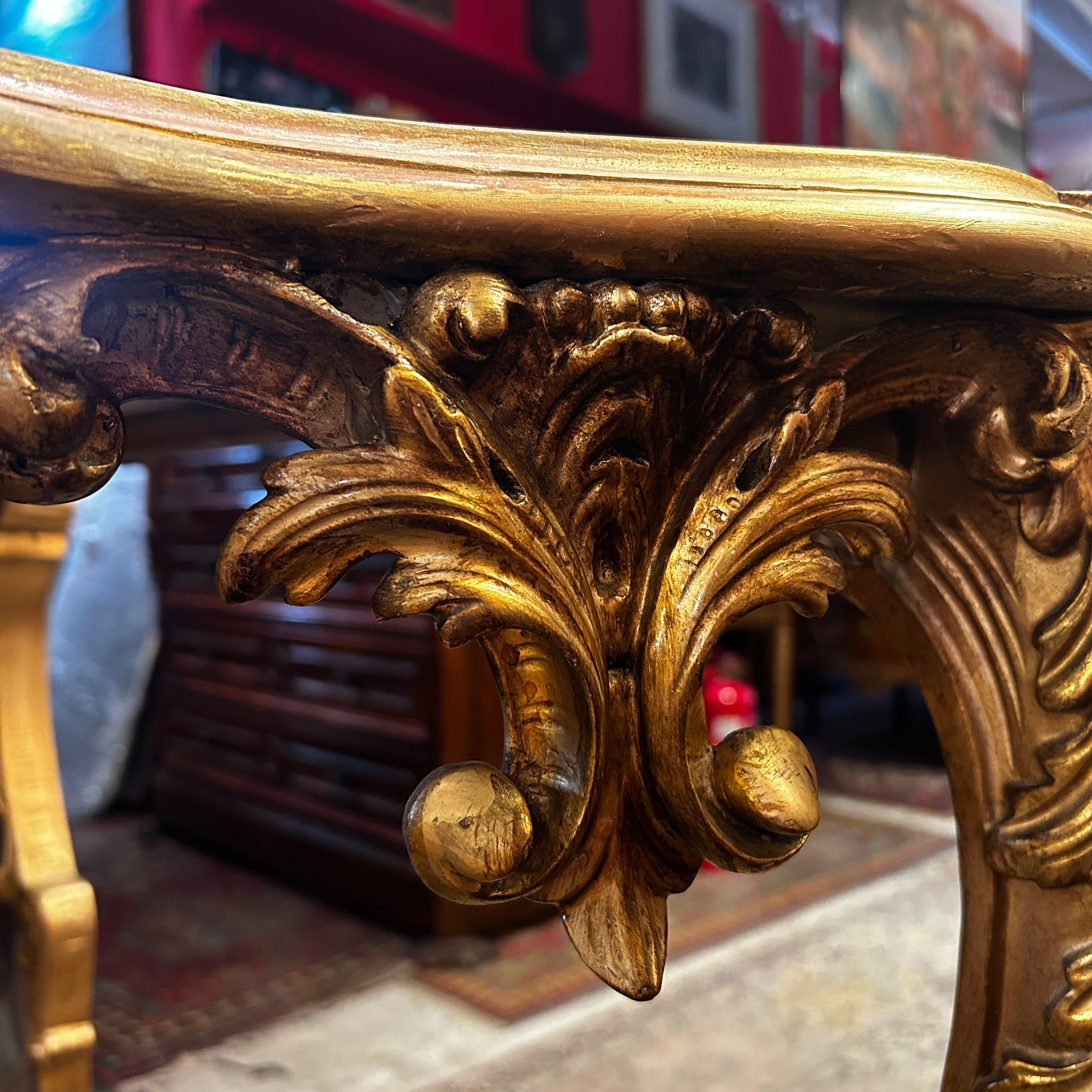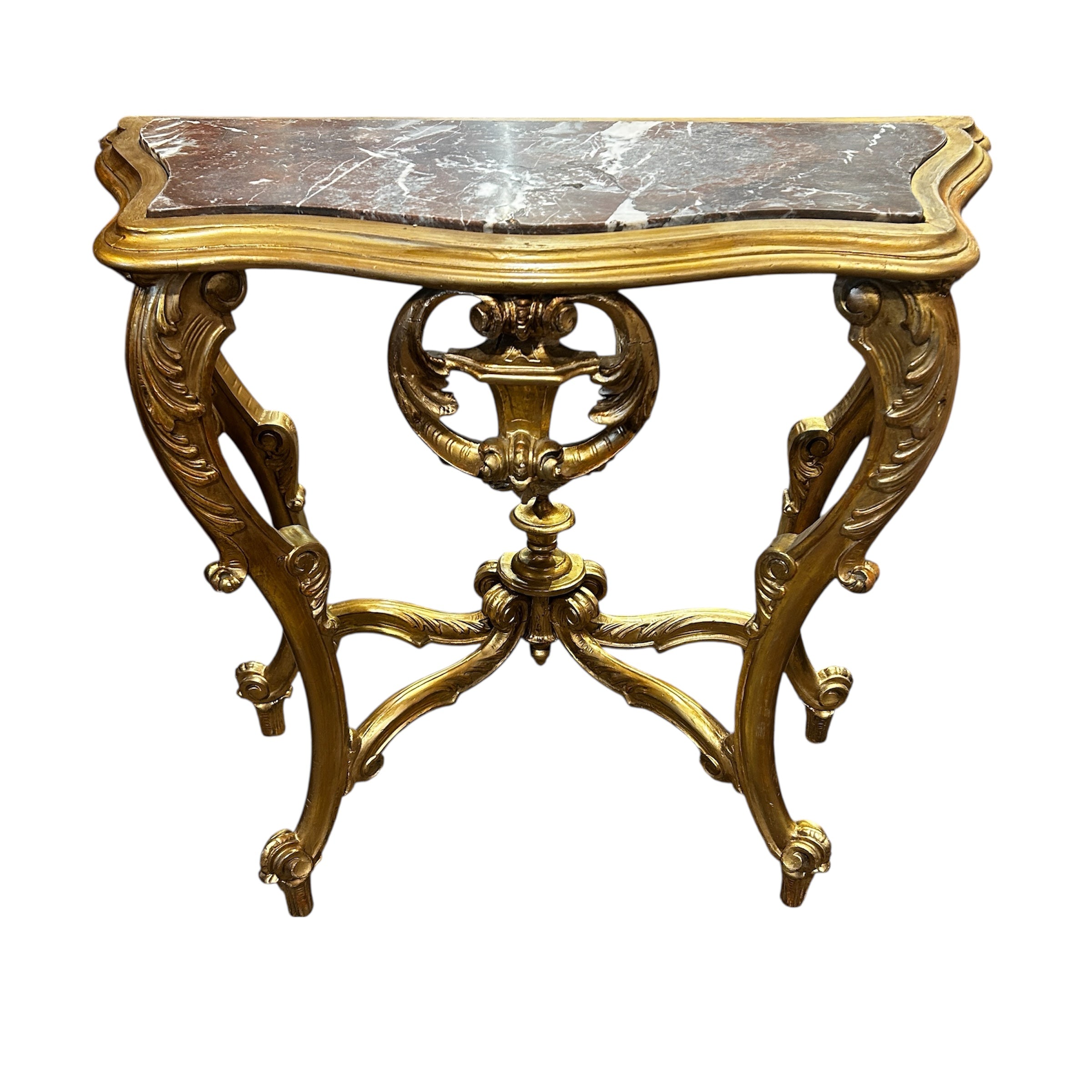 Precioso arrimo de madera dorada retocada estilo Luis XV con superficie de mármol de alepo original. Posee un delicado calado frontal y lateral con detalles florales. Posee un copón central y cruceta de cuatro brazos.