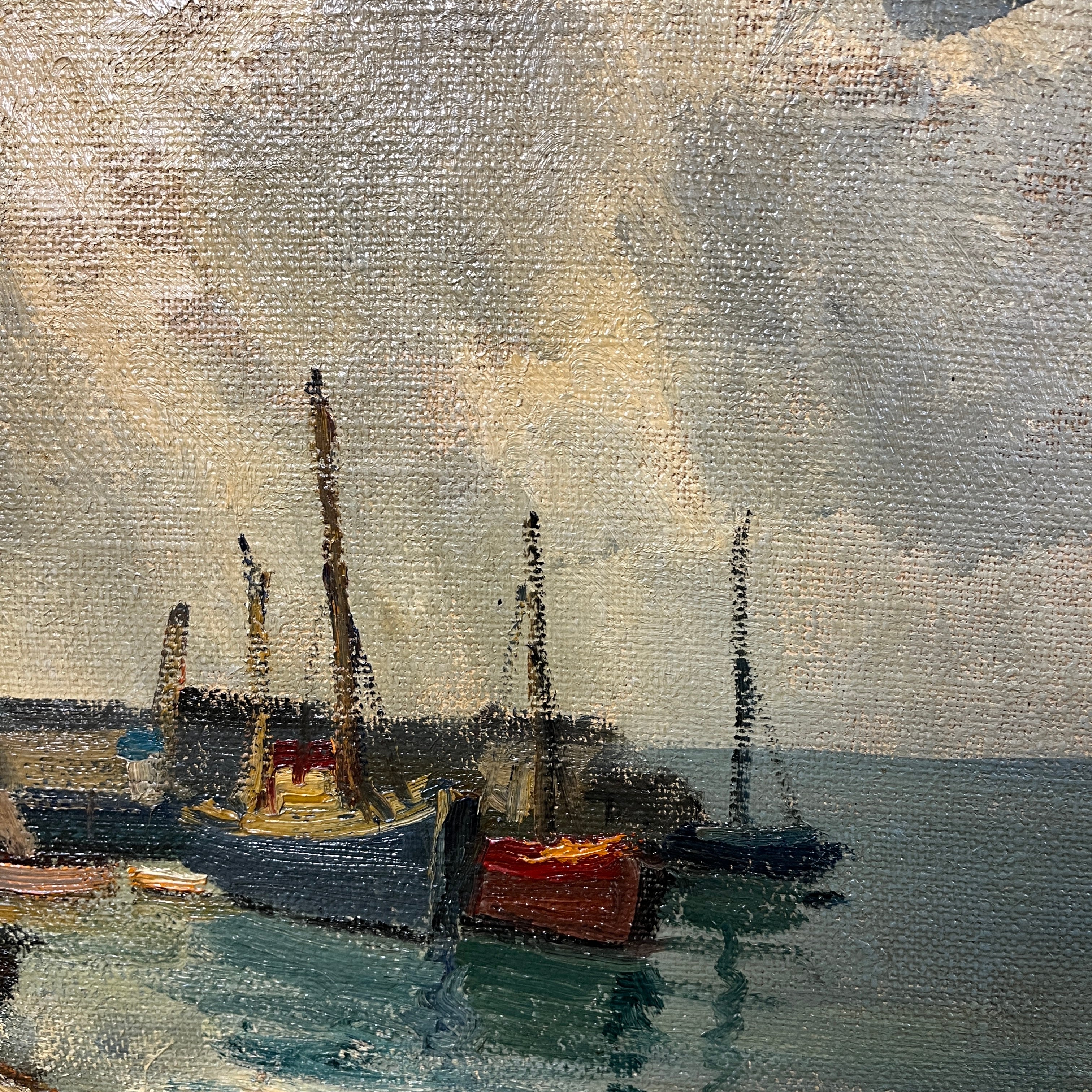 Sobrecogedora pintura del talentoso pintor chileno Pacheco Altamirano, donde podemos apreciar un muelle con embarcaciones ancladas y pescadores trabajando dentro de sus botes.
