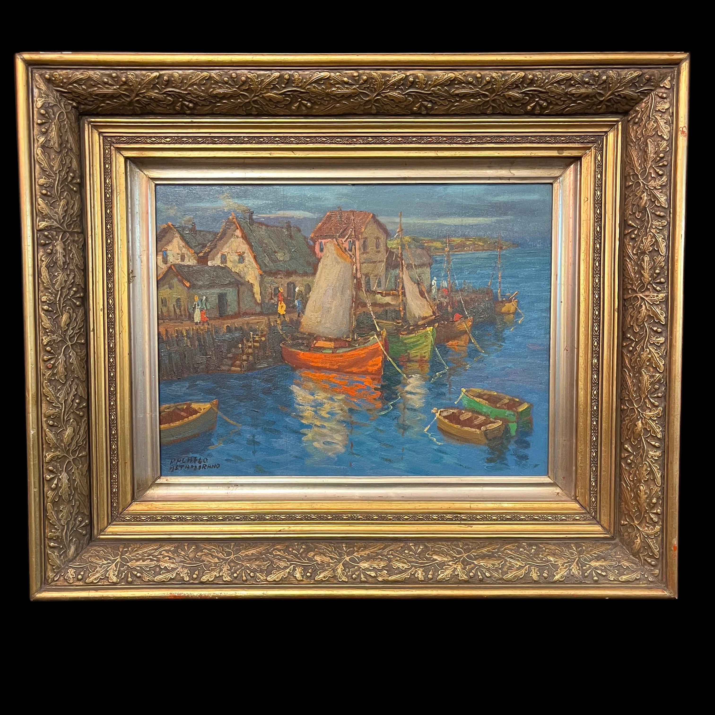 Llamativo óleo del artista chileno Pacheco Altamirano, retratando su amado sur. Un pequeño pueblo junto al muelle, con sus veleros fondeados en el mar. La pintura destaca por sus tonos intensos, los cuales entregan una vitalidad especial a la obra.