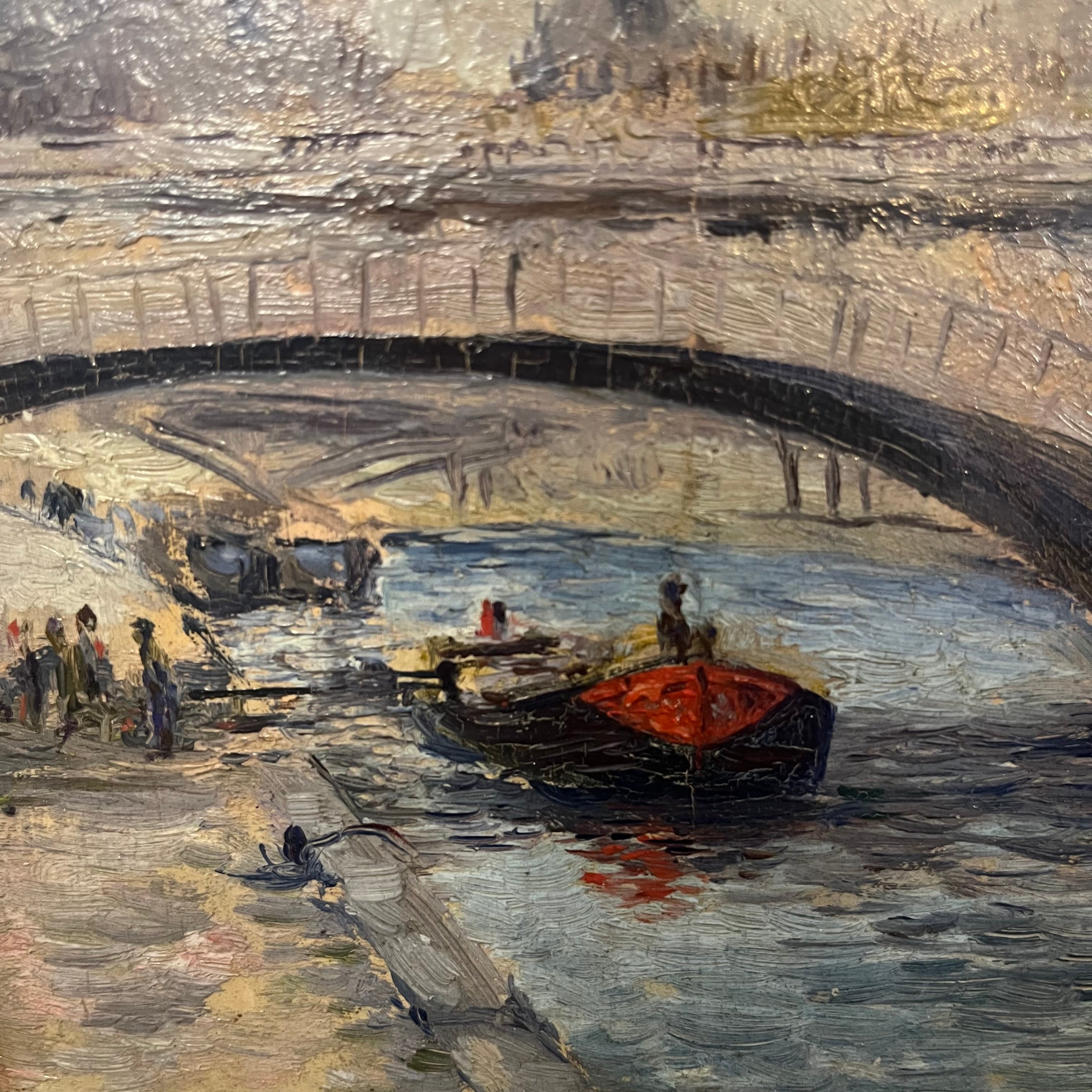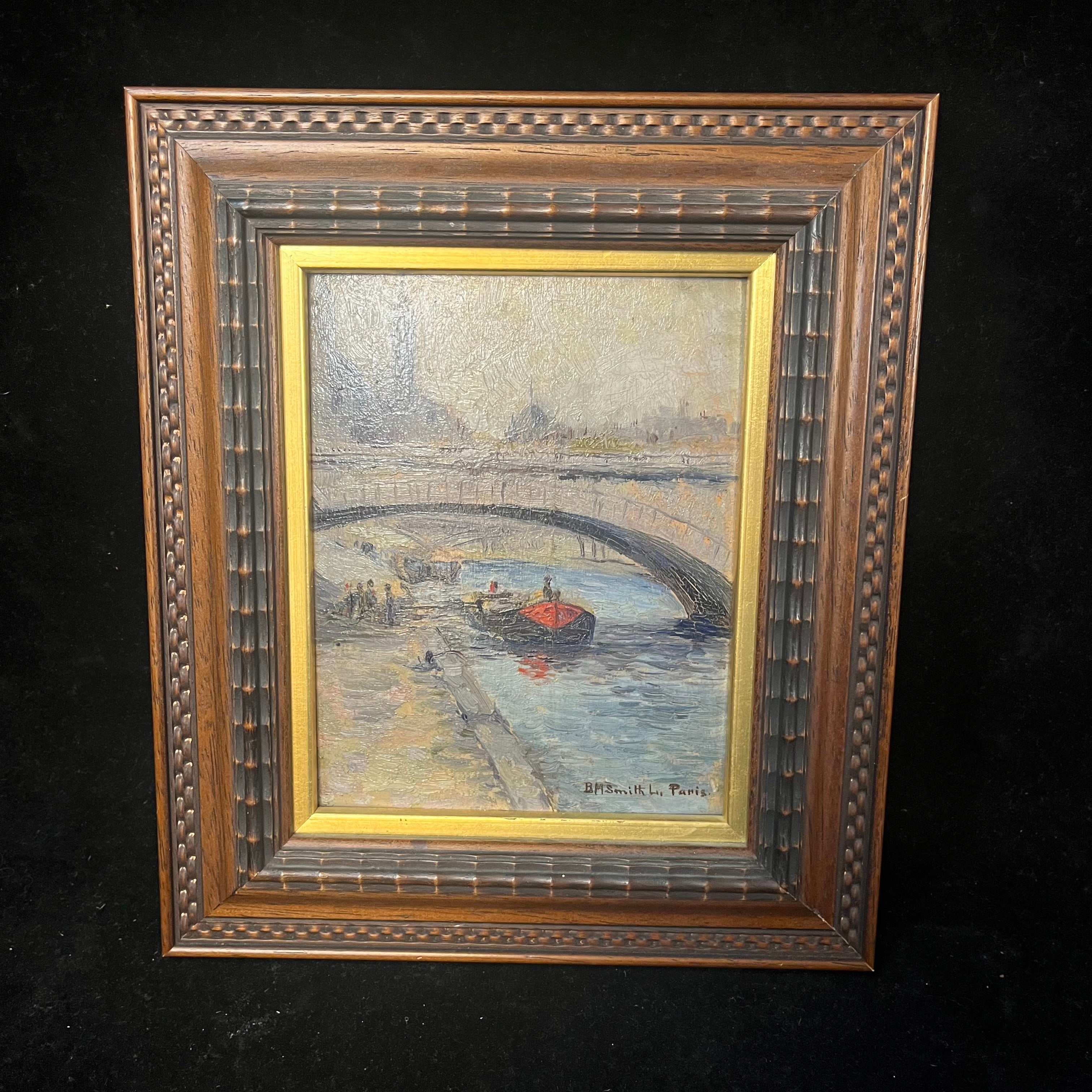 Óleo sobre madera de origen francés, firmado por B. M Smith, representando un bello paisaje parisino del río Sena. Se ven algunos personajes caminando y botes cruzando por debajo de uno de los tantos puentes de la ciudad de las luces. La obra tiene un marco de madera tallada con un borde interior en dorado, que ilumina la obra.