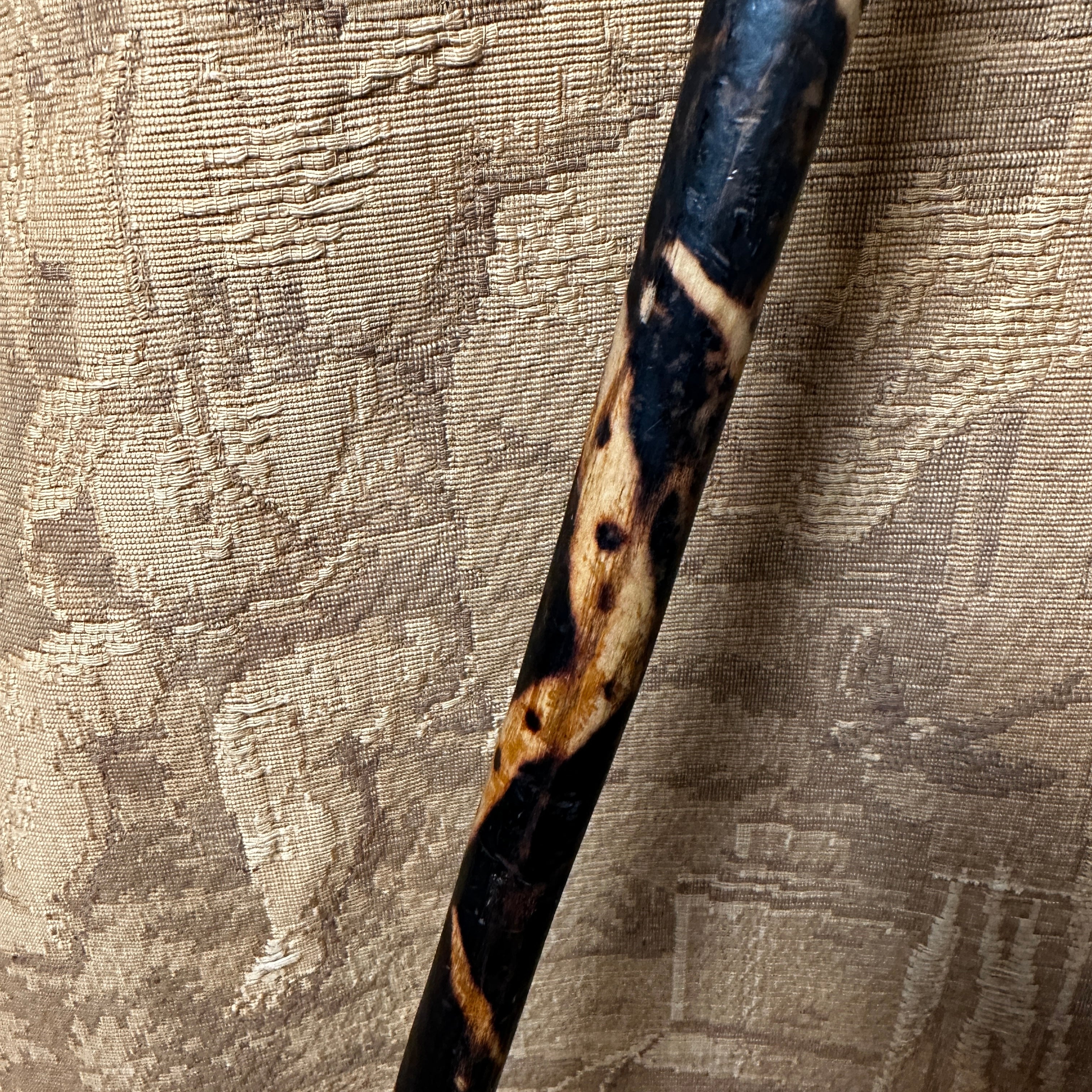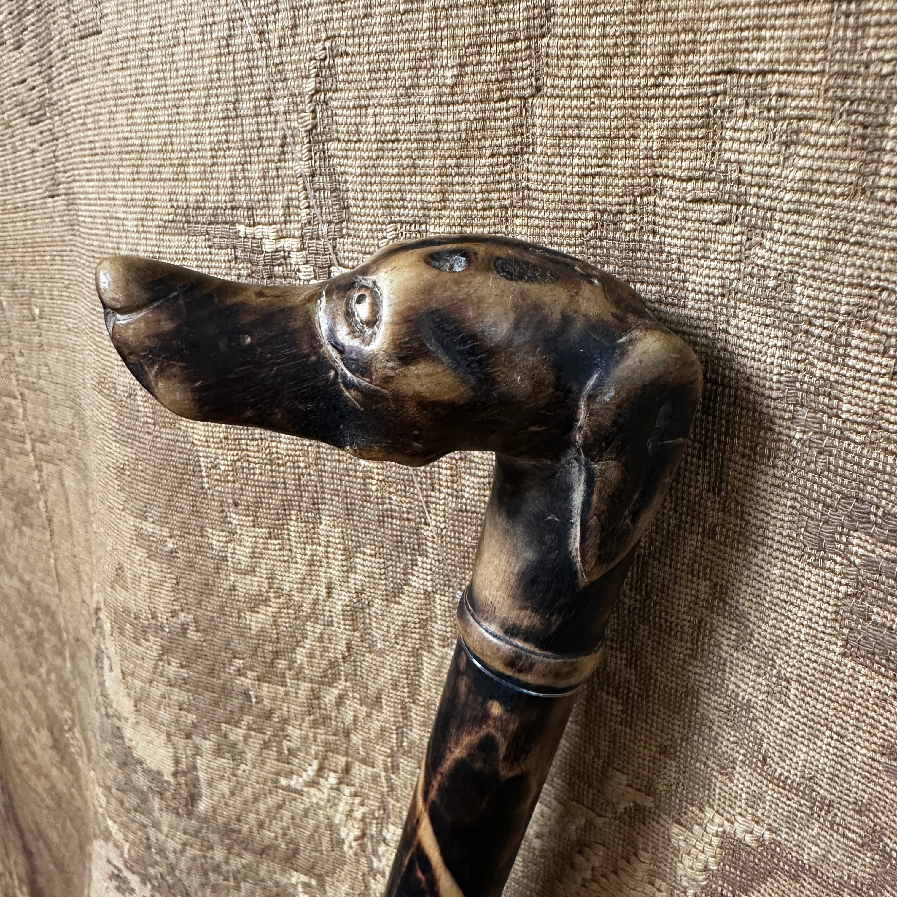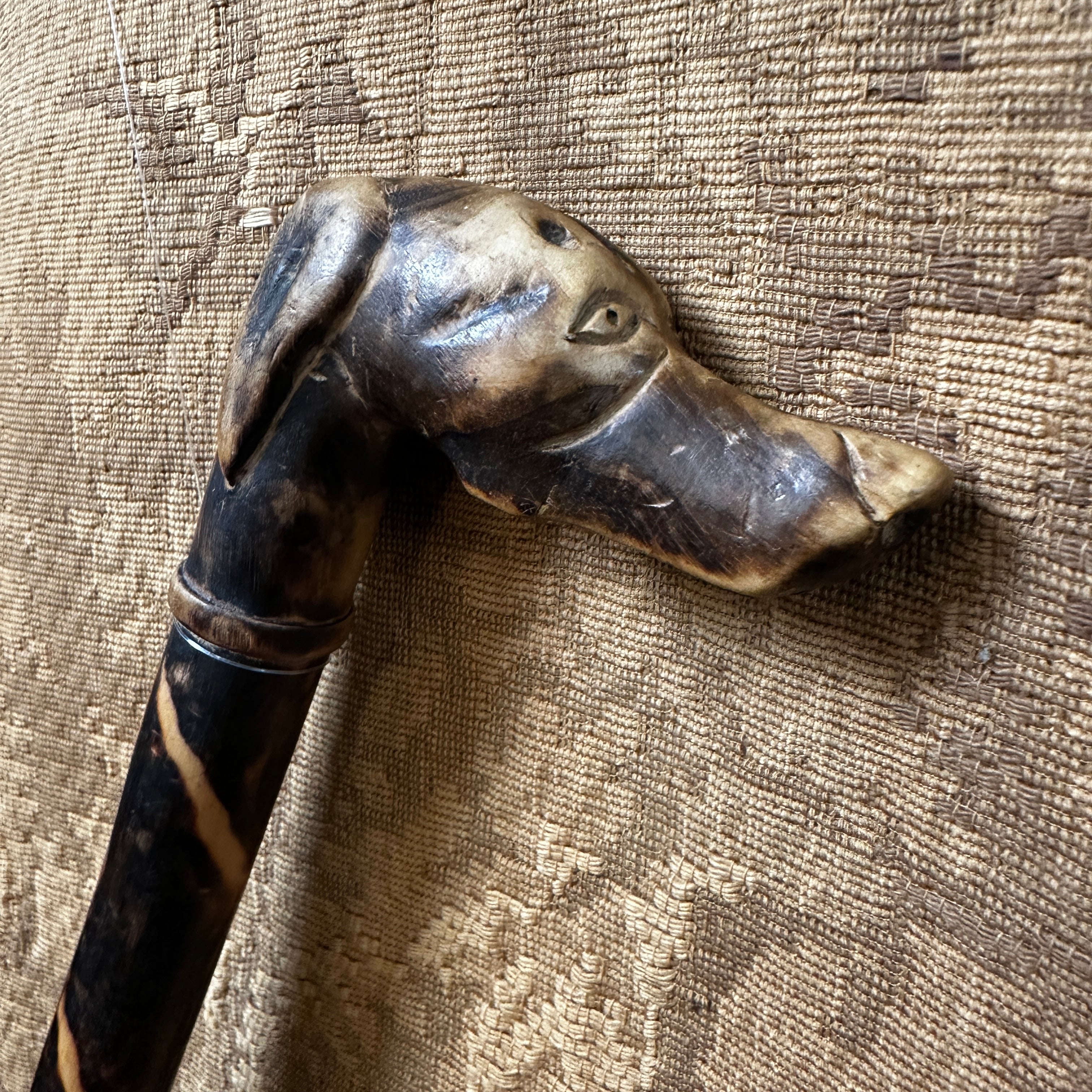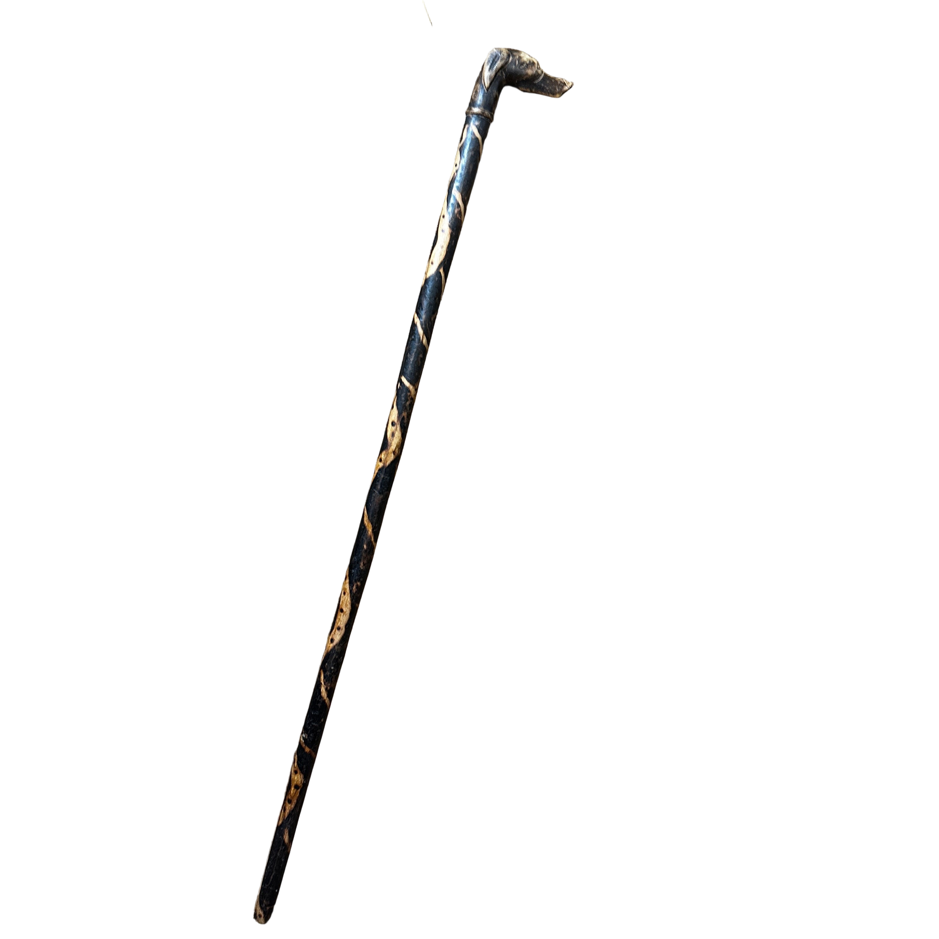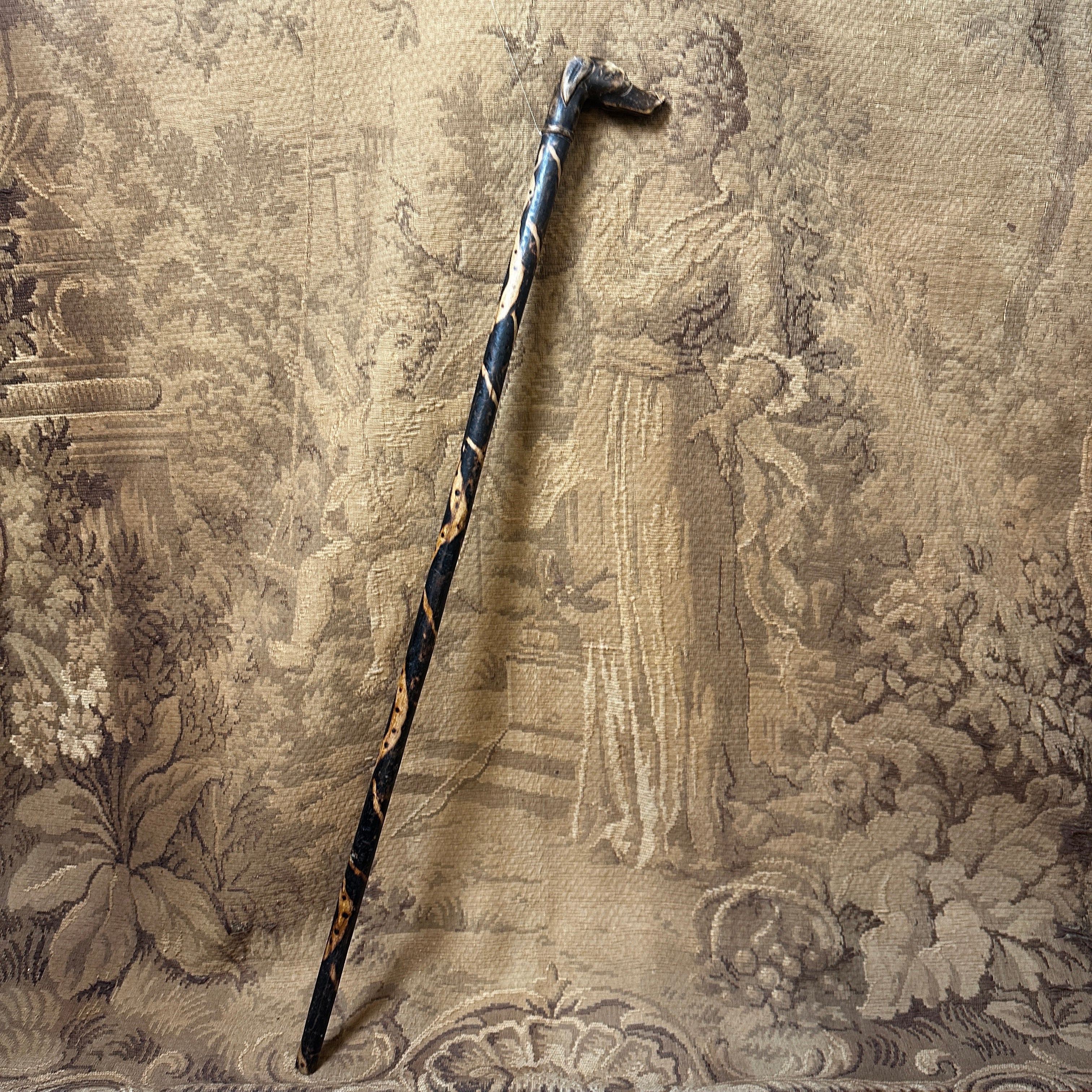 Vistoso bastón de madera carbonizado diseño serpenteante con empuñadura en forma de perro.