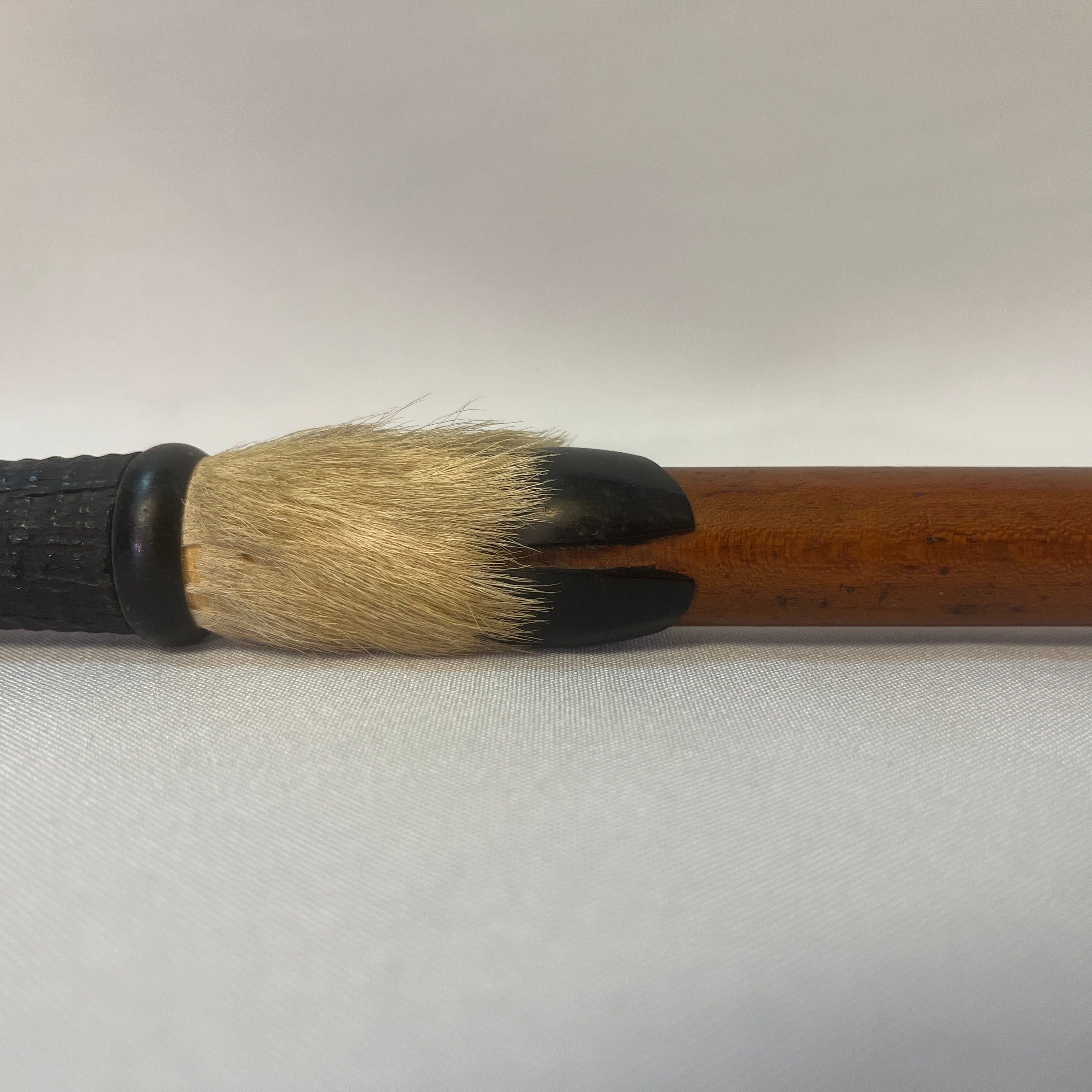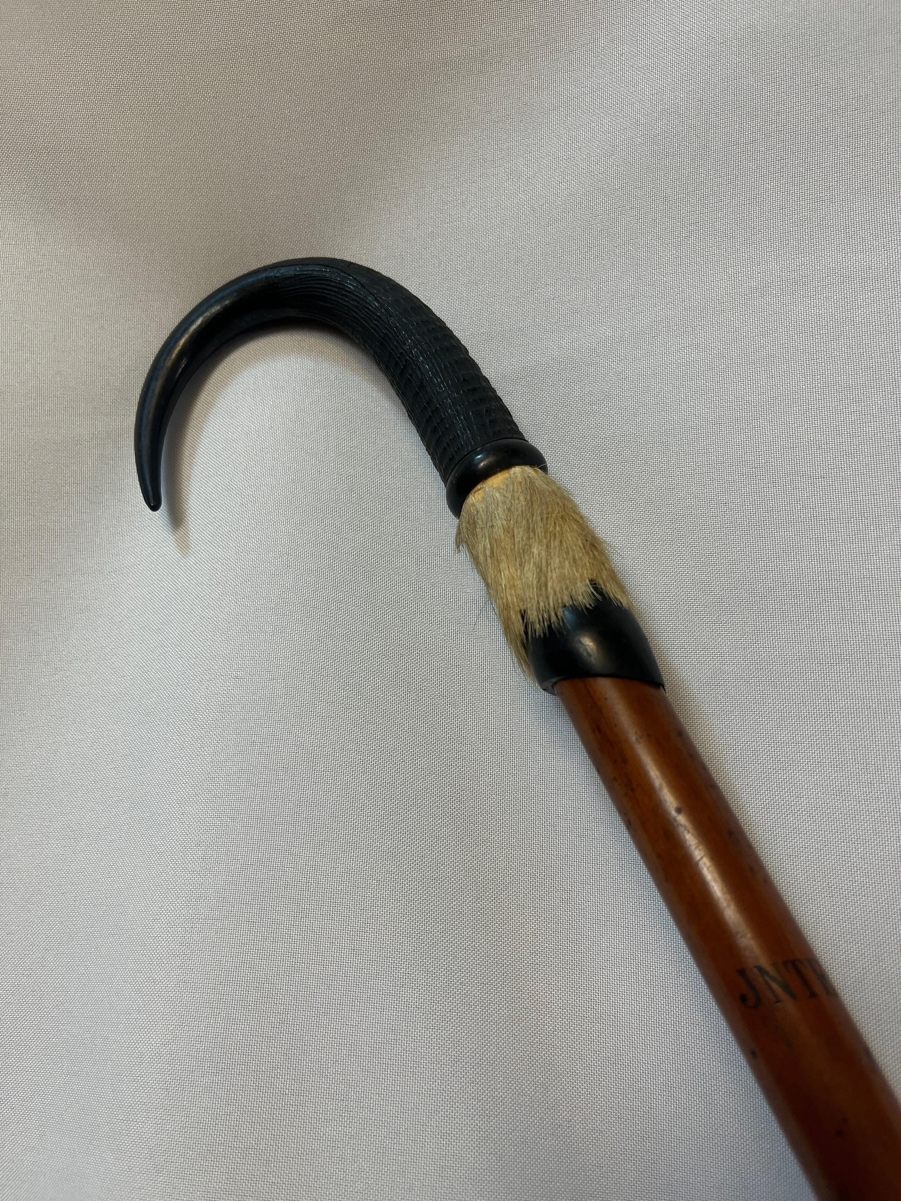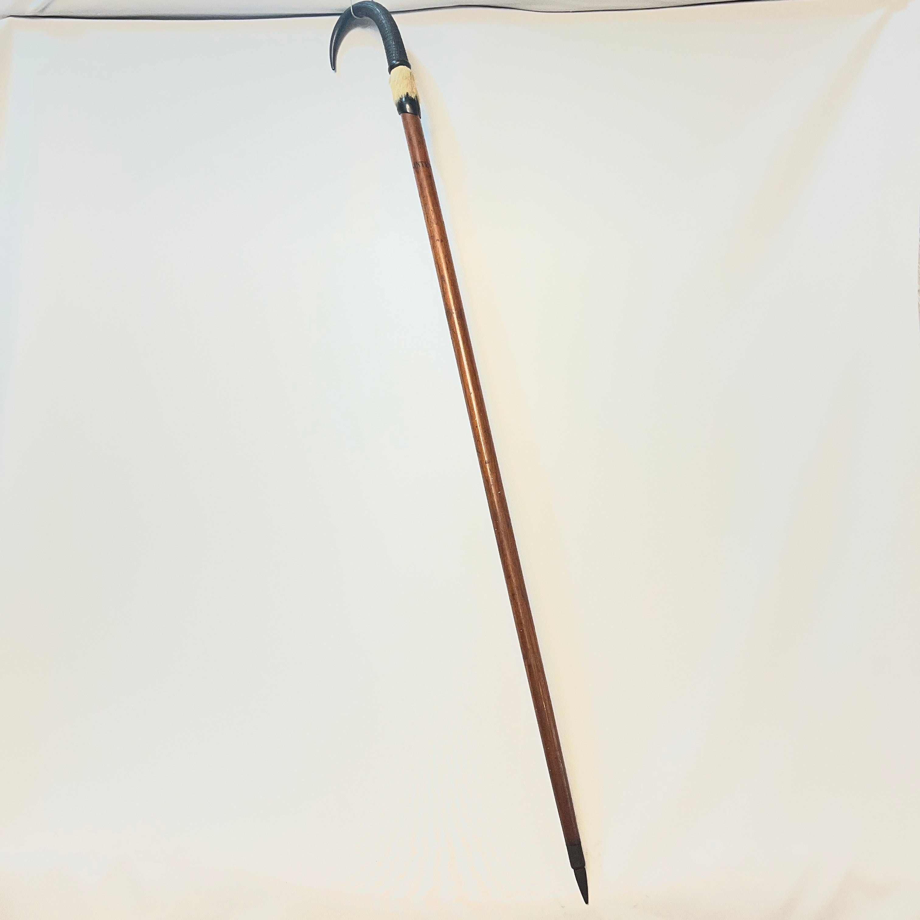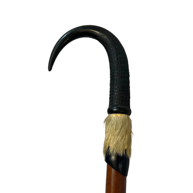 Excéntrico bastón de marcha suizo, con empuñadura de cornamenta animal, terminación inferior en pezuña, cuerpo elaborado en madera pintada y punta de metal. Presenta detalles decorativos en piel natural. Pieza de carácter singular, apreciada como objeto decorativo y de colección.
