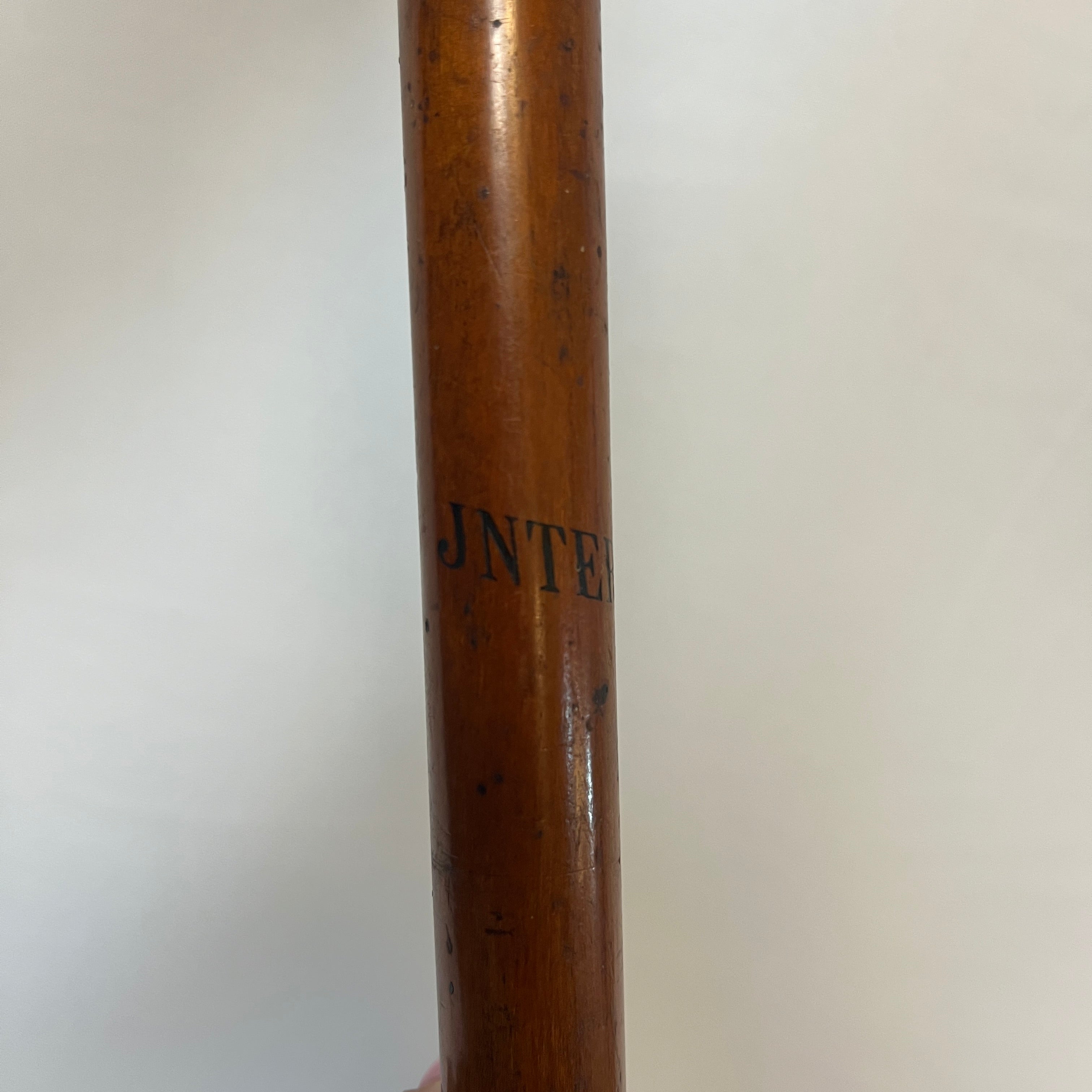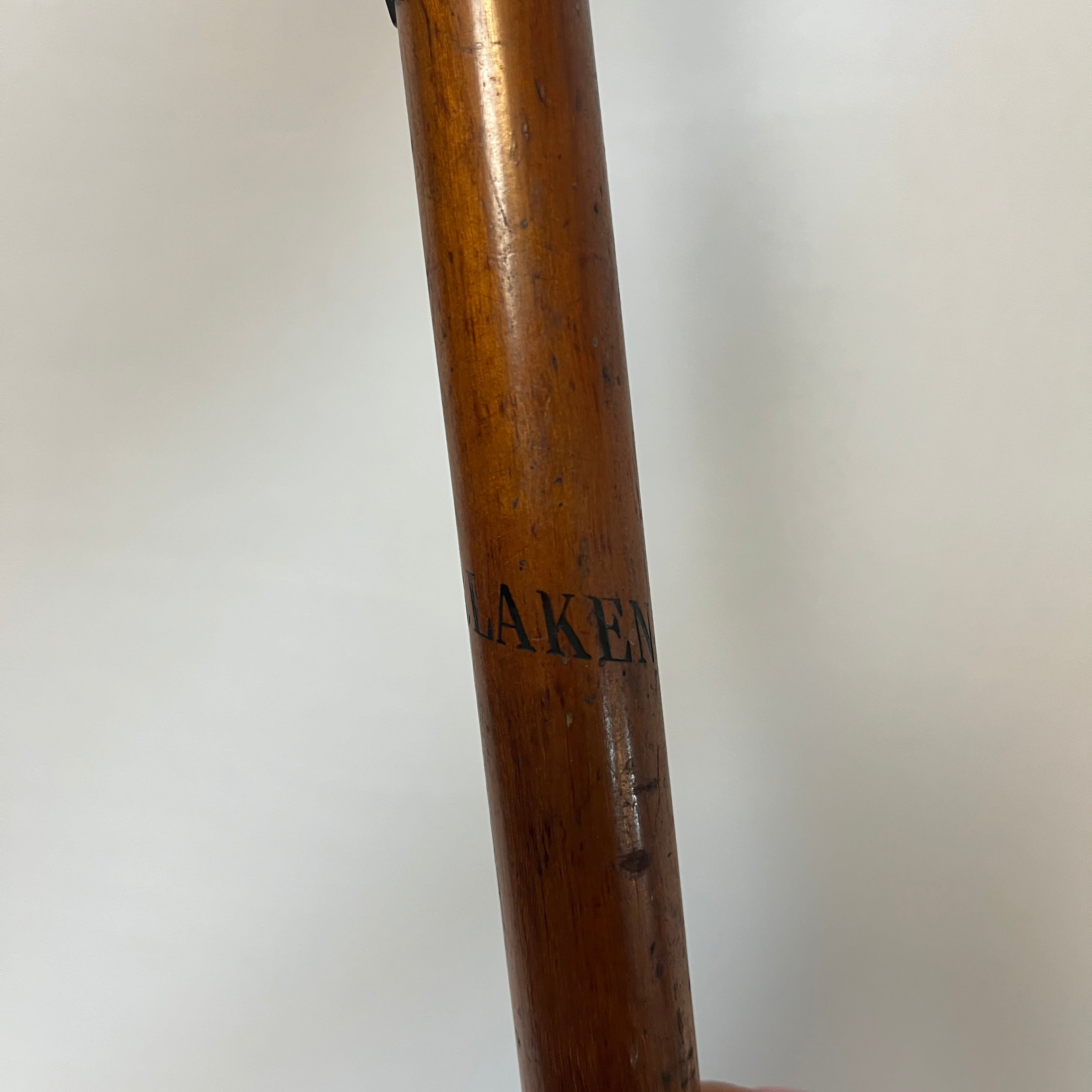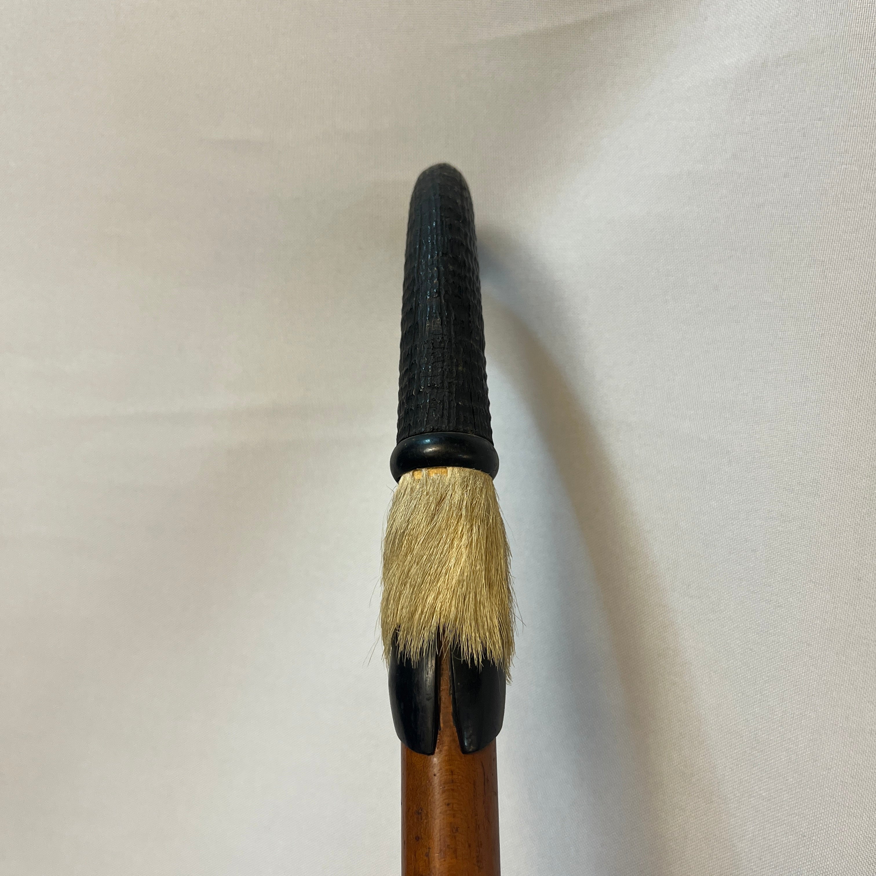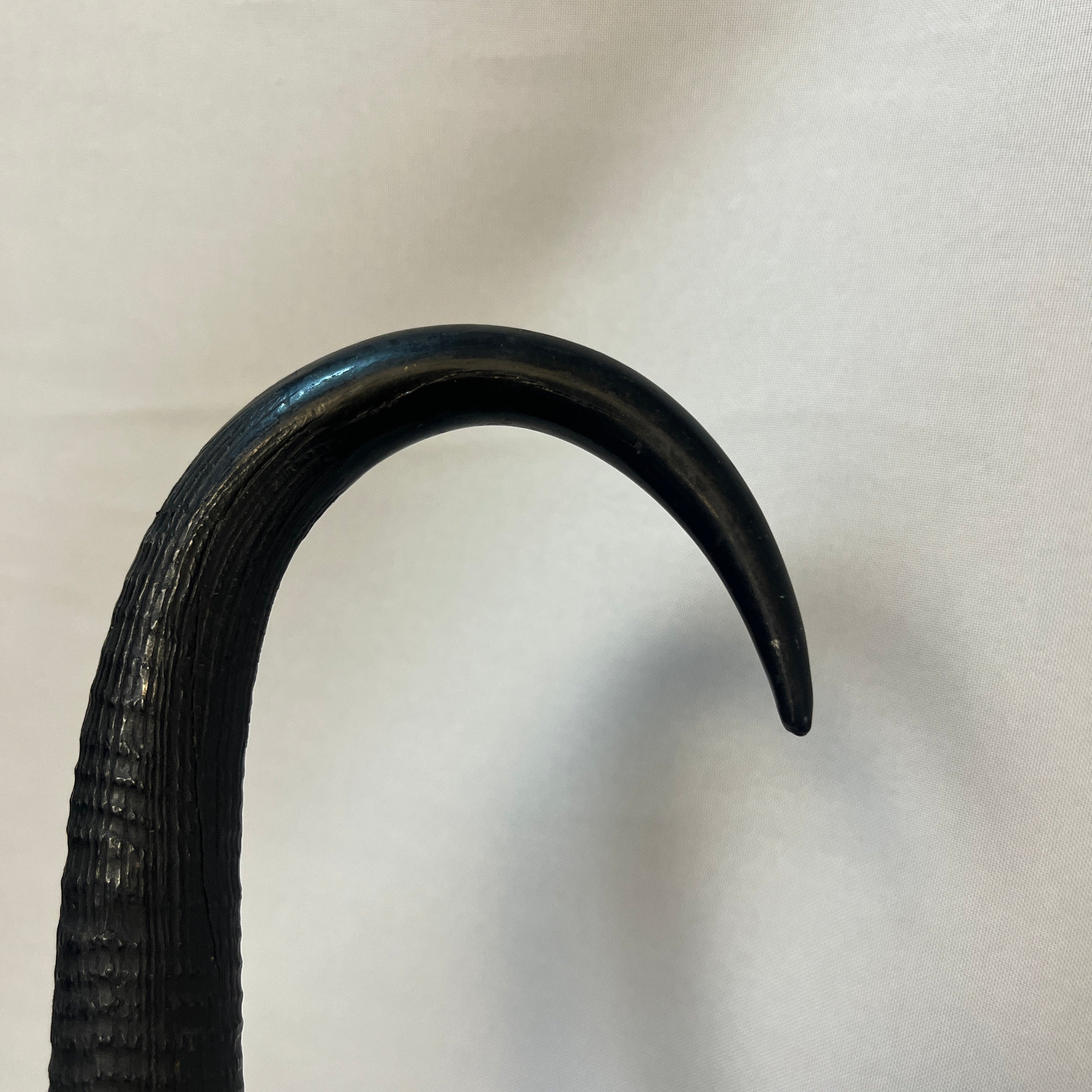 Excéntrico bastón de marcha suizo, con empuñadura de cornamenta animal, terminación inferior en pezuña, cuerpo elaborado en madera pintada y punta de metal. Presenta detalles decorativos en piel natural. Pieza de carácter singular, apreciada como objeto decorativo y de colección.