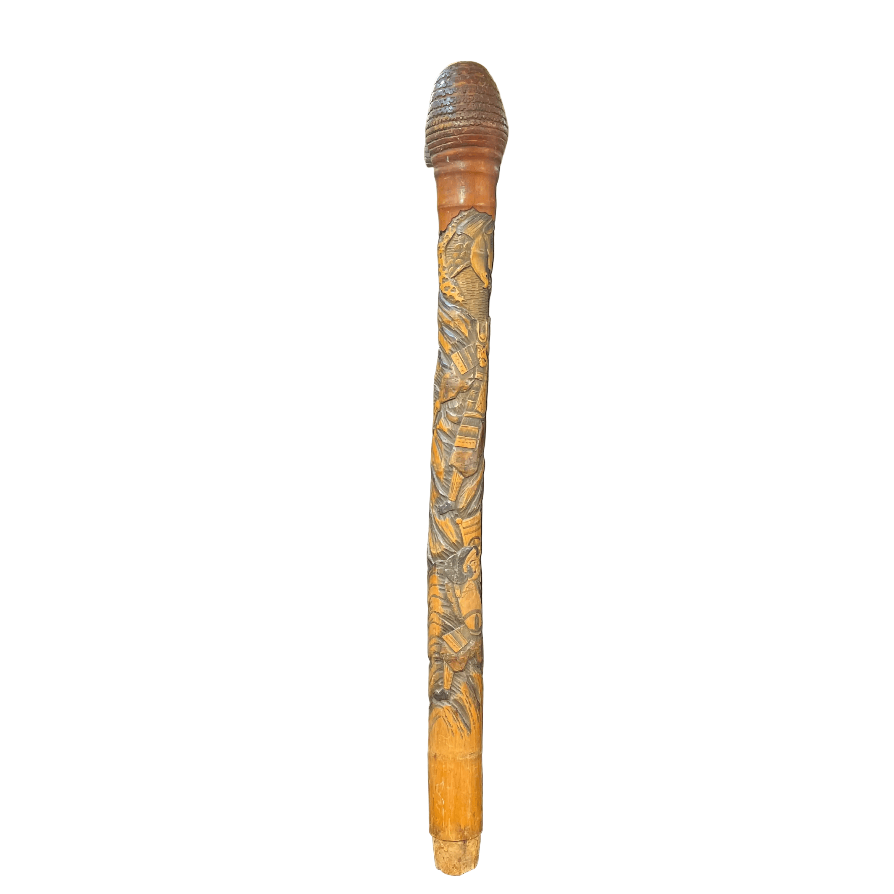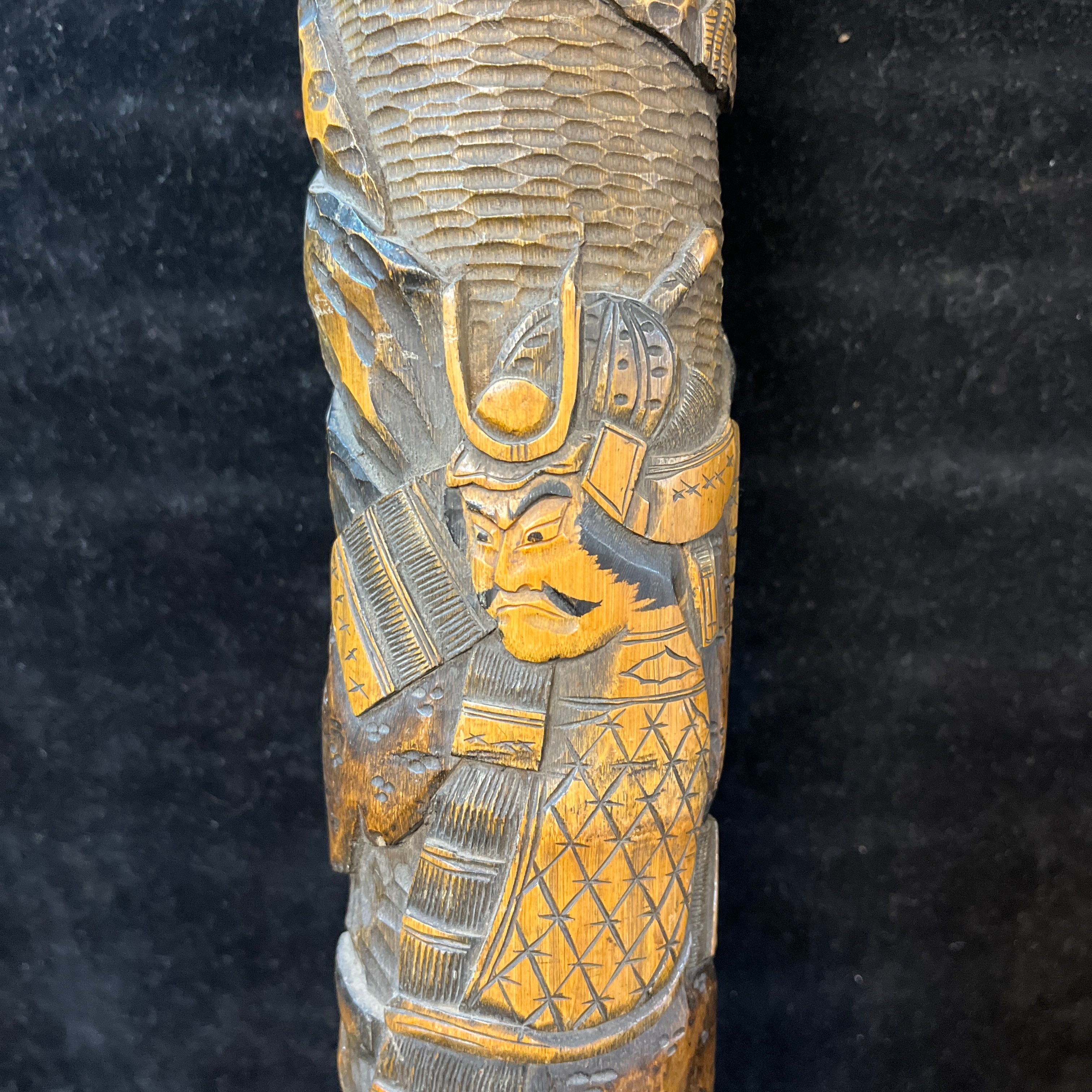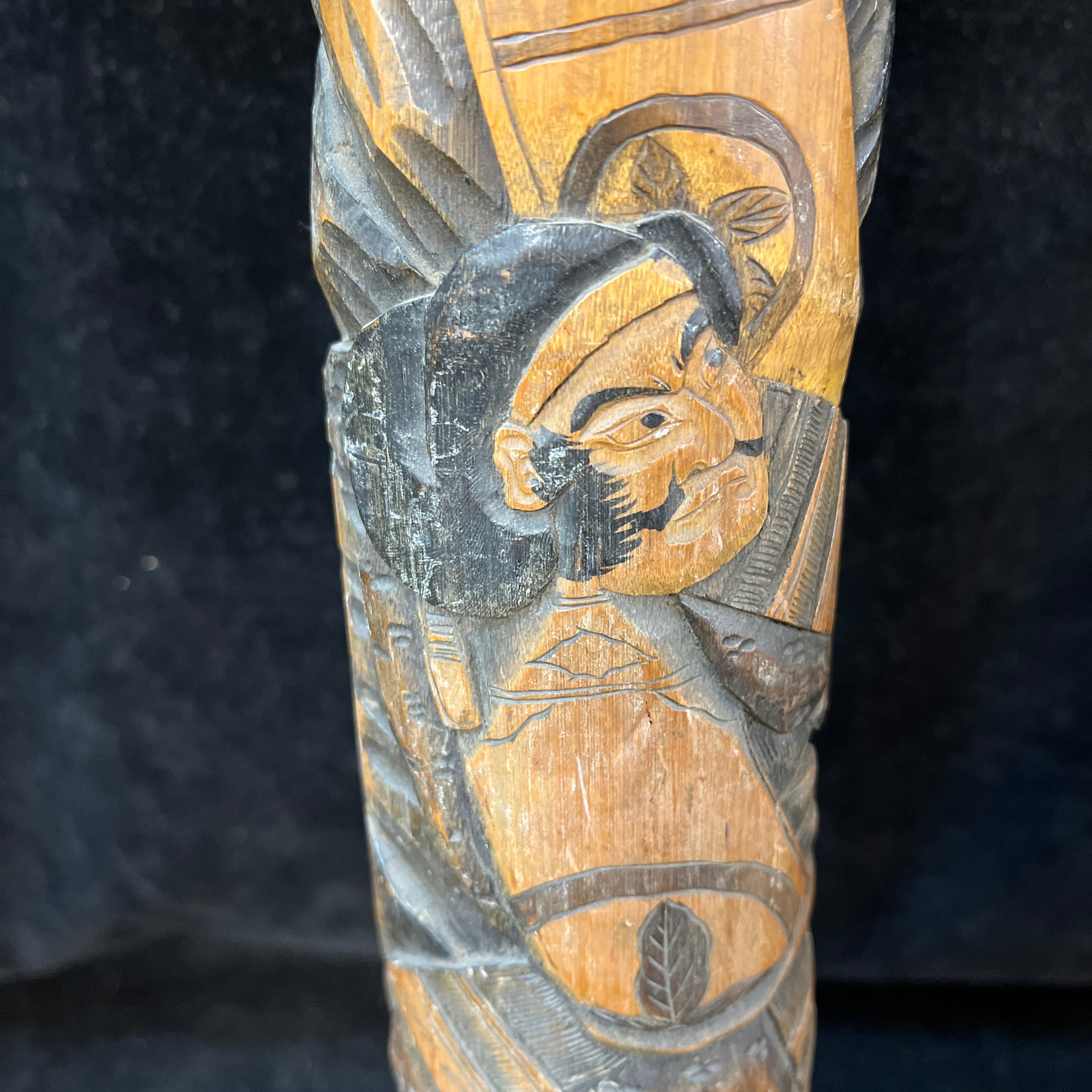 Llamativo bastón grueso de origen japonés hecho de bambú tallada a mano con figuras en relieves, representando a diferentes personajes como guerreros y un águila. La pieza termina con un mango redondo con tallado en textura. Se trata de un bastón que por sus dimensiones tiene un carácter decorativo. Años 50, Japón.