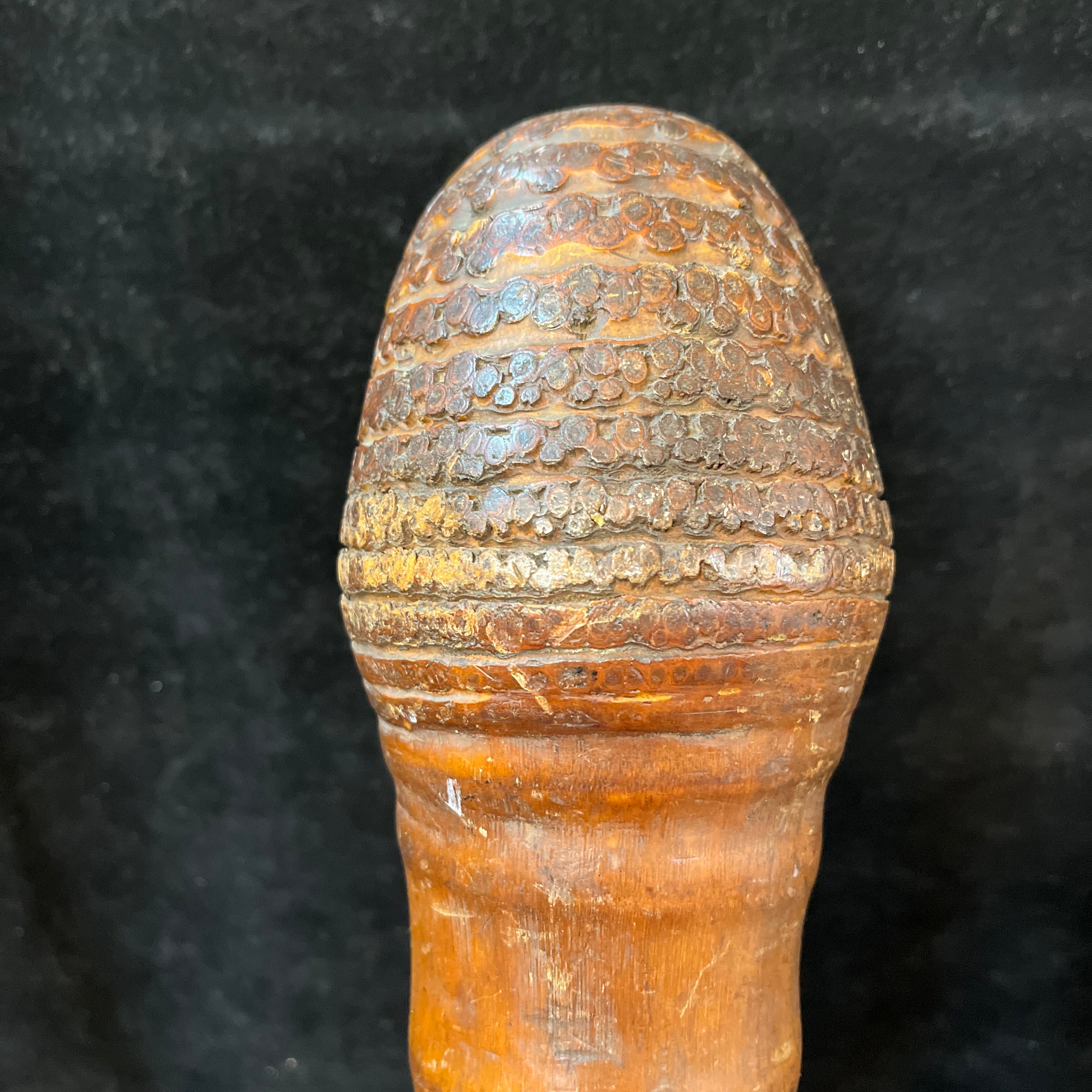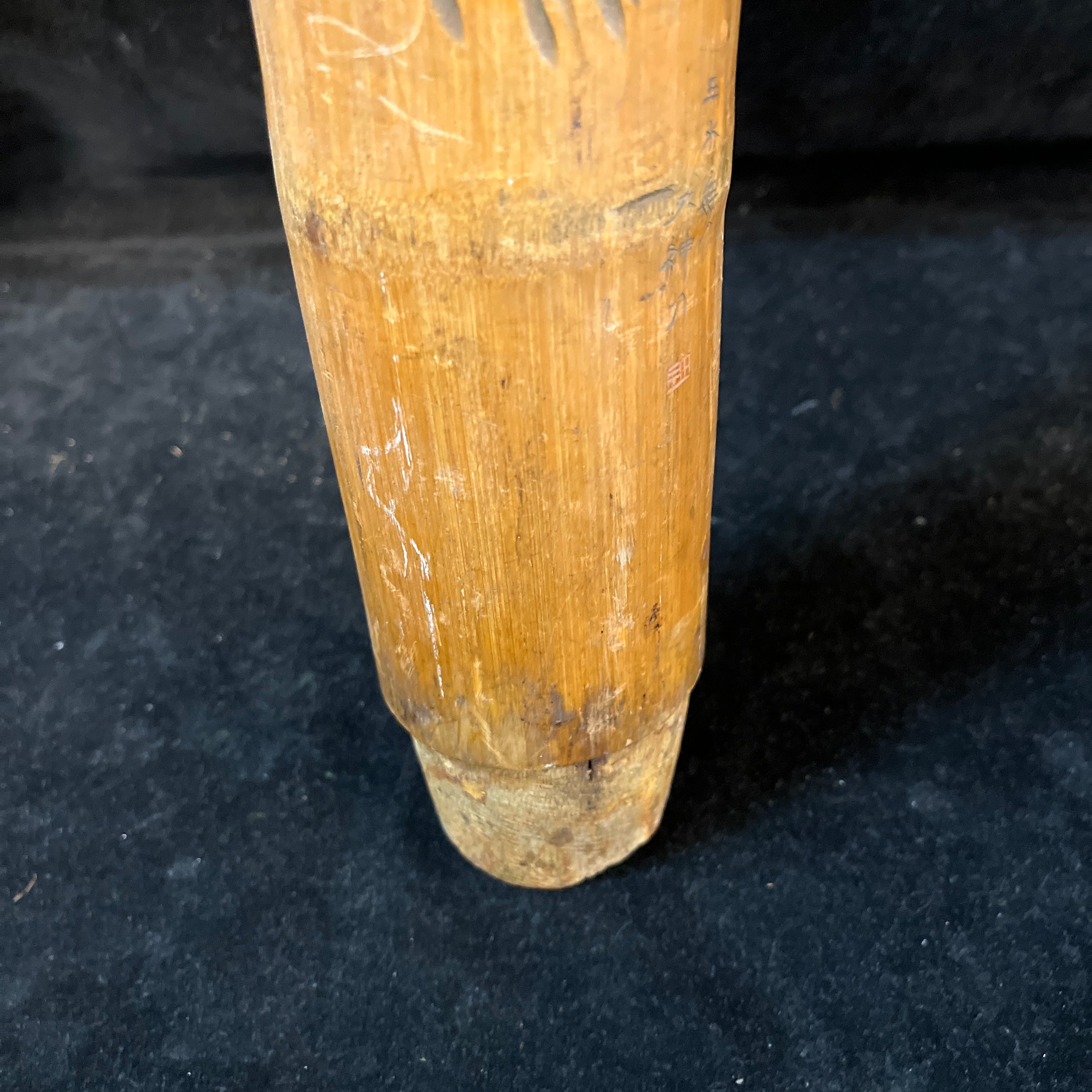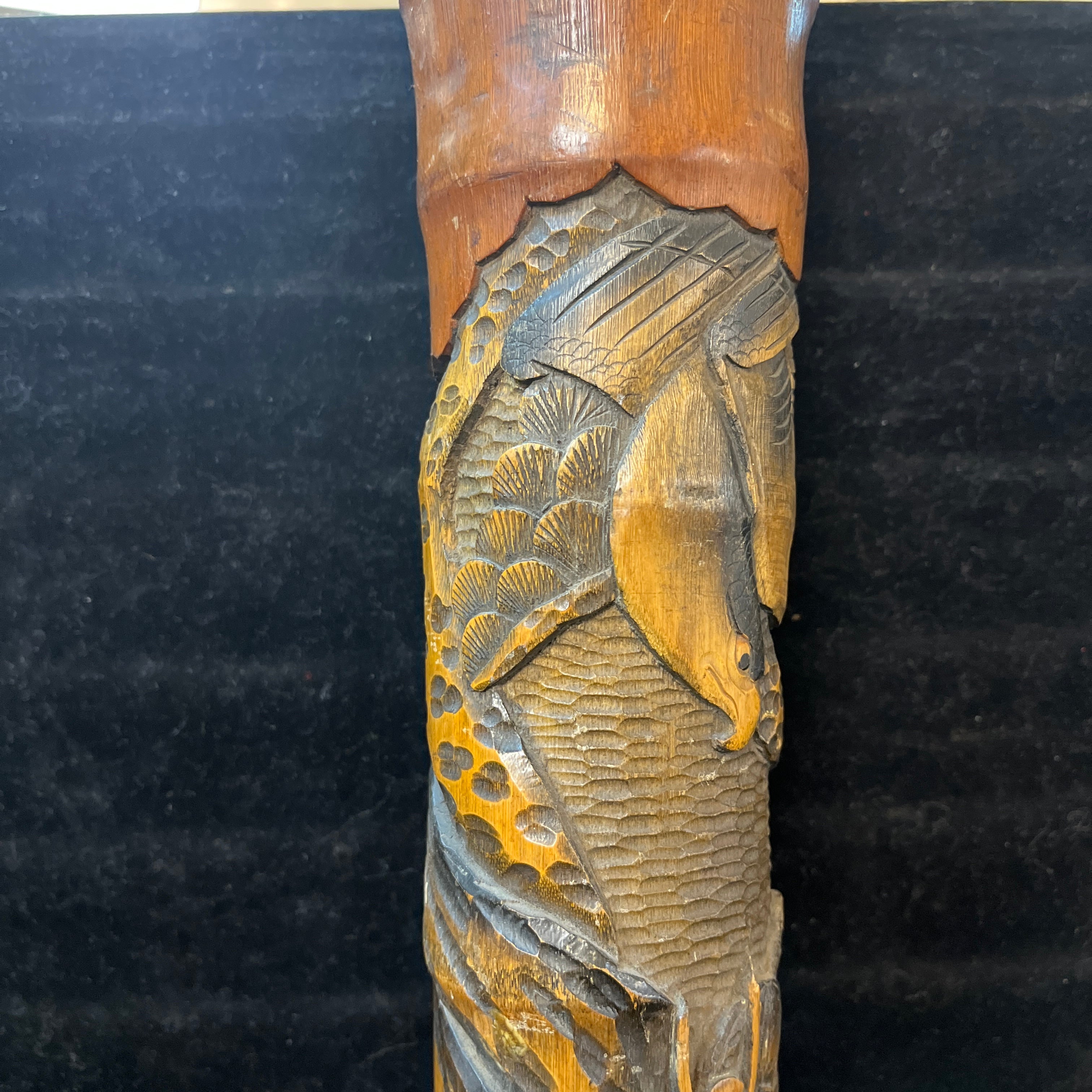 Llamativo bastón grueso de origen japonés hecho de bambú tallada a mano con figuras en relieves, representando a diferentes personajes como guerreros y un águila. La pieza termina con un mango redondo con tallado en textura. Se trata de un bastón que por sus dimensiones tiene un carácter decorativo. Años 50, Japón.
