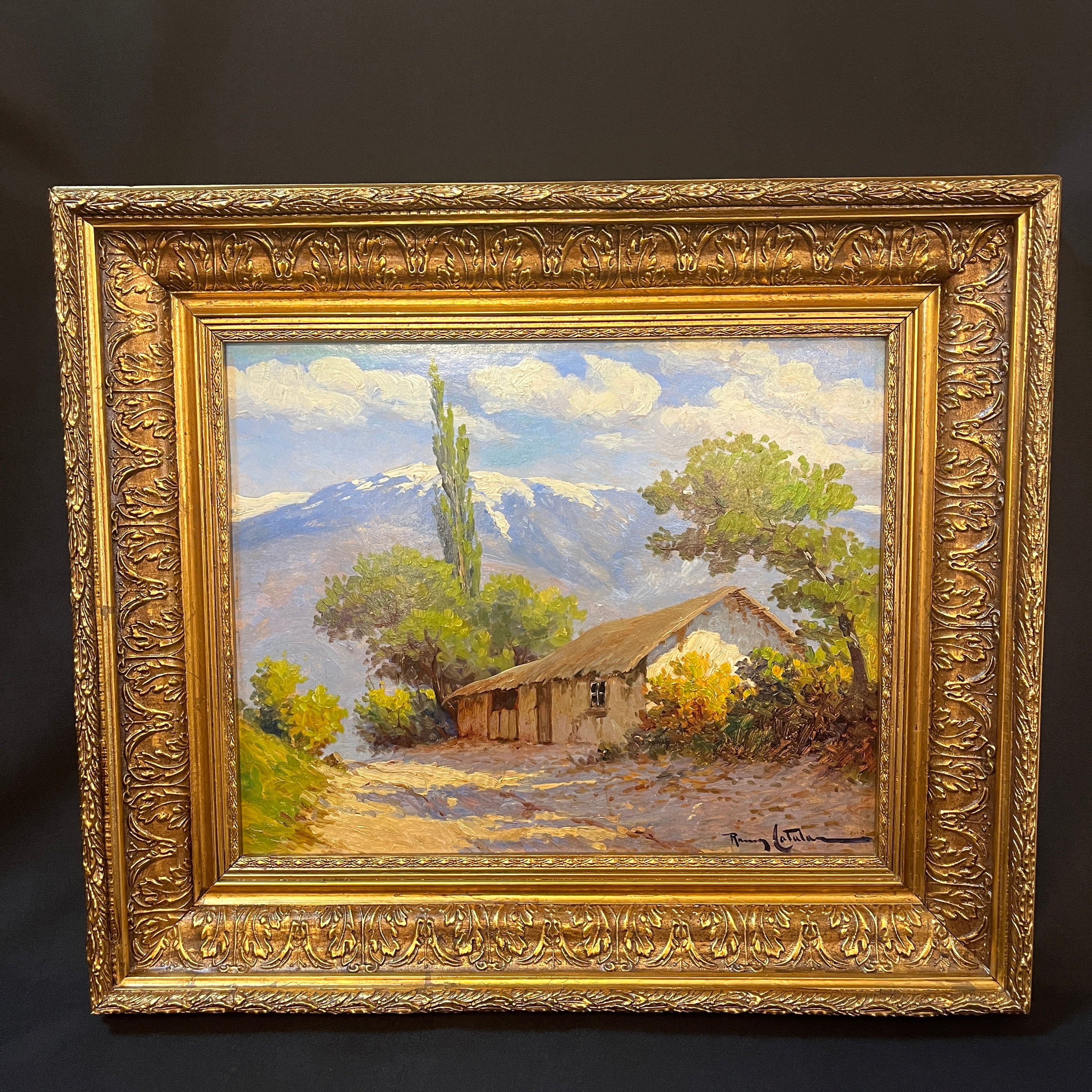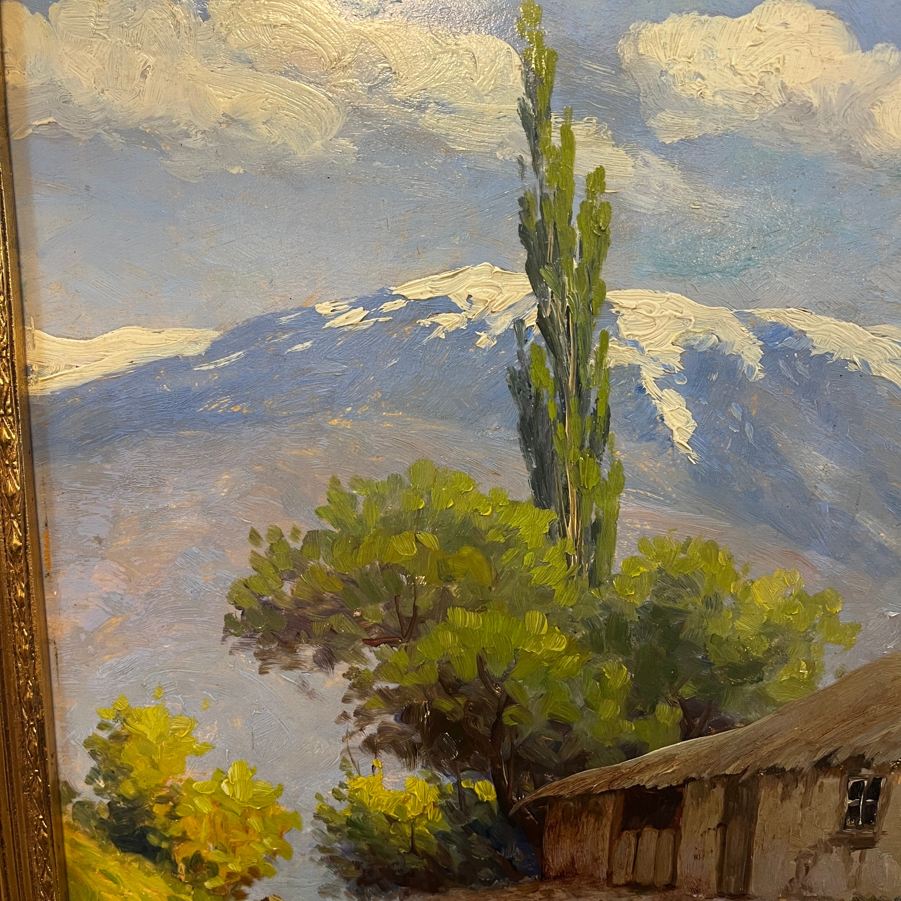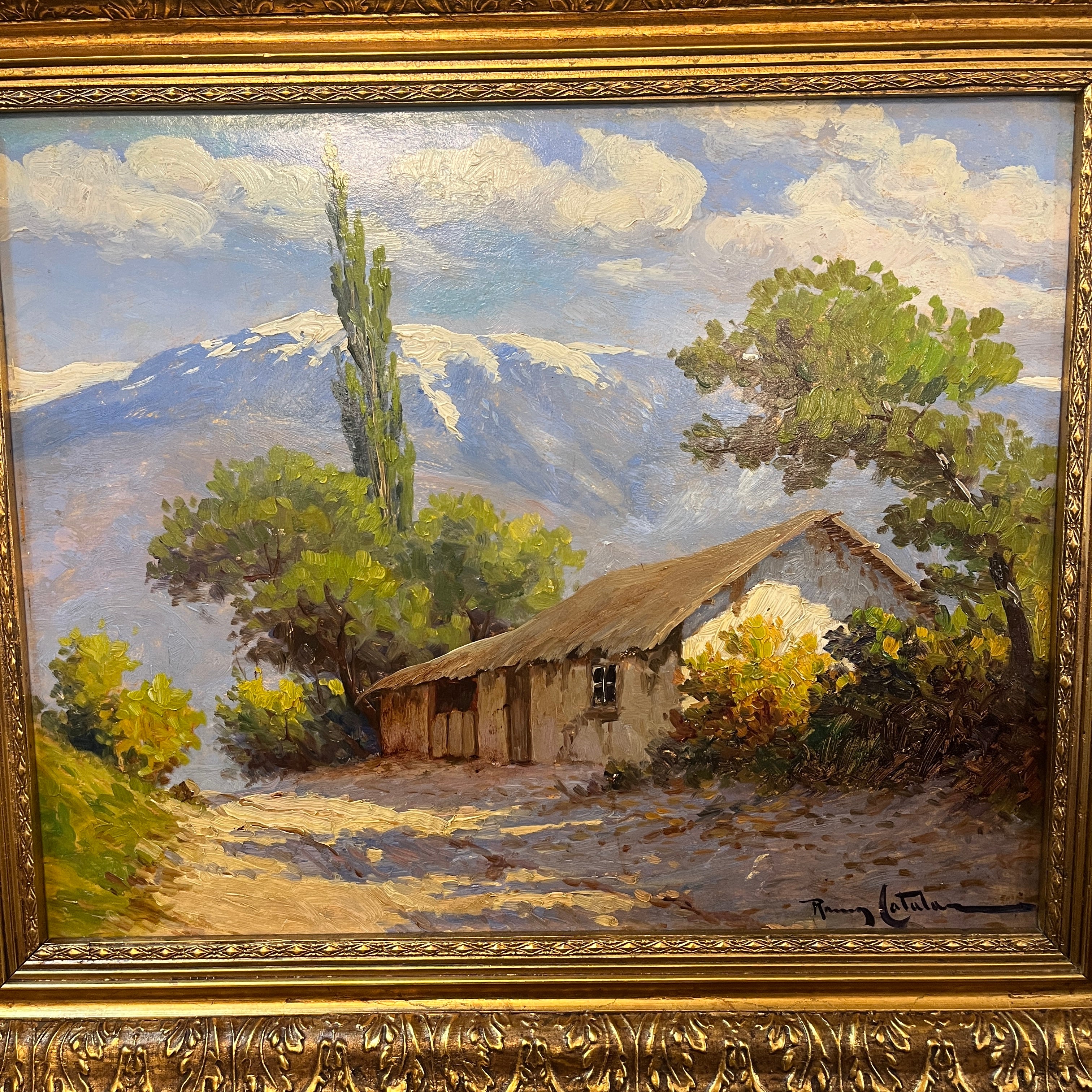 Emotiva pintura del talentoso artista chileno Benito Ramos Catalán de un paisaje que ya no se ve comúnmente en Santiago. Este óleo nos transporta a otro tiempo a una ruralidad perdida. En esta ocasión tenemos una casa de campo rodeada de una vibrante vegetación un cielo celeste nuboso y la cordillera como fondo, entregan la escena perfecta. Al ser un cuadro de mediano tamaño permite decorar espacios más reducidos.