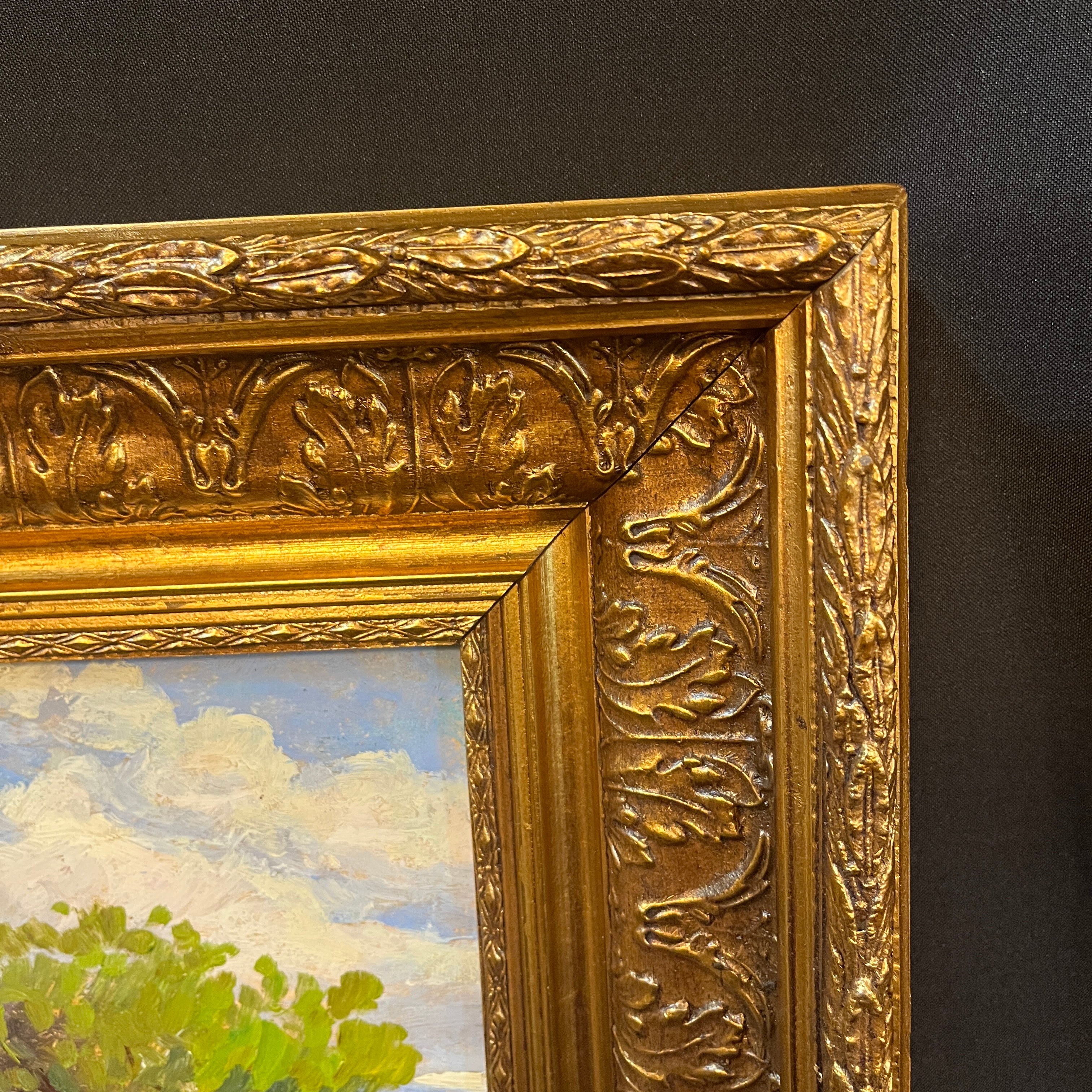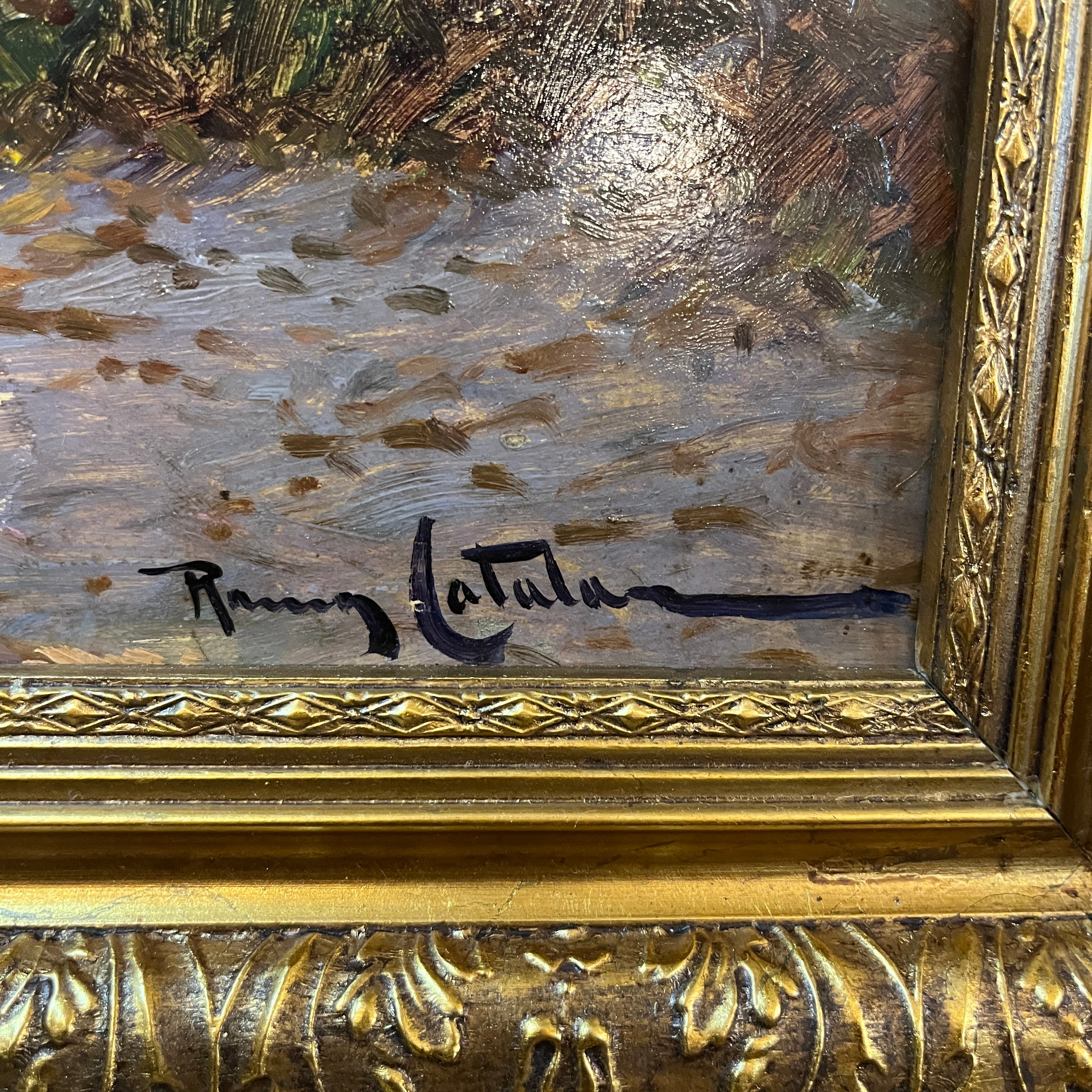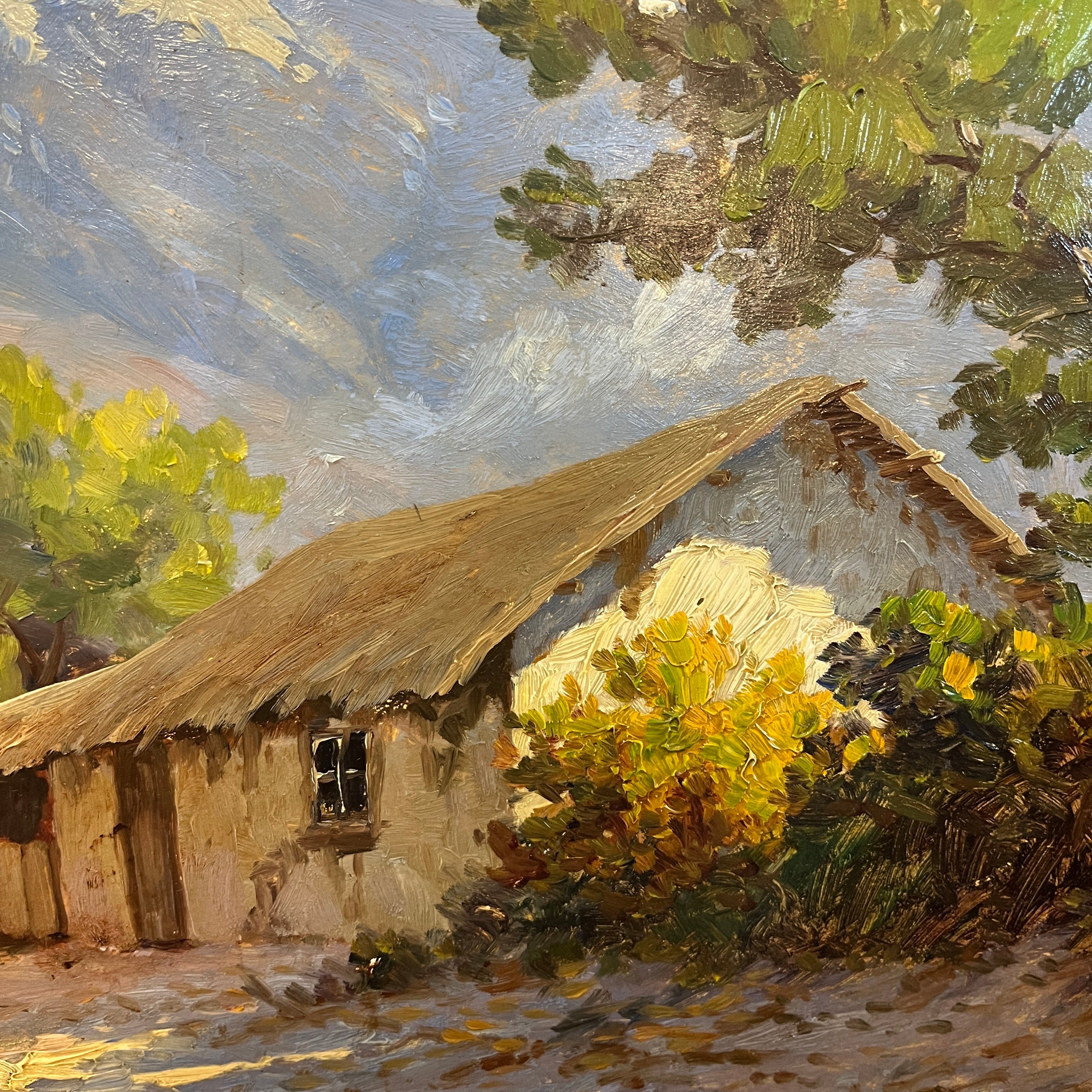 Emotiva pintura del talentoso artista chileno Benito Ramos Catalán de un paisaje que ya no se ve comúnmente en Santiago. Este óleo nos transporta a otro tiempo a una ruralidad perdida. En esta ocasión tenemos una casa de campo rodeada de una vibrante vegetación un cielo celeste nuboso y la cordillera como fondo, entregan la escena perfecta. Al ser un cuadro de mediano tamaño permite decorar espacios más reducidos.